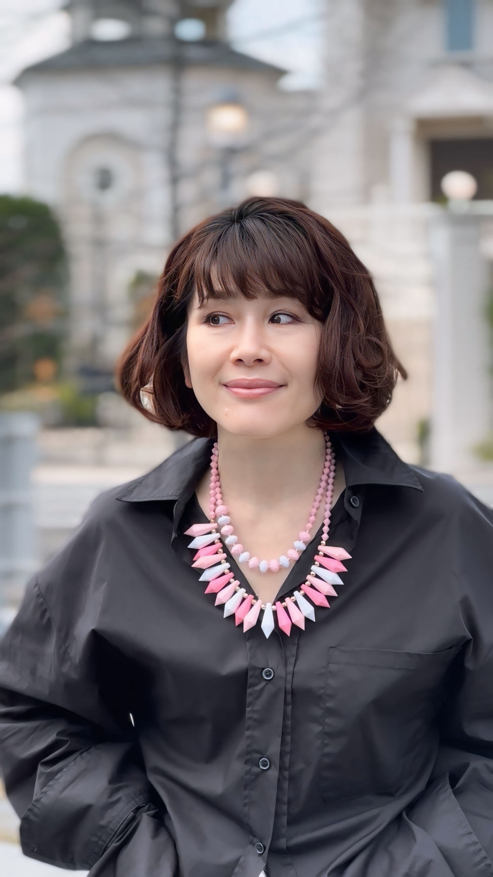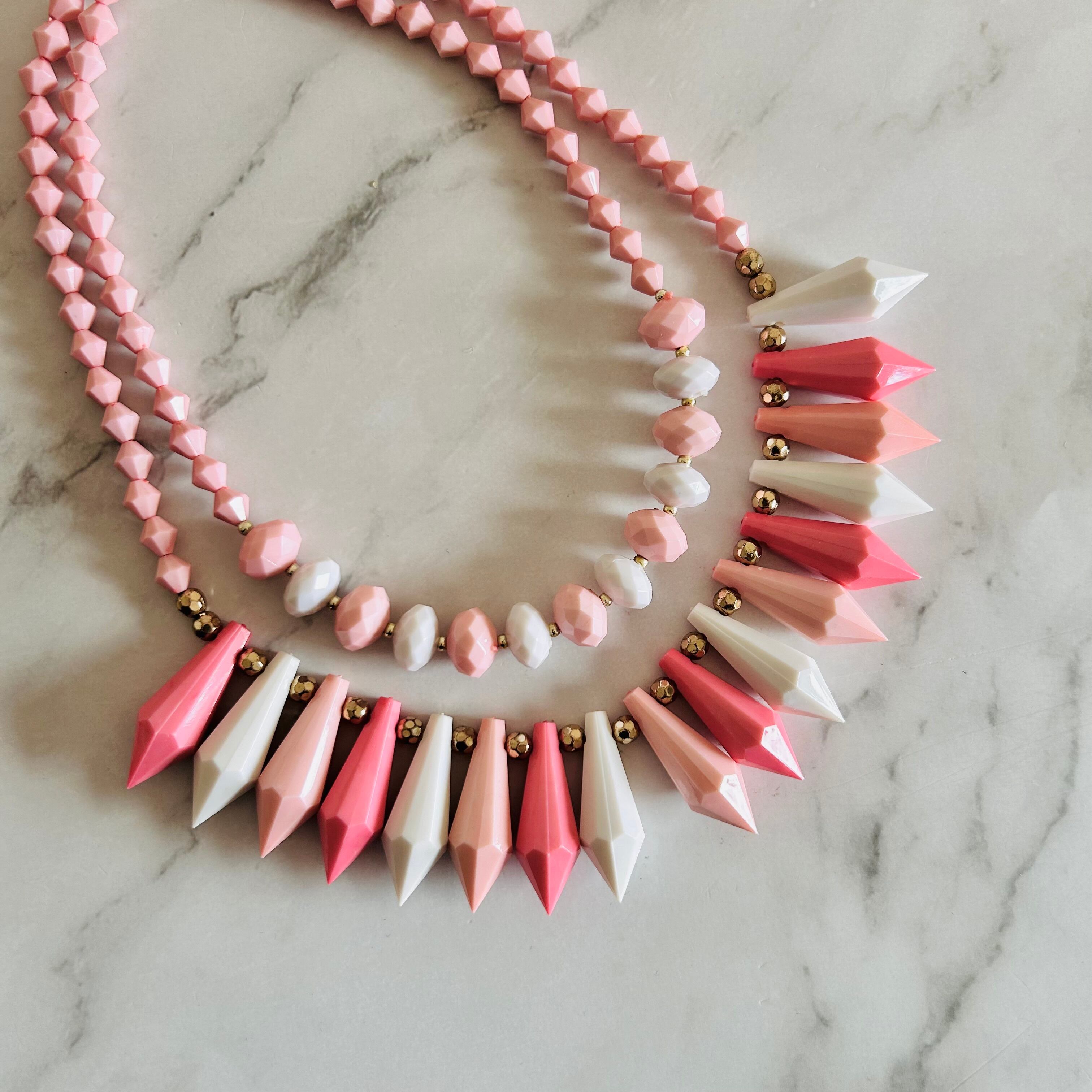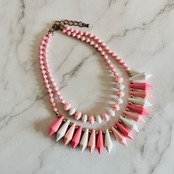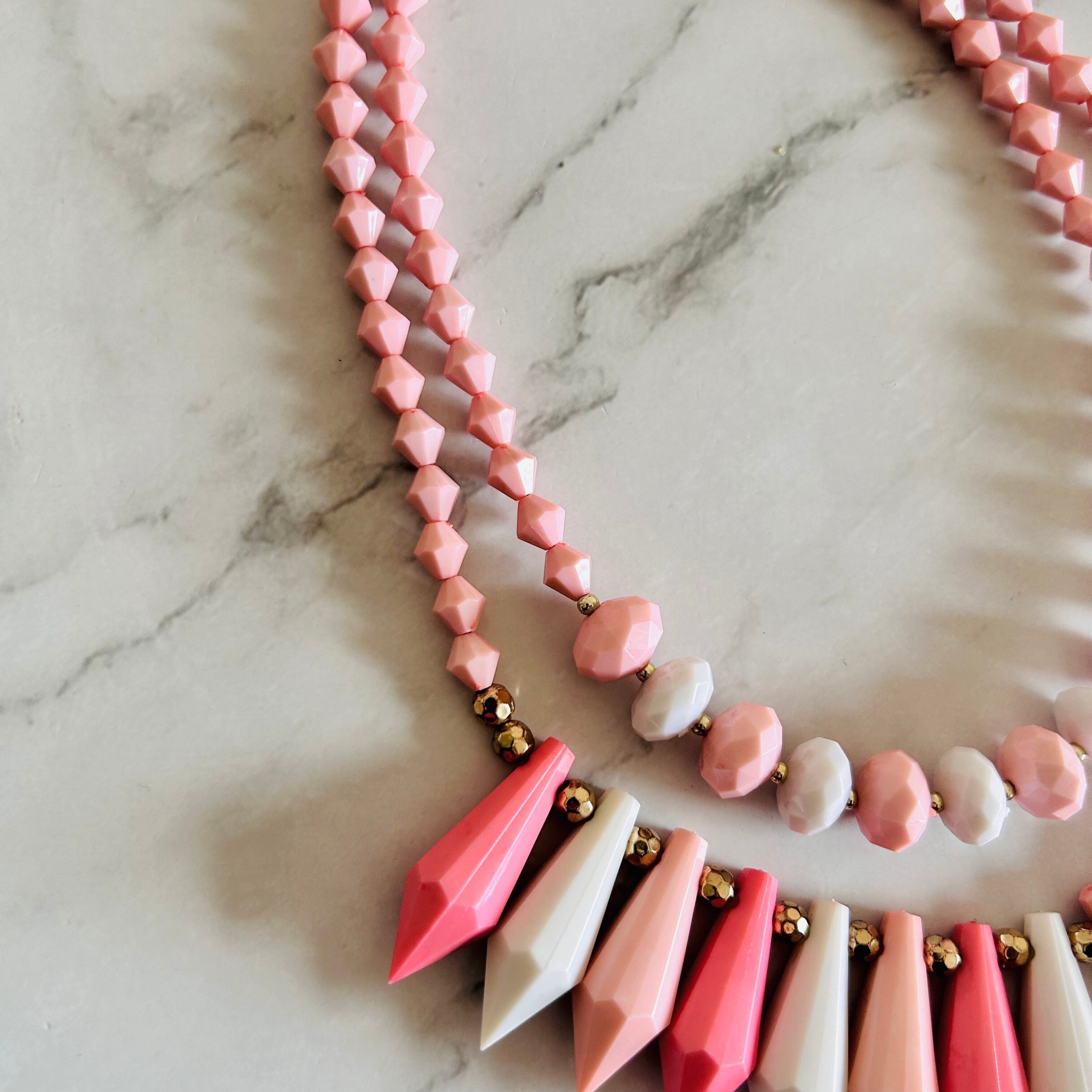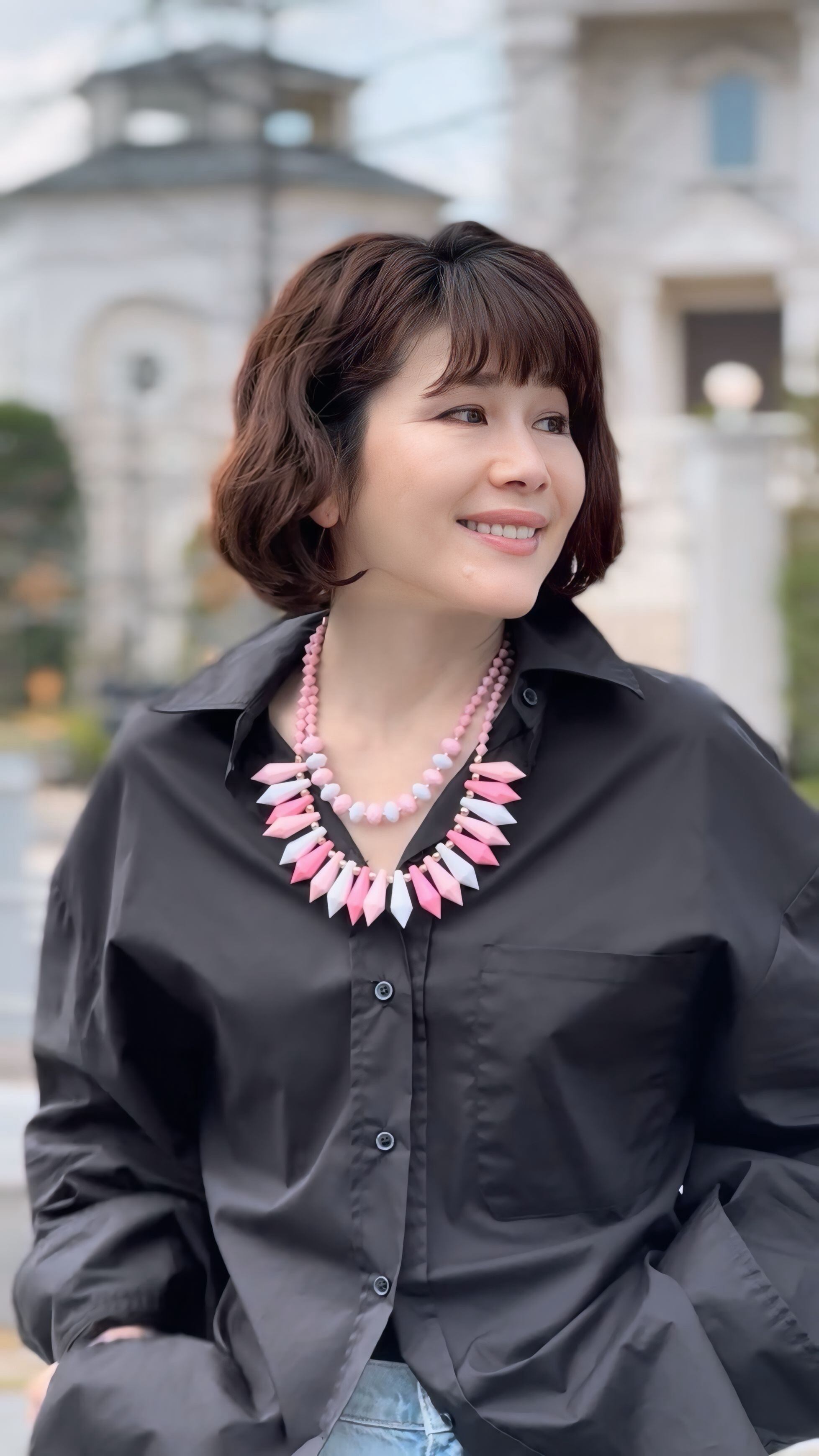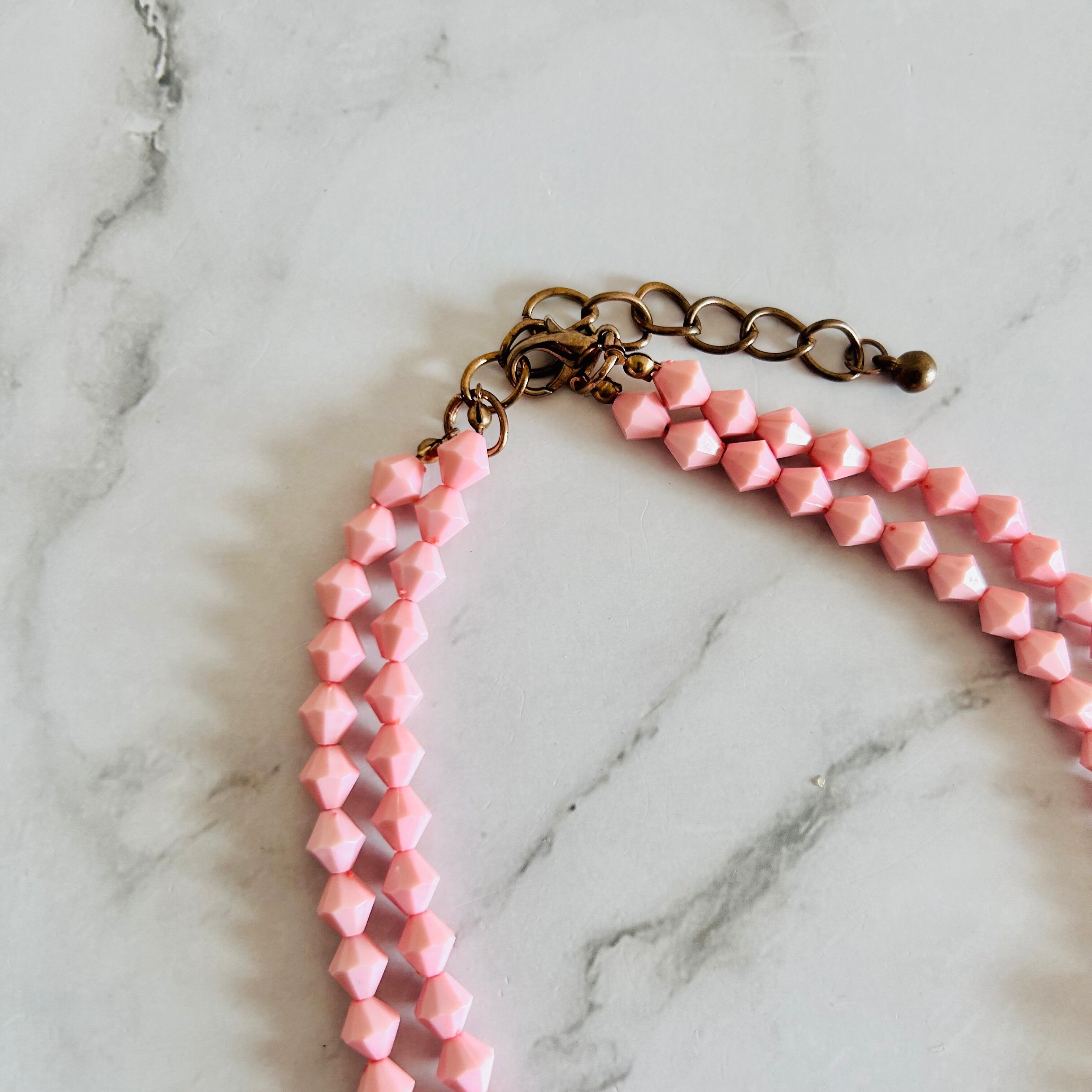 ピンクとホワイトのビーズを重ね、2連で仕上げた軽やかでフェミニンなネックレスです。