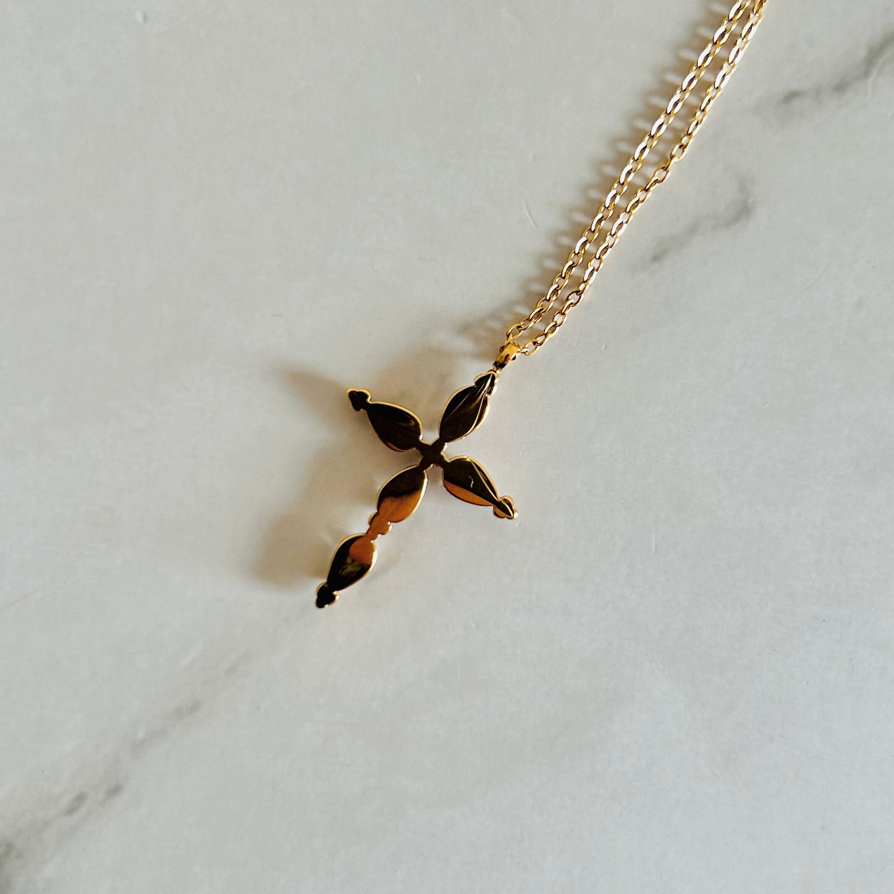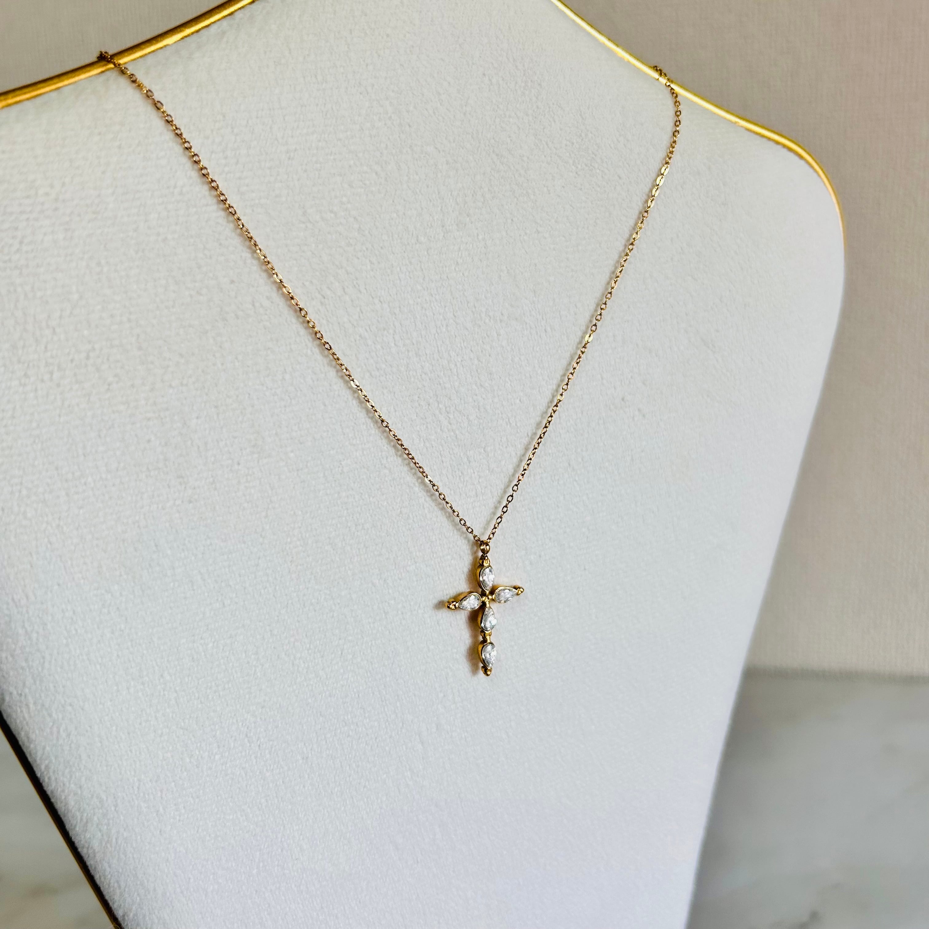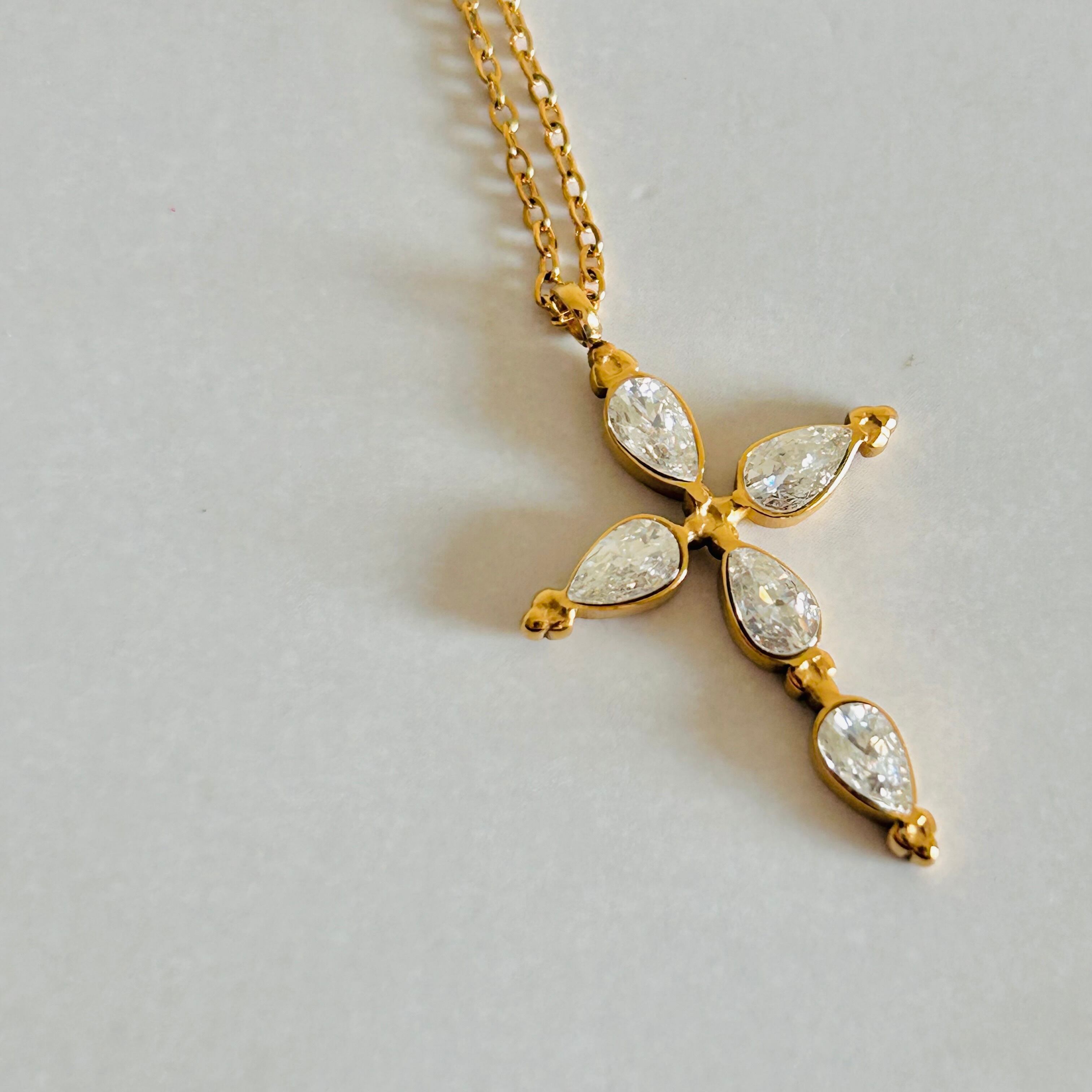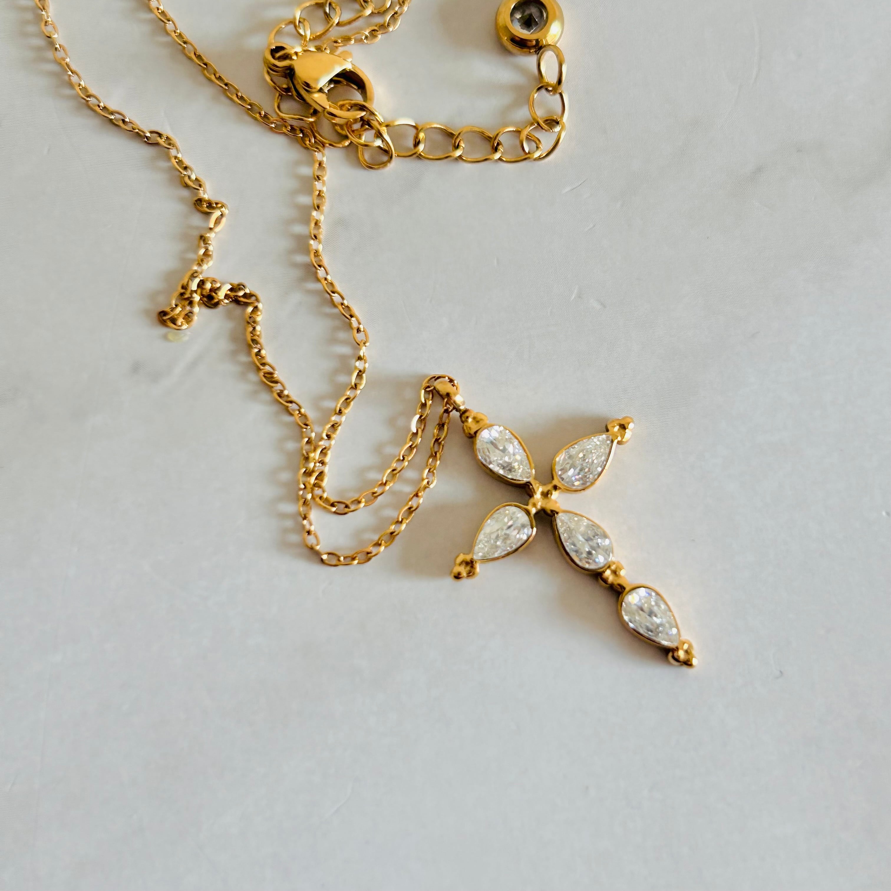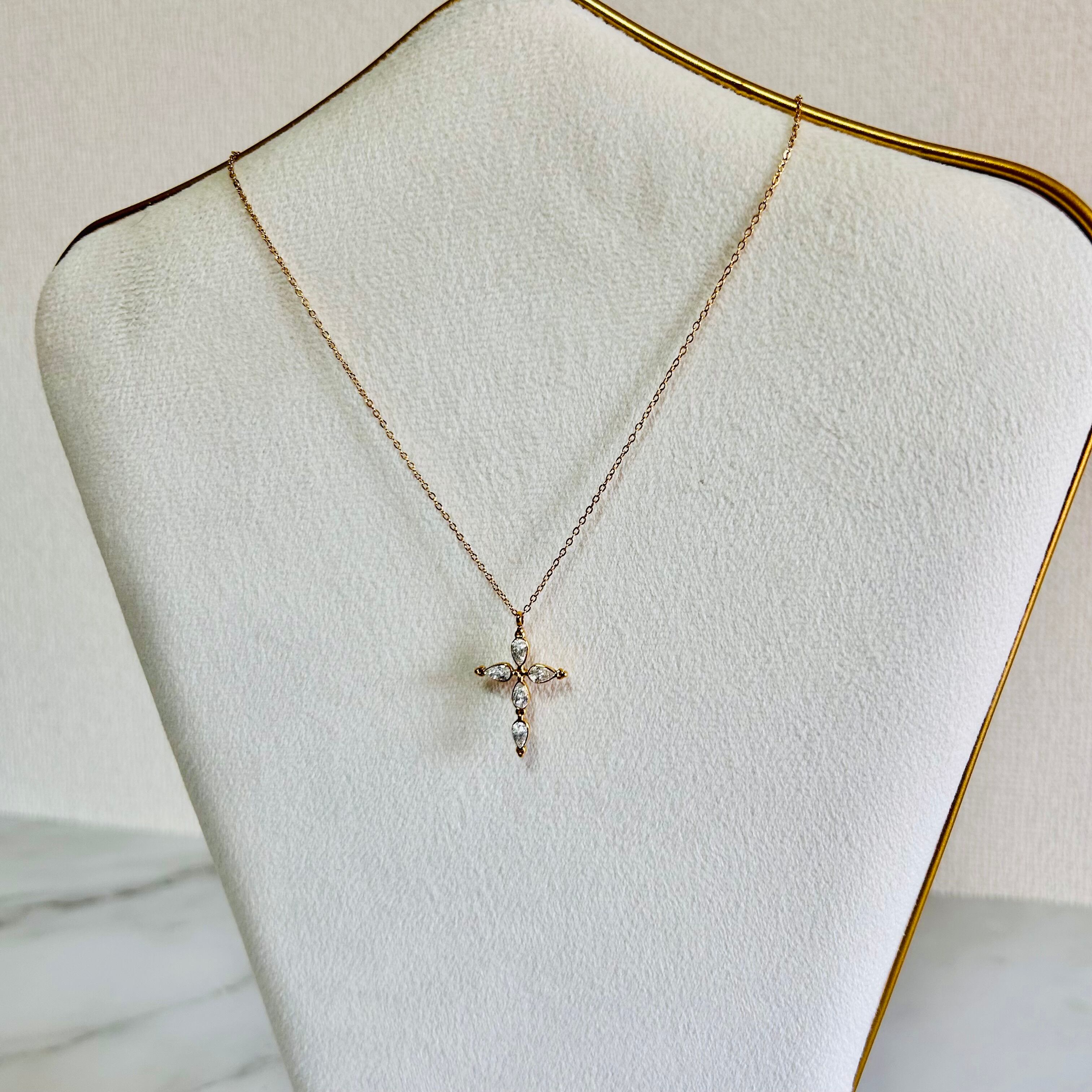 しなやかなゴールドチェーンに、涙型カットのジルコニアをクロス型にあしらった、繊細で上品なデザインです。
