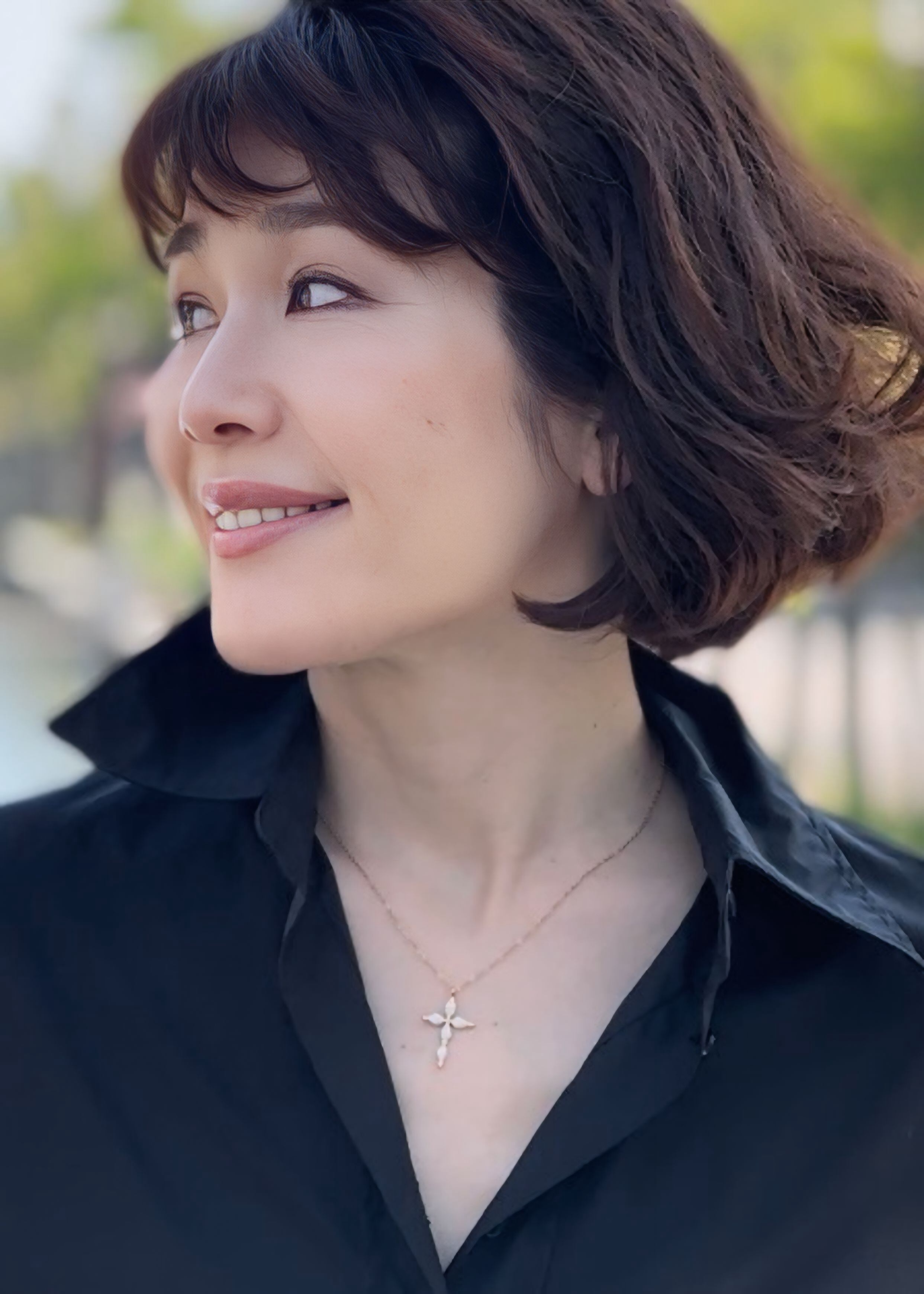 光の加減で美しく輝くクロスモチーフが、デコルテに華やぎを添えてくれます。