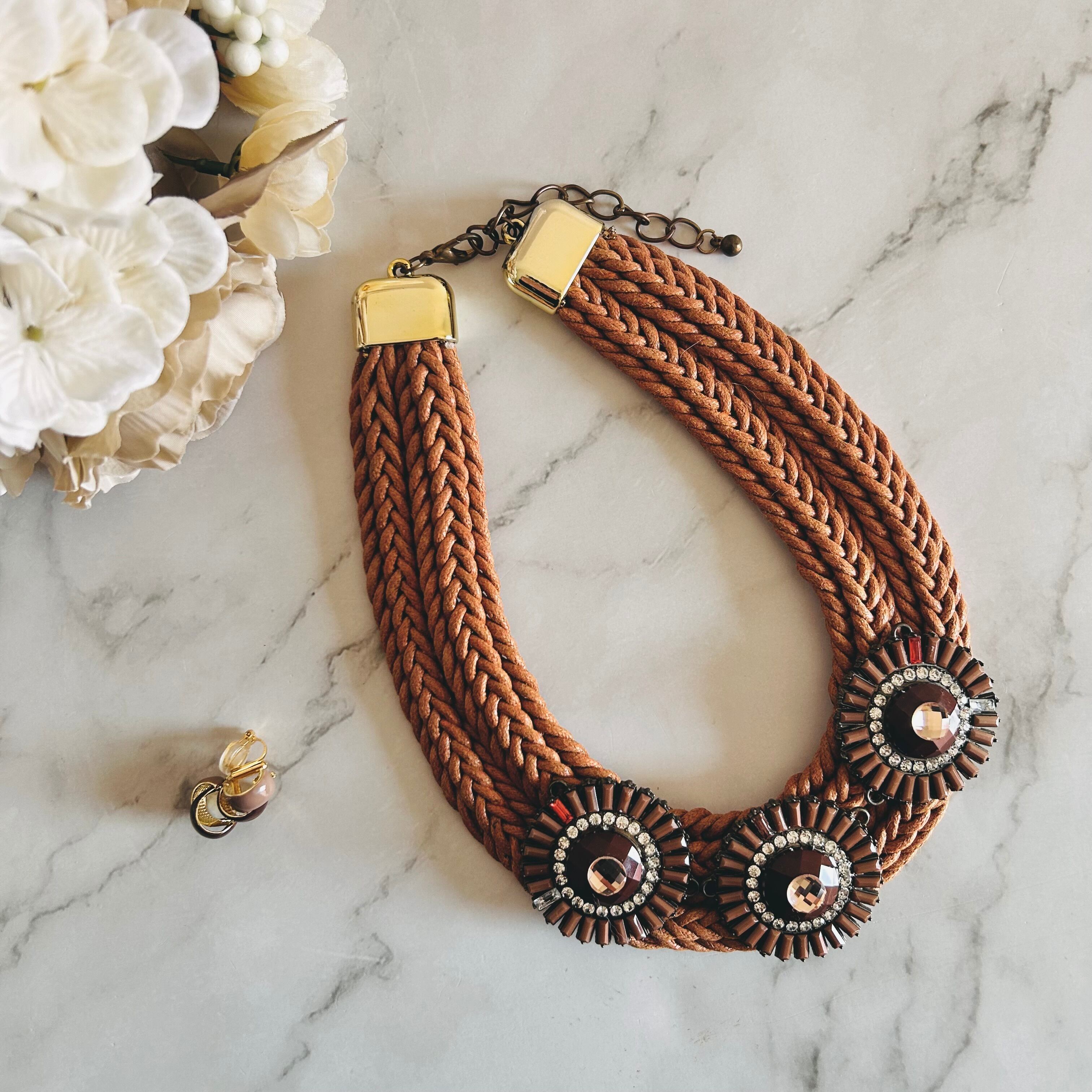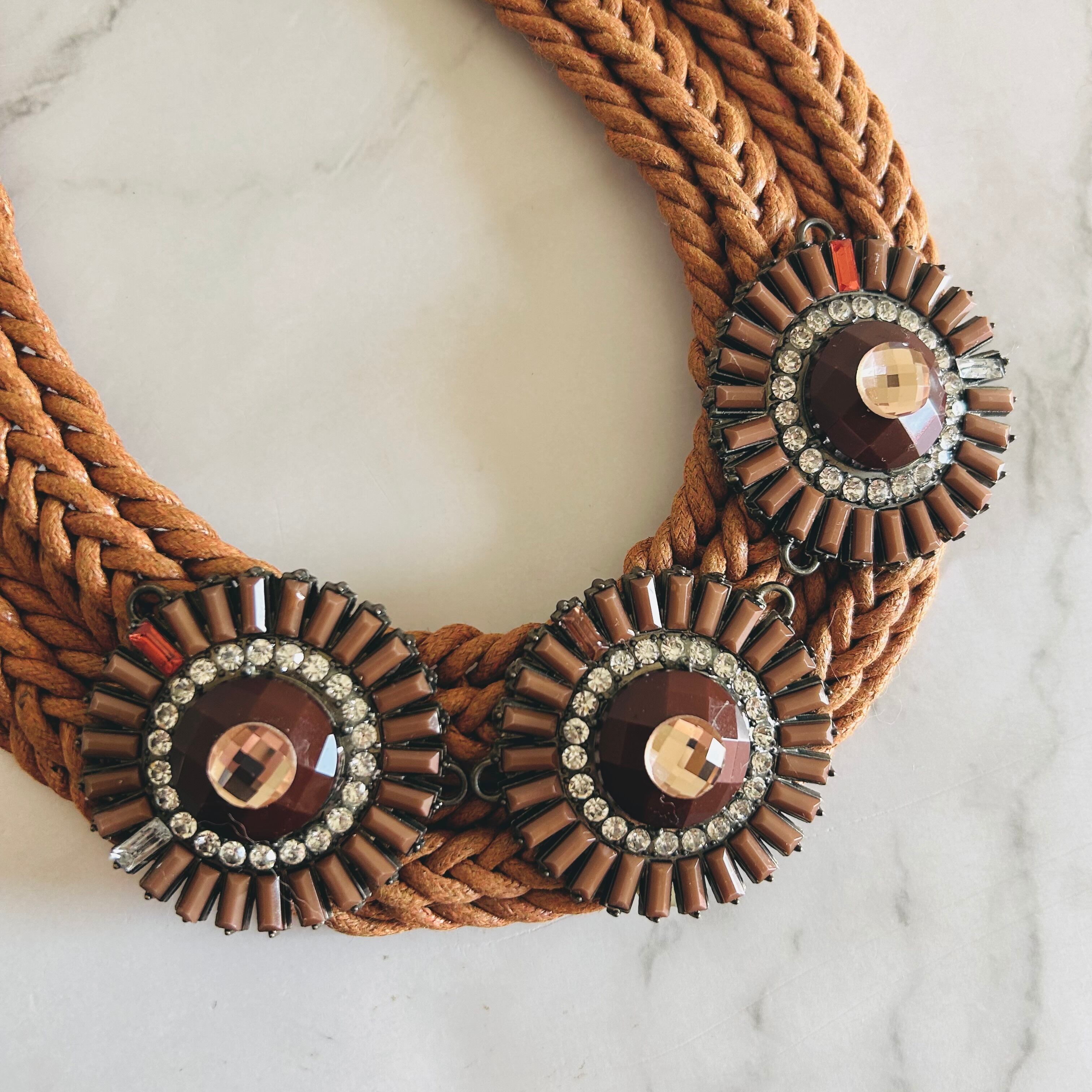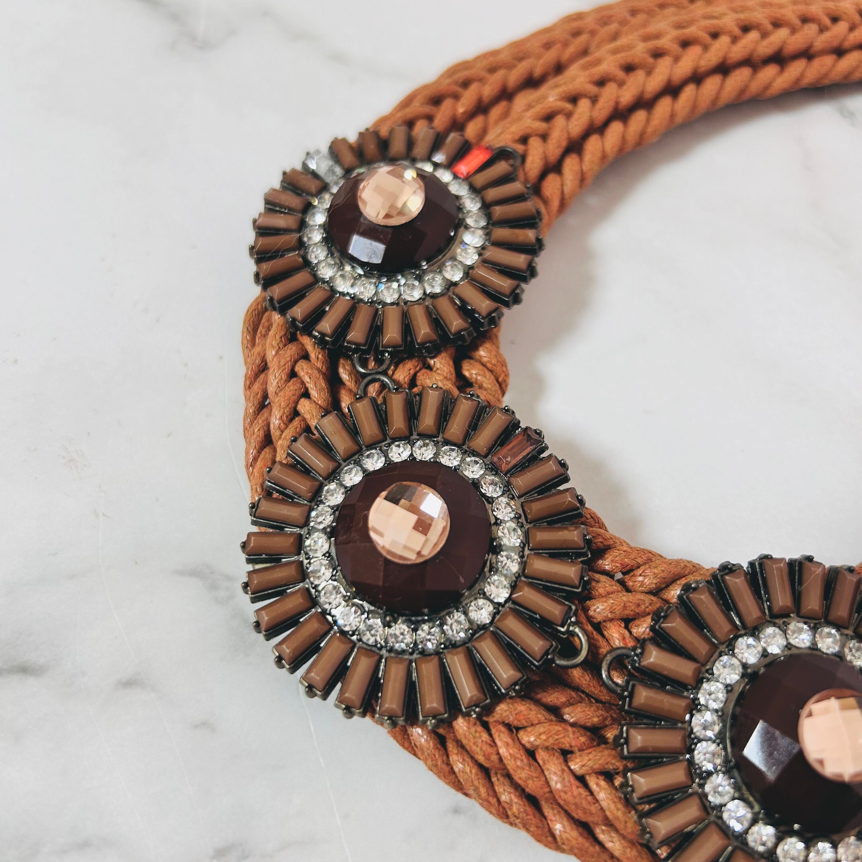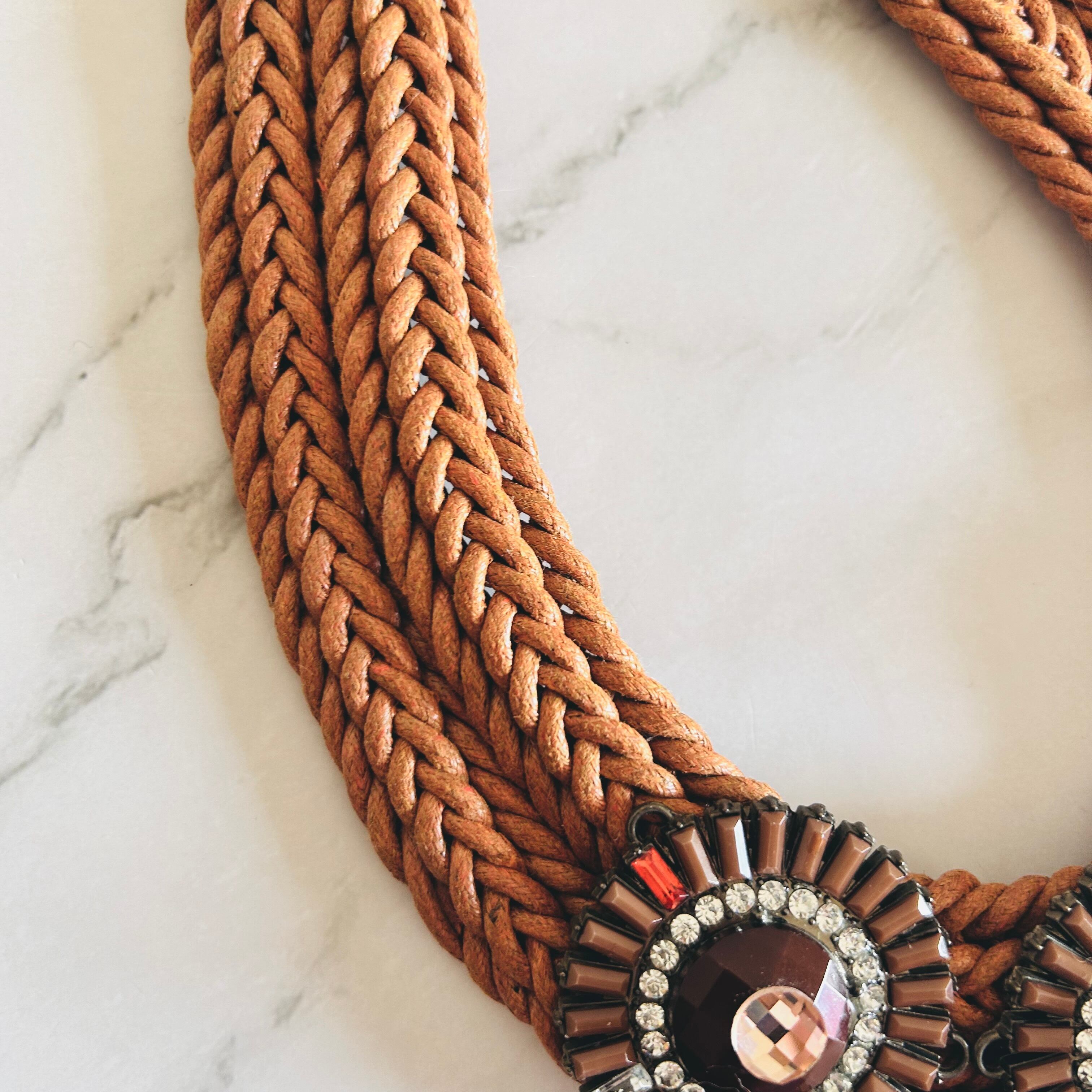 キャメルブラウンのコードを丁寧に編み込み、中央にはブラウン系の円形モチーフを3つ配置。