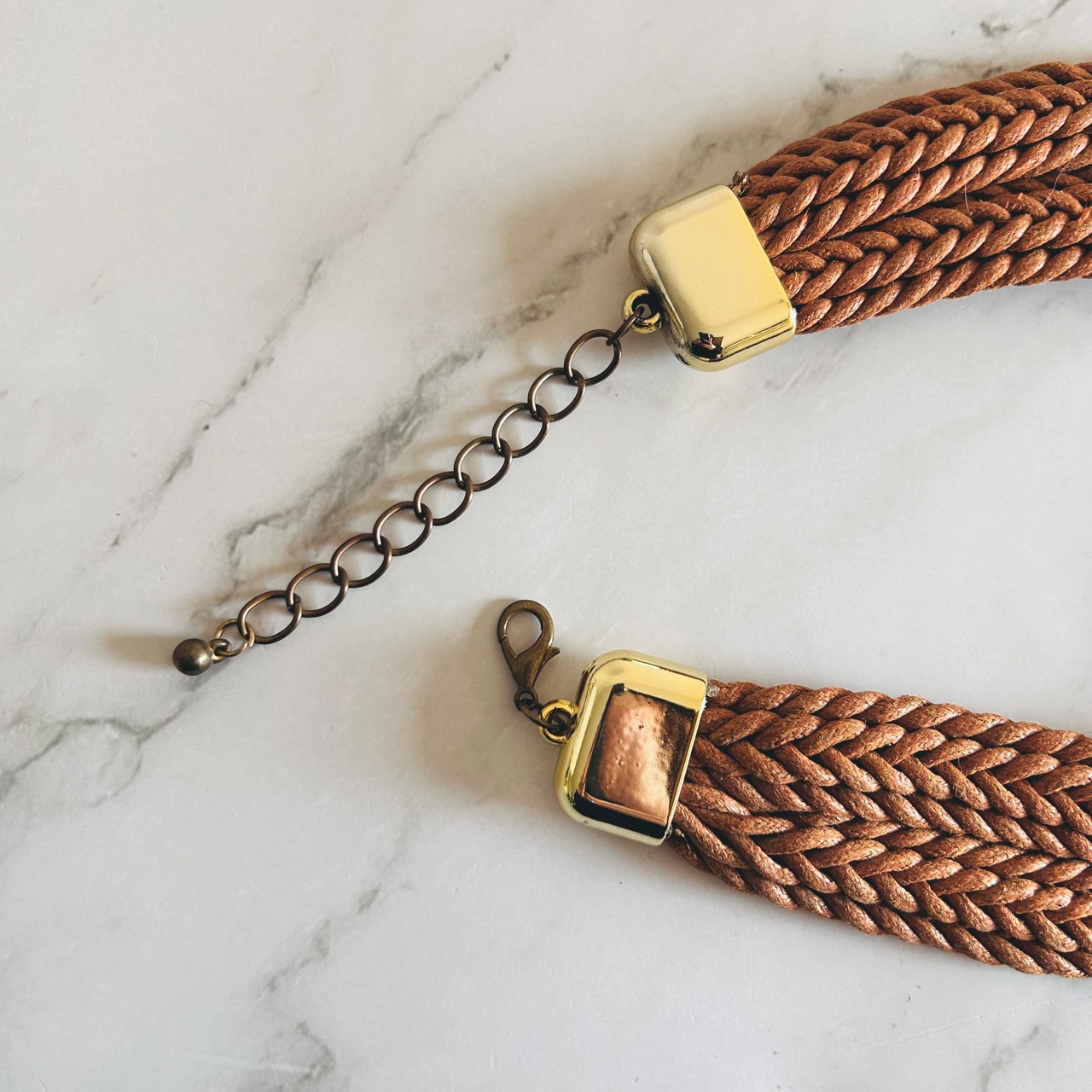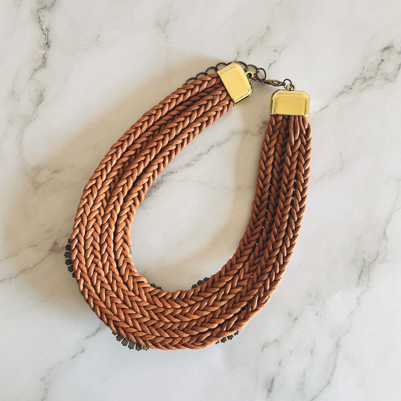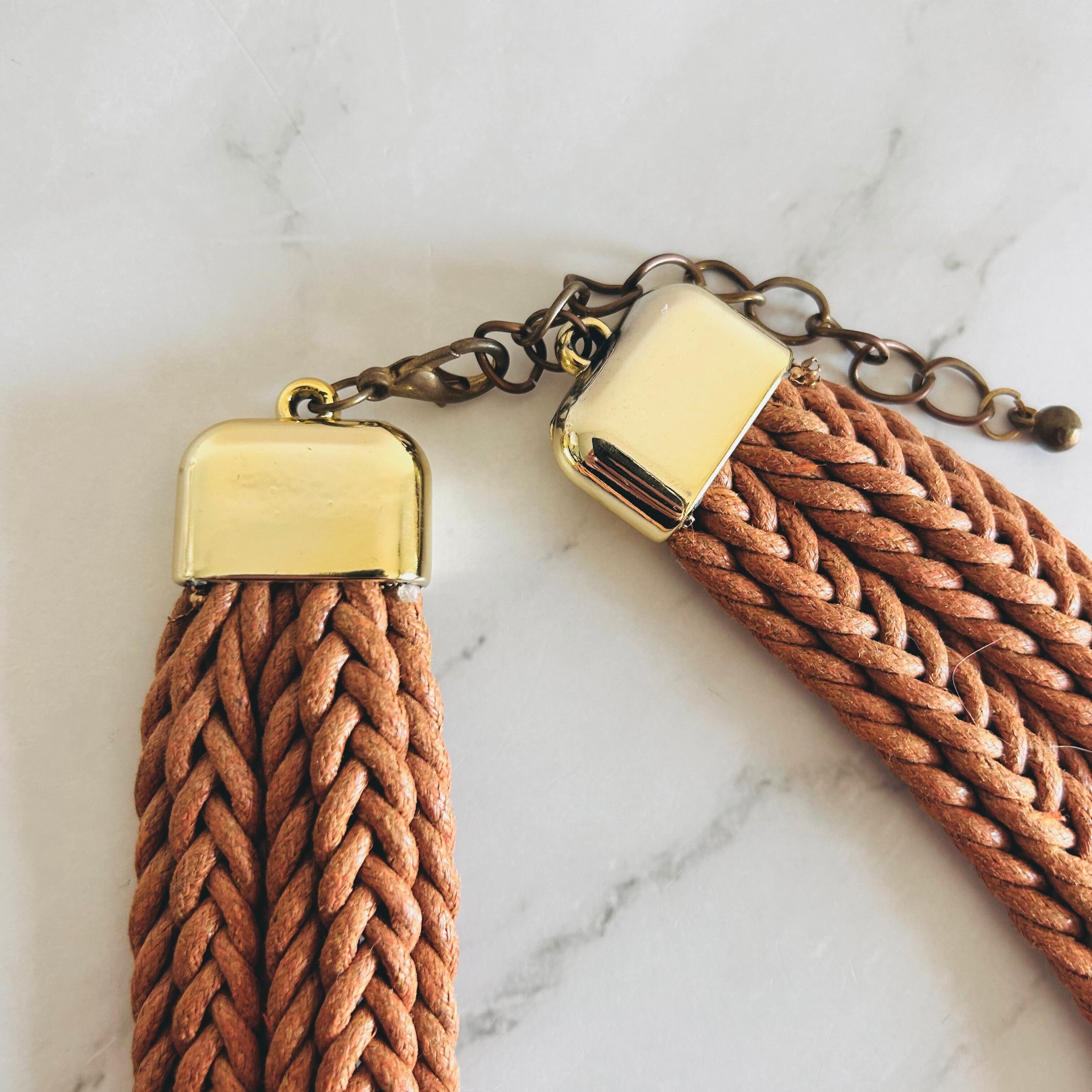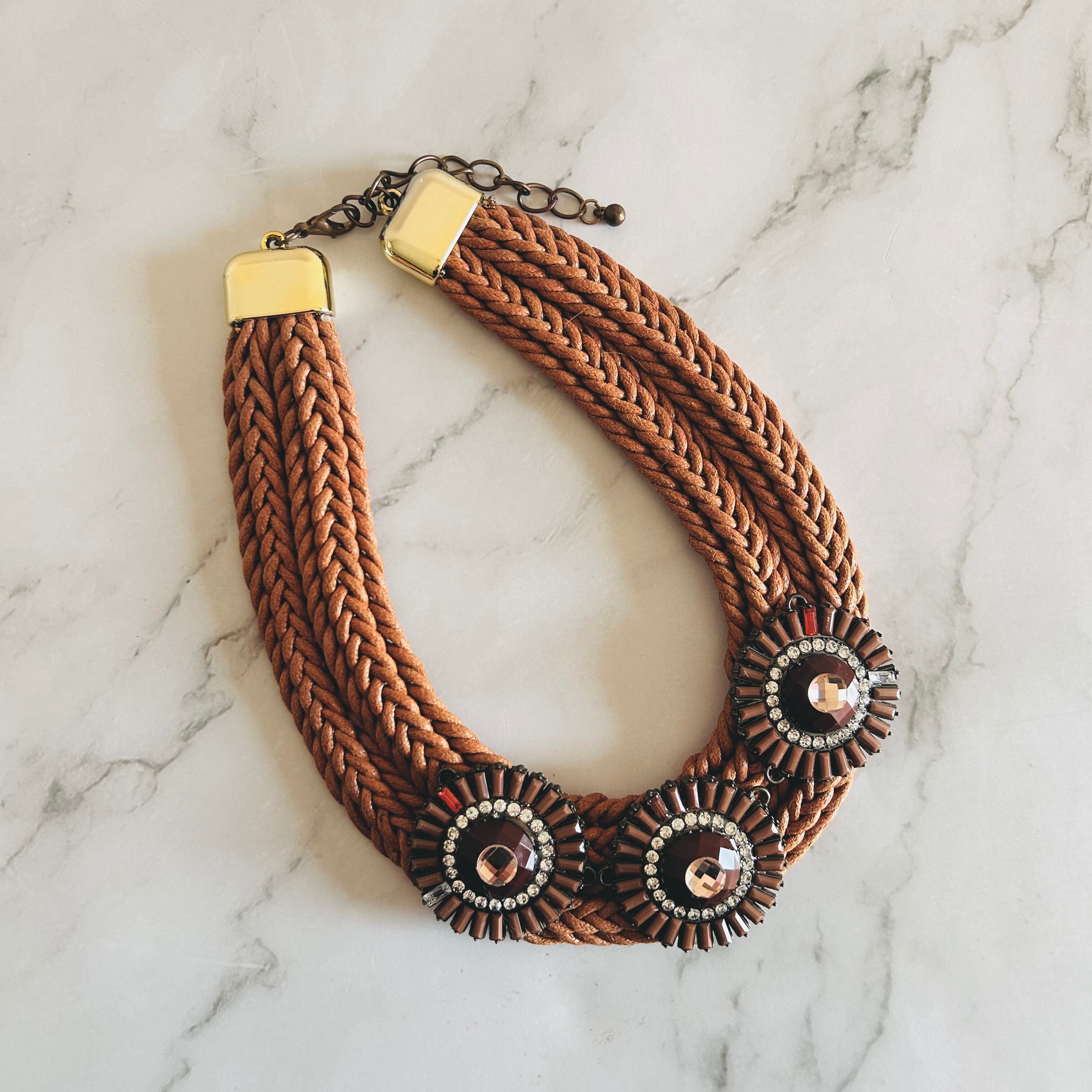 キャメルブラウンのコードを丁寧に編み込み、中央にはブラウン系の円形モチーフを3つ配置。