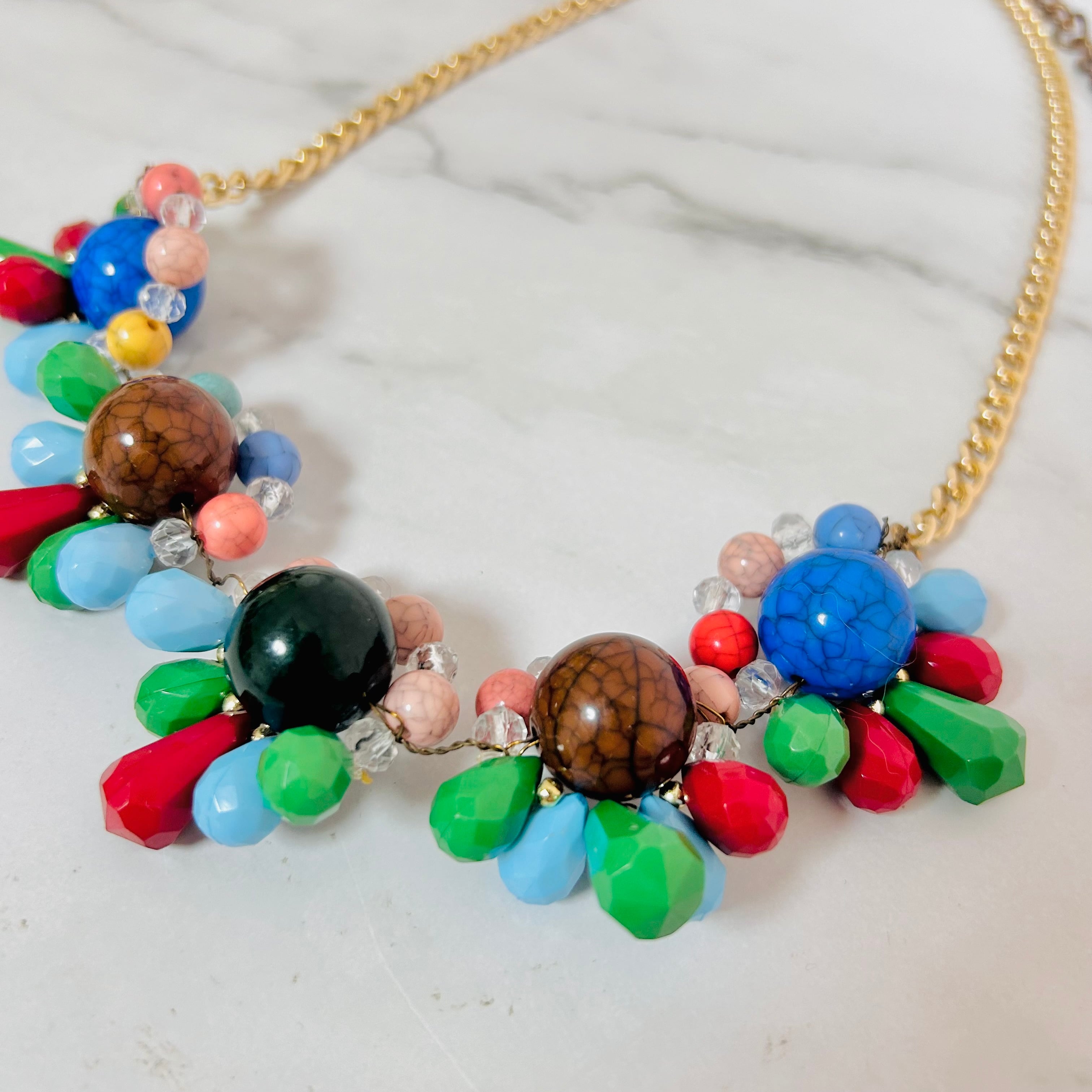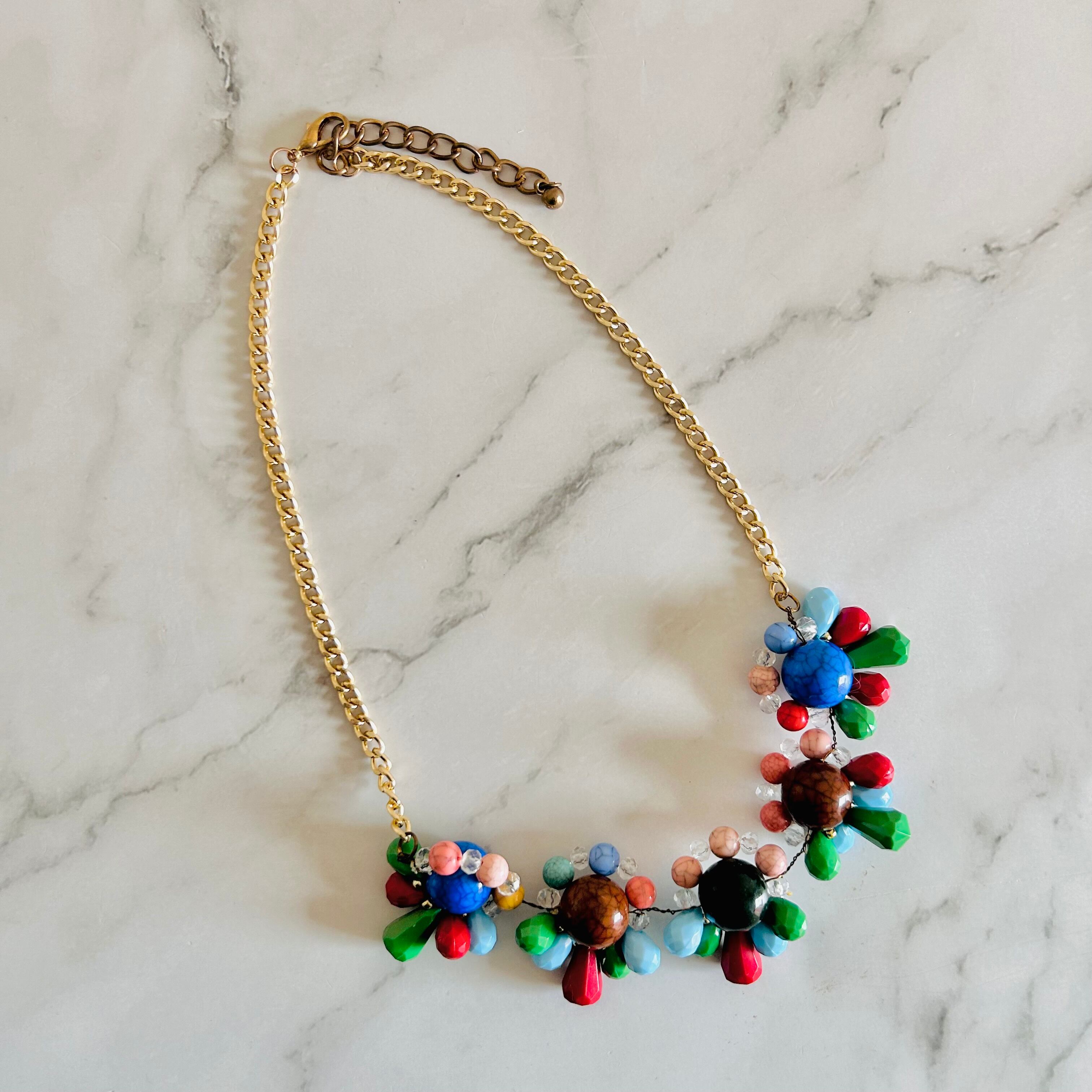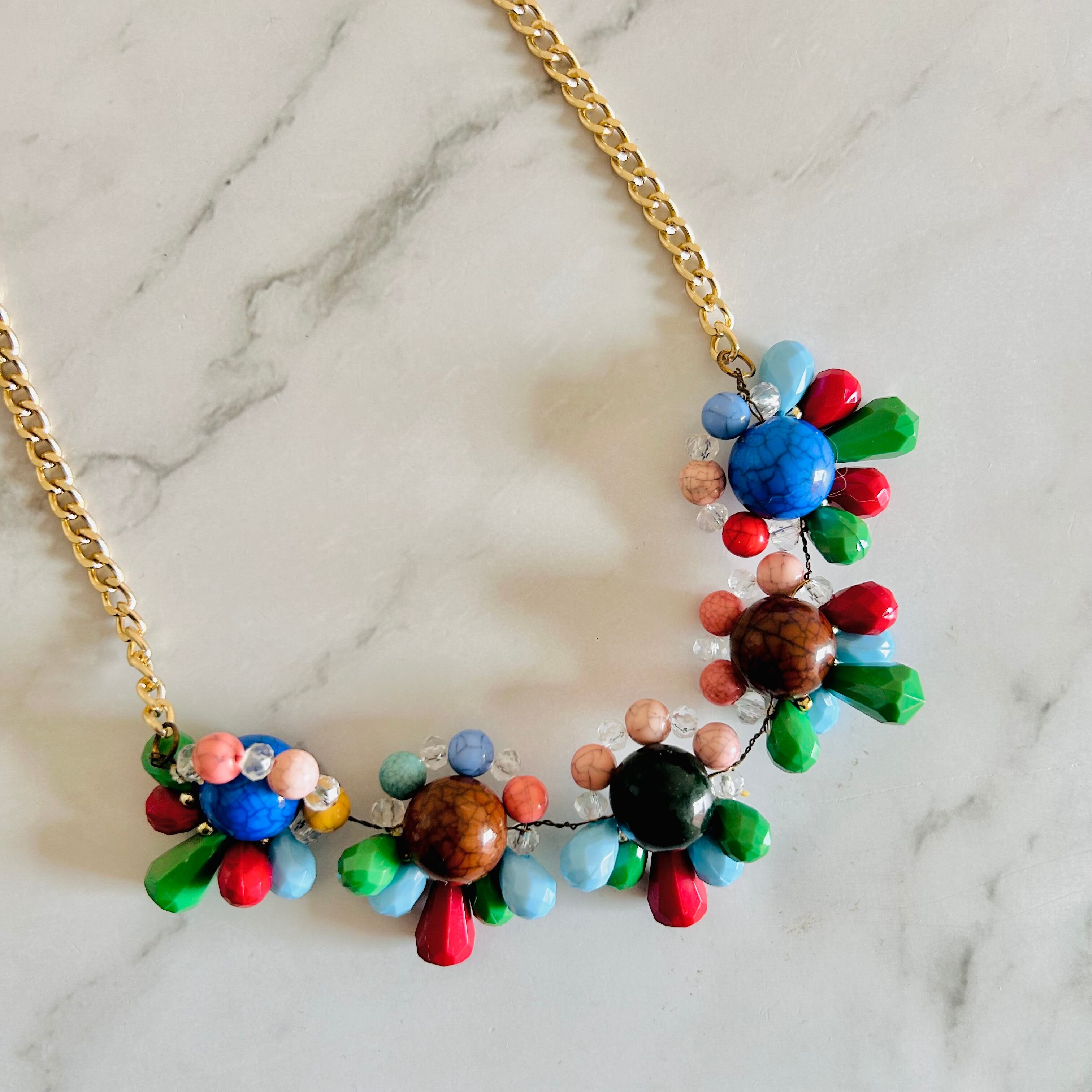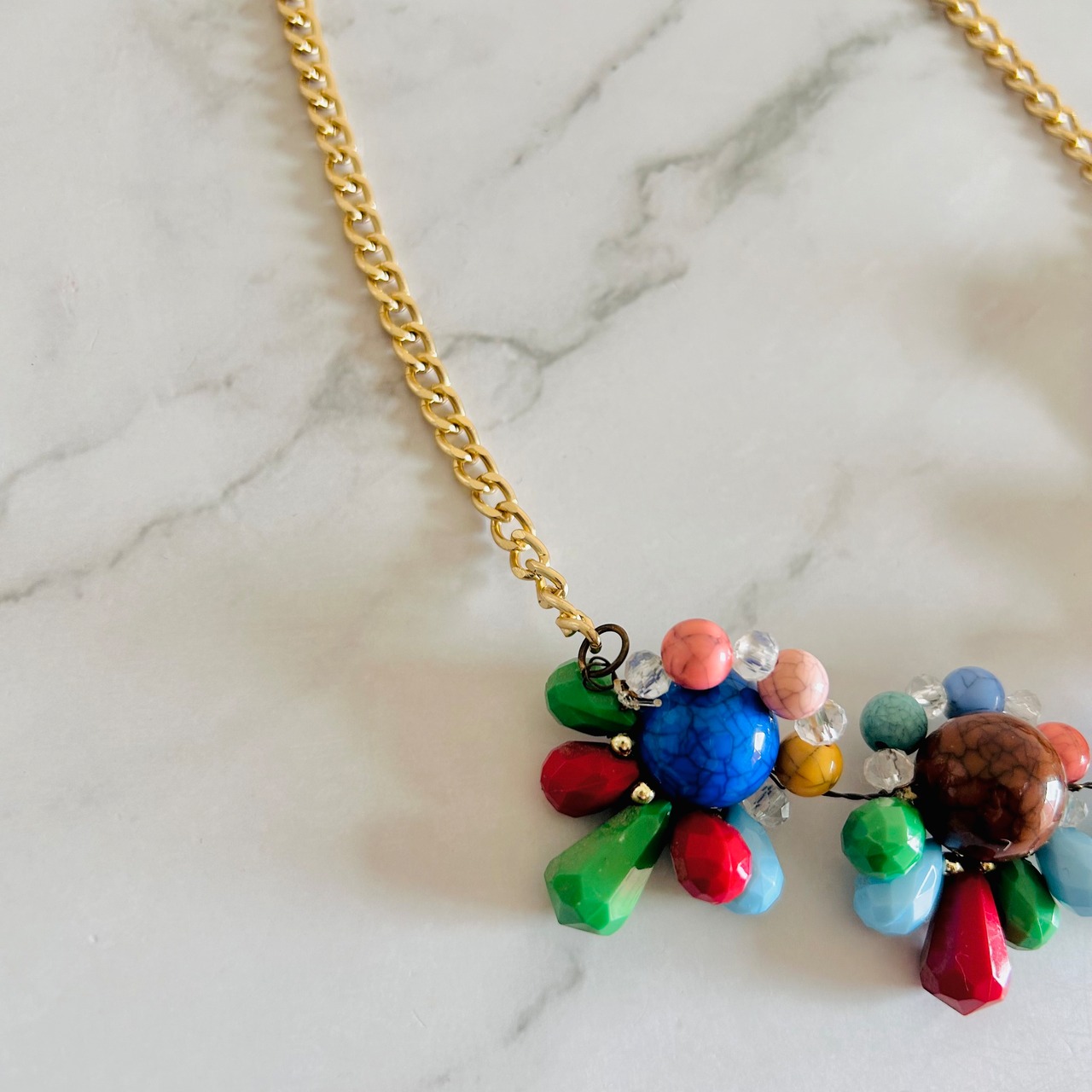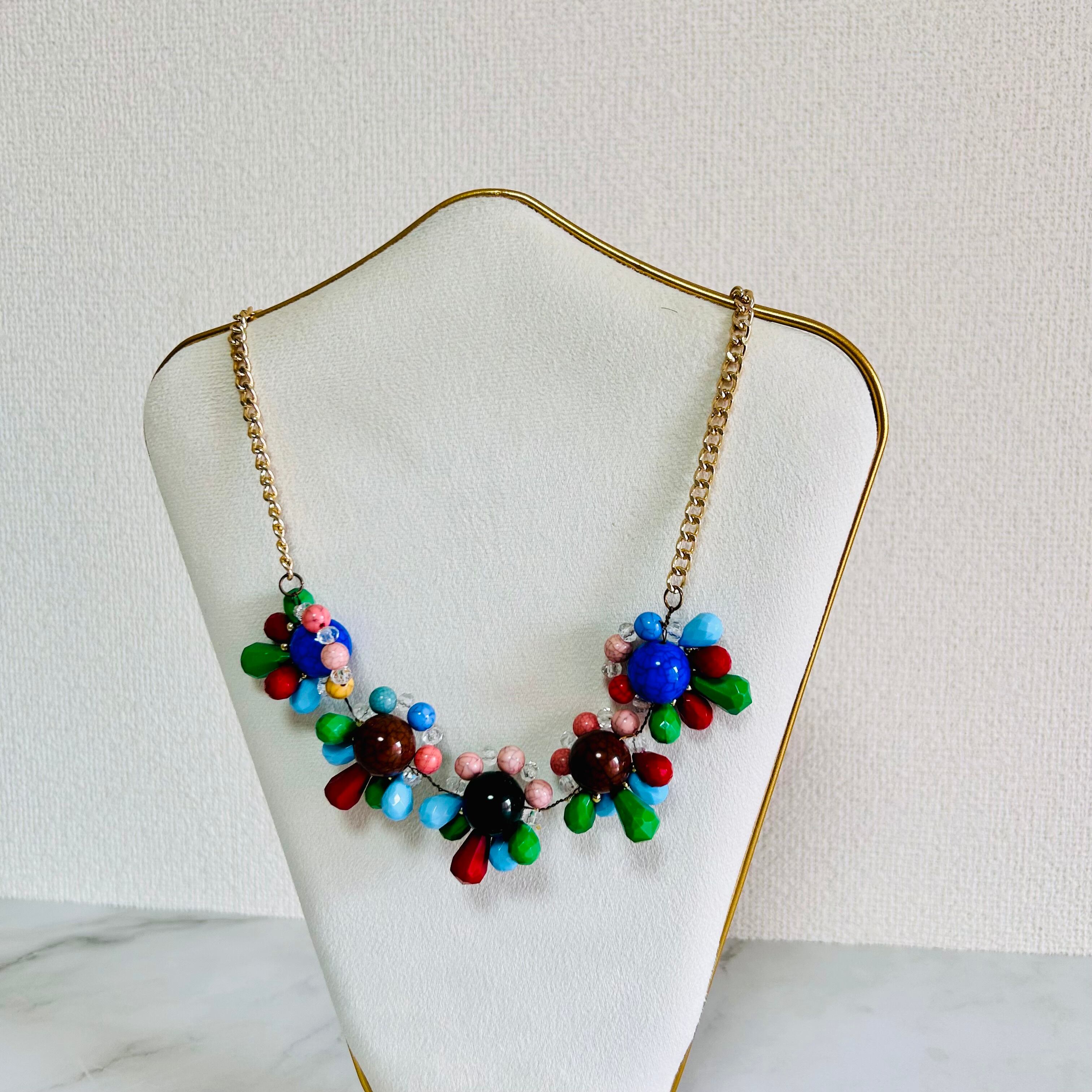 つるんと艶やかなアクリルパーツを使用し、ブルー・グリーン・ピンク・レッドなど多彩な色をミックスした遊び心あふれるフラワーモチーフのデザインです。