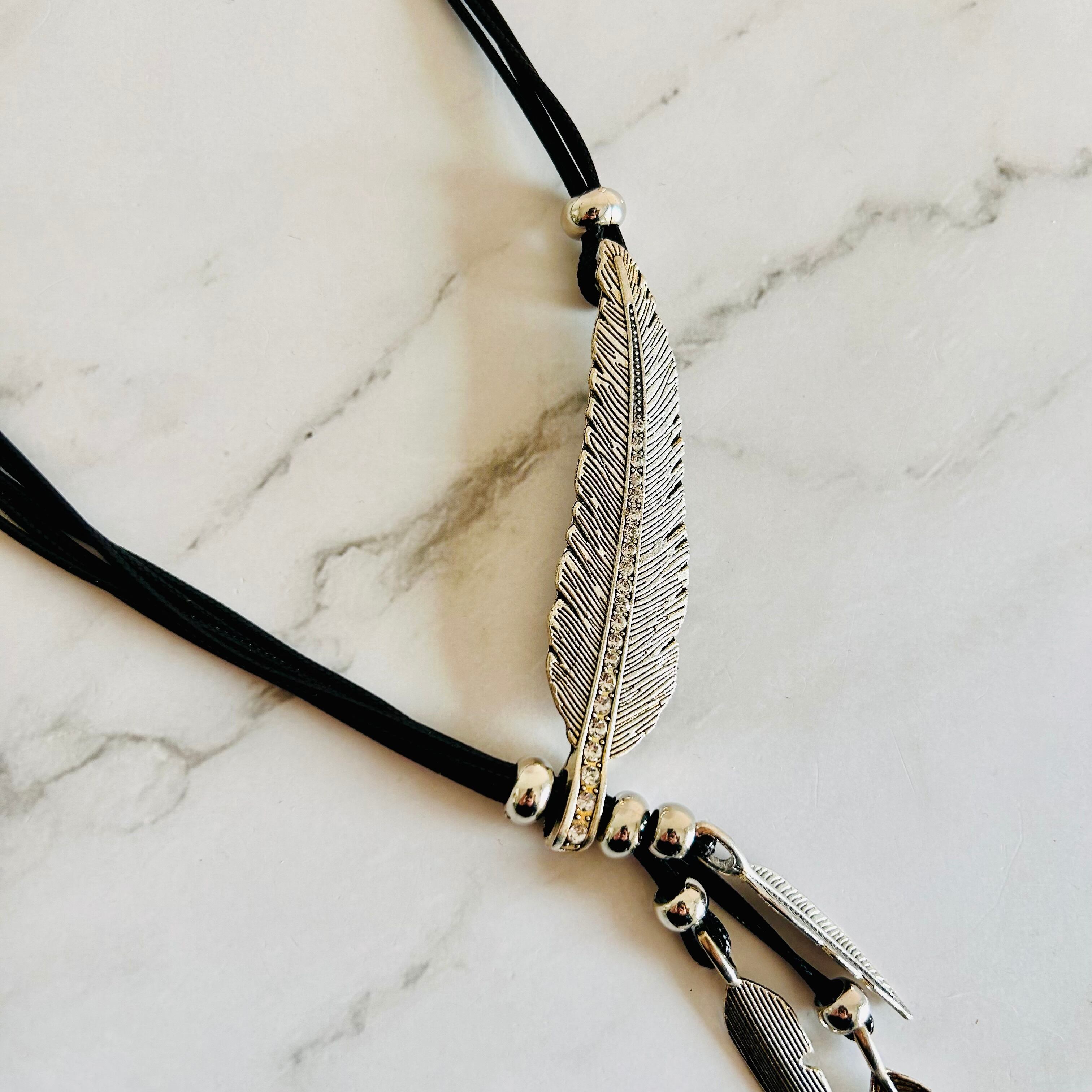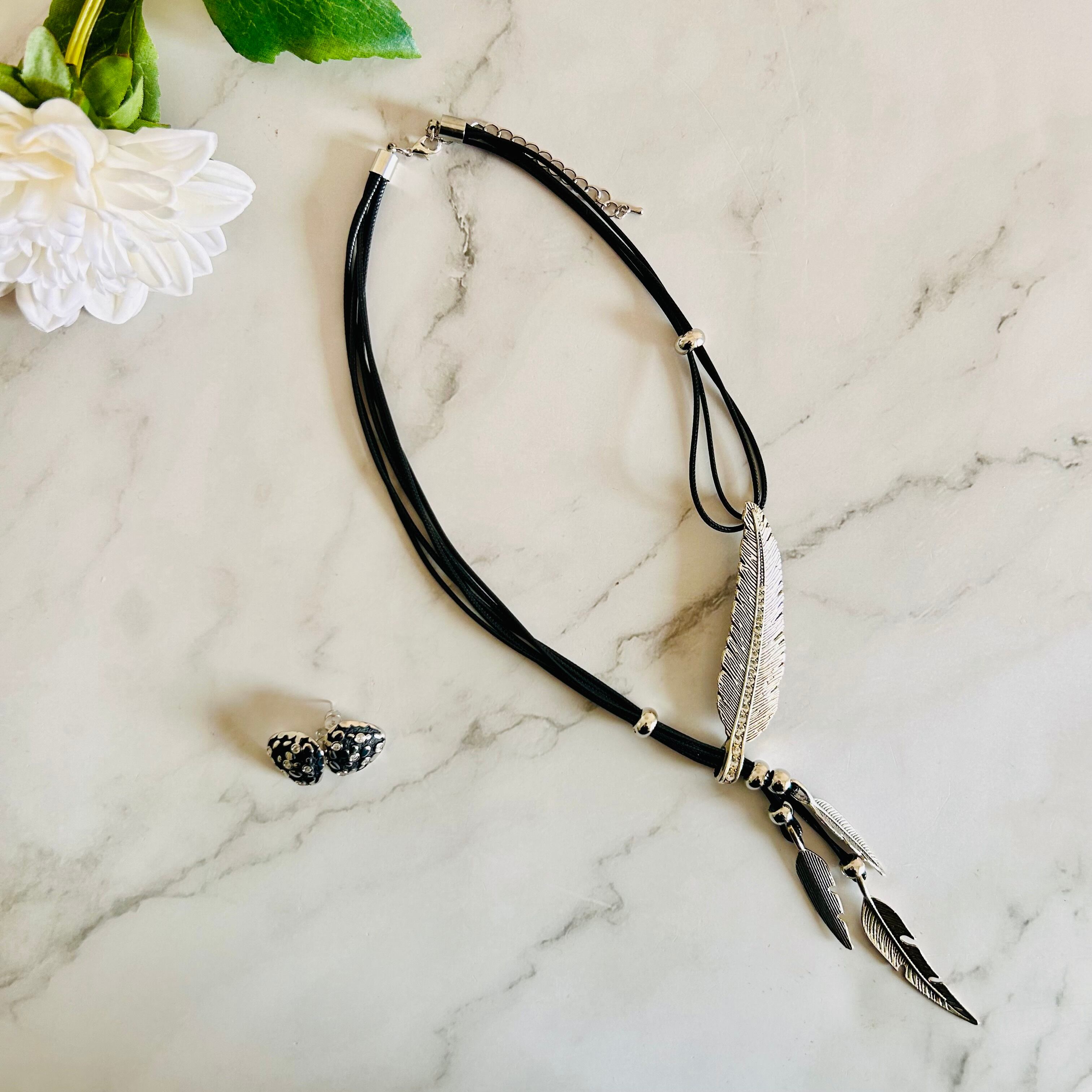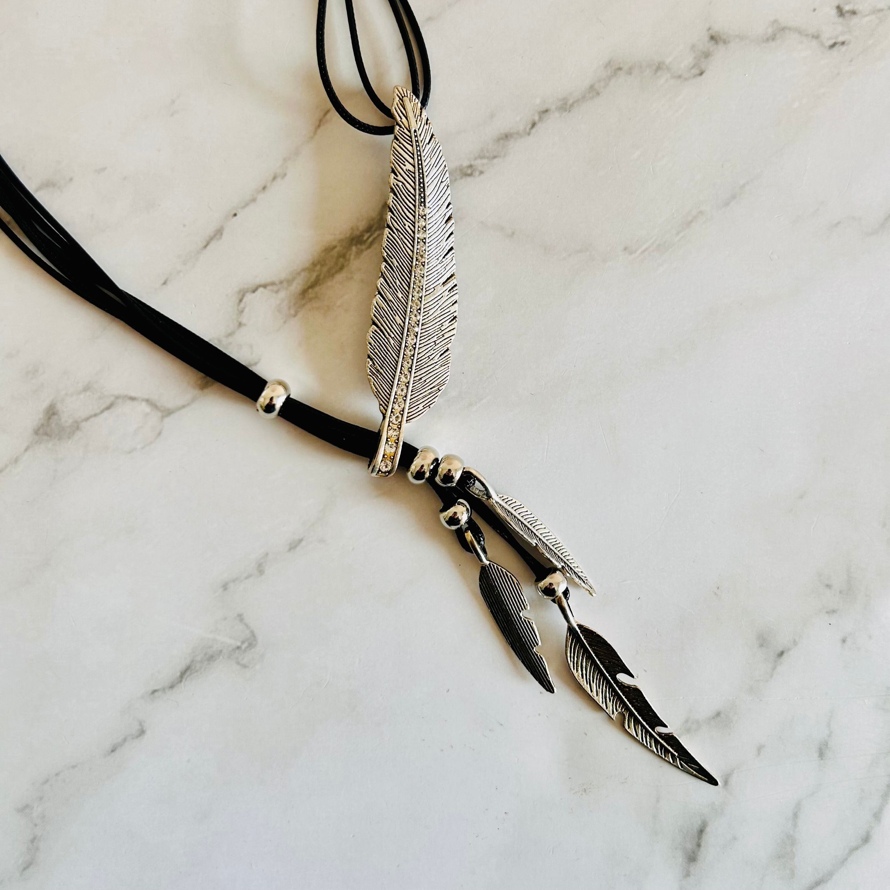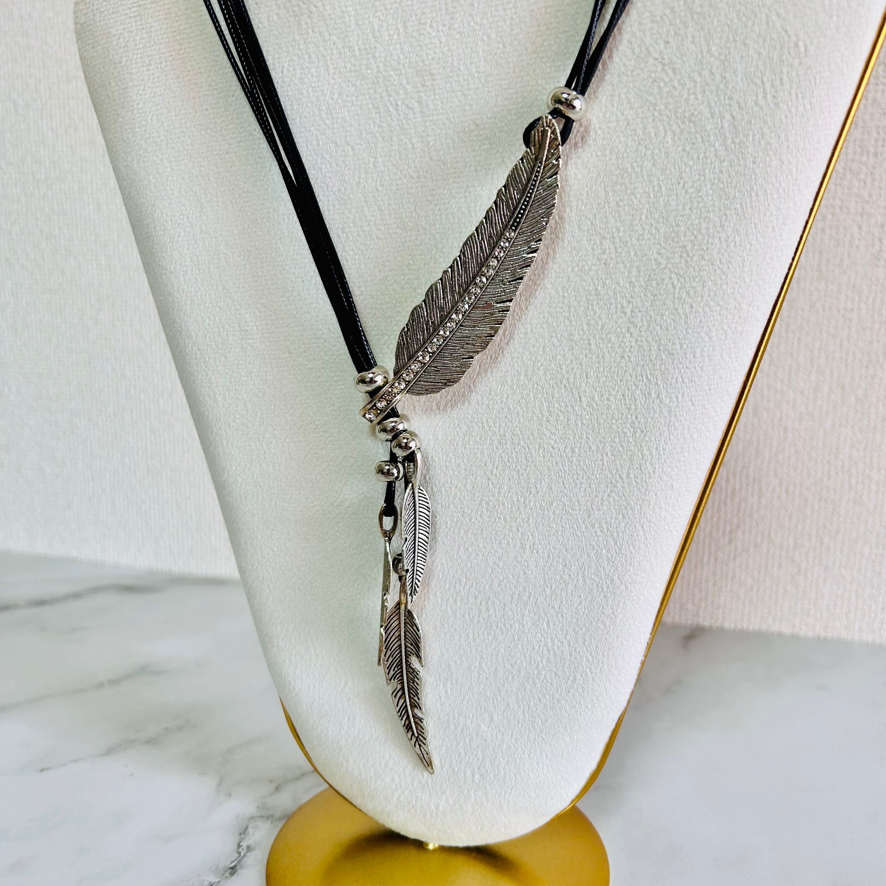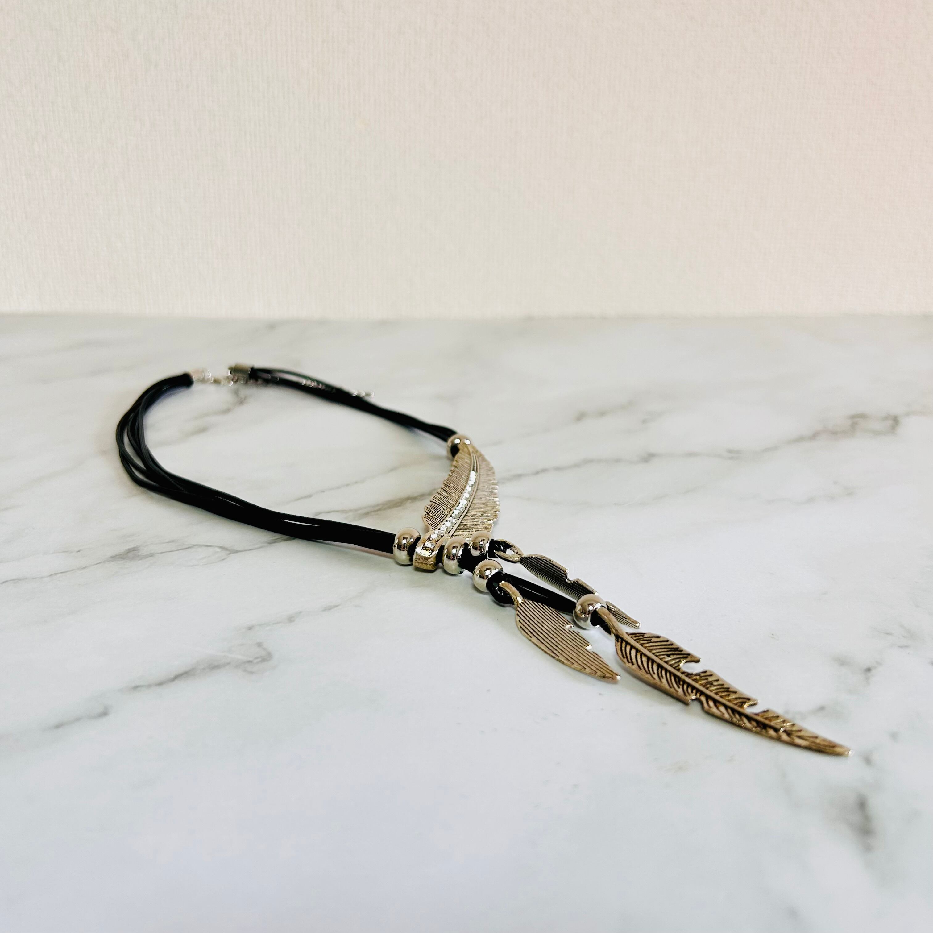 艶のあるブラックコードに、繊細な彫りが美しいアンティークシルバートーンのフェザーモチーフをあしらったネックレスです。