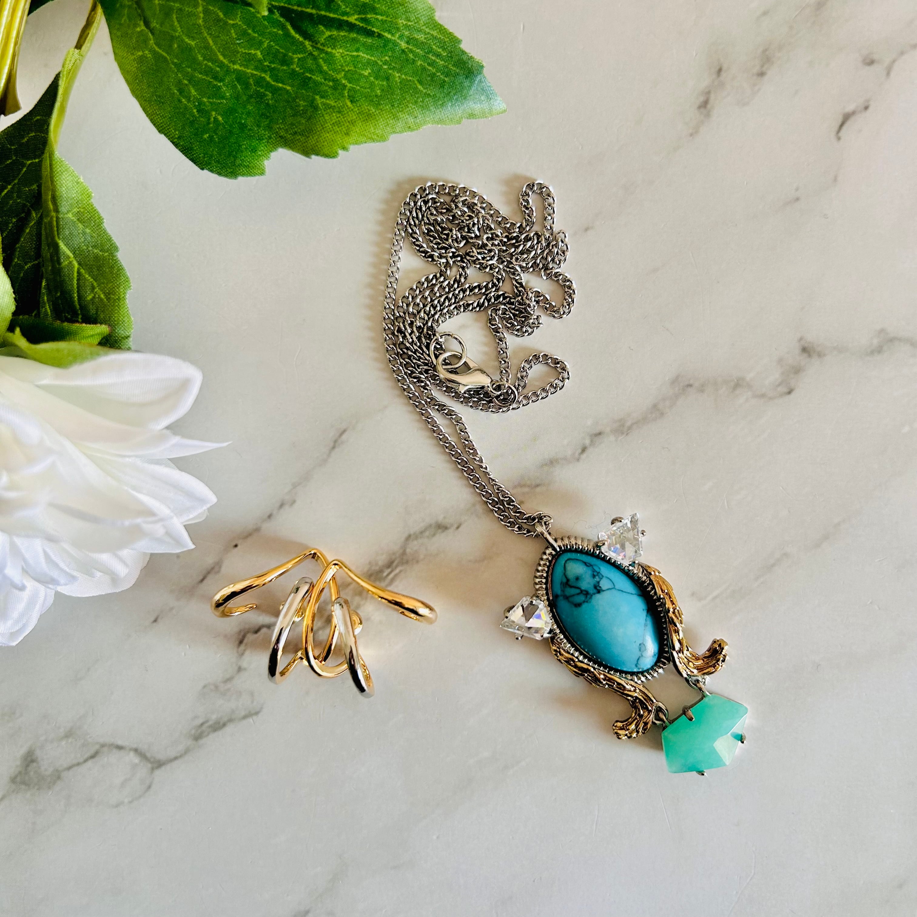 爽やかなターコイズブルーのストーンを中心に、透明感のあるクリスタルと淡いミントグリーンのストーンパーツを組み合わせたデザインです。