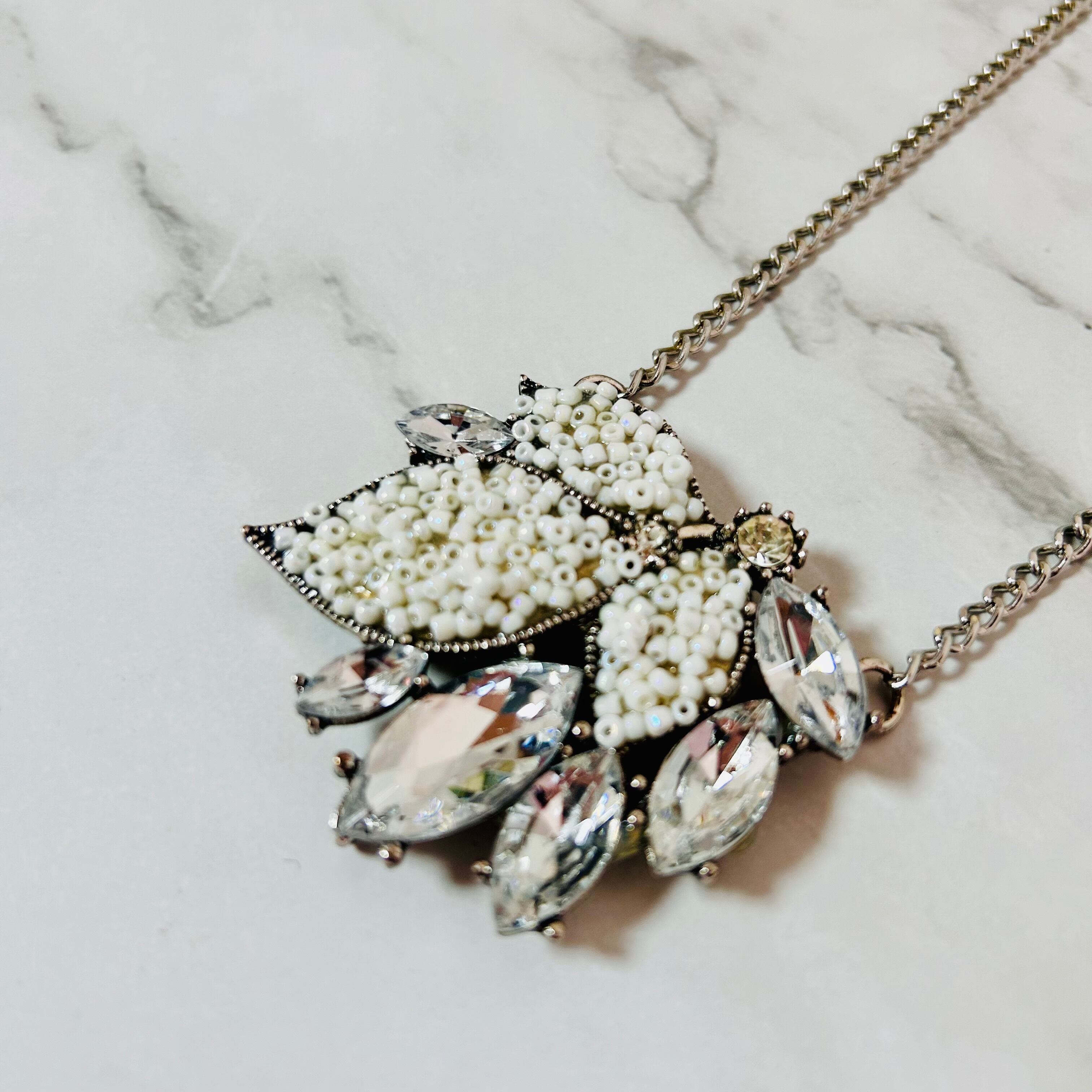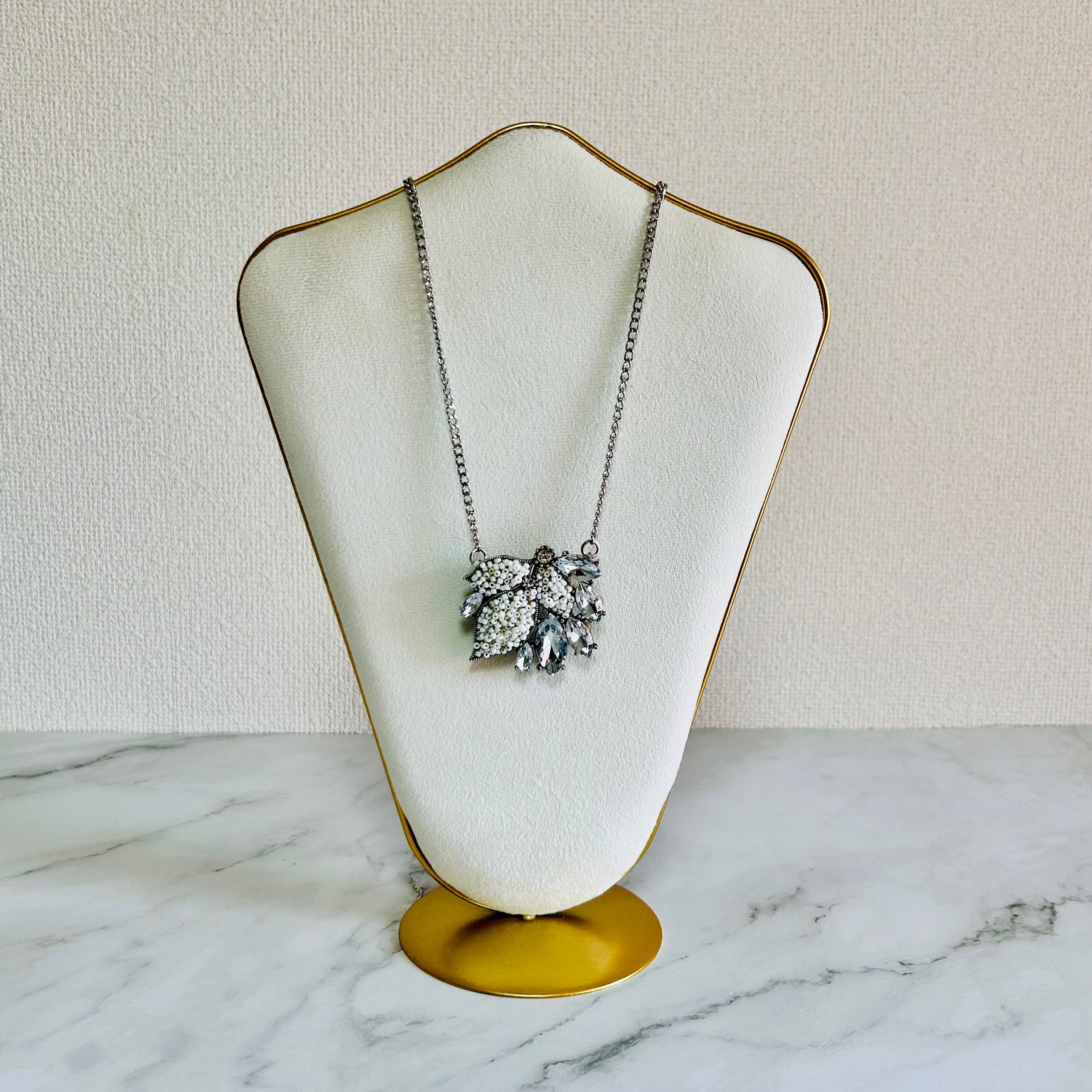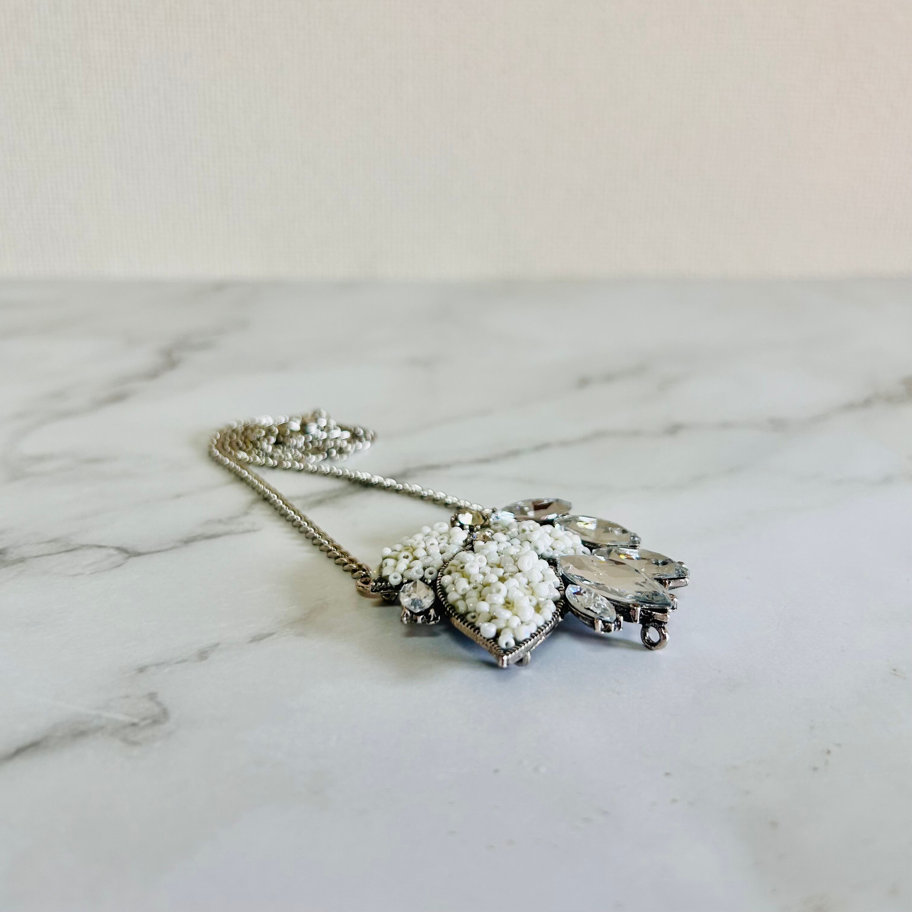 美しいクリアストーンと、ホワイトの極小ビーズを繊細に組み合わせたトップモチーフが目を惹くネックレスです。