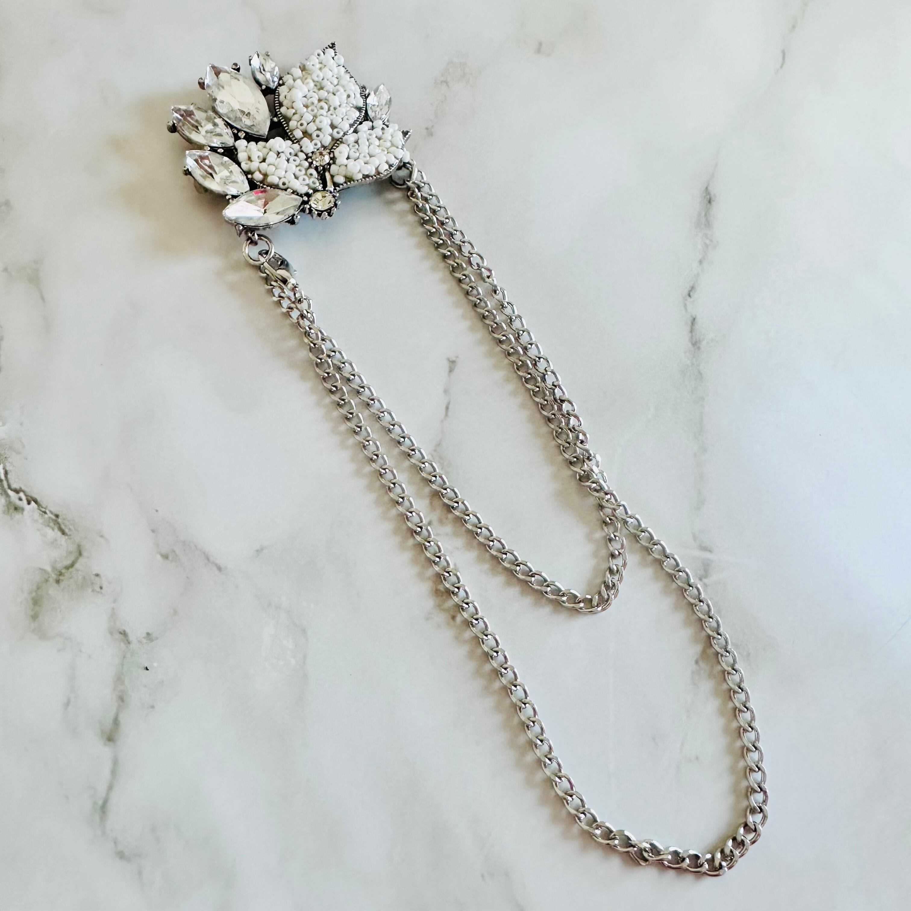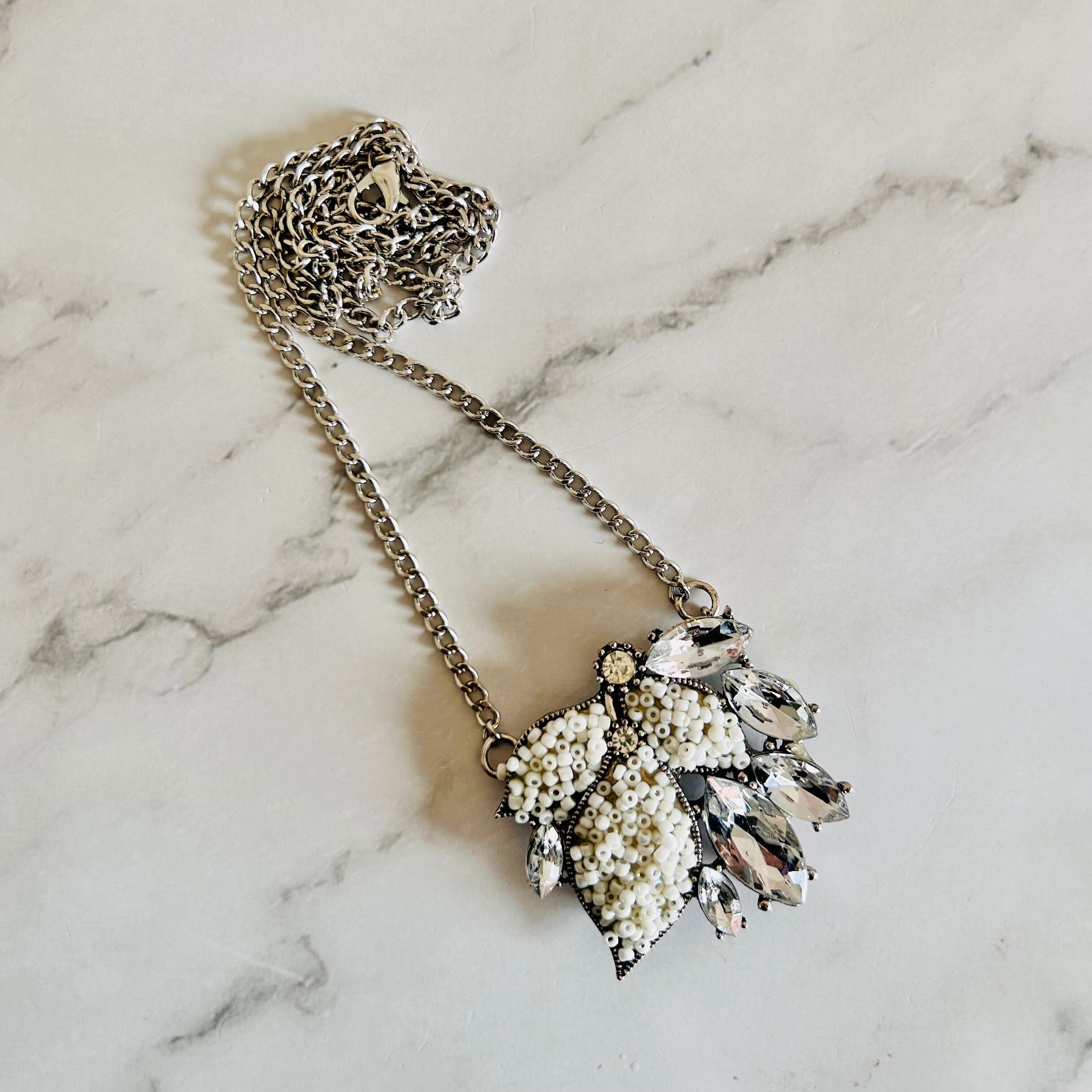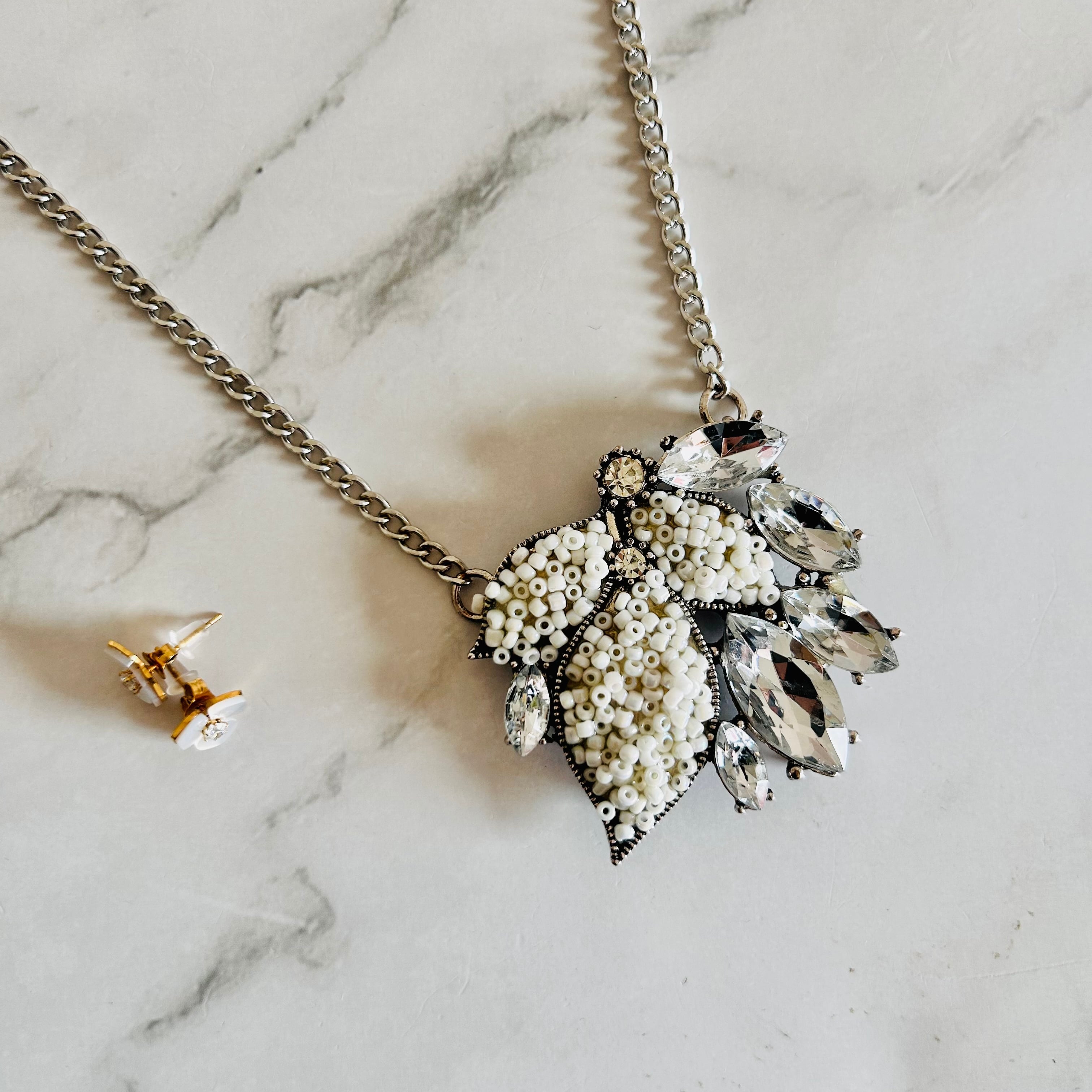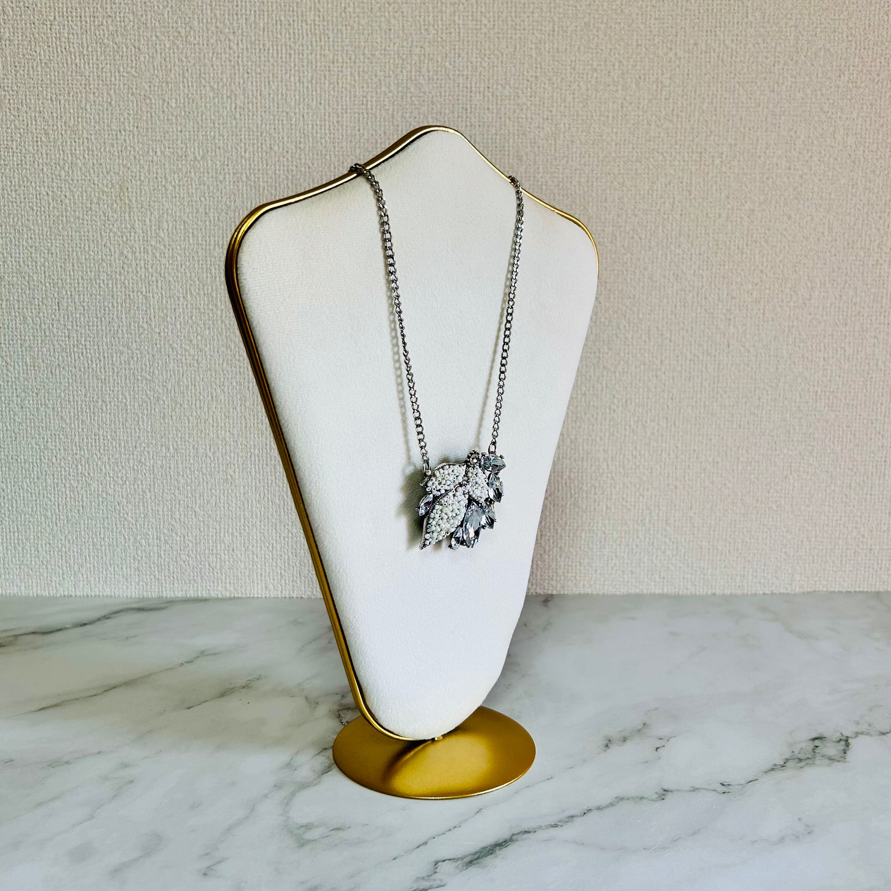 美しいクリアストーンと、ホワイトの極小ビーズを繊細に組み合わせたトップモチーフが目を惹くネックレスです。