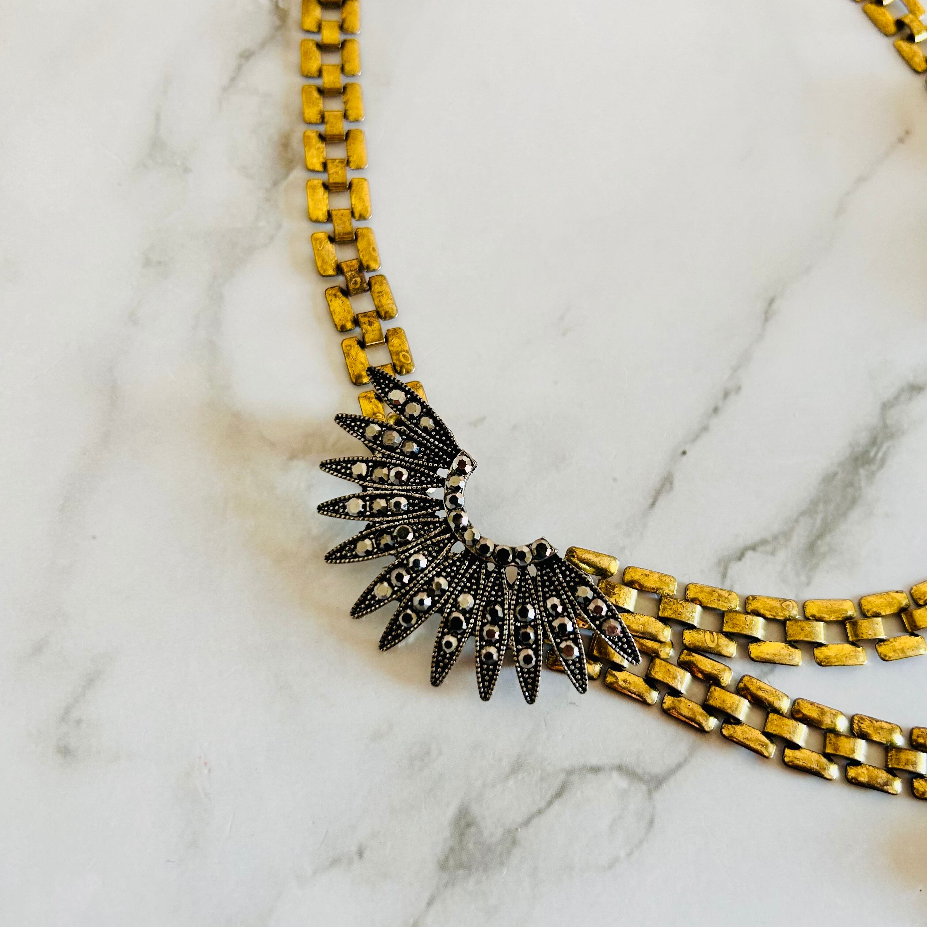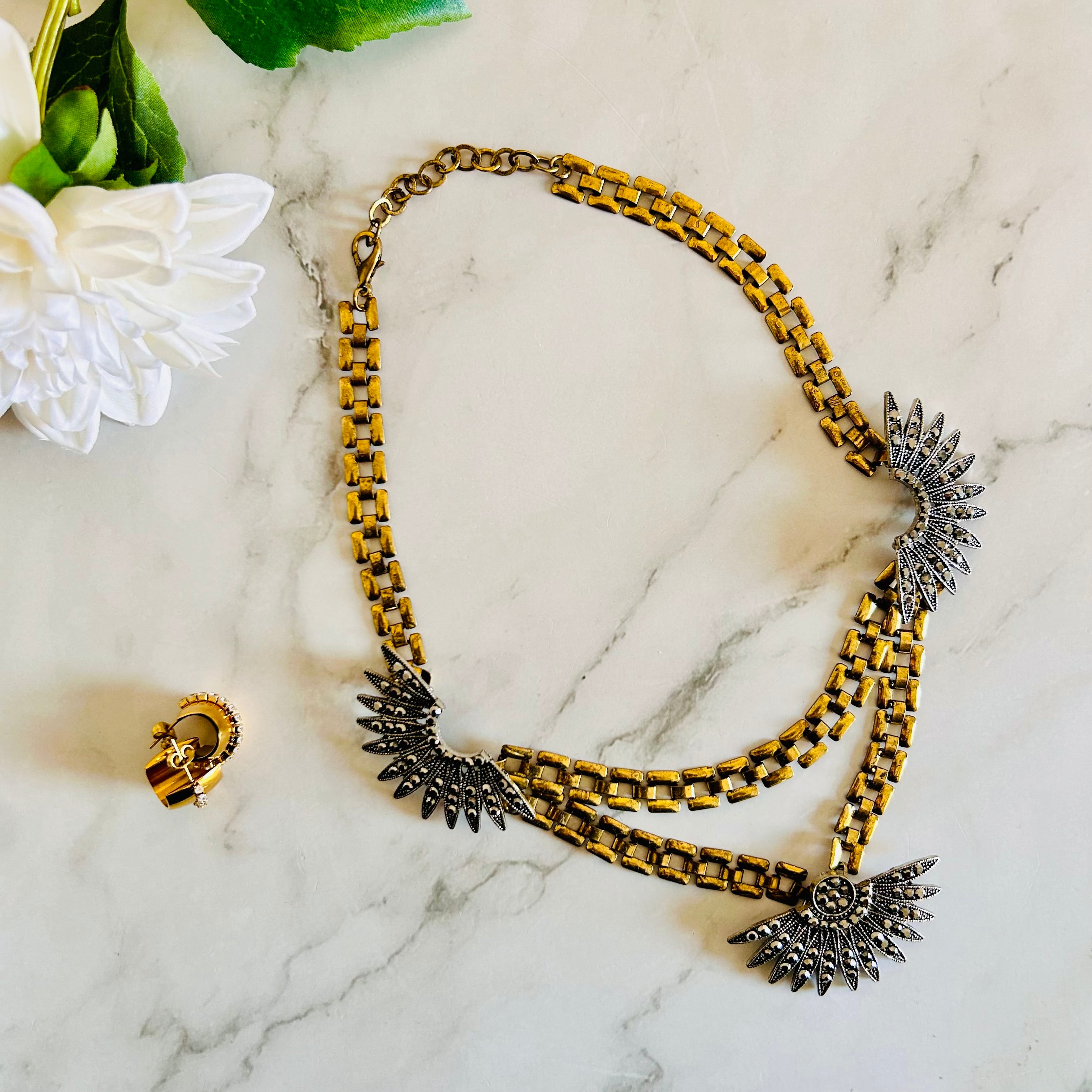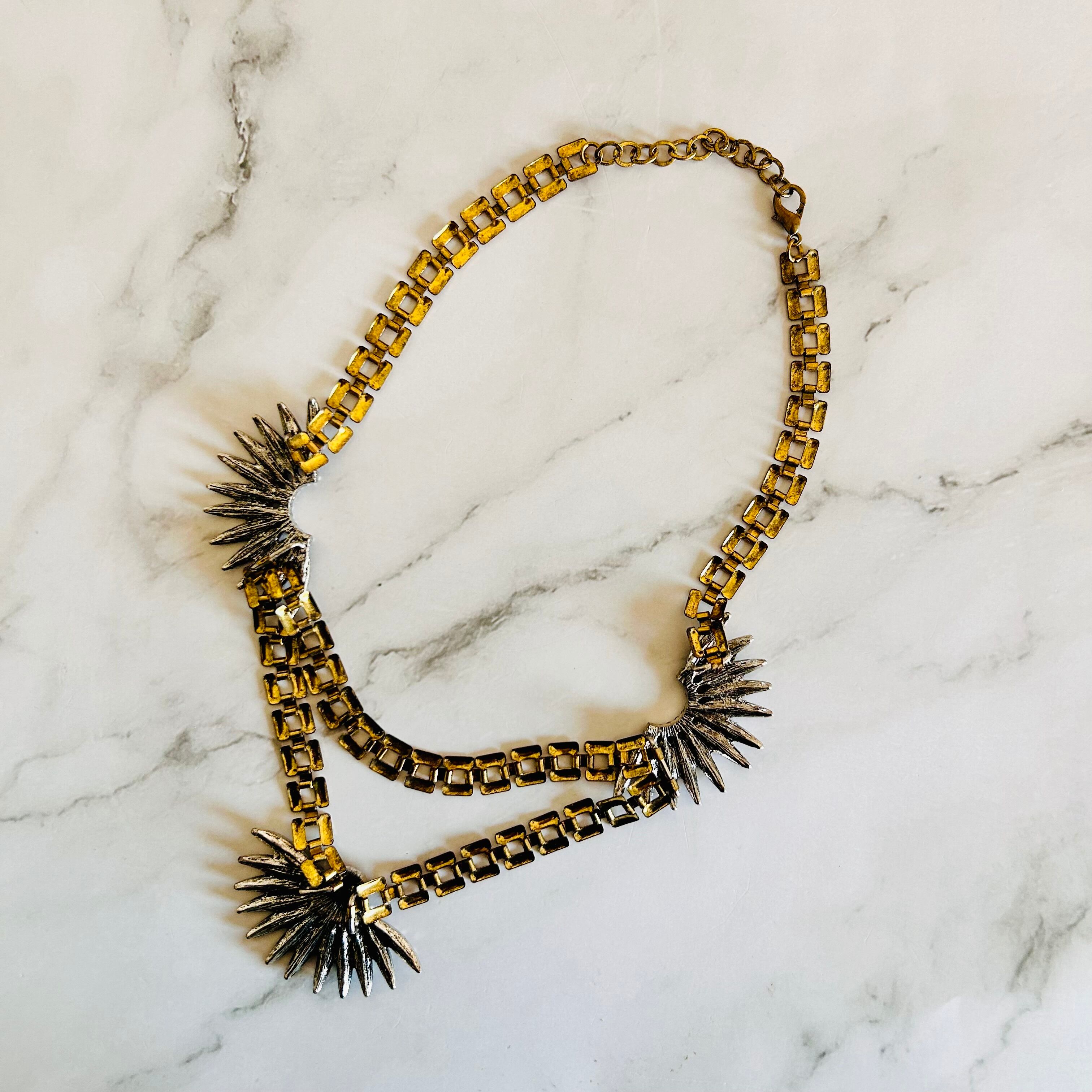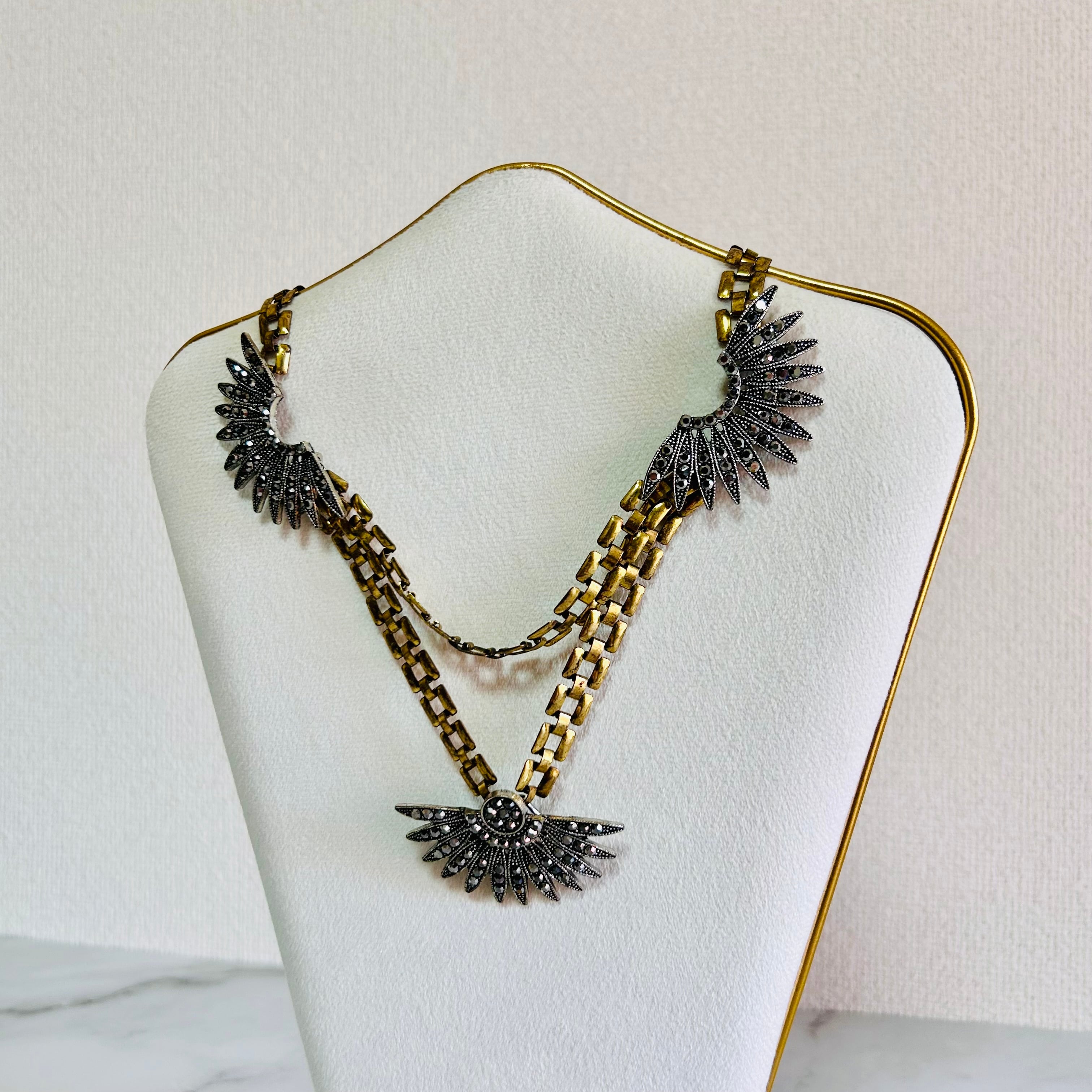 アンティークゴールドカラーのチェーンに、メタルブラックビジューを埋め込んだ放射状モチーフを大胆にあしらったデザイン。