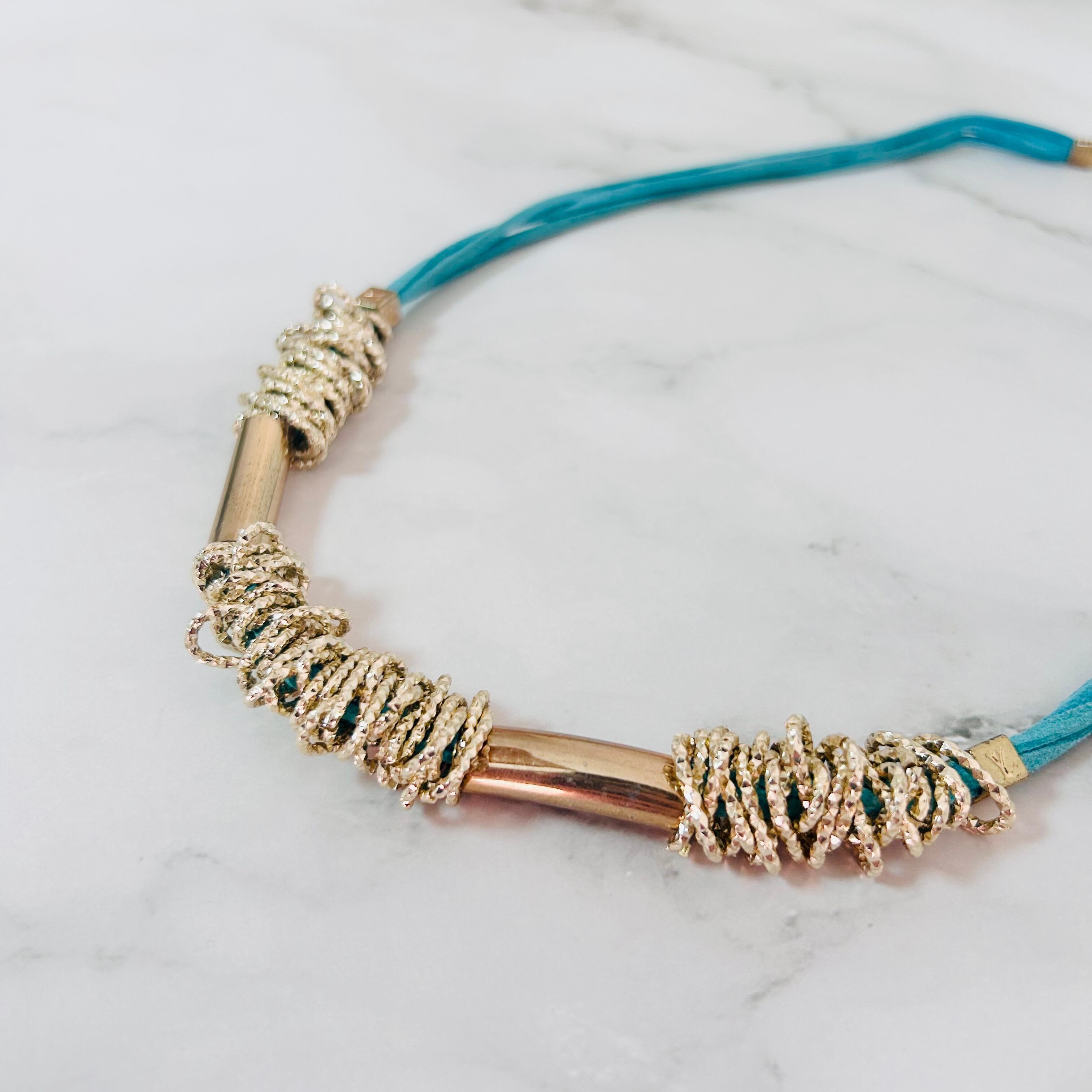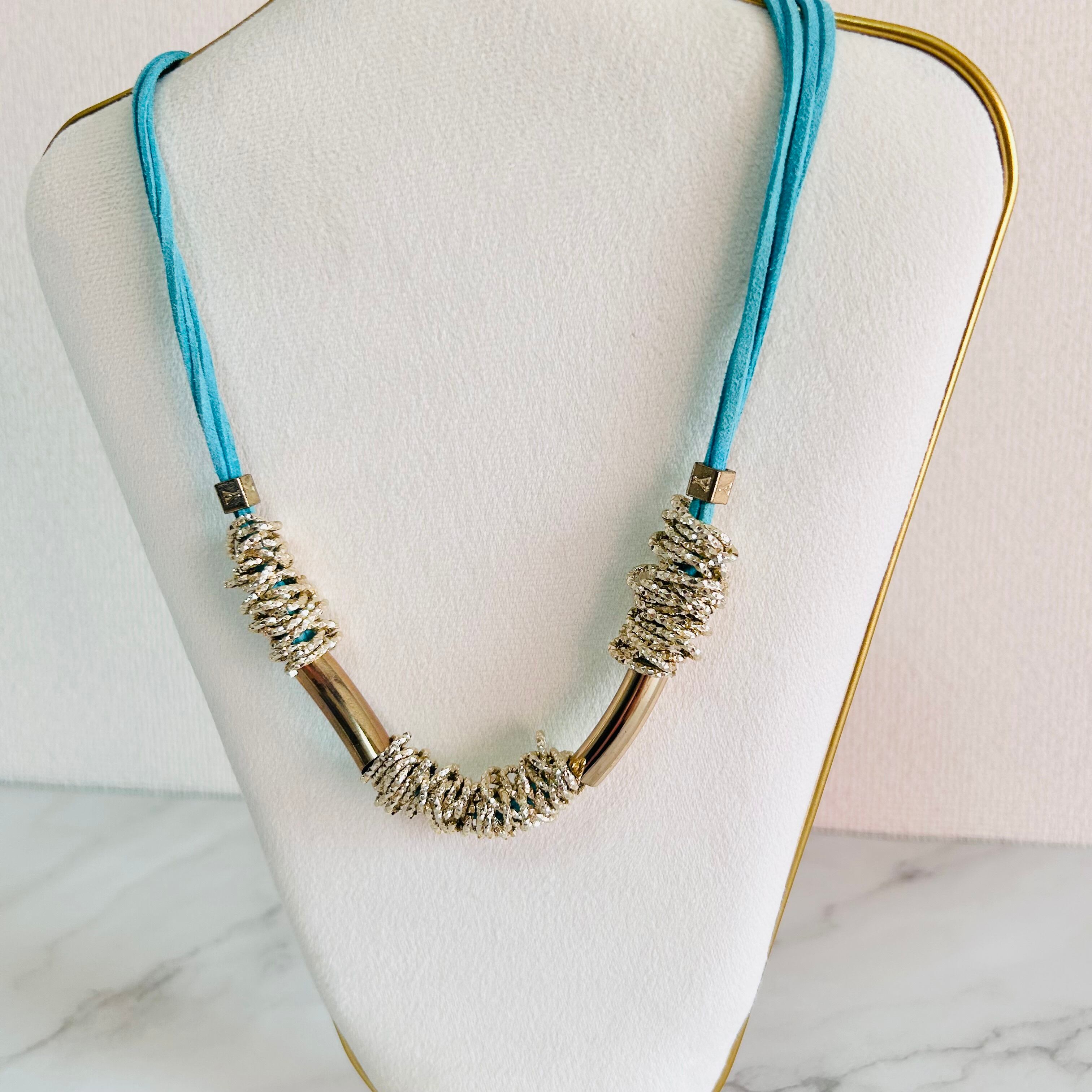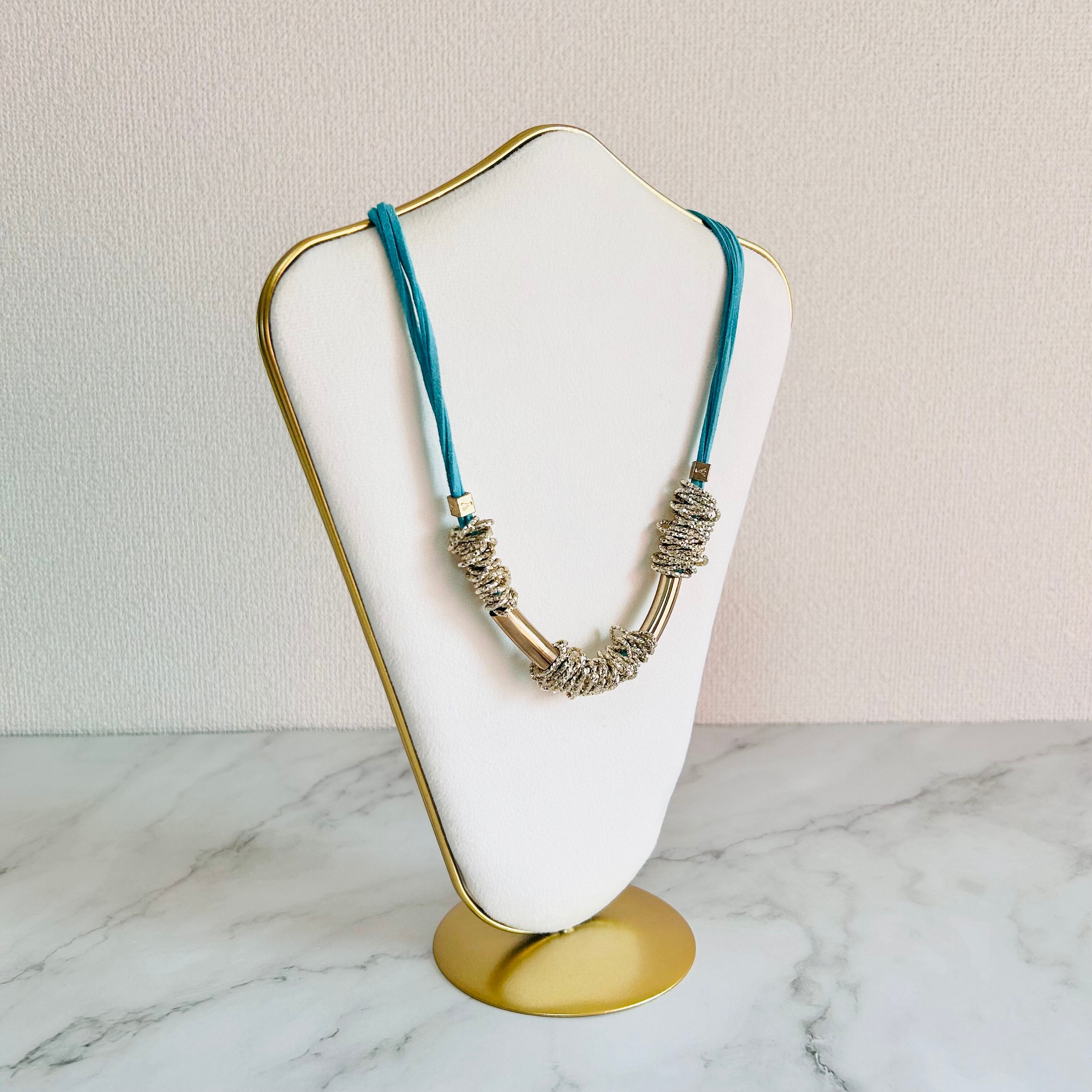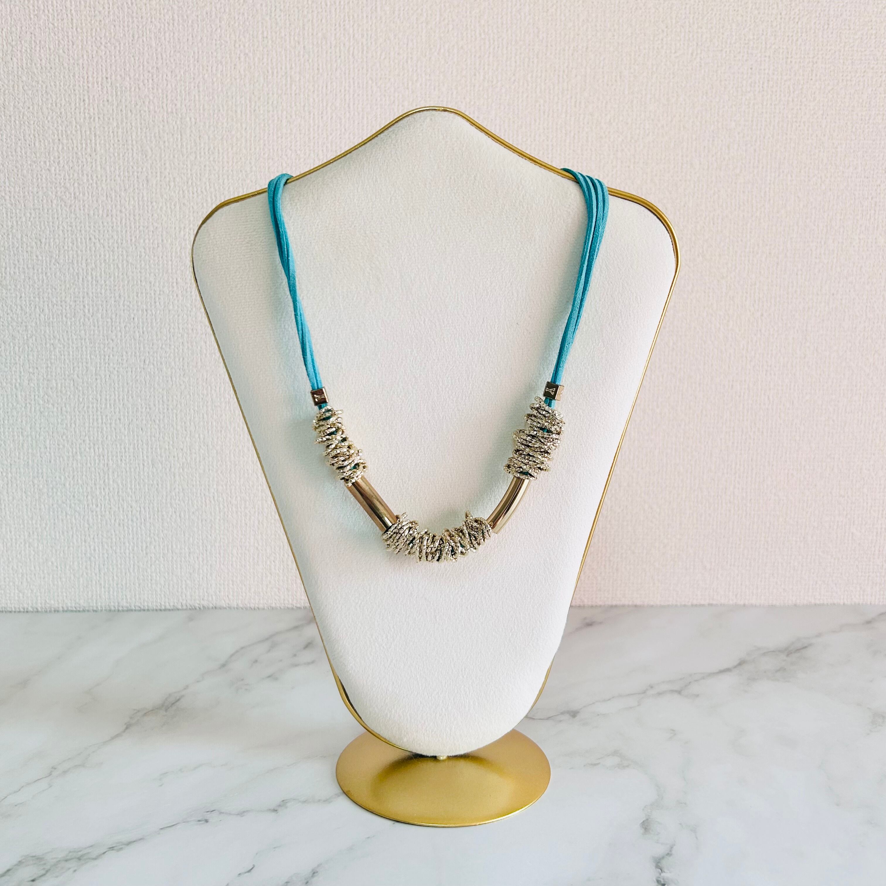 鮮やかなターコイズブルーのレザーコードに、ゴールドトーンのメタルバーと、ラフに重ねられた細かなメタルリングがアクセントになったさりげなく個性が表現できるネックレスです。