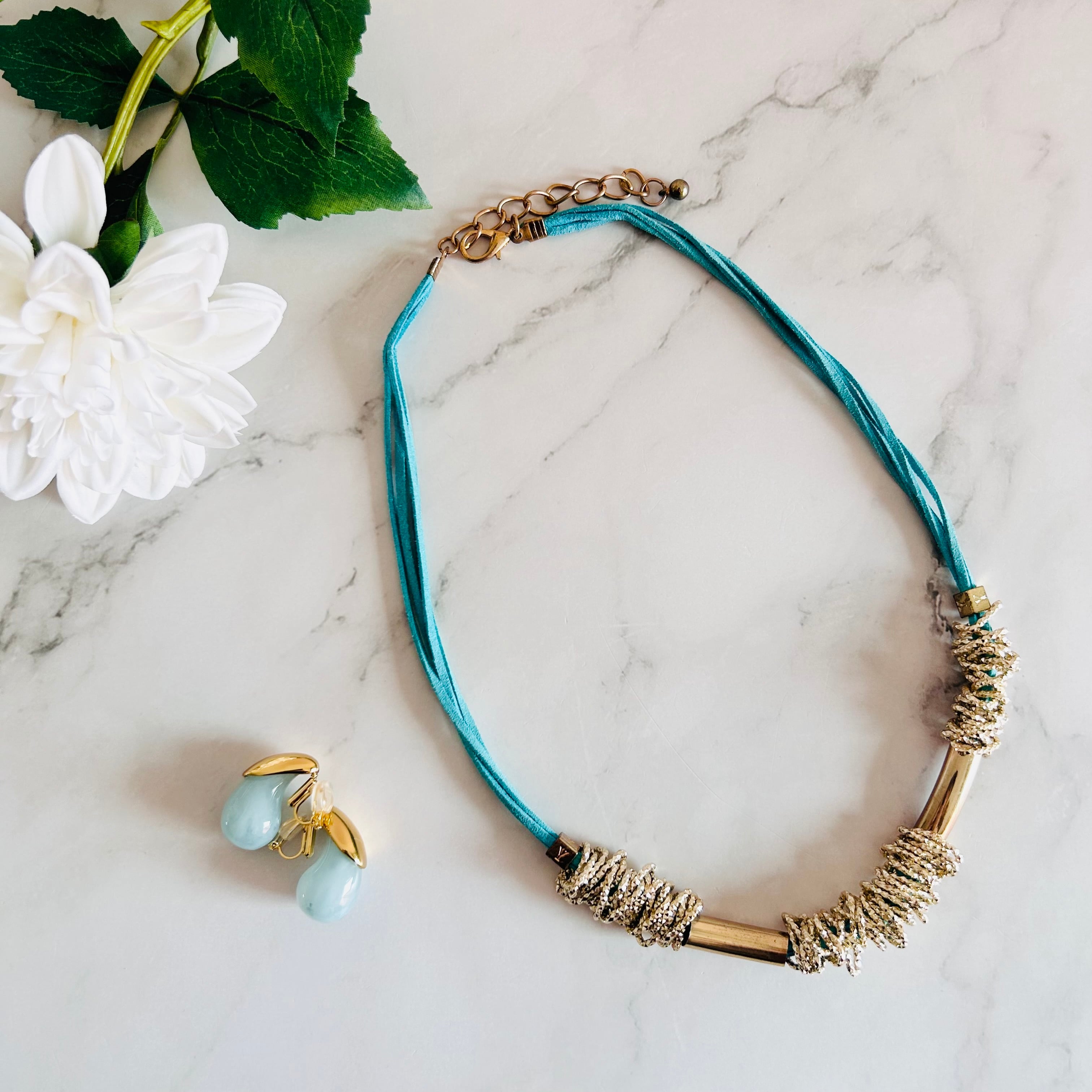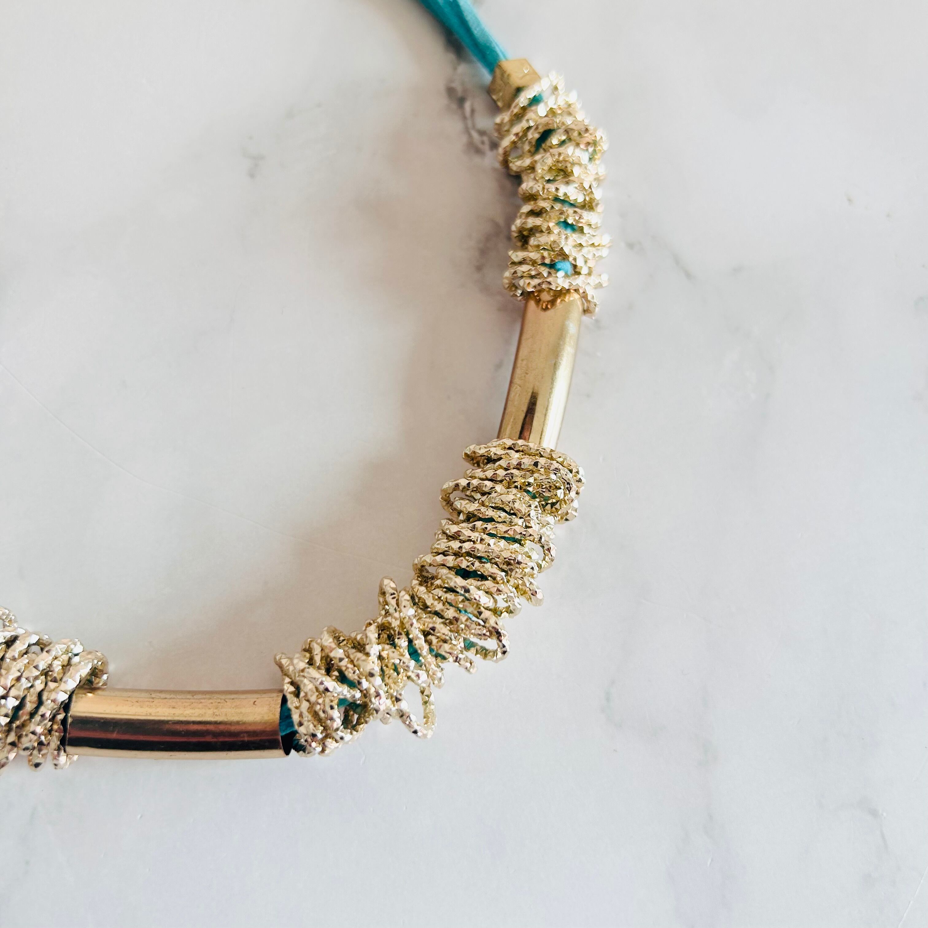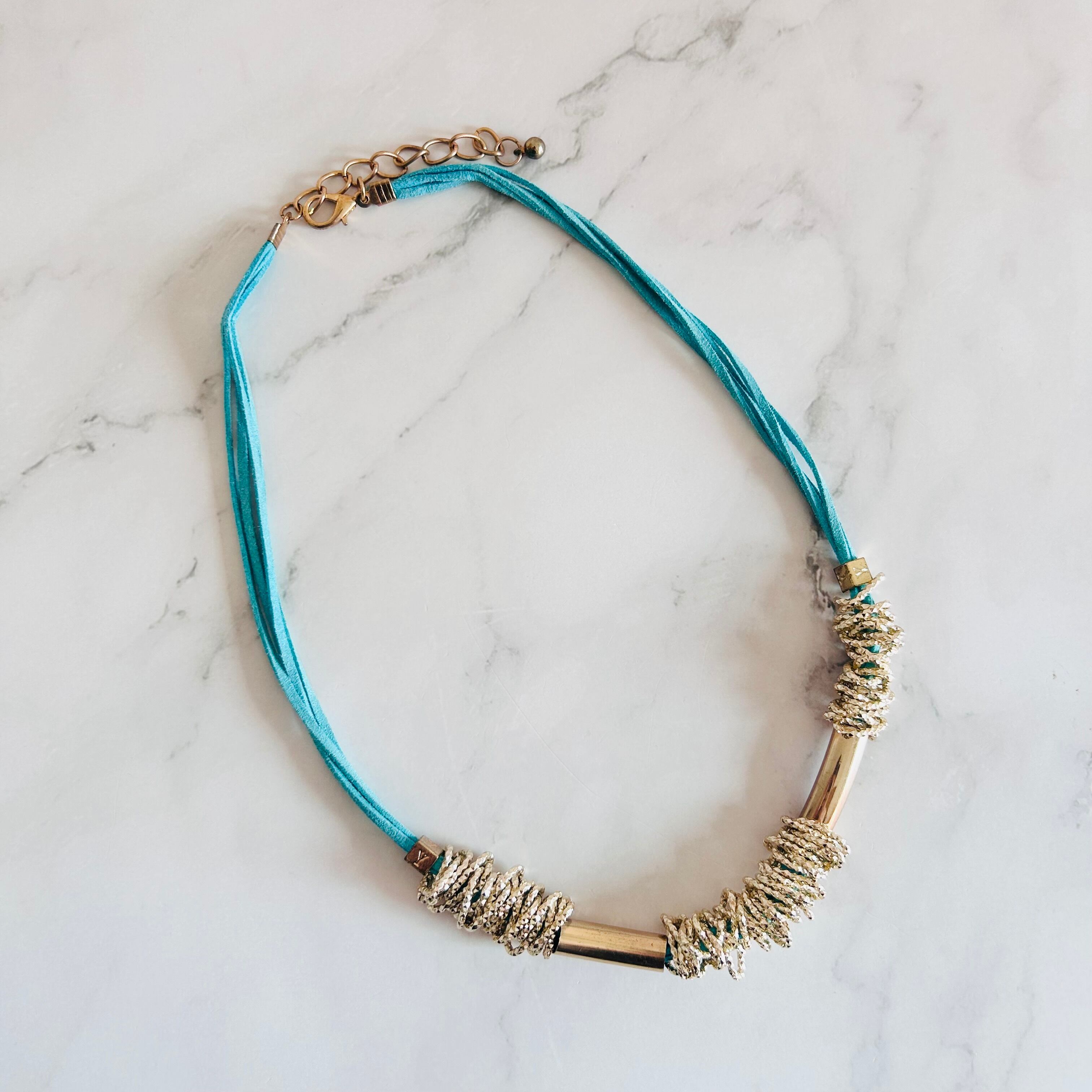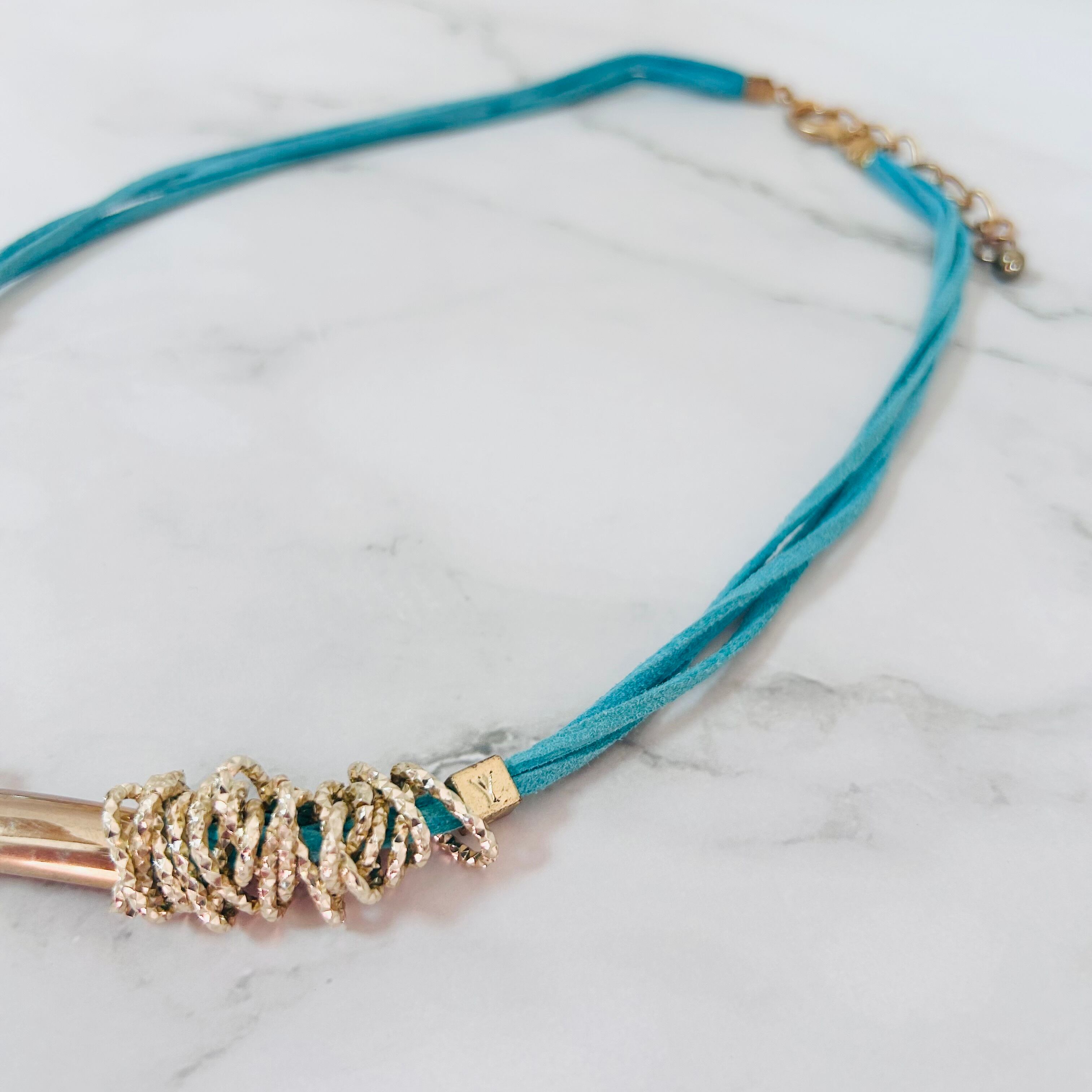 鮮やかなターコイズブルーのレザーコードに、ゴールドトーンのメタルバーと、ラフに重ねられた細かなメタルリングがアクセントになったさりげなく個性が表現できるネックレスです。