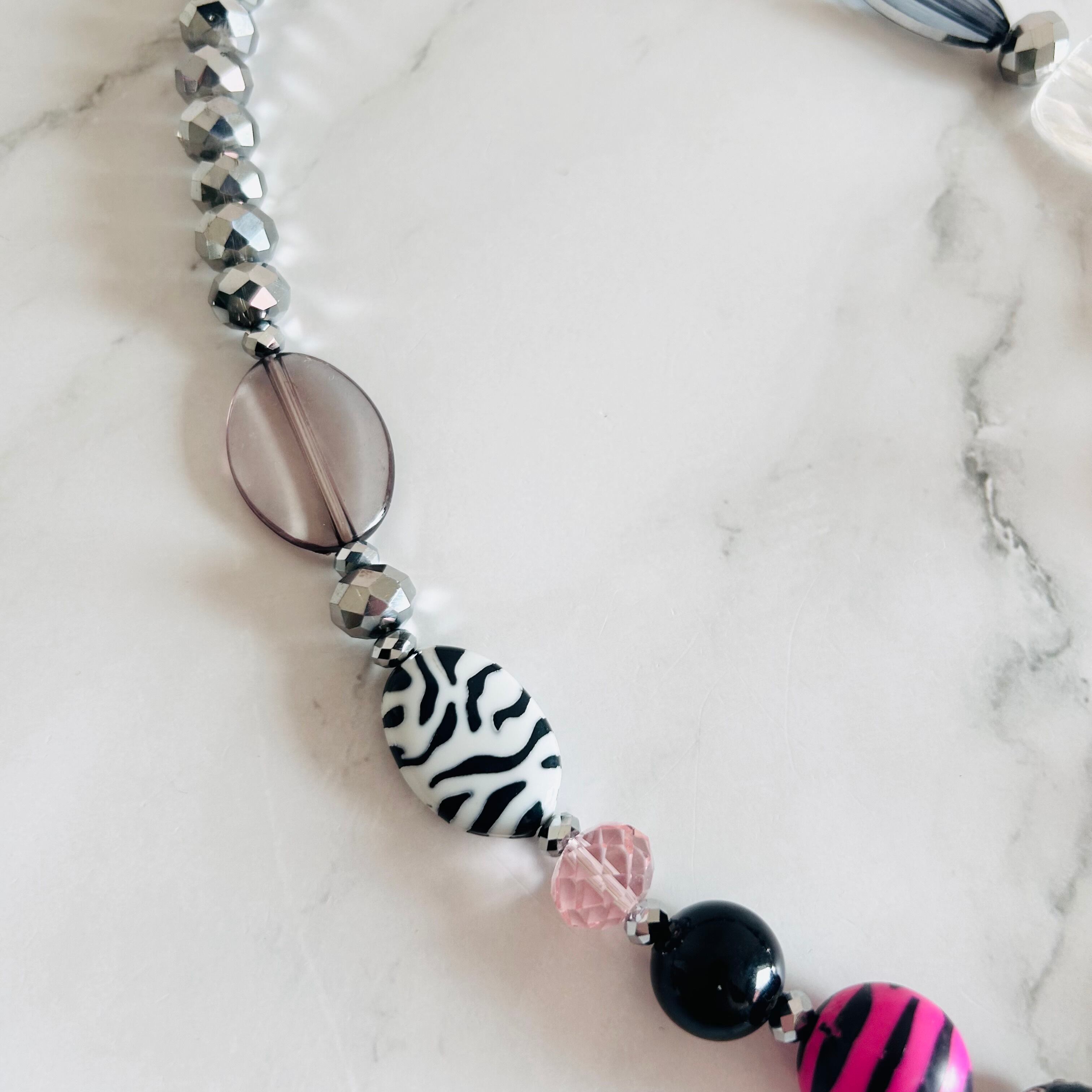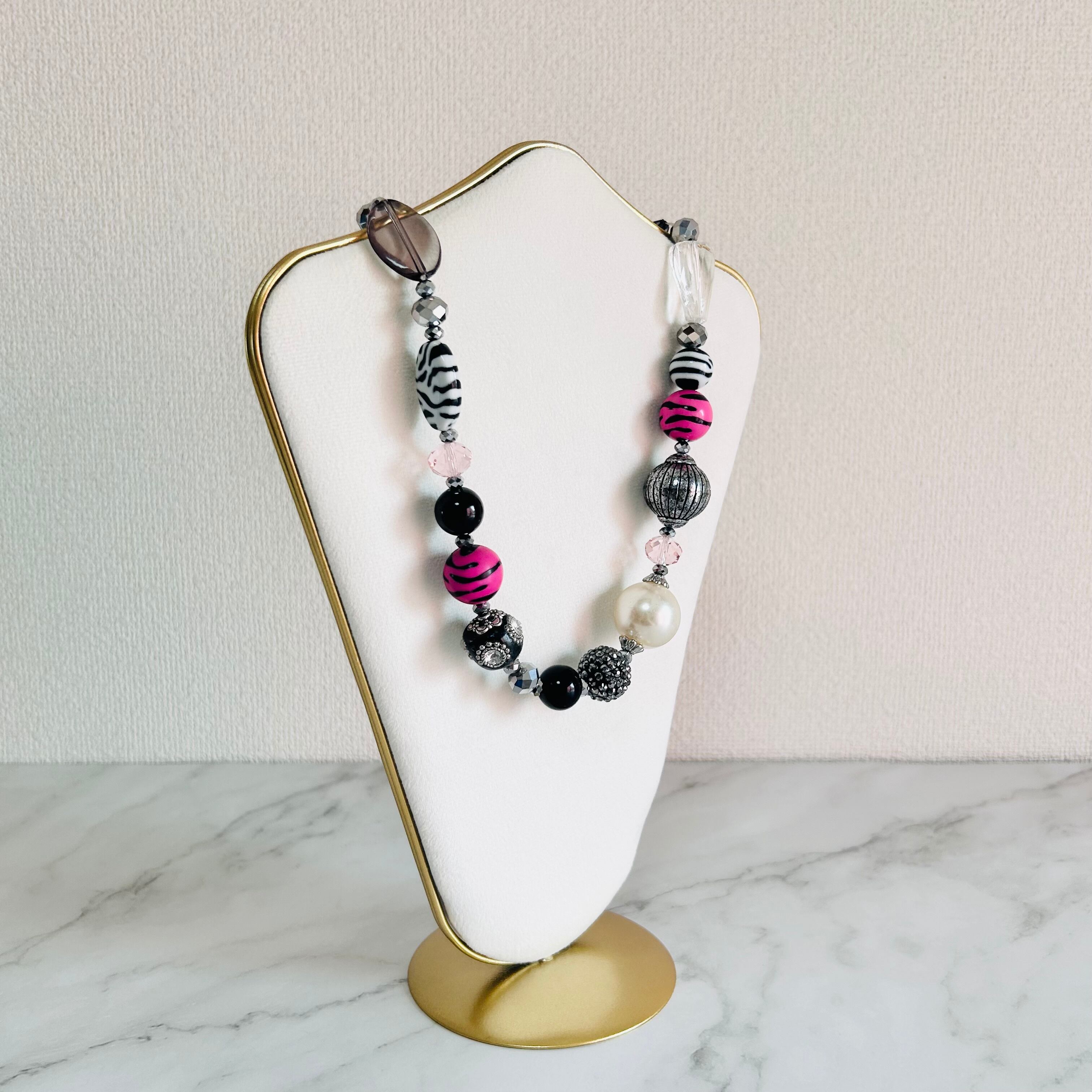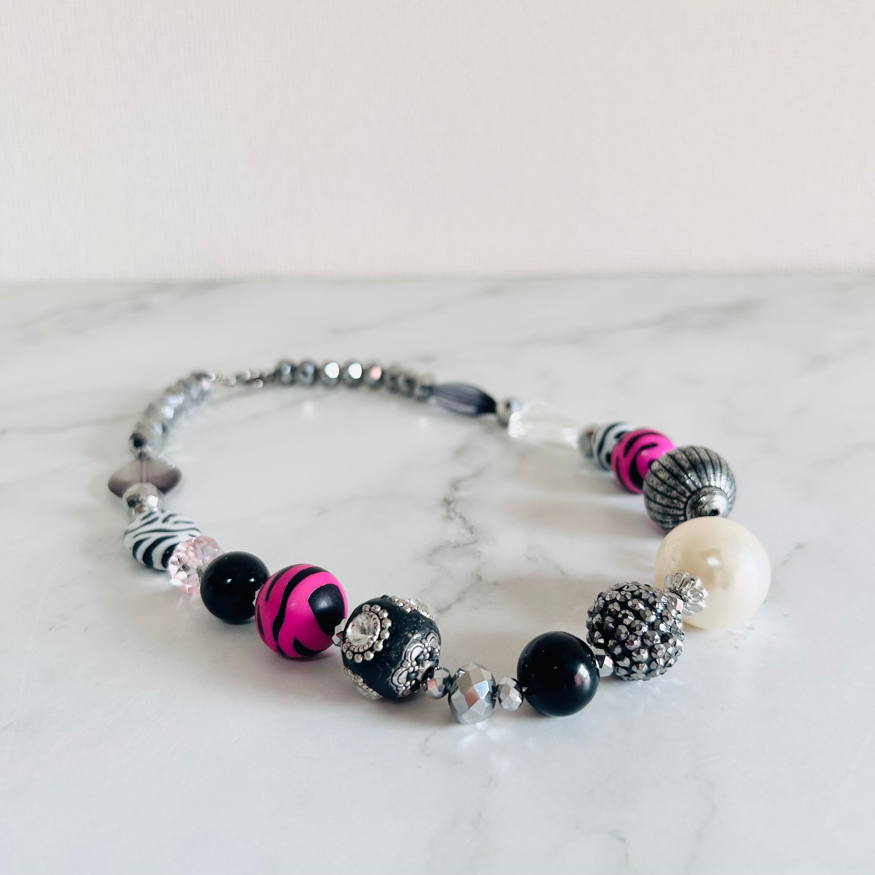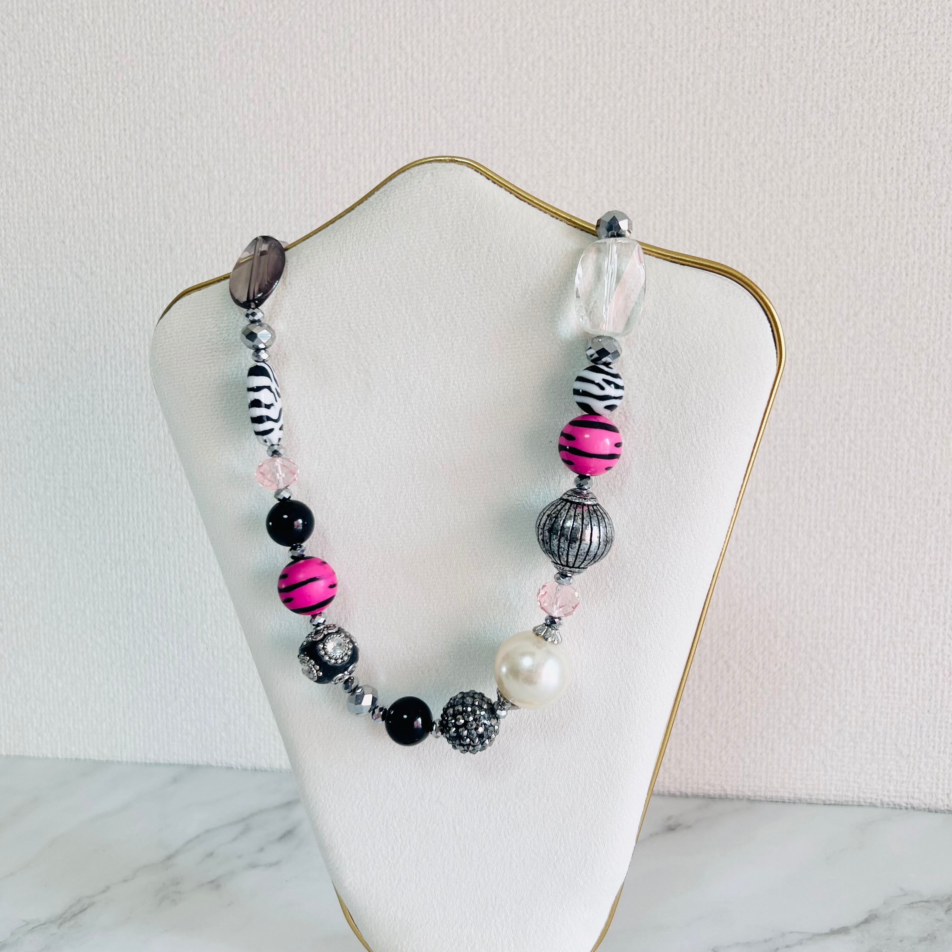 ゼブラ柄、アンティークシルバーのメタル調、ビビッドなピンク、そして大粒パールやクリアパーツ、ライトピンクのクリスタルビーズ——異なる質感と個性を持つパーツたちを絶妙なバランスで組み合わせたネックレスです。
