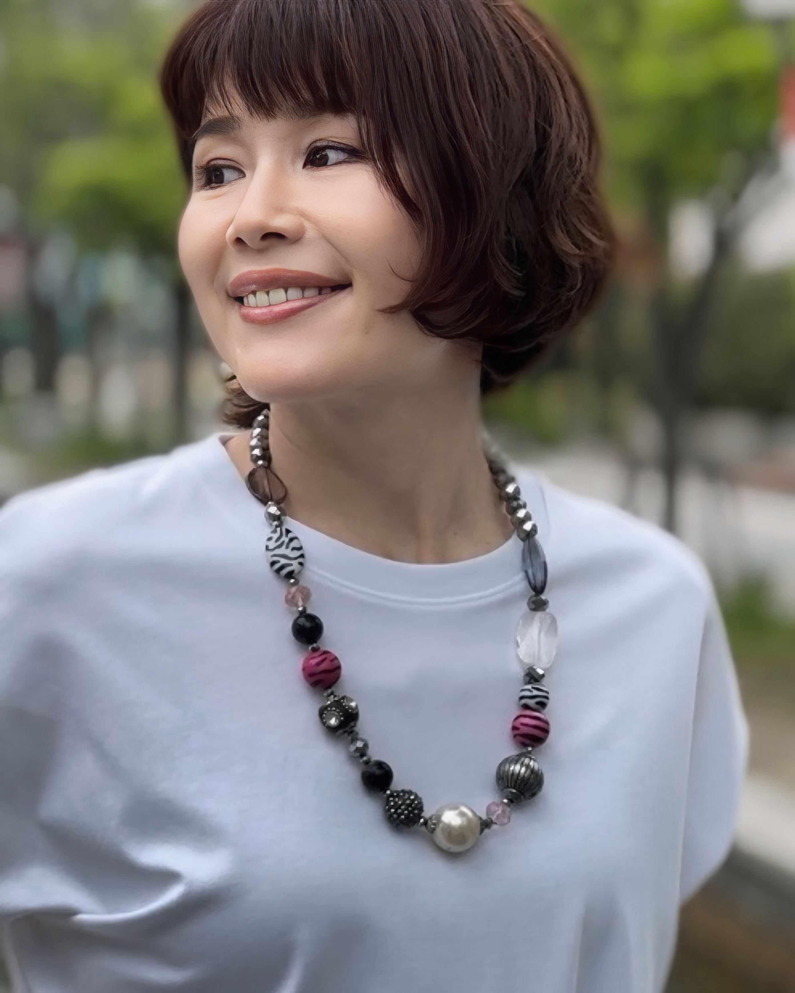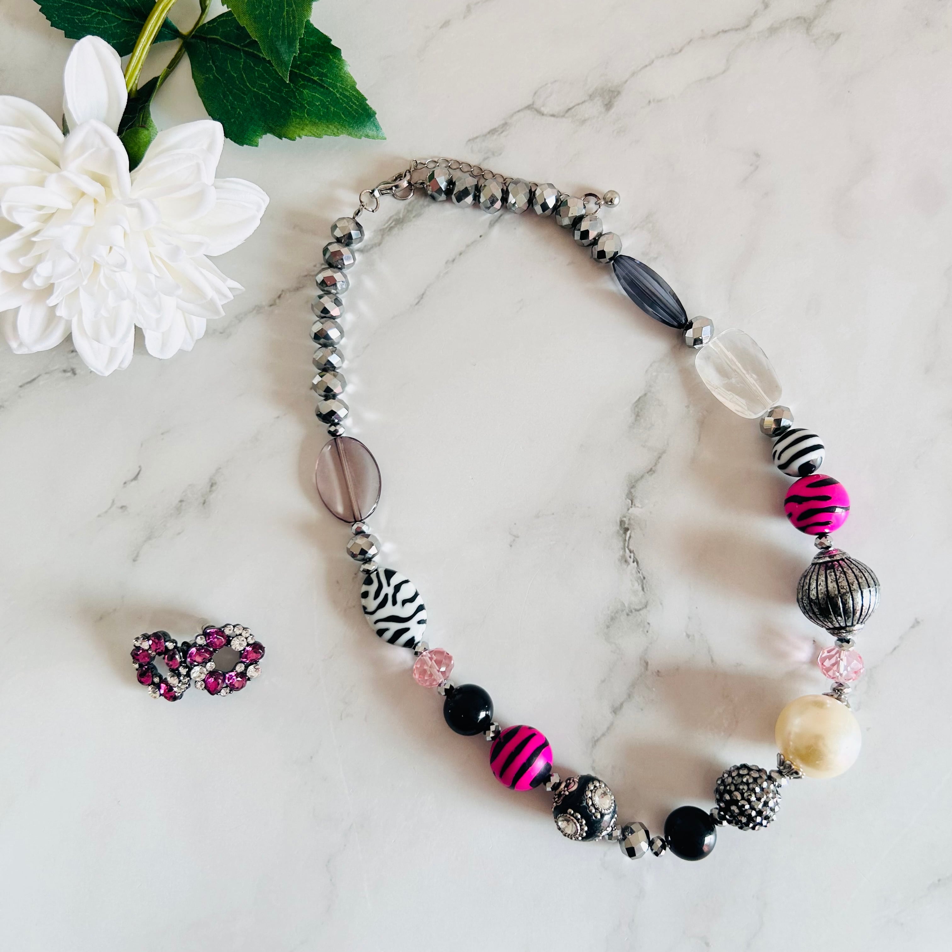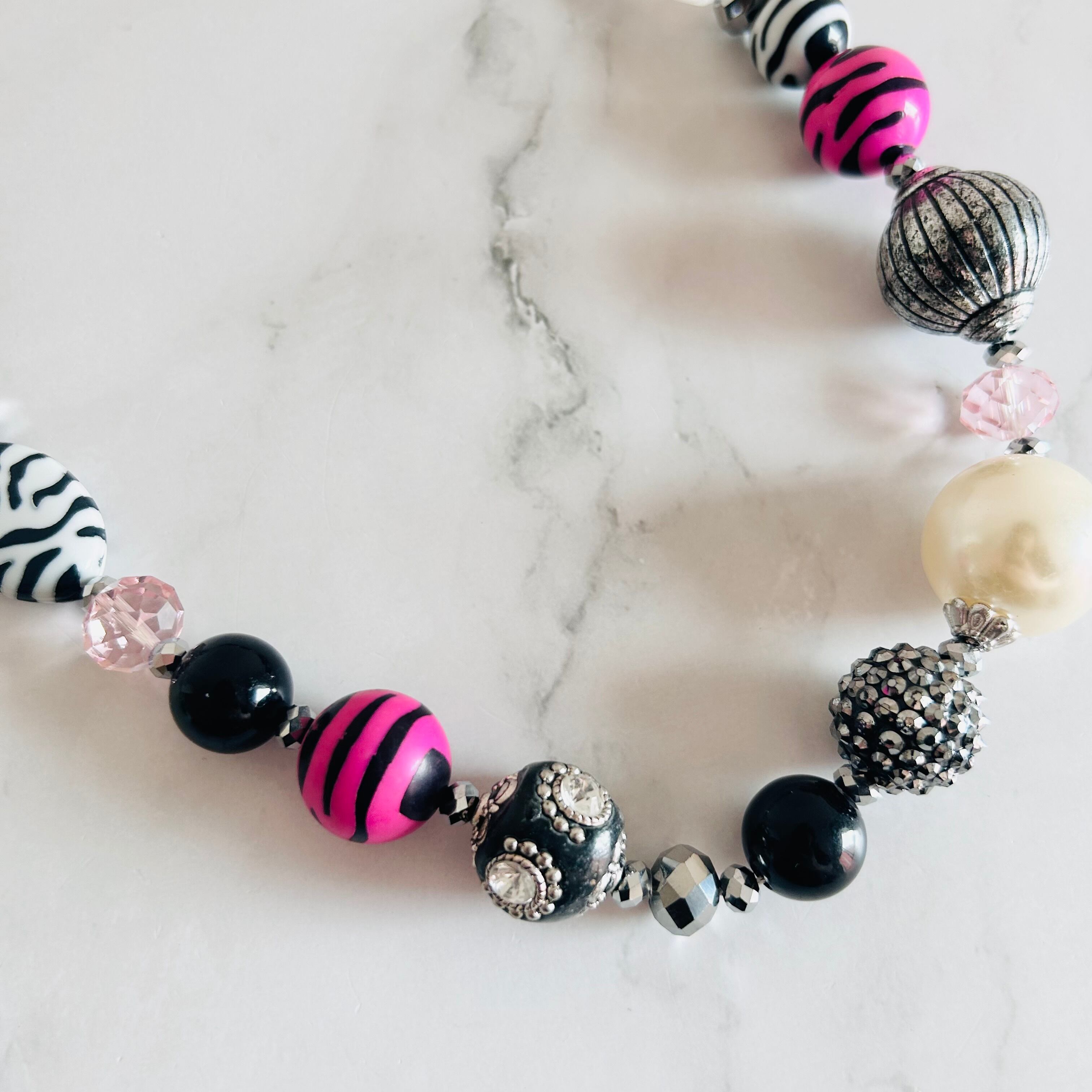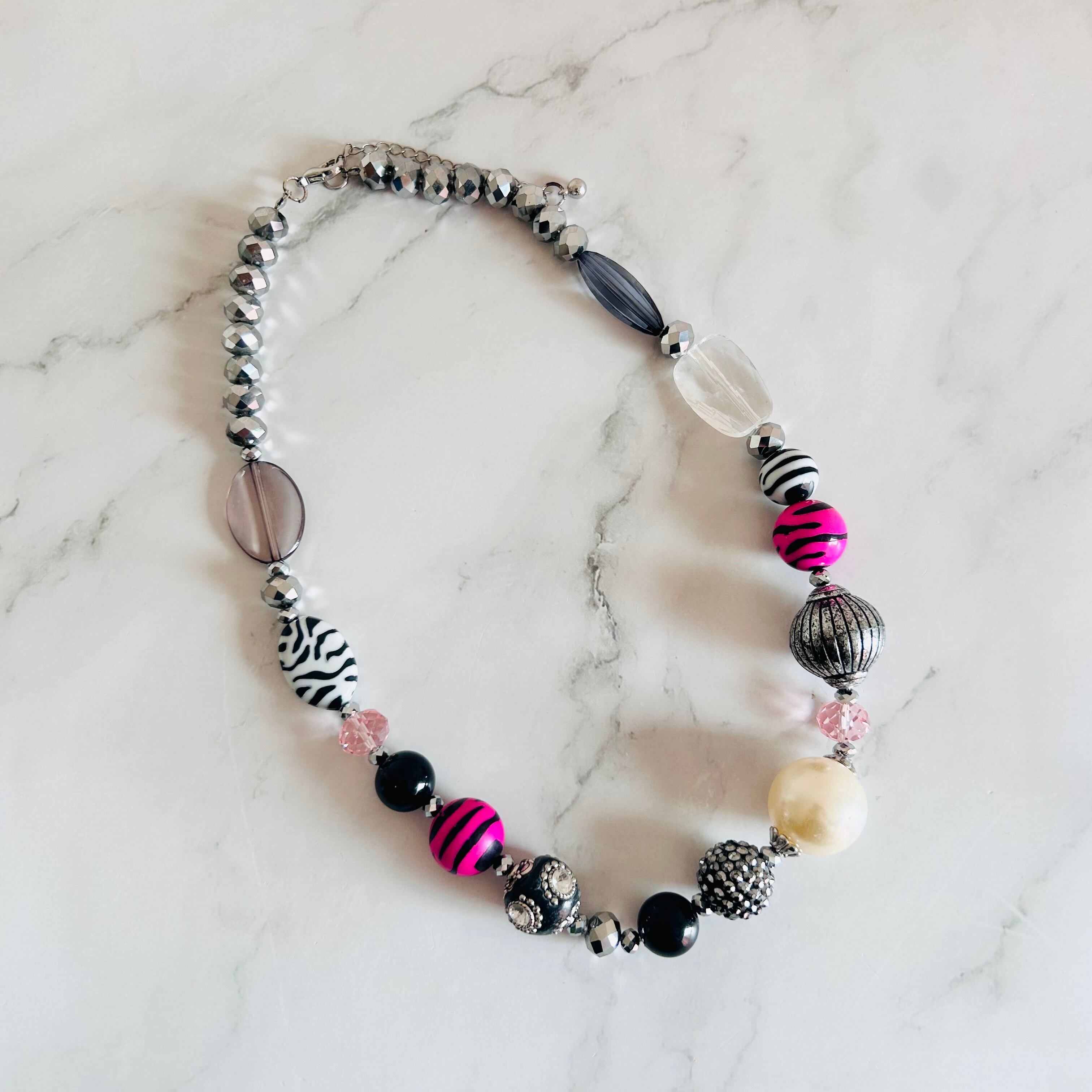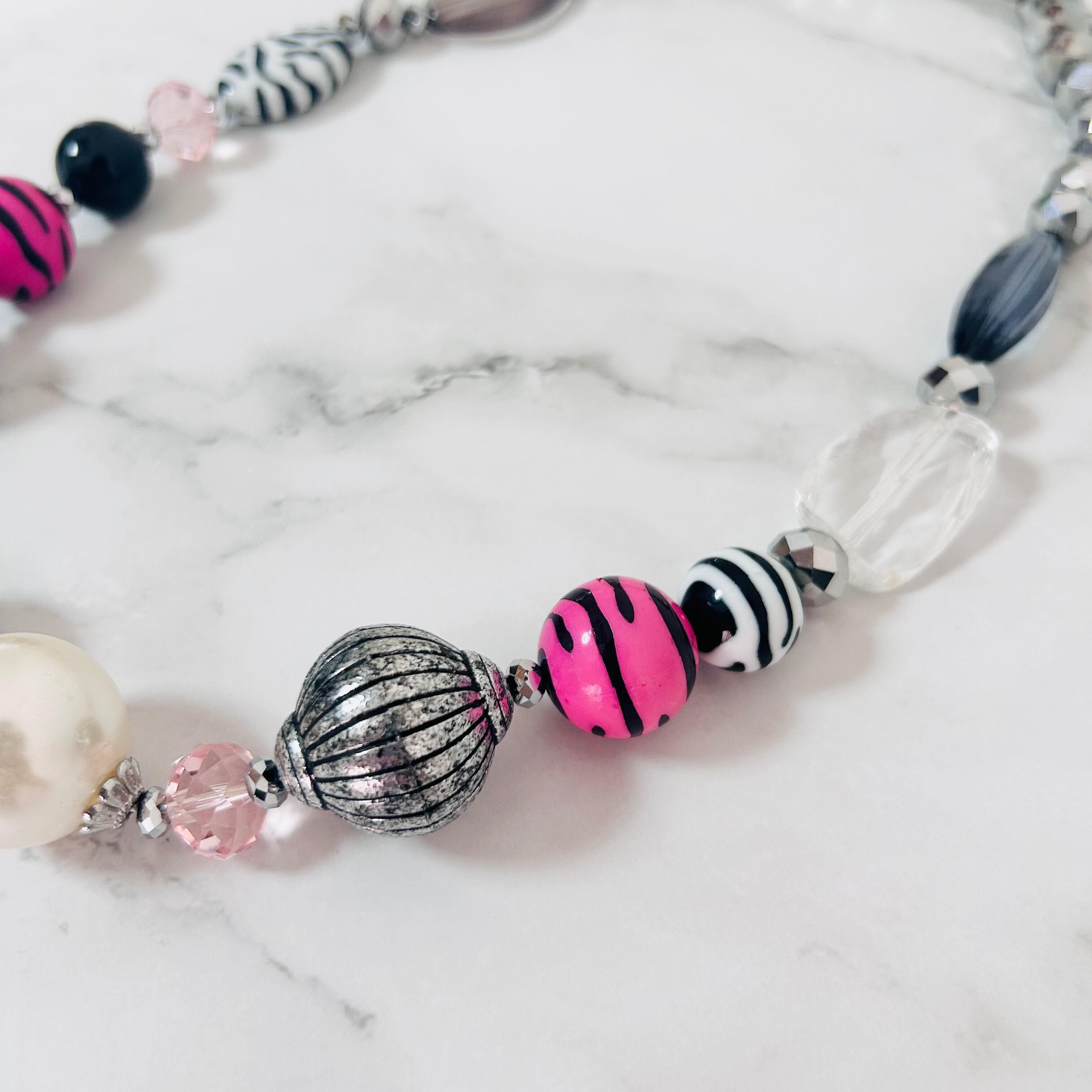 ゼブラ柄、アンティークシルバーのメタル調、ビビッドなピンク、そして大粒パールやクリアパーツ、ライトピンクのクリスタルビーズ——異なる質感と個性を持つパーツたちを絶妙なバランスで組み合わせたネックレスです。