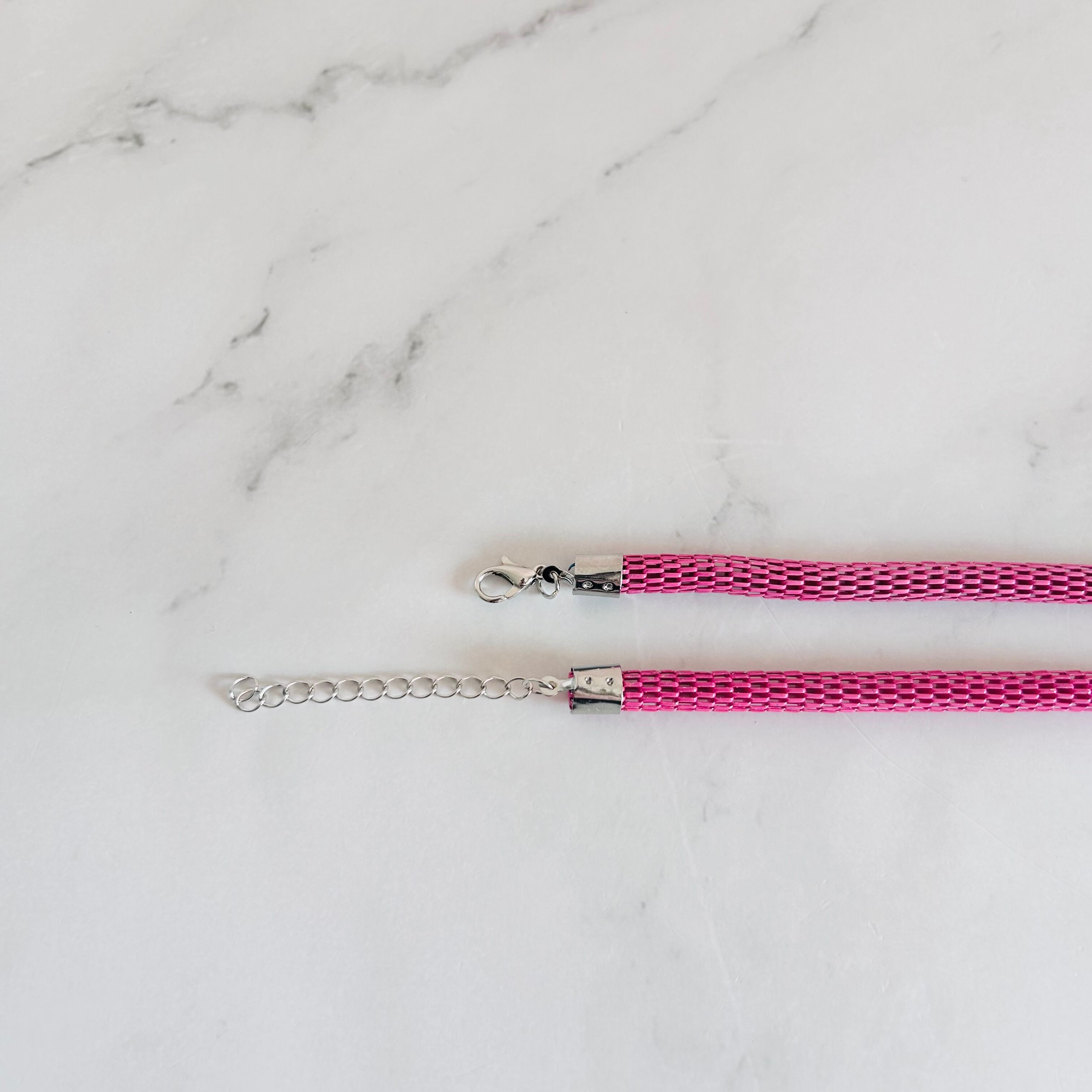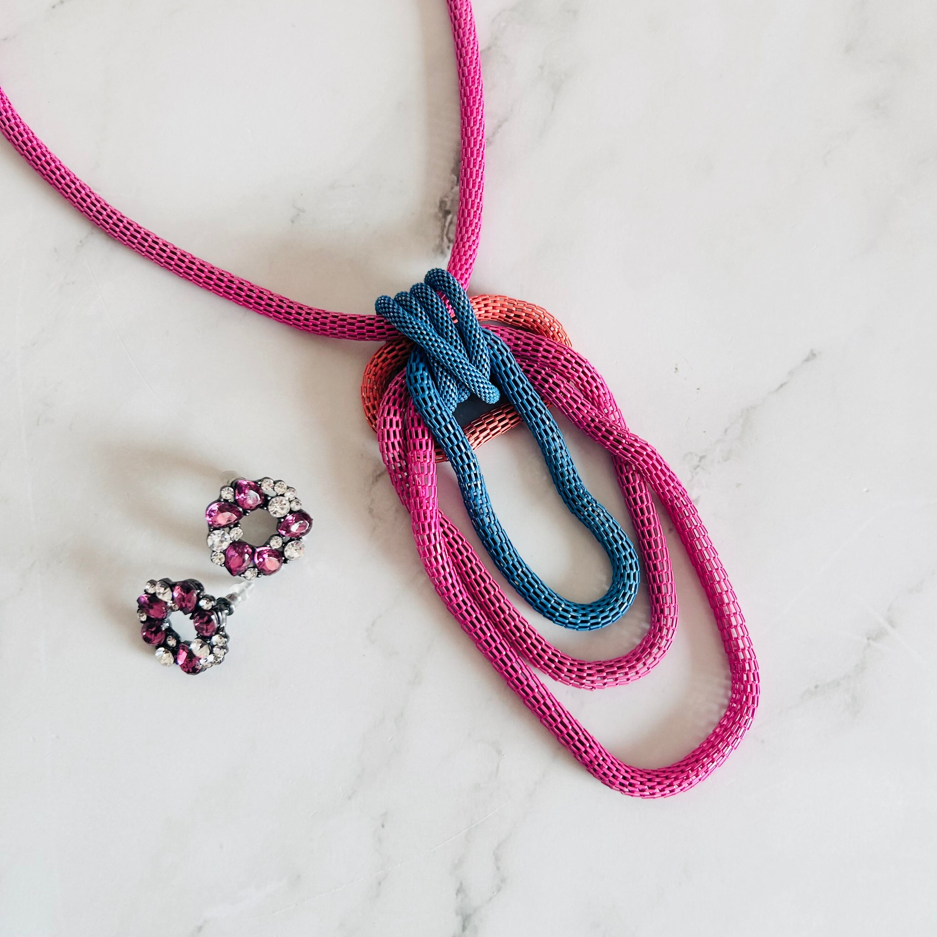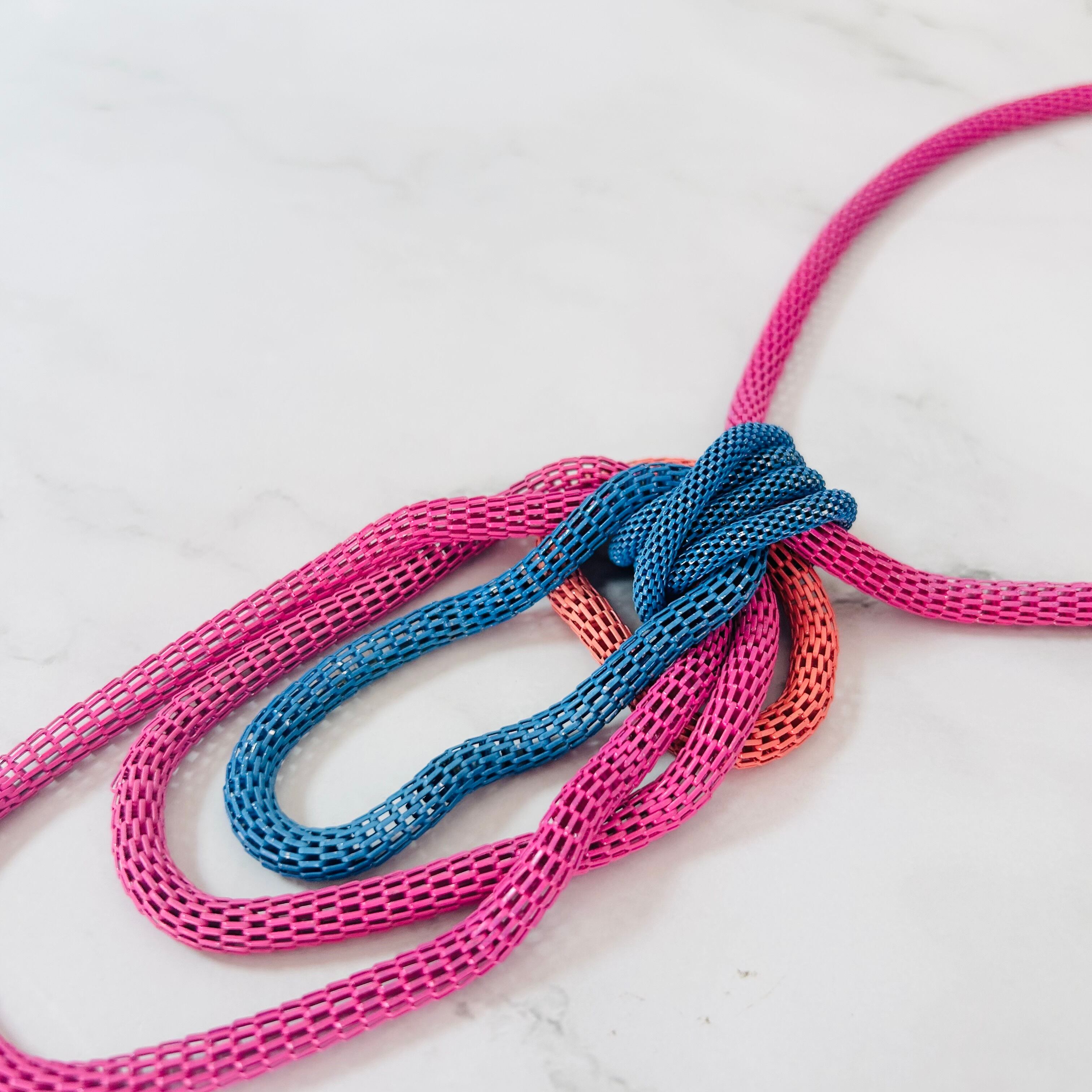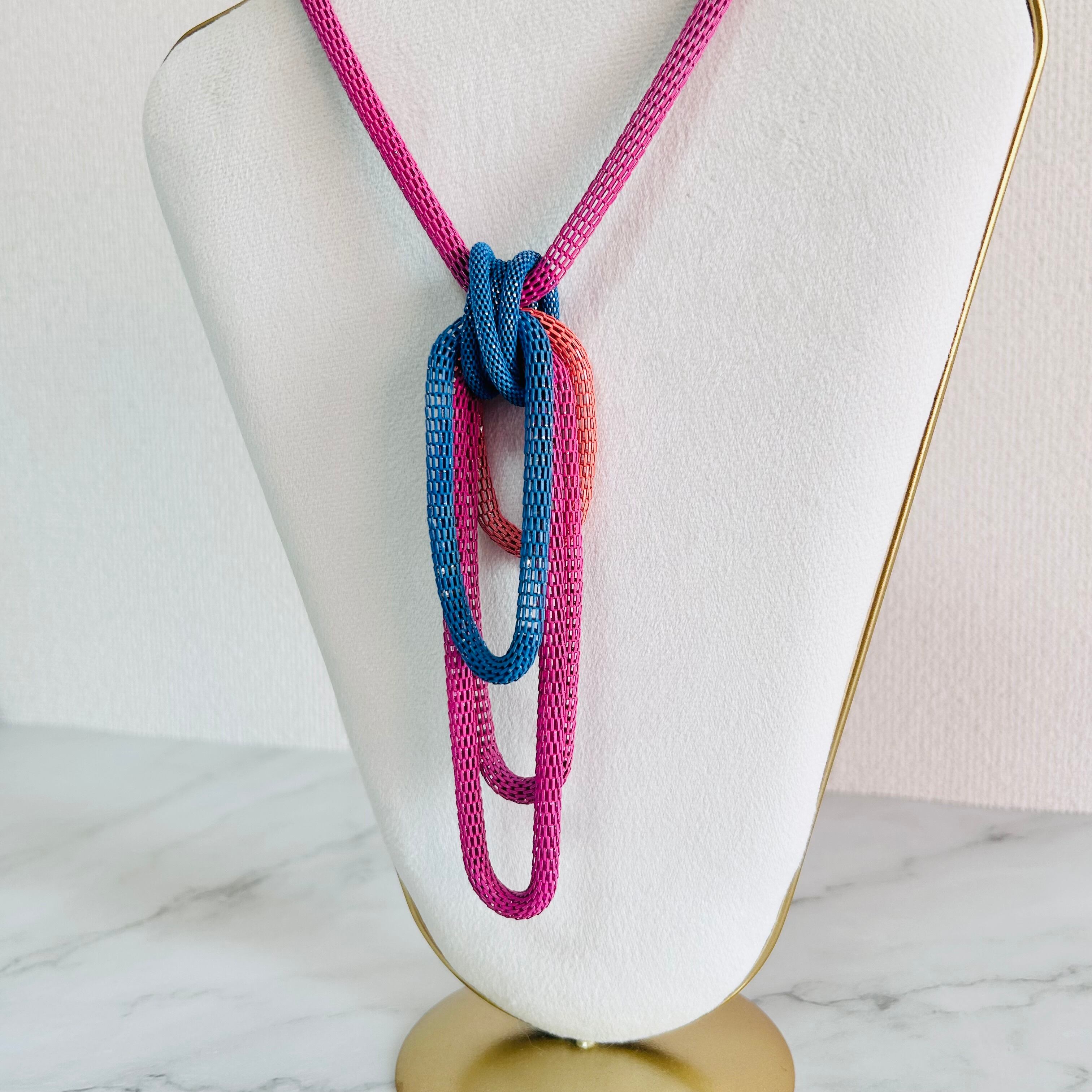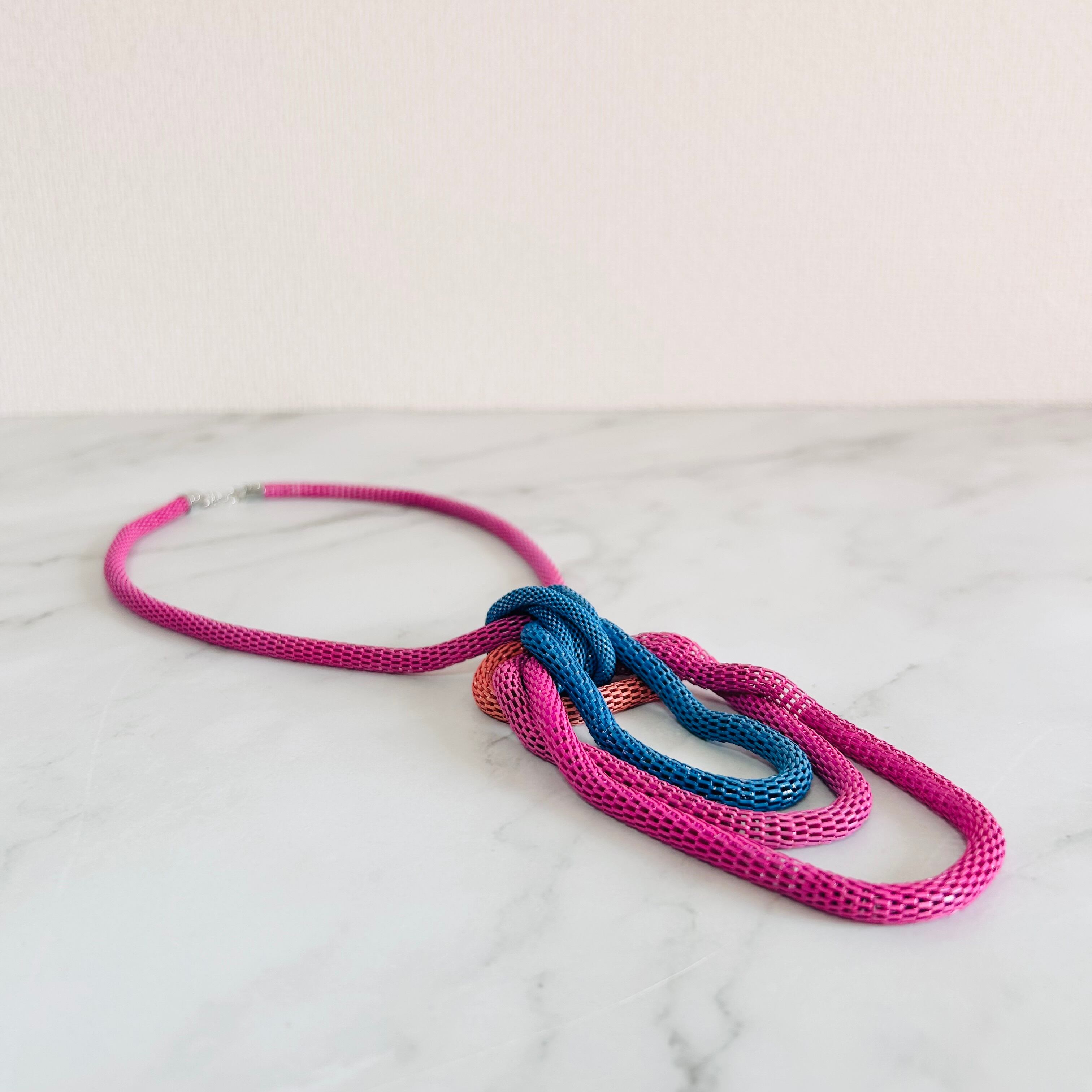 メッシュ素材を使用した、鮮やかなピンクとブルー、オレンジのカラフルなネックレスです。