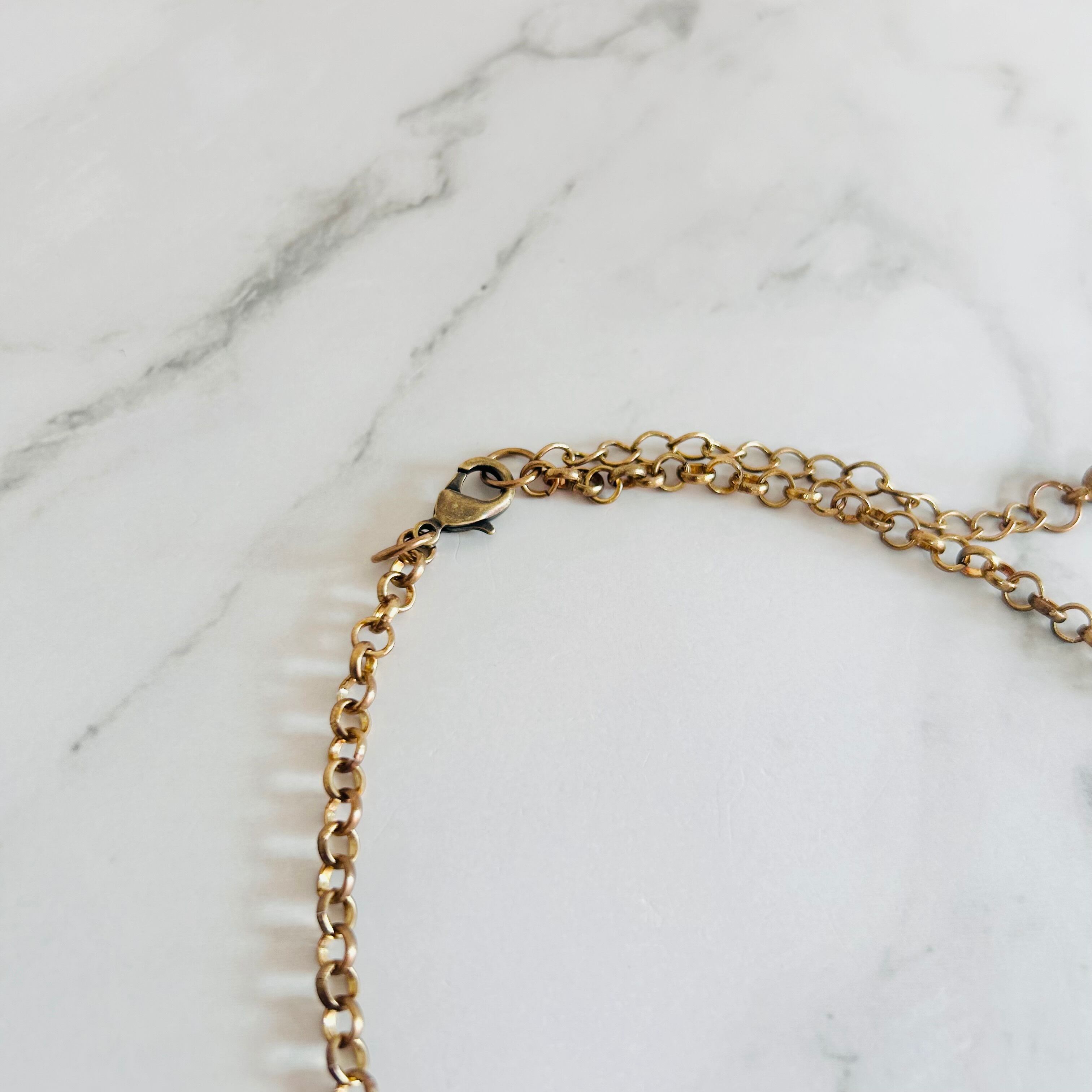 アンティーク調のゴールドチェーンが全体を引き締め、程よくクラシックなムードを演出します。