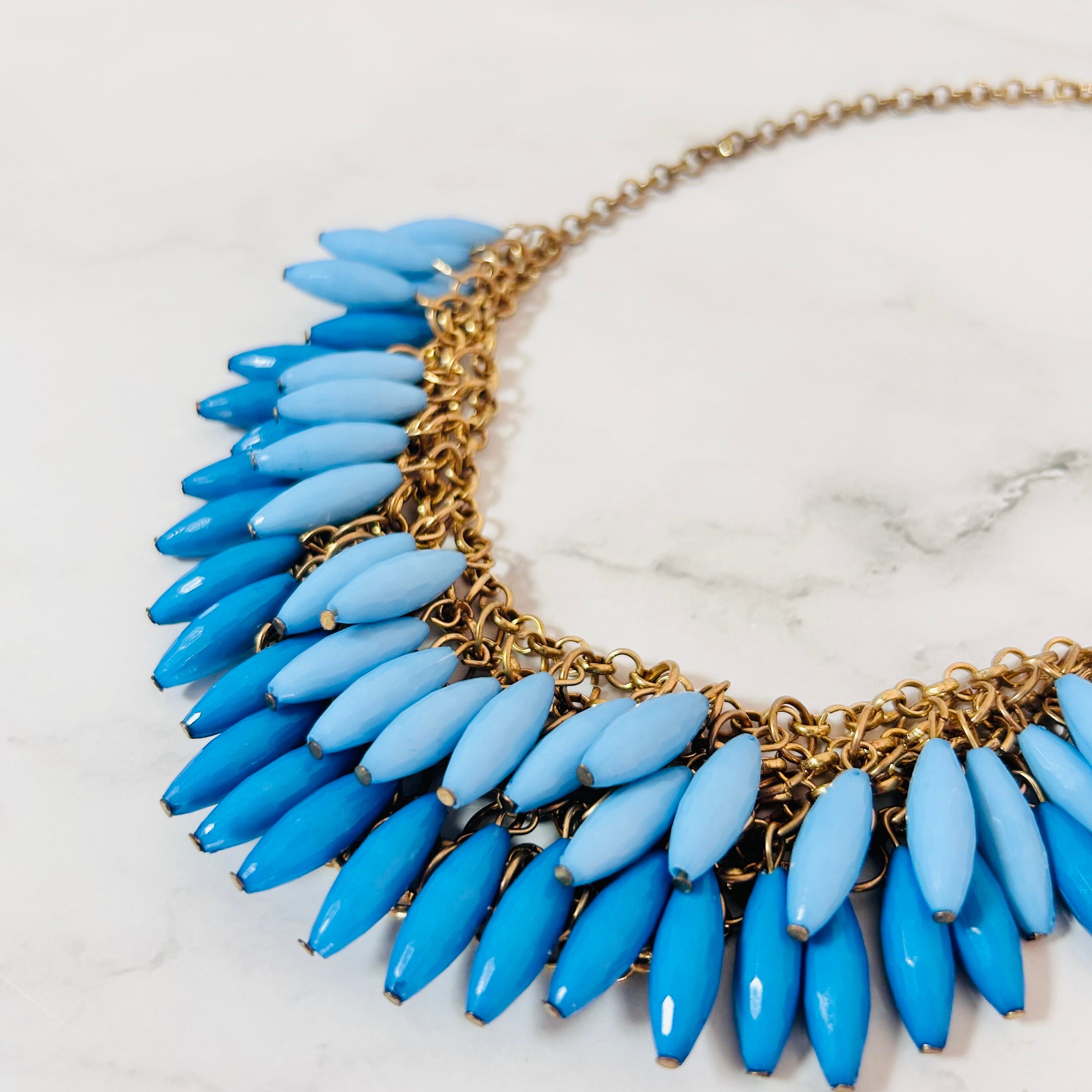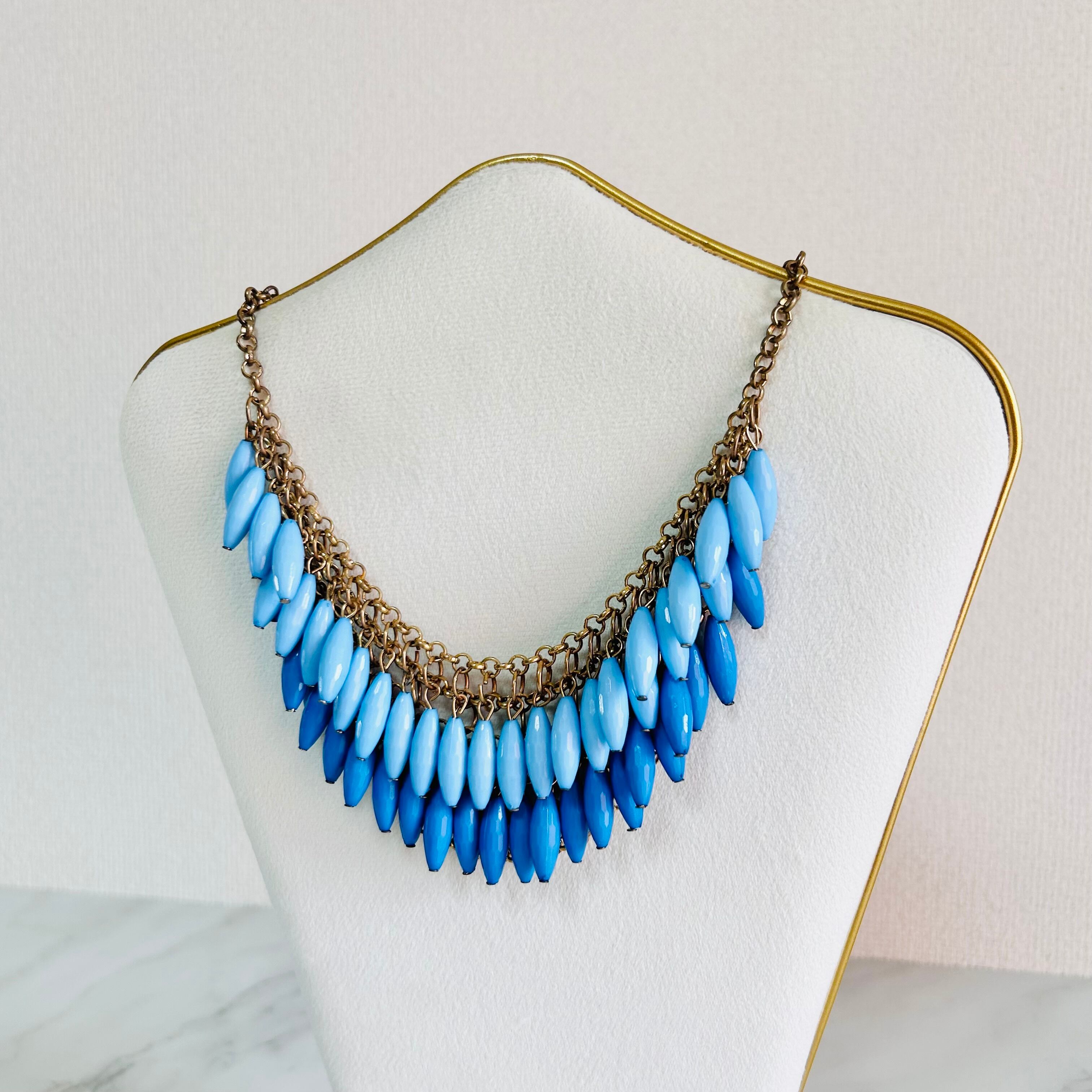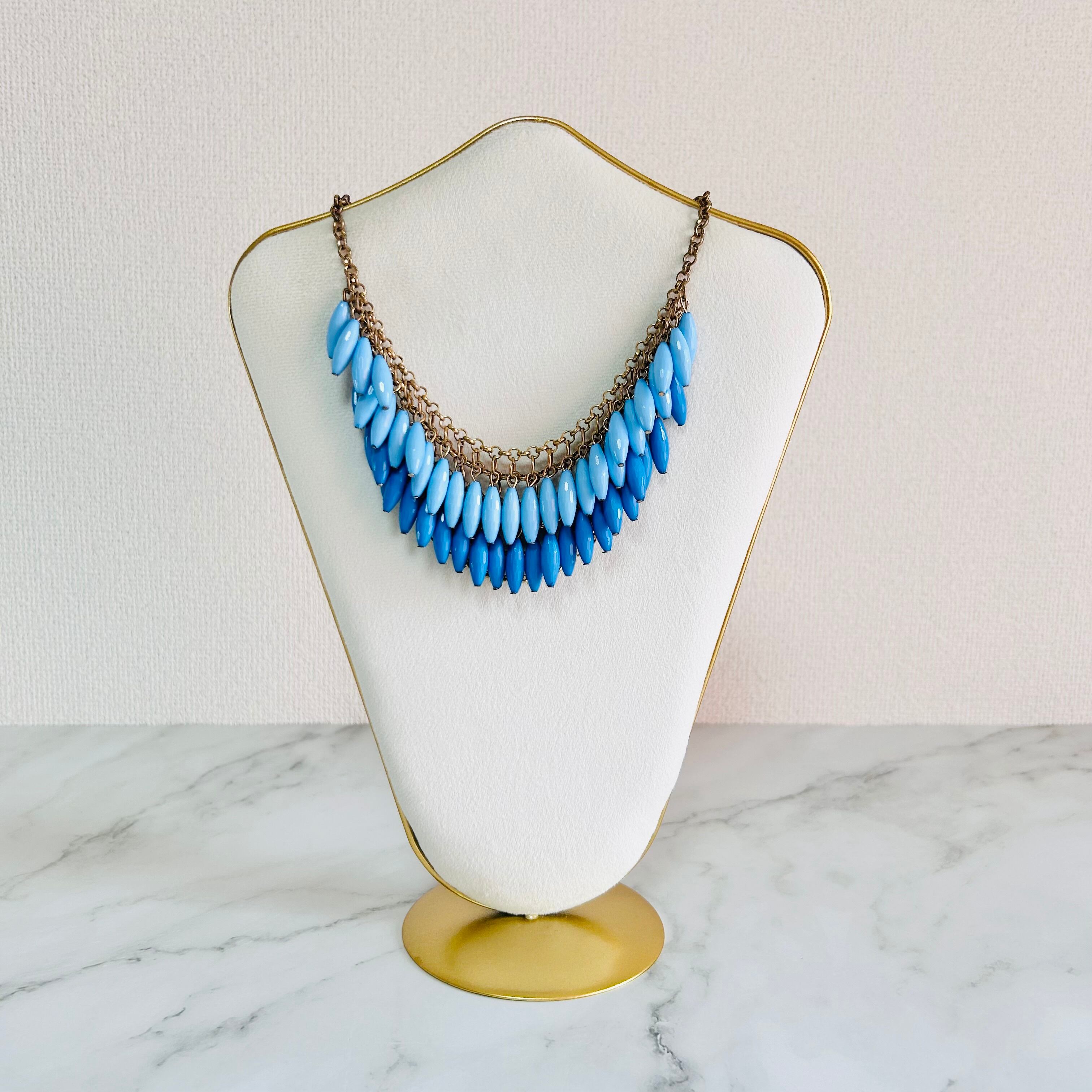 鮮やかなブルーのグラデーションが美しい、しずく型パーツを贅沢に連ねた存在感たっぷりのネックレスです。