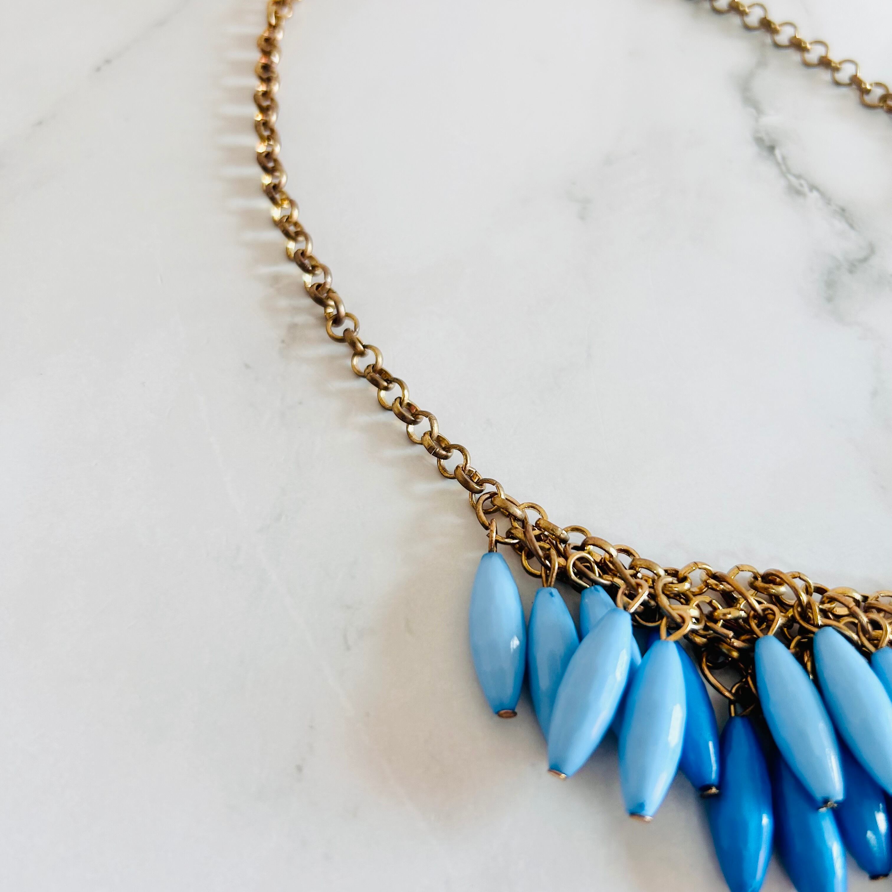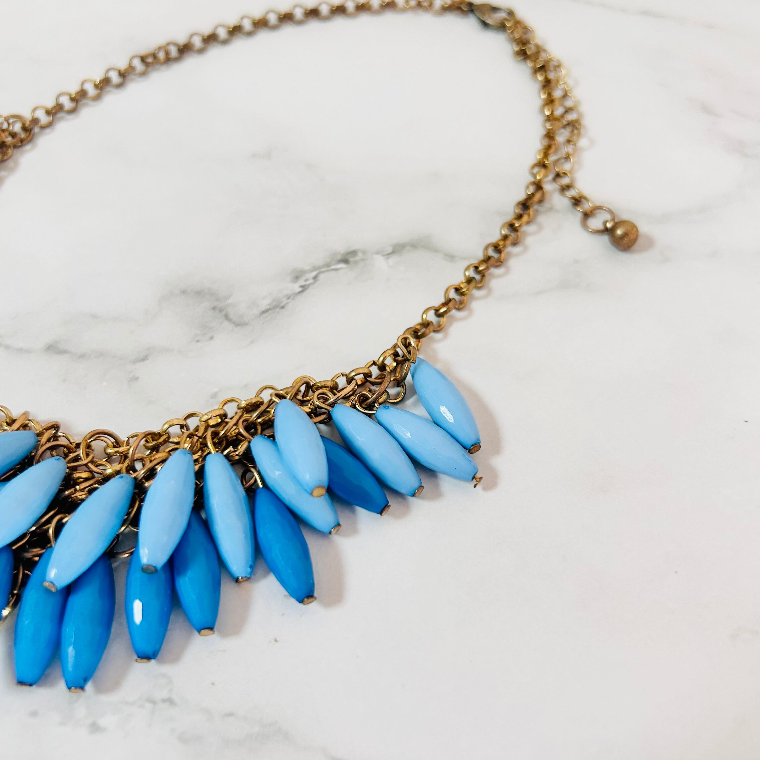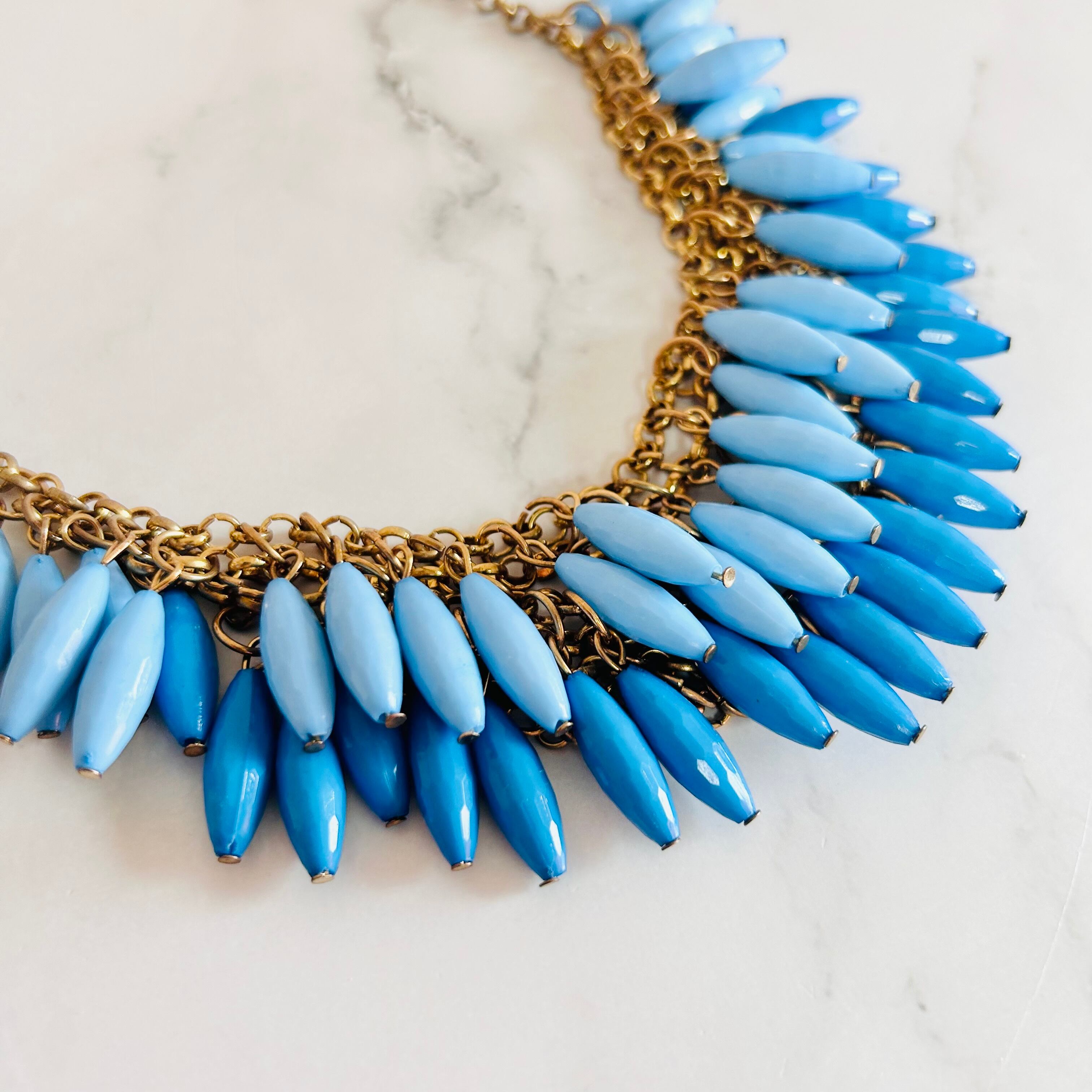 鮮やかなブルーのグラデーションが美しい、しずく型パーツを贅沢に連ねた存在感たっぷりのネックレスです。