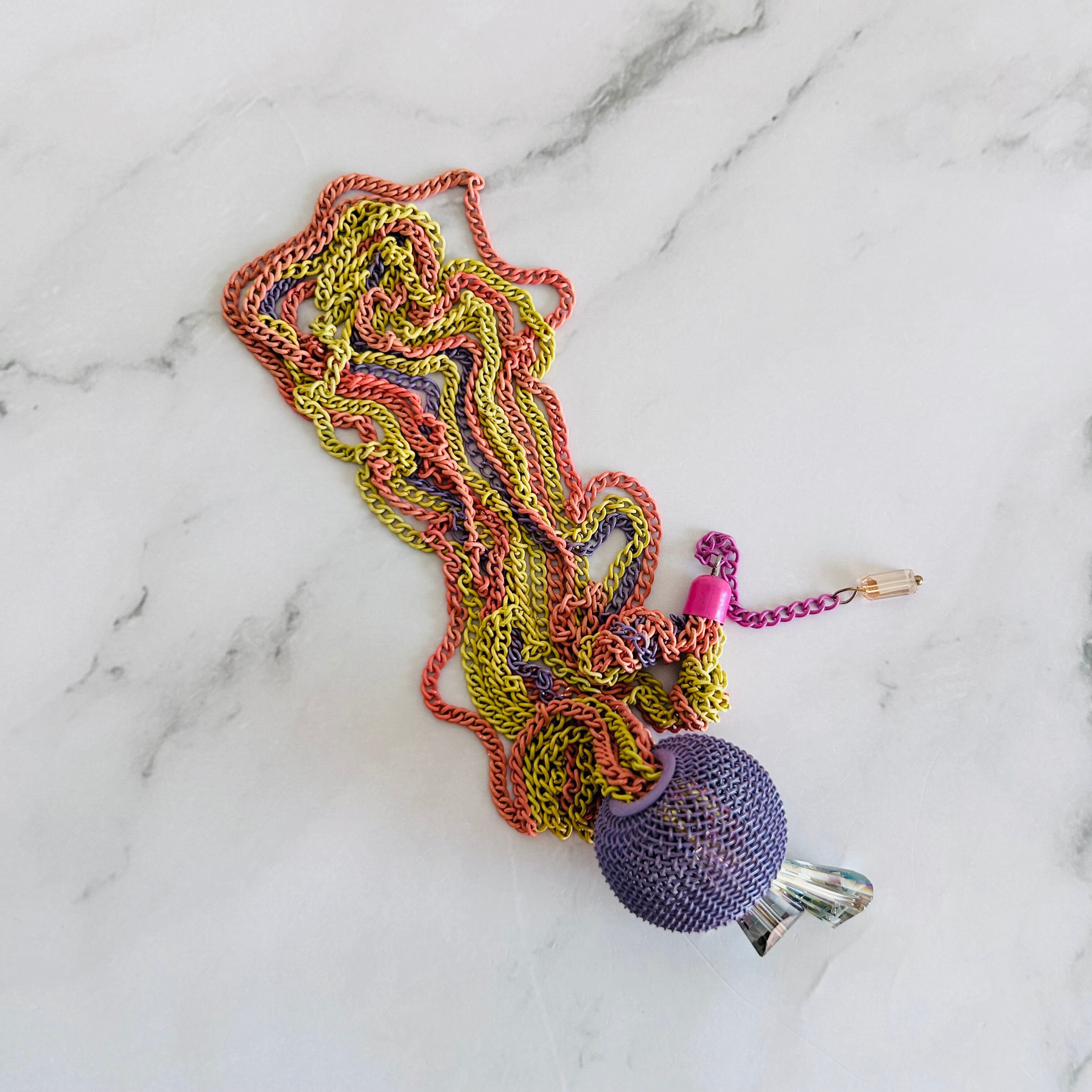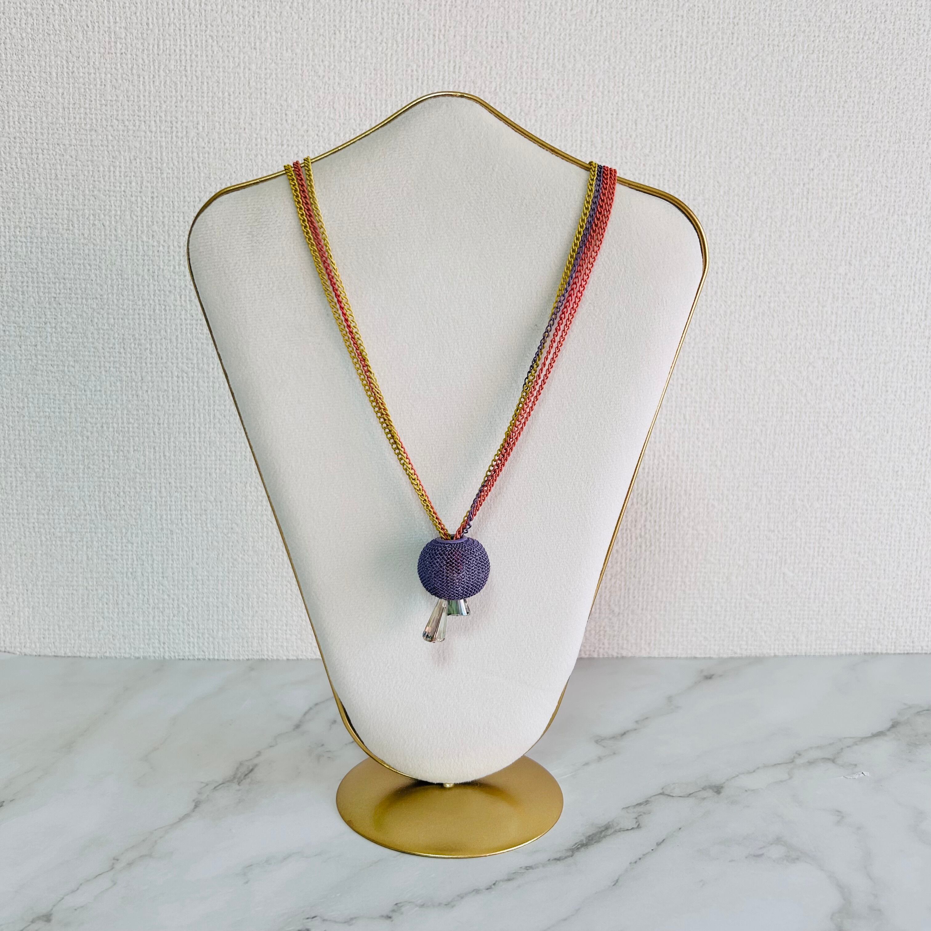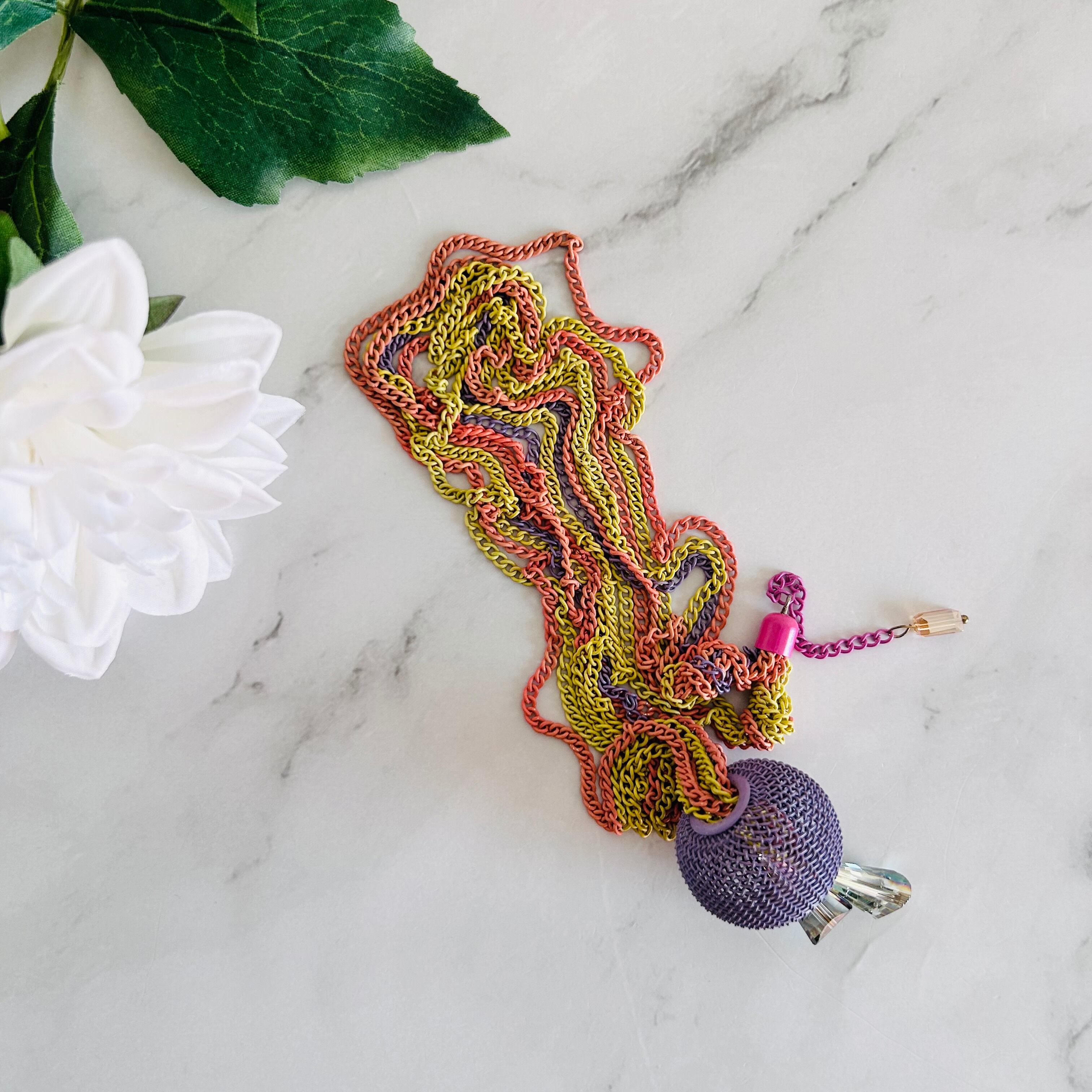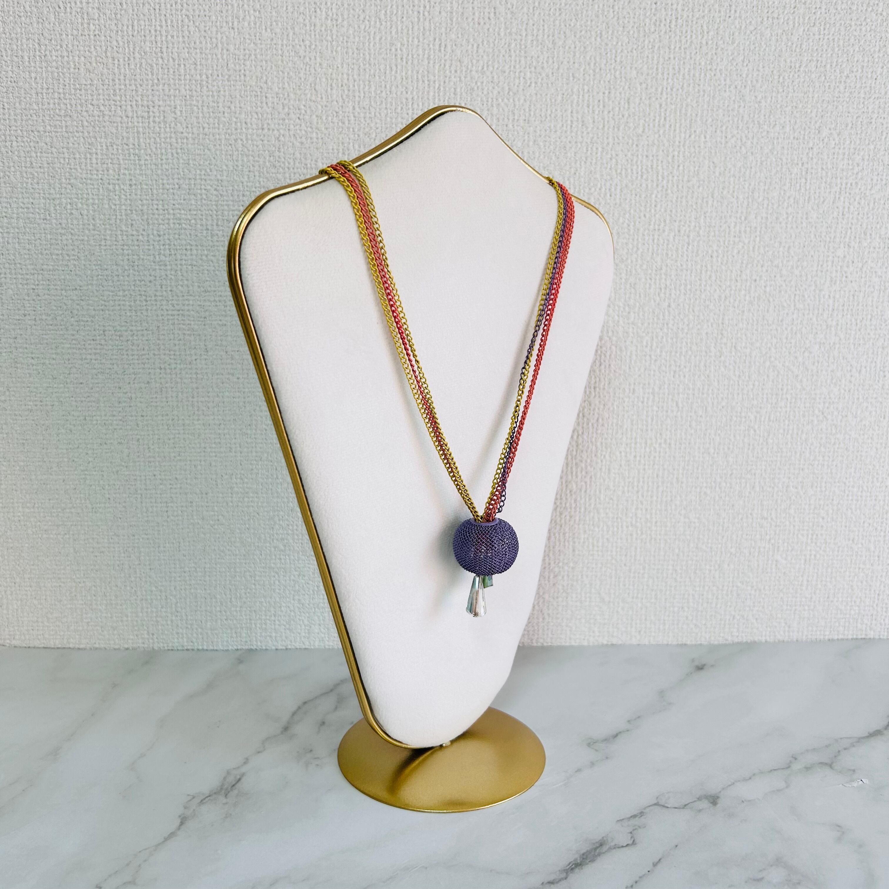 オレンジ・イエロー・パープルのカラフルチェーンが重なり合い、パープル球体パーツと透明感のあるクリスタルパーツが印象的なロングデザインです。