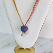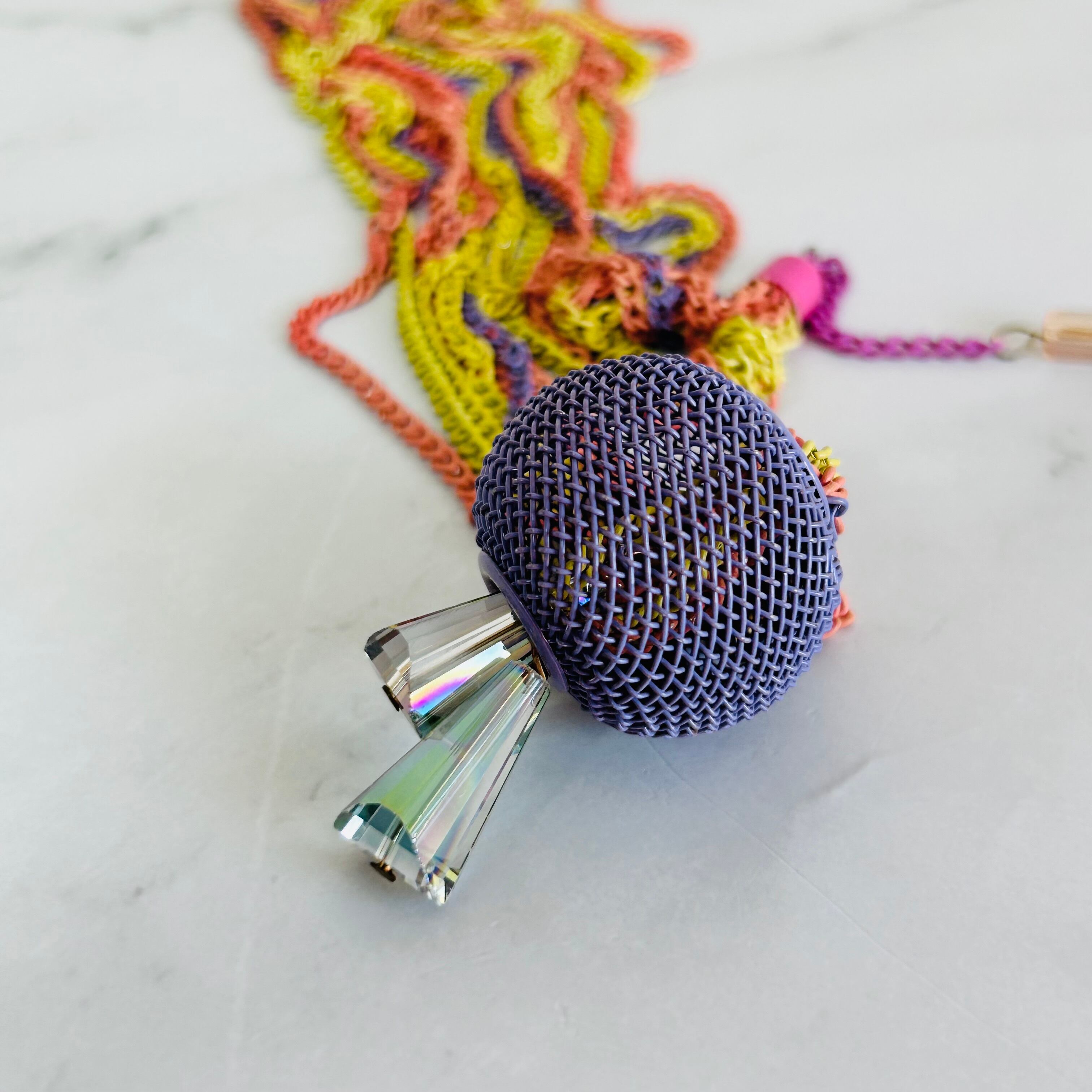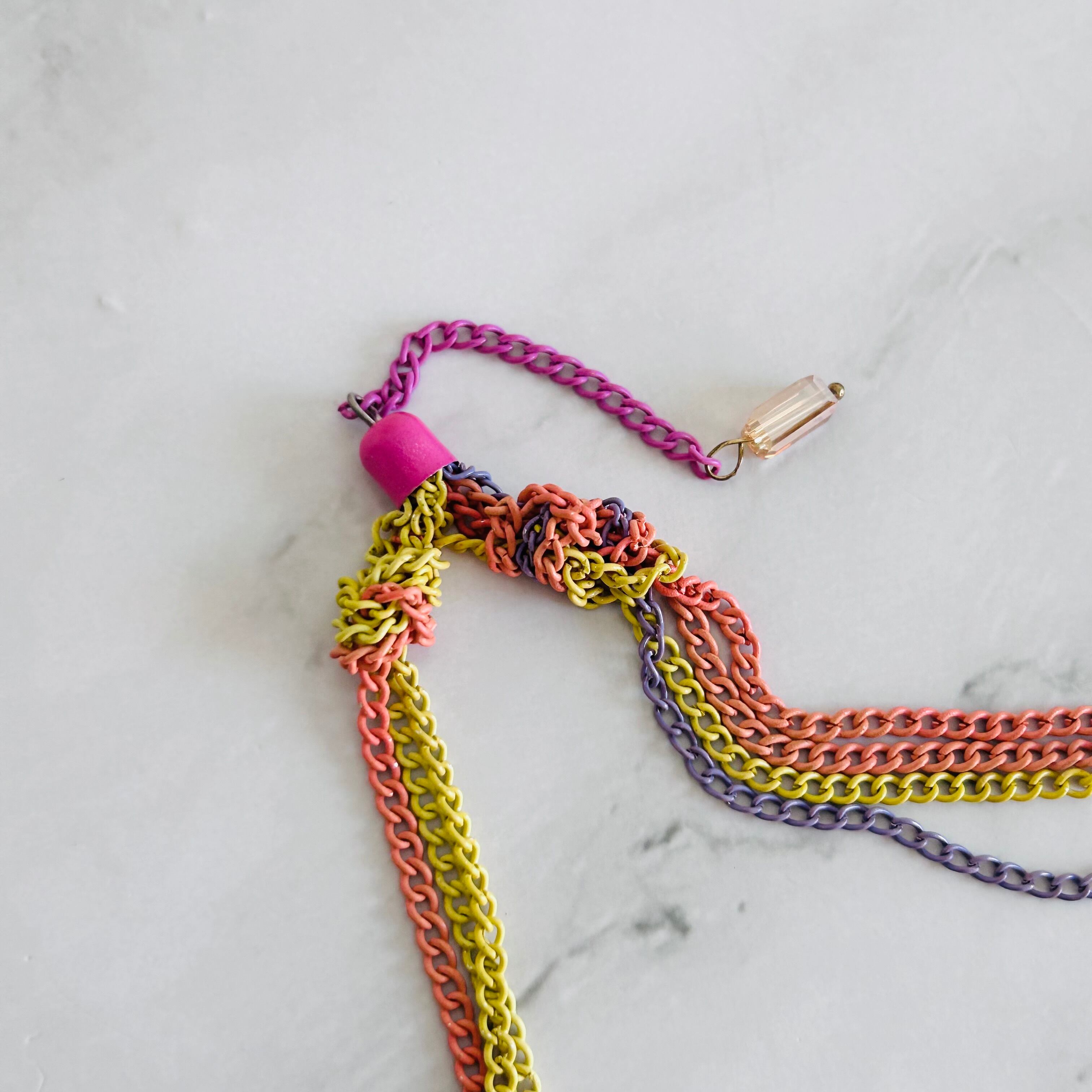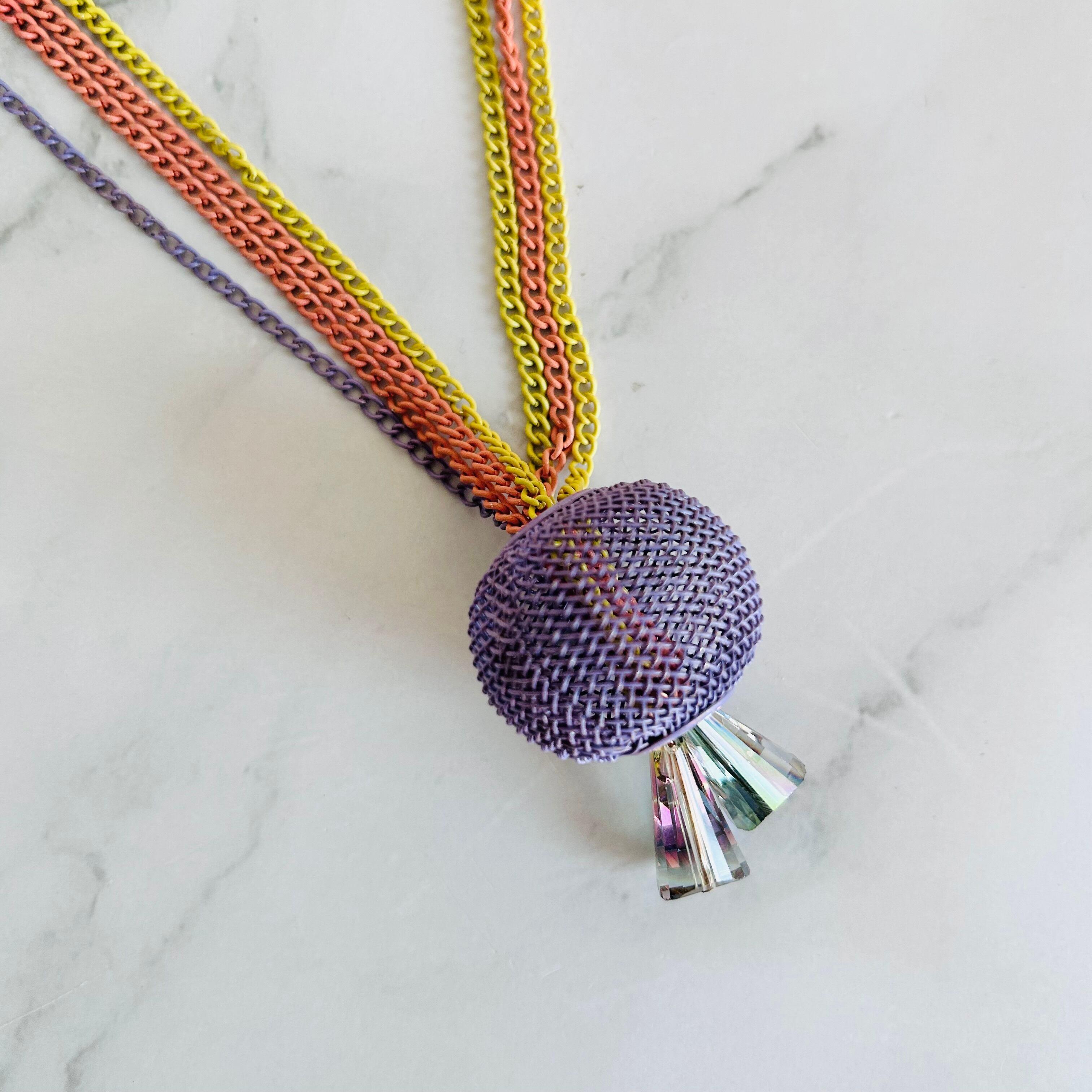 オレンジ・イエロー・パープルのカラフルチェーンが重なり合い、パープル球体パーツと透明感のあるクリスタルパーツが印象的なロングデザインです。