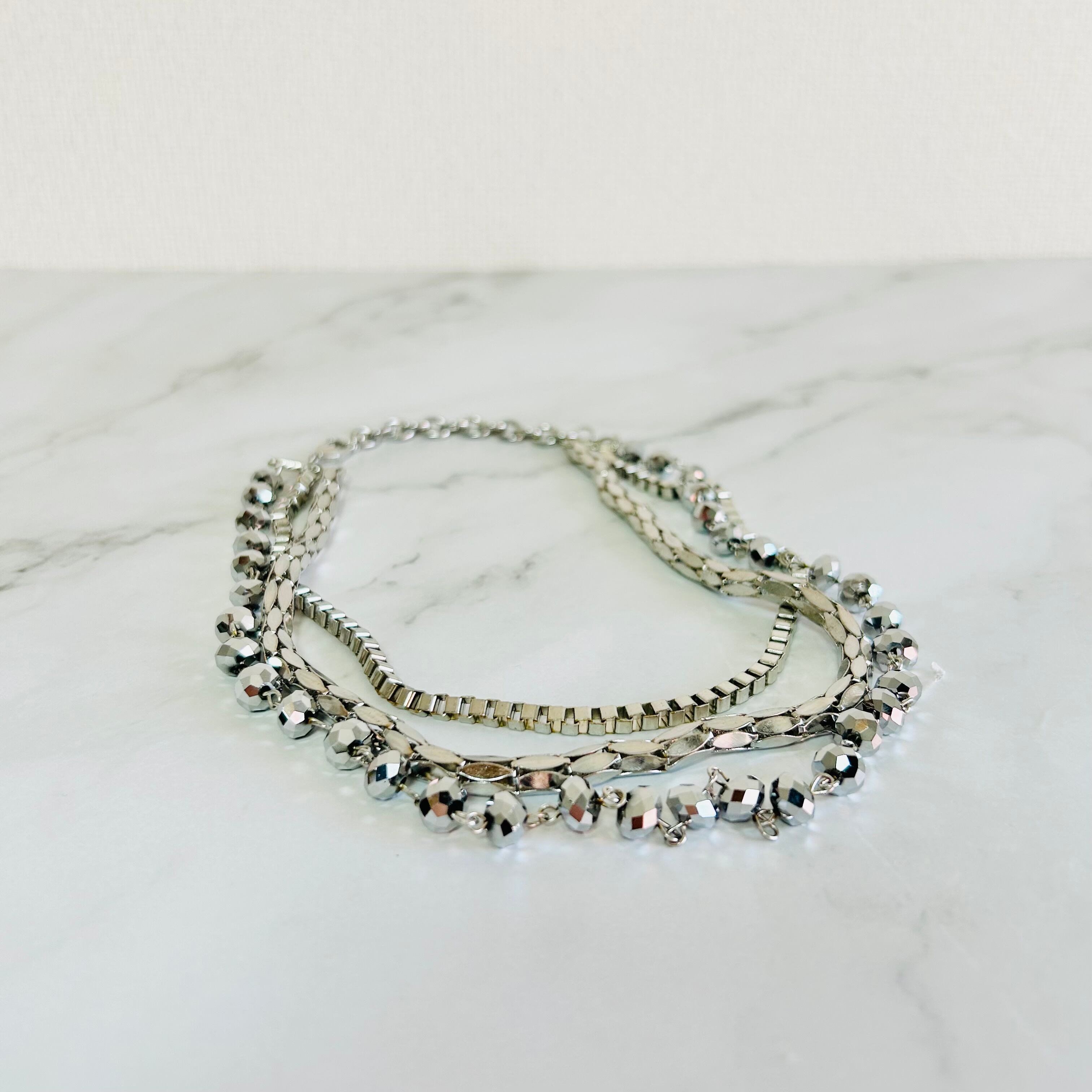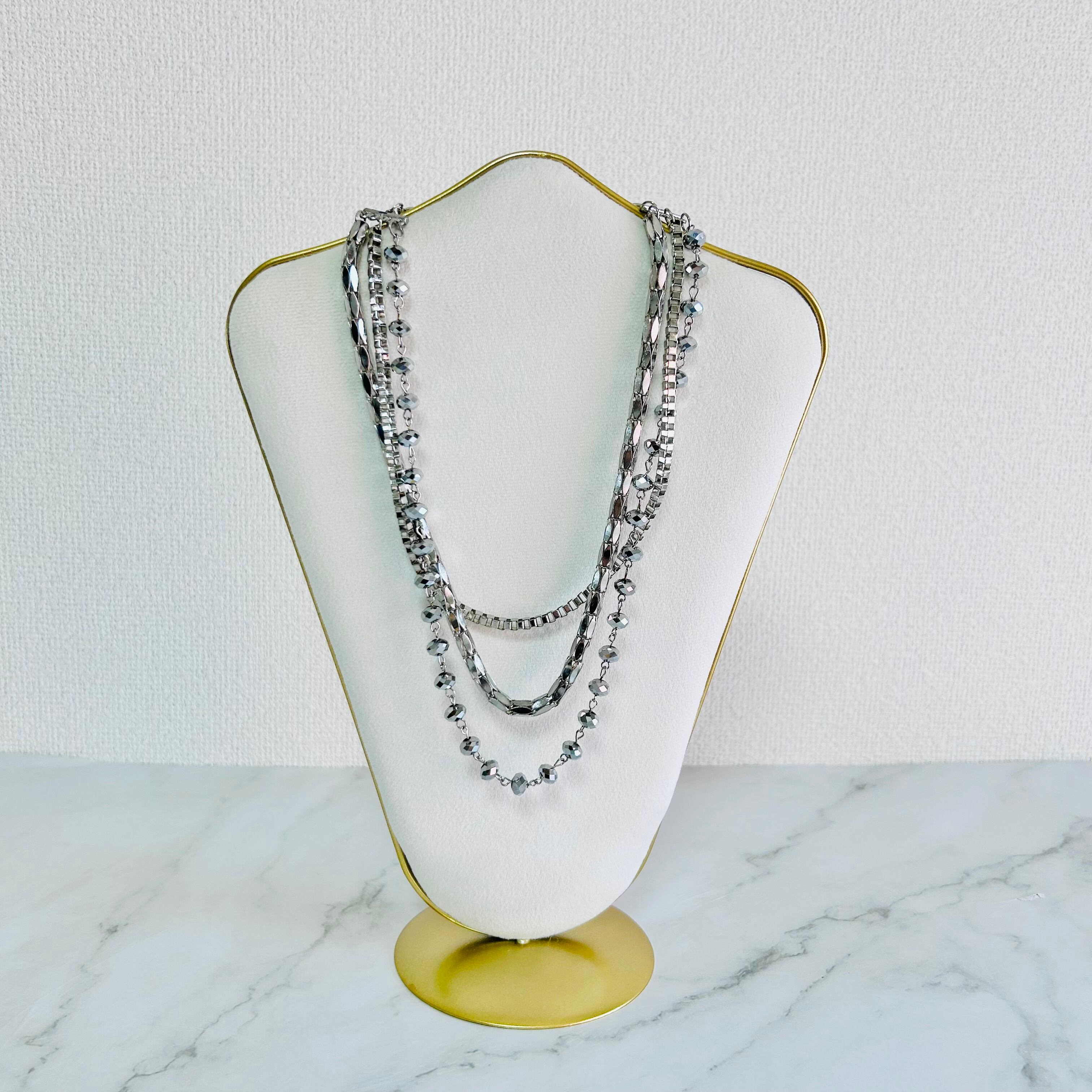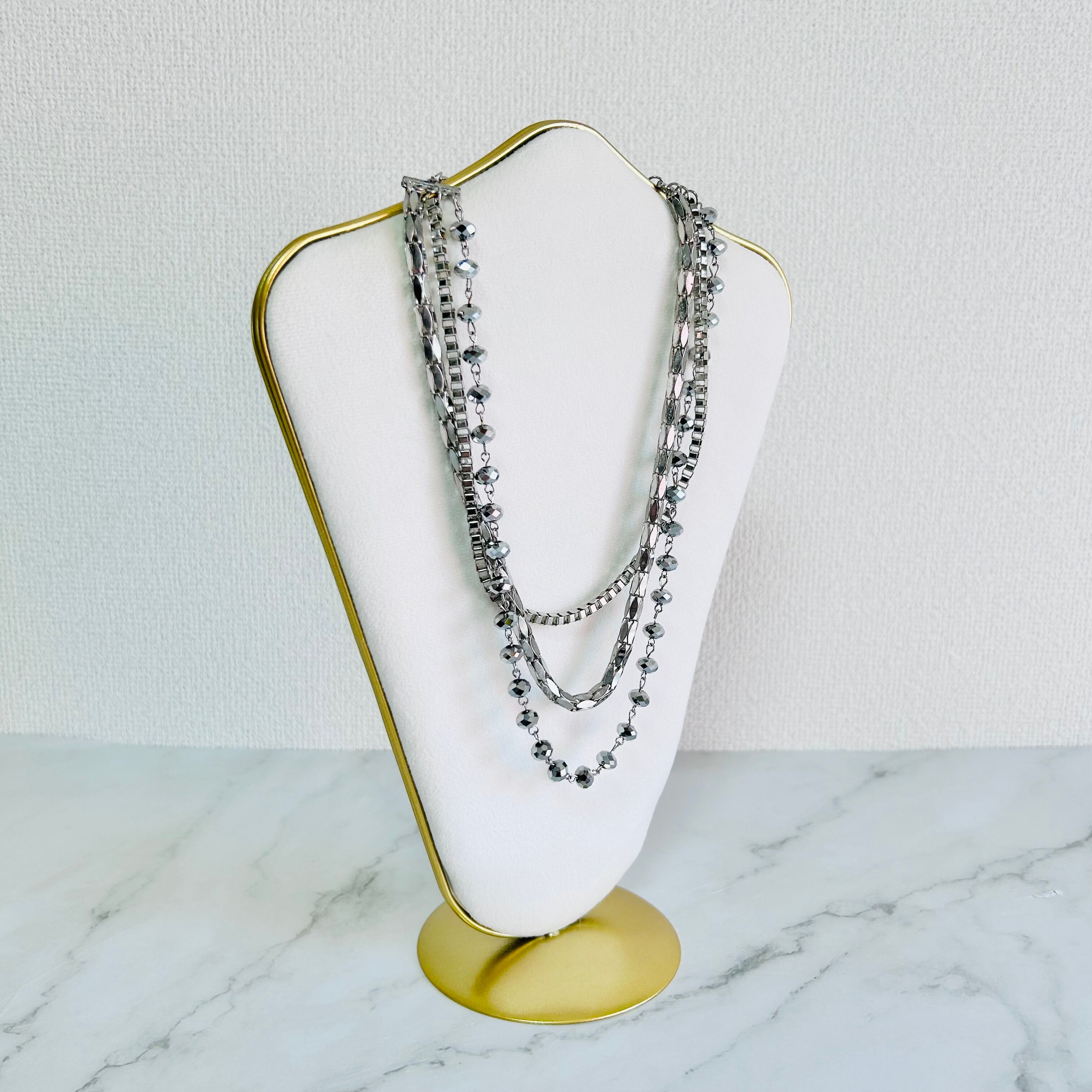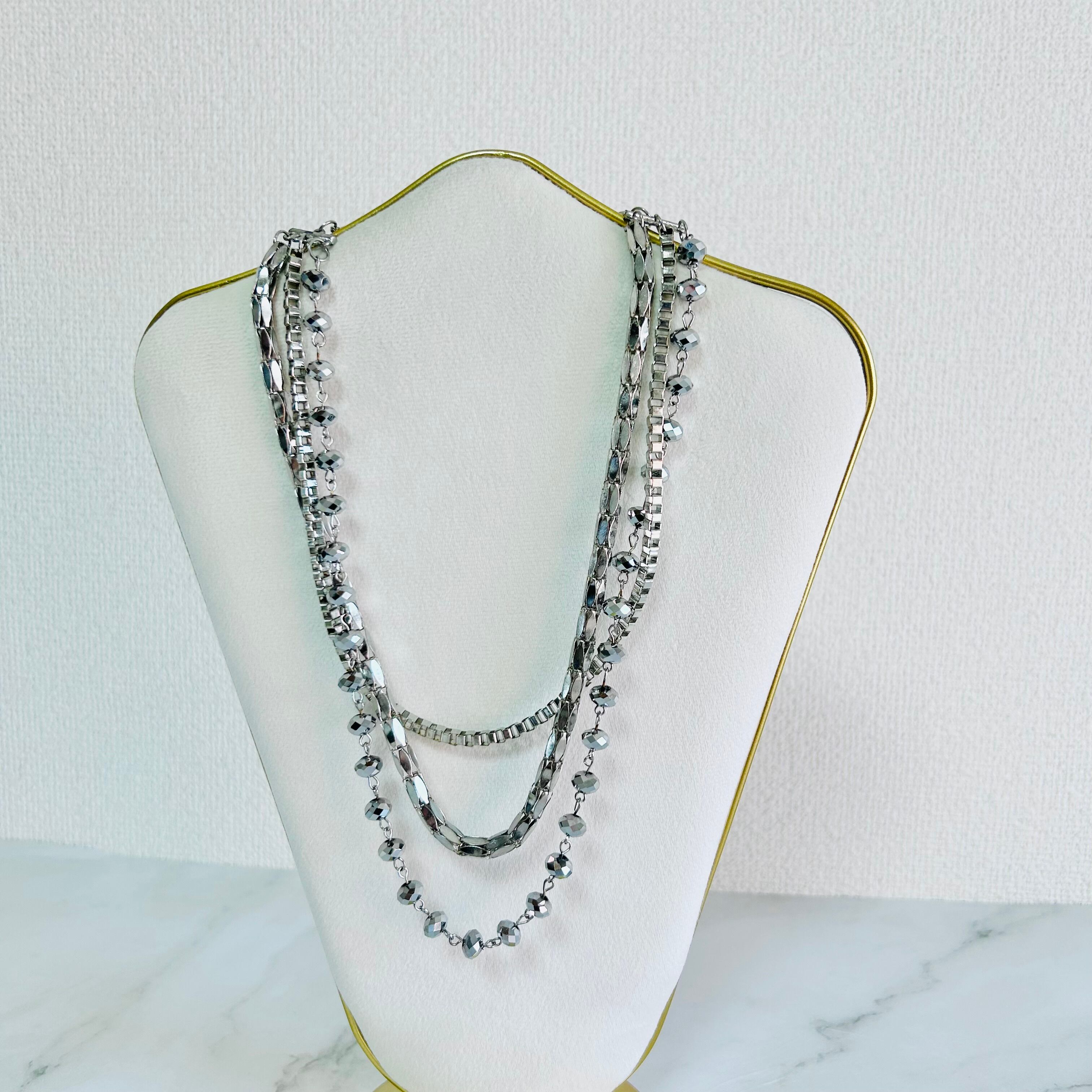 メタリックな質感が美しいシルバーカラーのチェーンと、カットが効いたクリスタル光沢ビーズを組み合わせた多連ネックレスです。