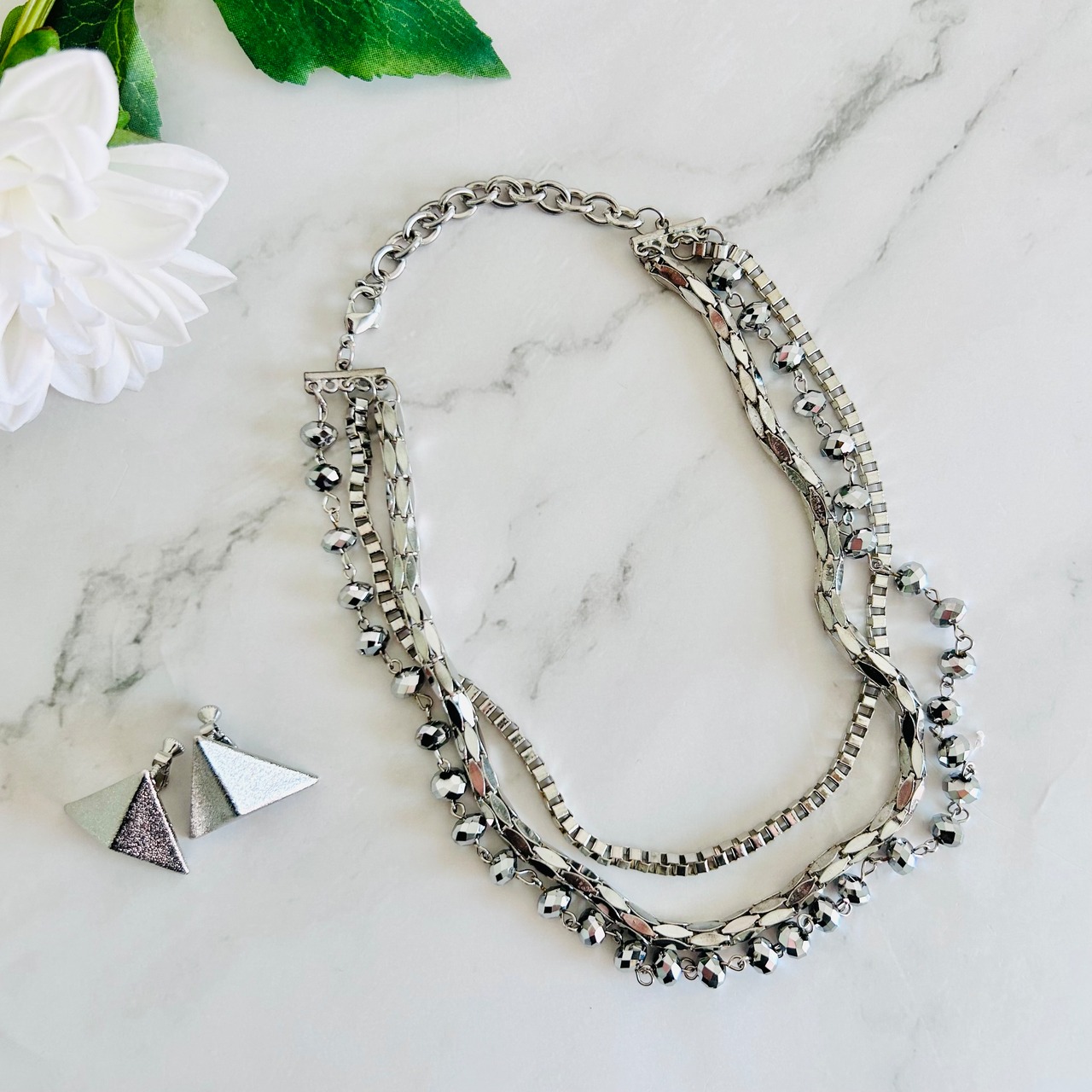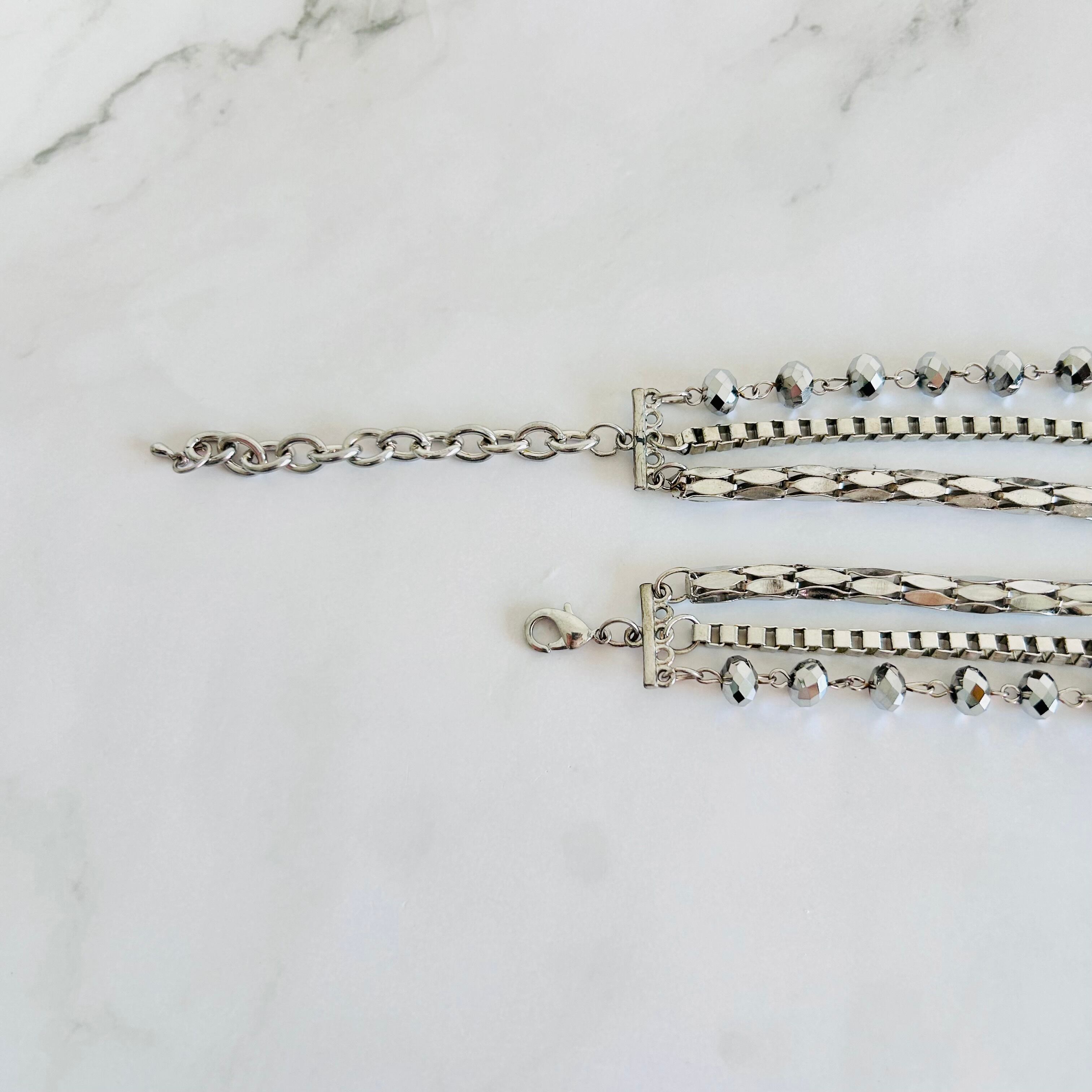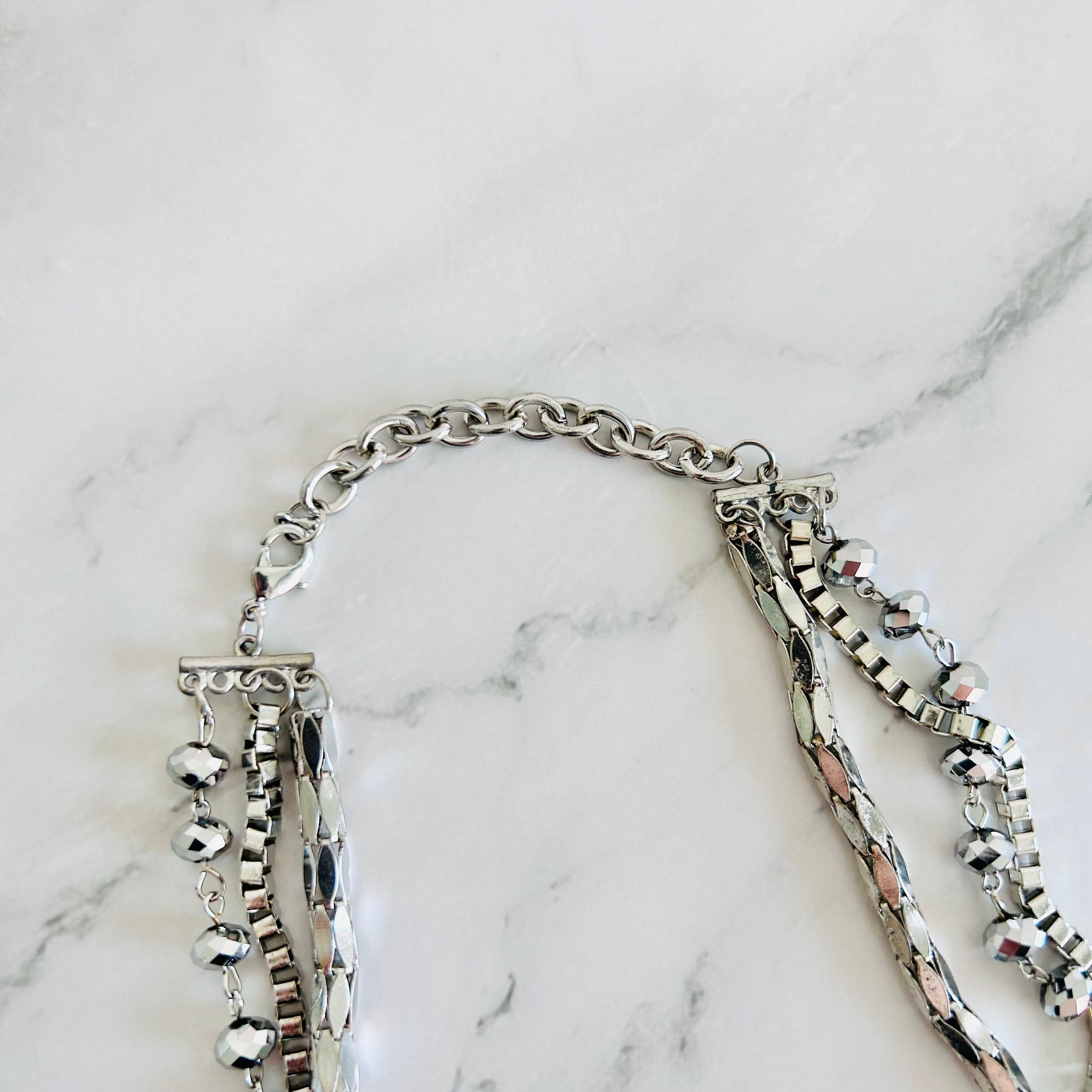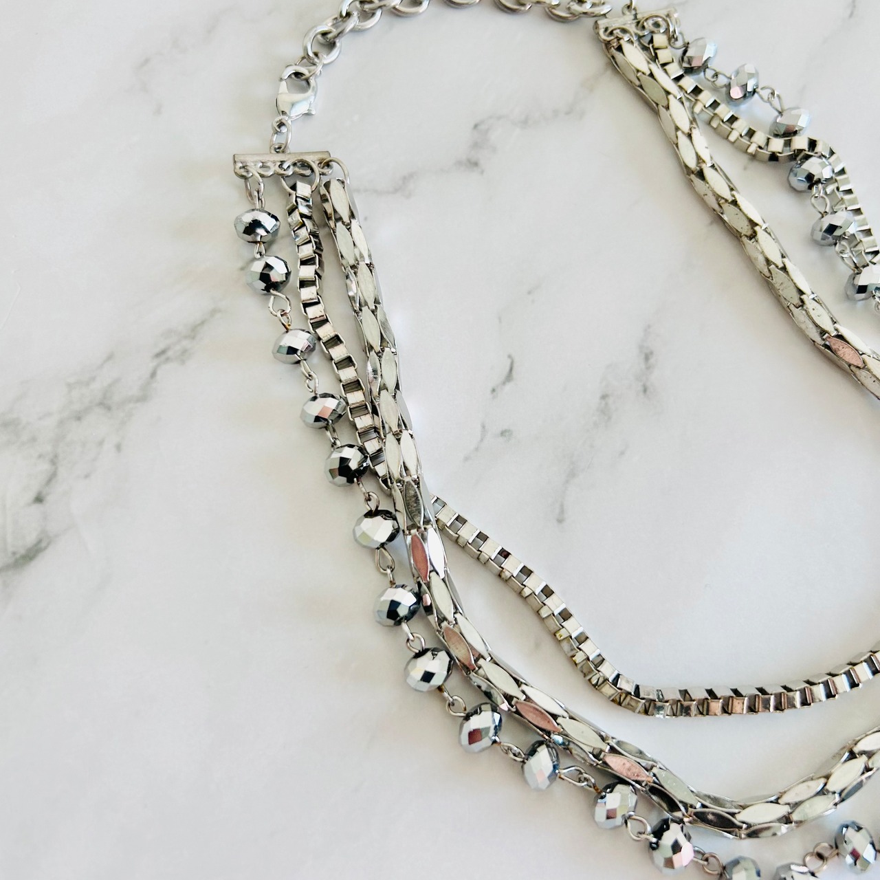 メタリックな質感が美しいシルバーカラーのチェーンと、カットが効いたクリスタル光沢ビーズを組み合わせた多連ネックレスです。