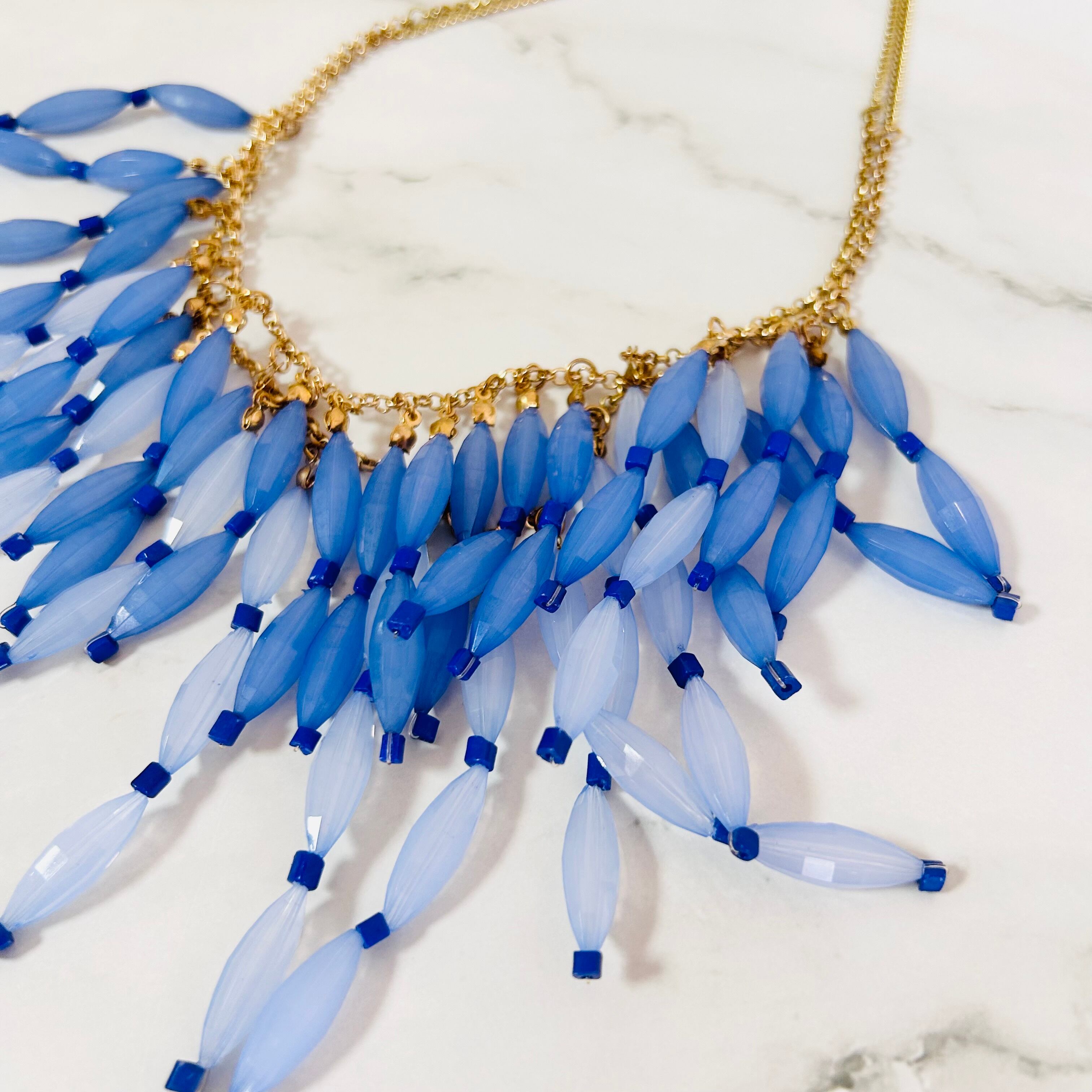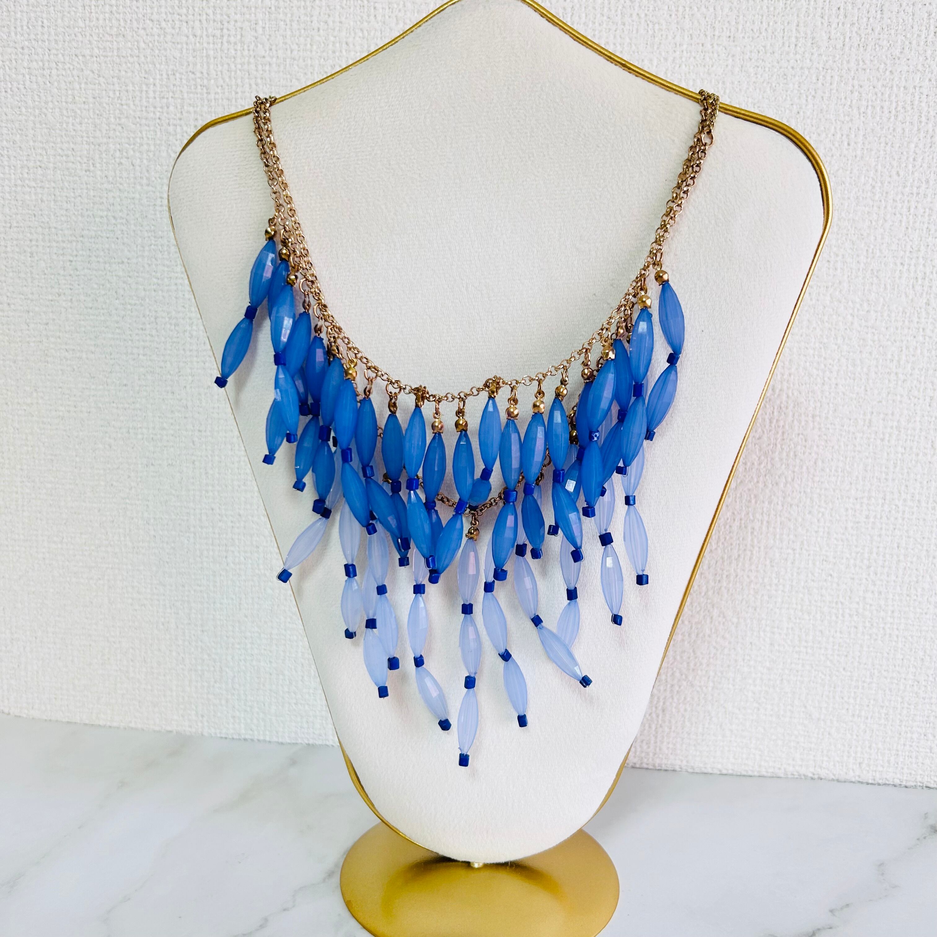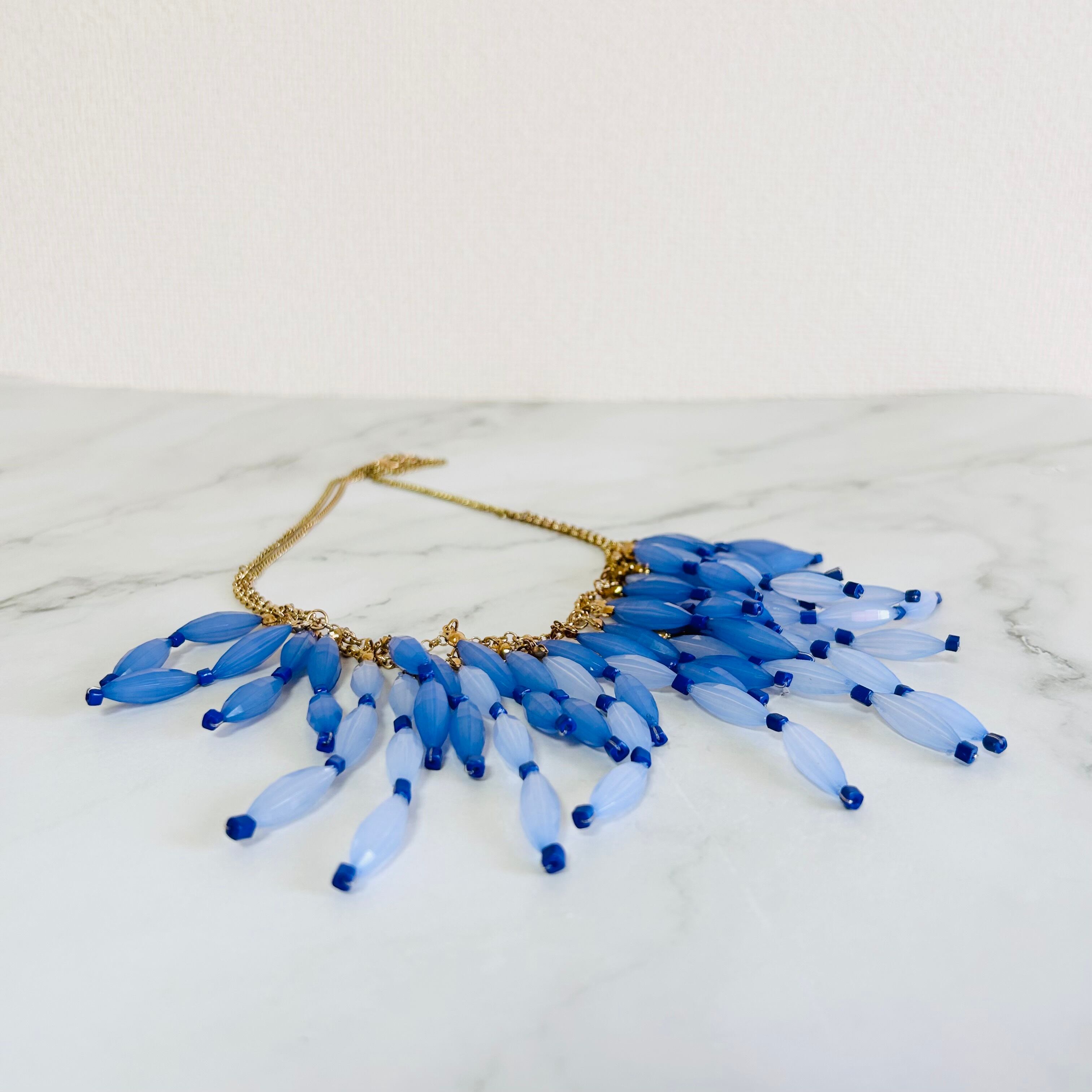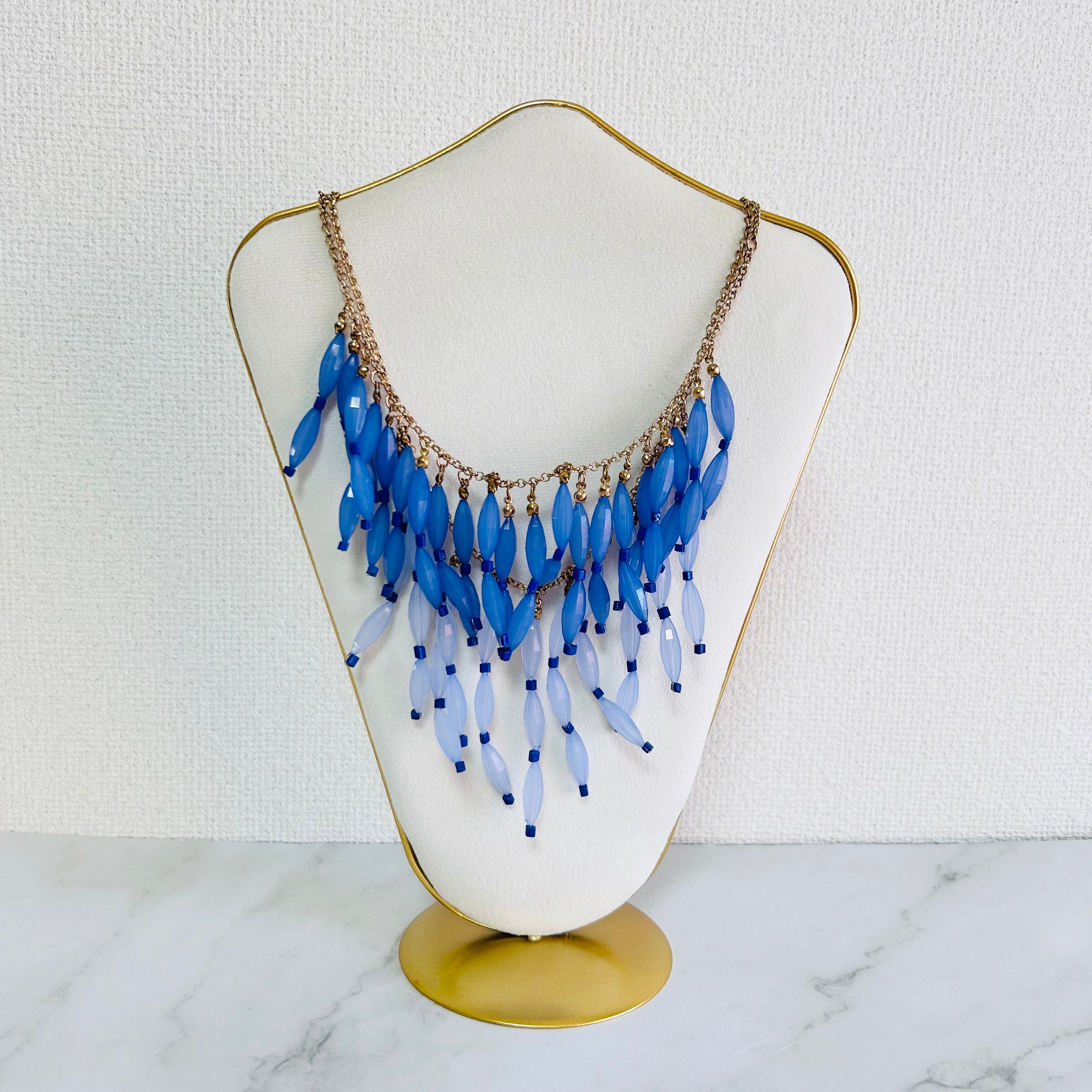 アンティークゴールドカラーのチェーンに、透明感のあるブルーとやわらかな淡ブルーがそれぞれ軽やかに揺れ、立体感のあるデザインに仕上がっています。