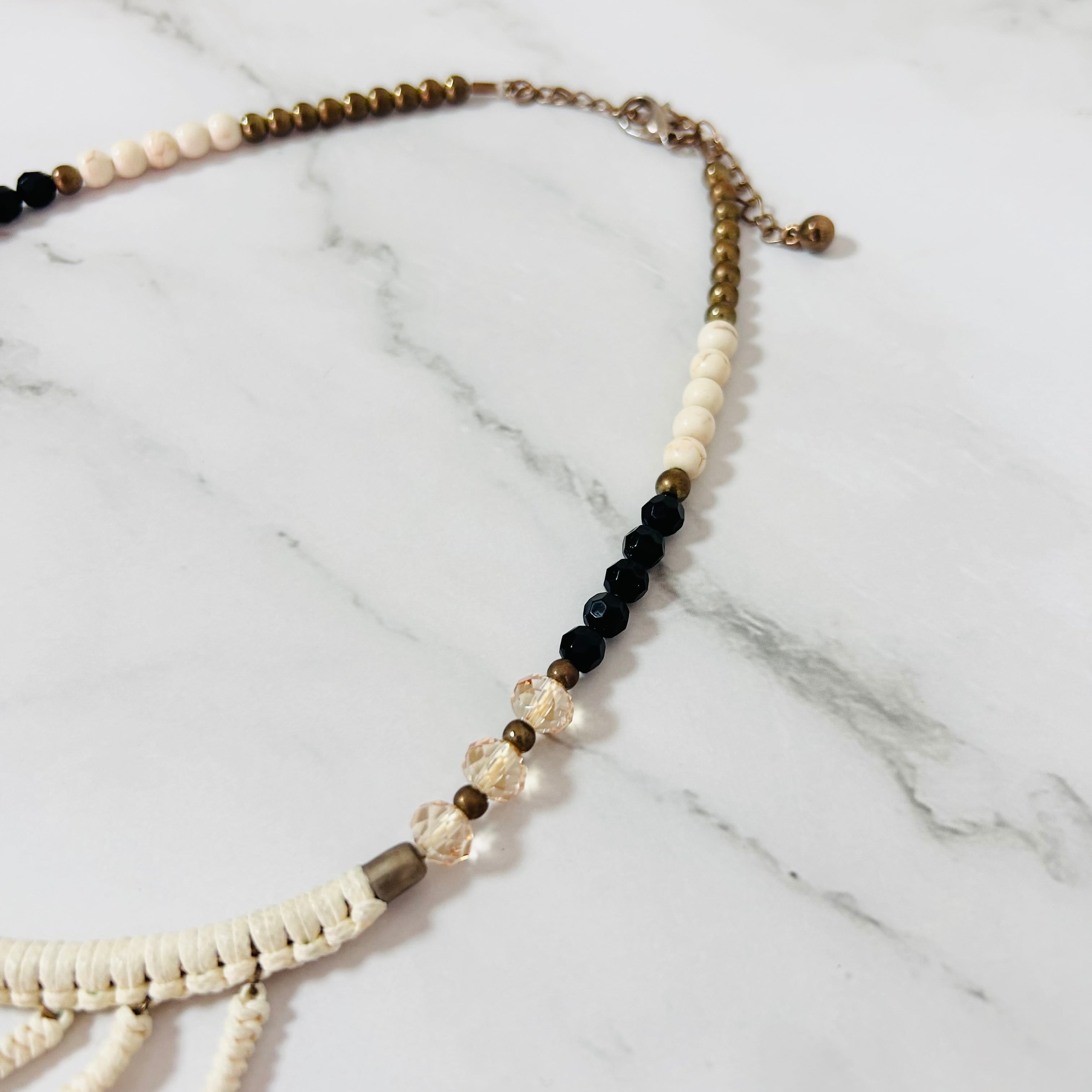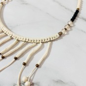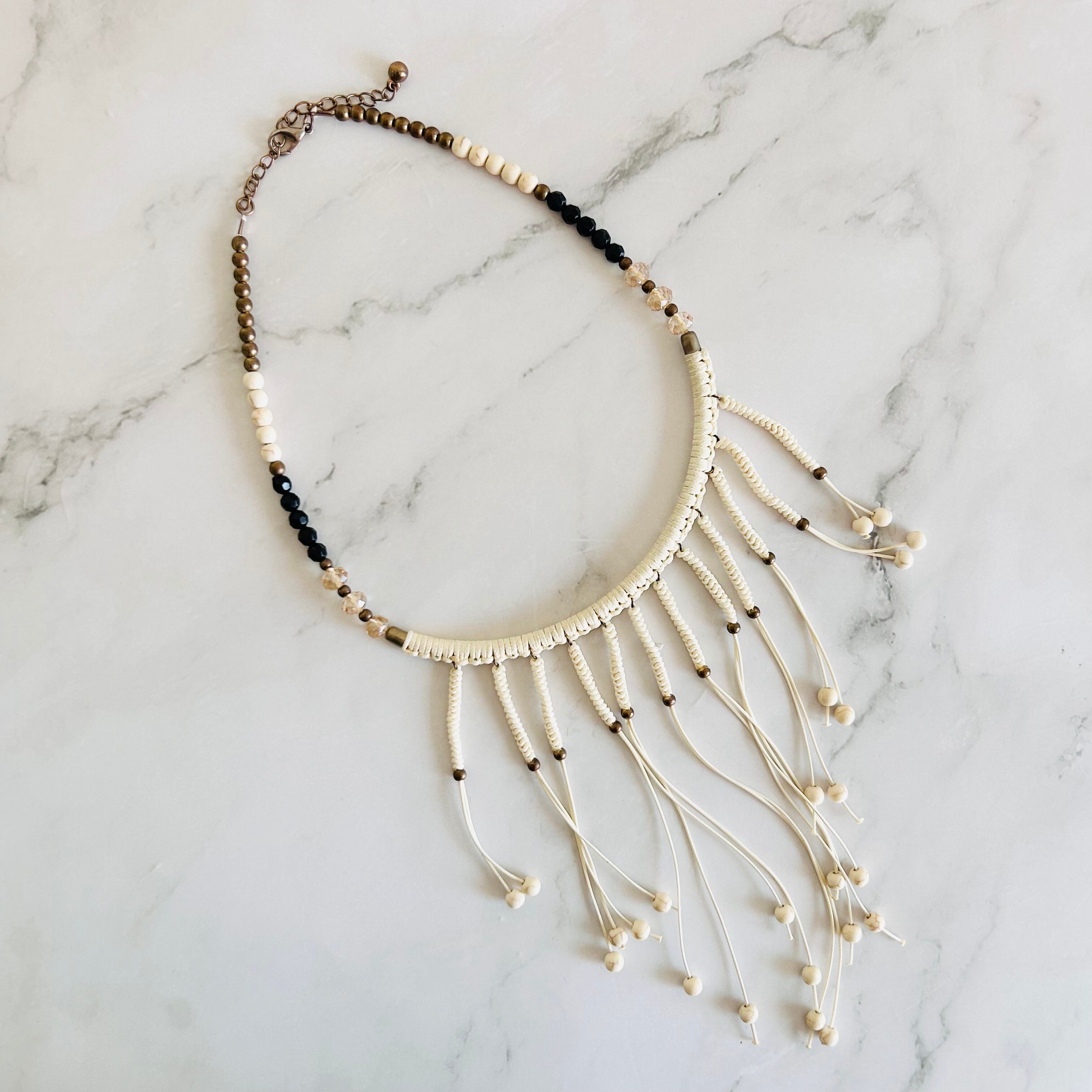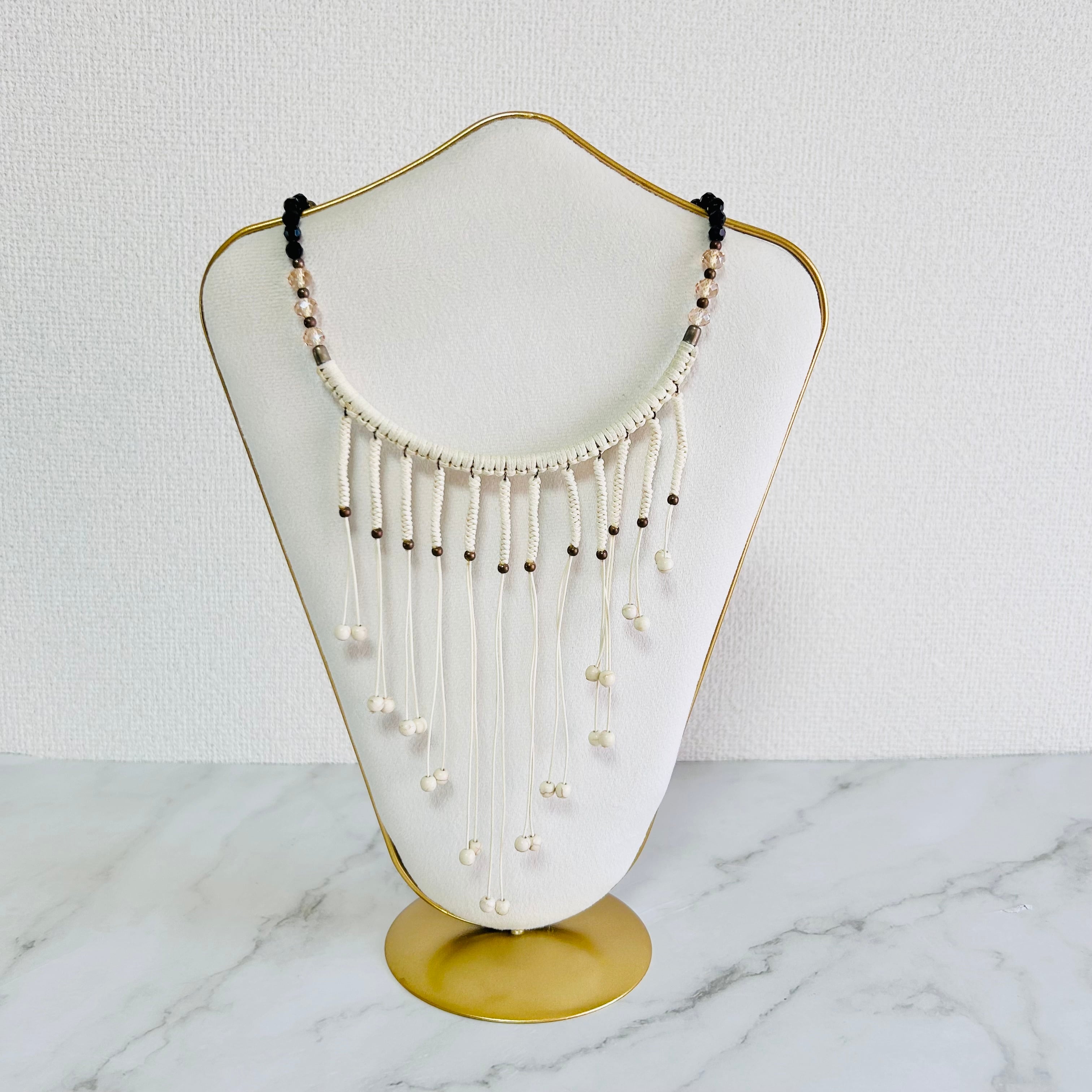 ナチュラルなアイボリービーズをベースに、ブラックの差し色を効かせたロングフリンジネックレスです。