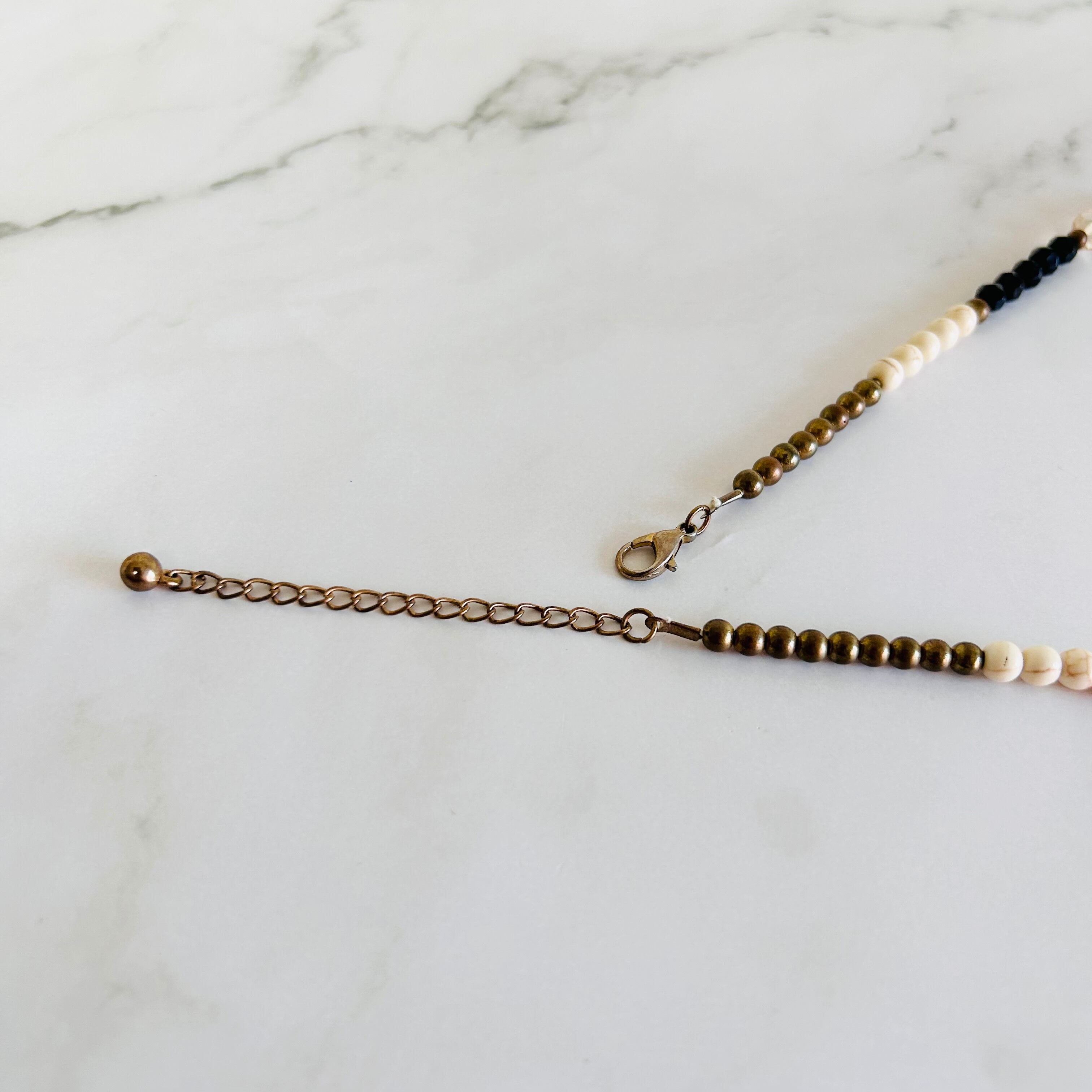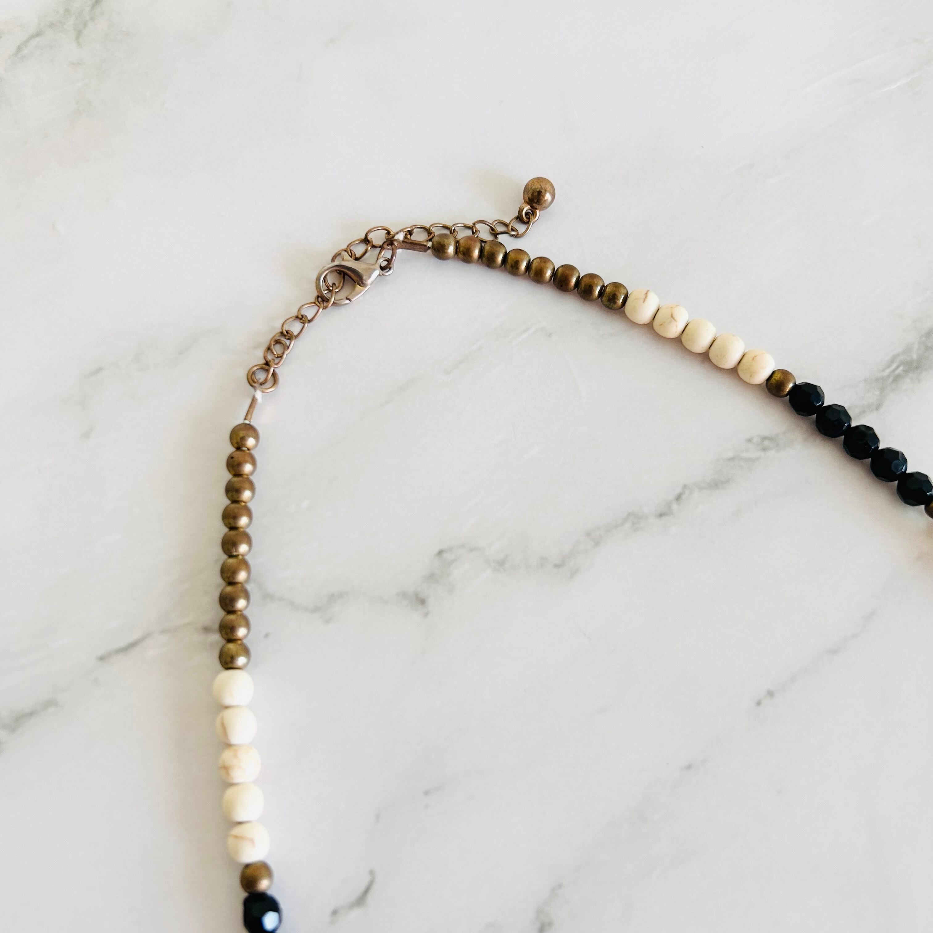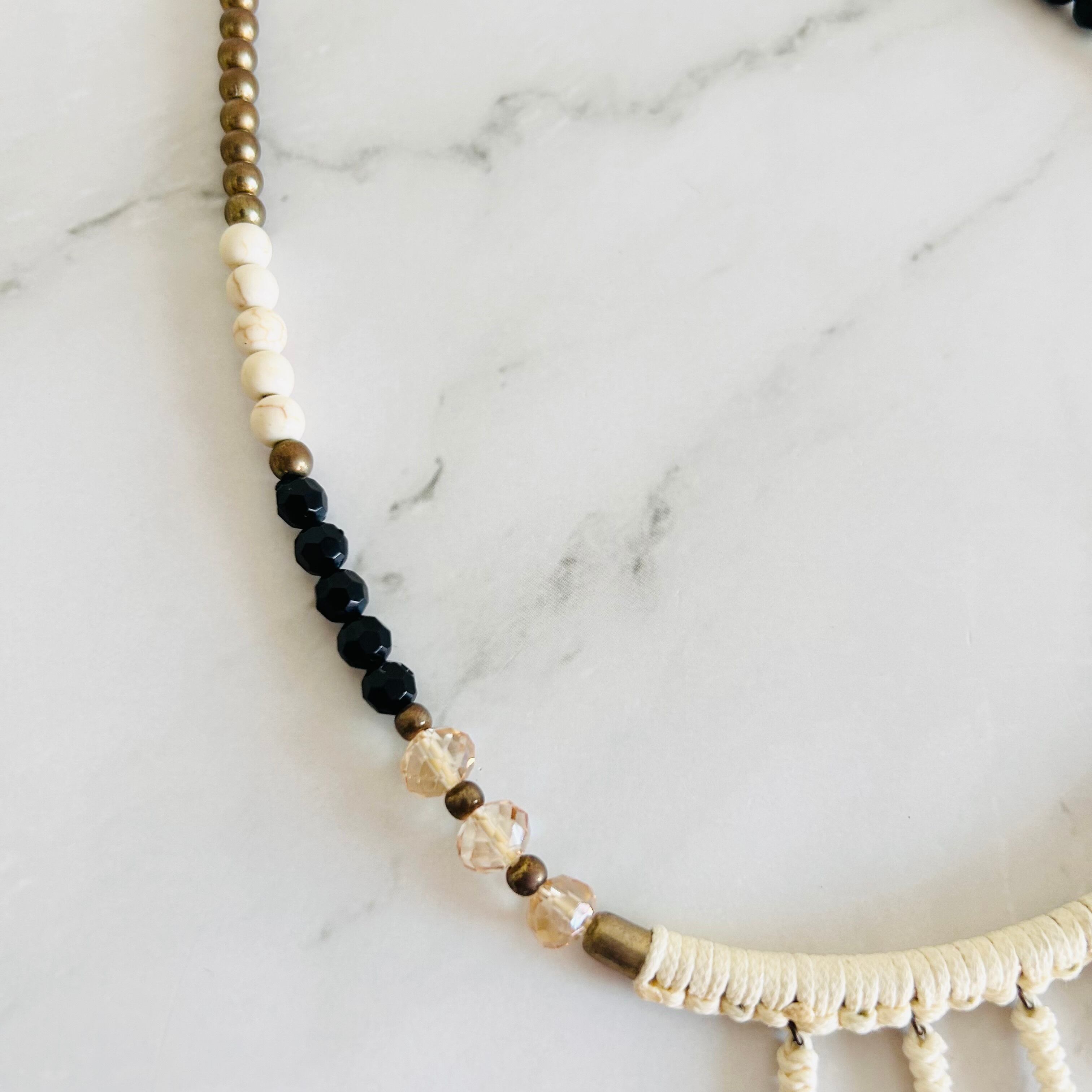 ナチュラルなアイボリービーズをベースに、ブラックの差し色を効かせたロングフリンジネックレスです。