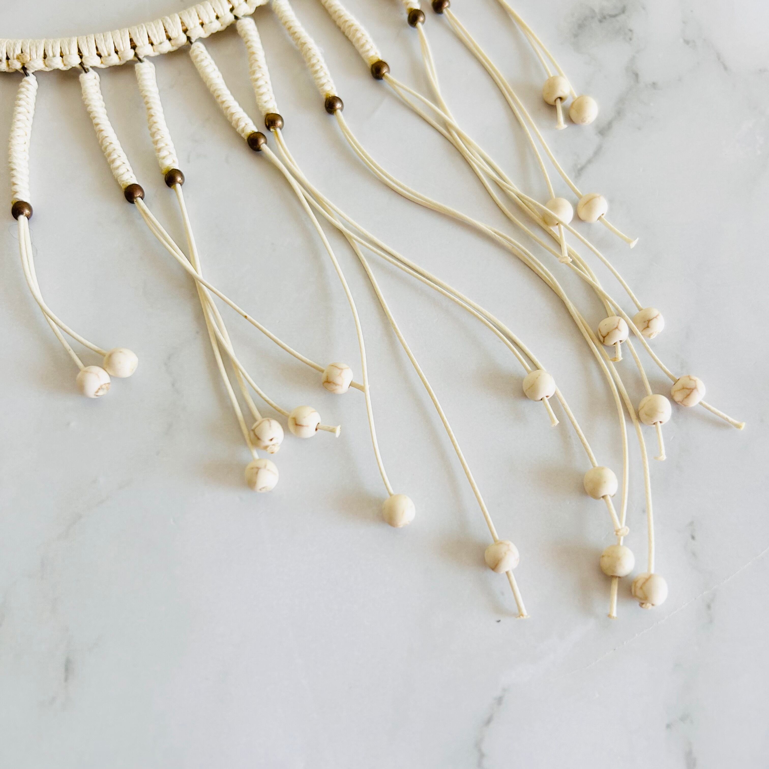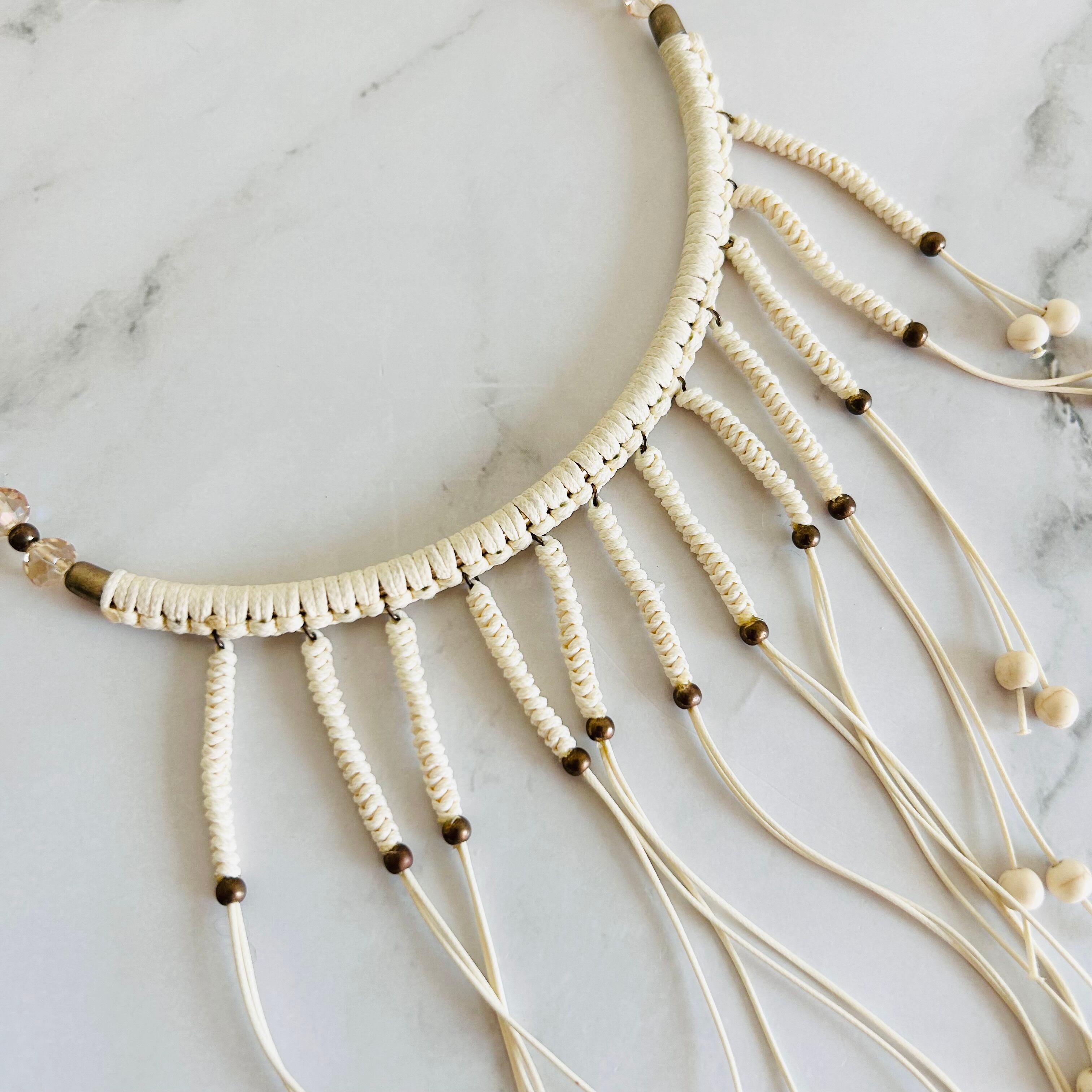 編み込みコードを使った首元のフレームから、細やかに連なるフリンジが優雅に揺れ、素肌に映えるデザインです。