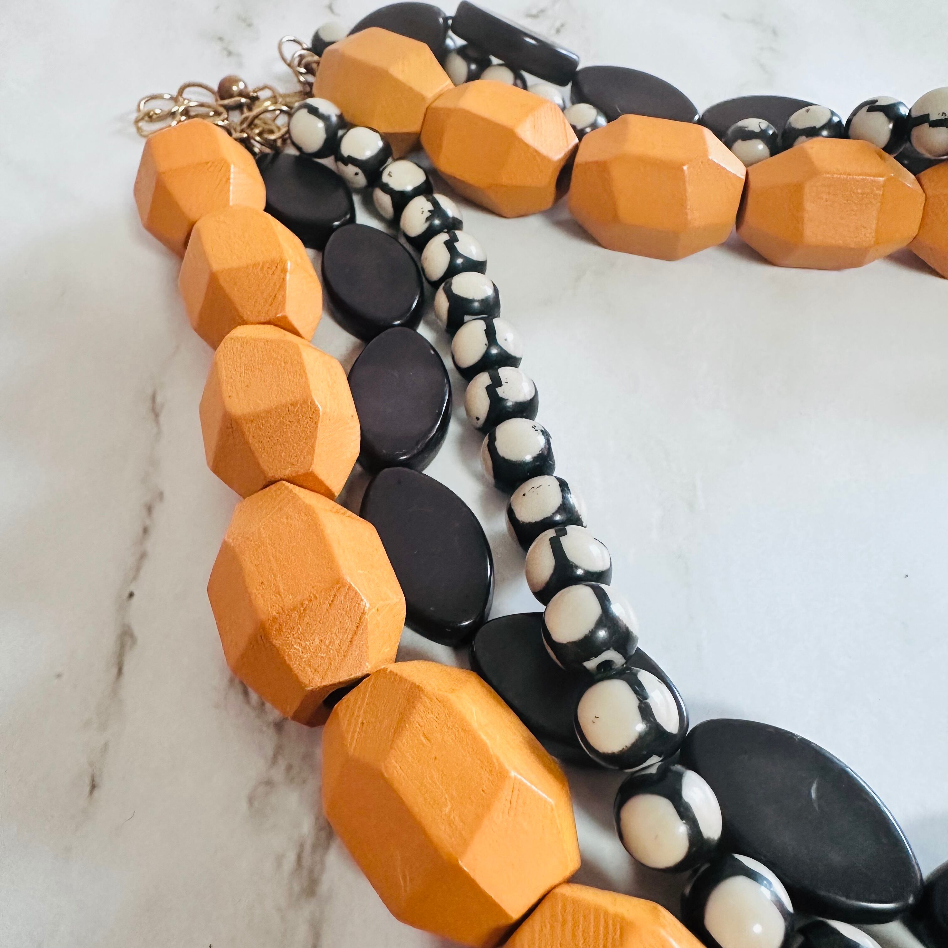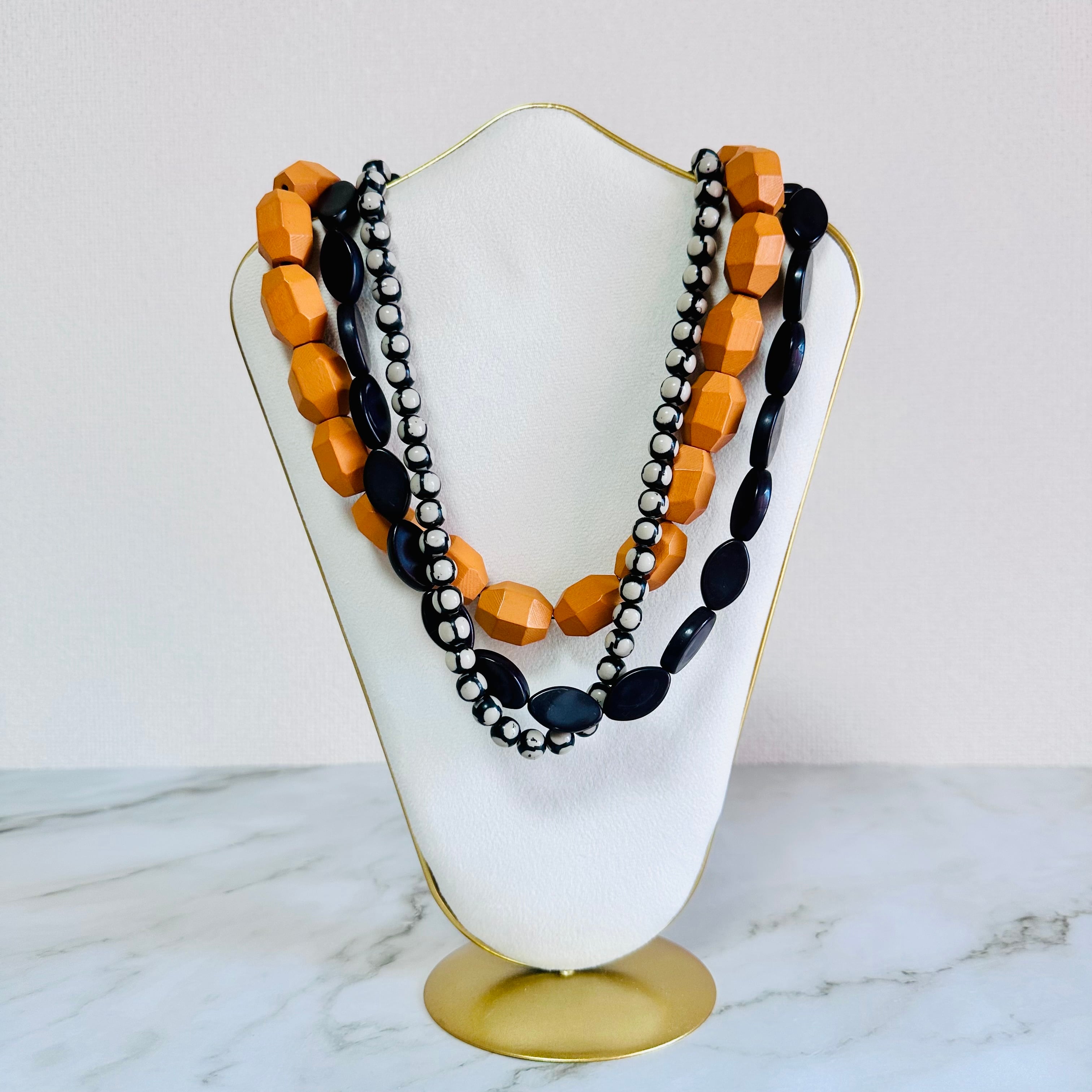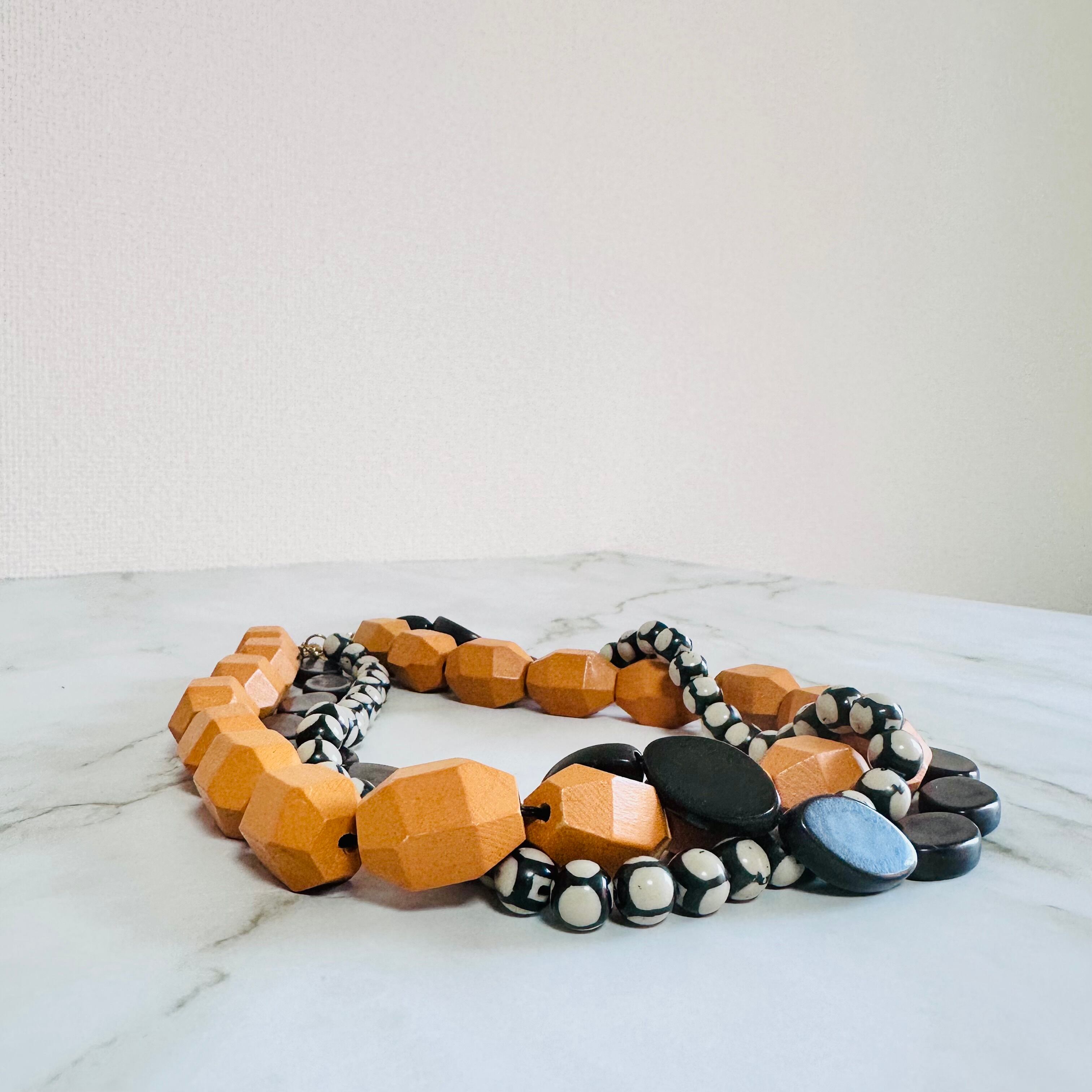 オレンジのウッドビーズ、マットな質感のブラック楕円形パーツ、立体感のあるドット柄ビーズを3連に組み合わせたネックレスです。