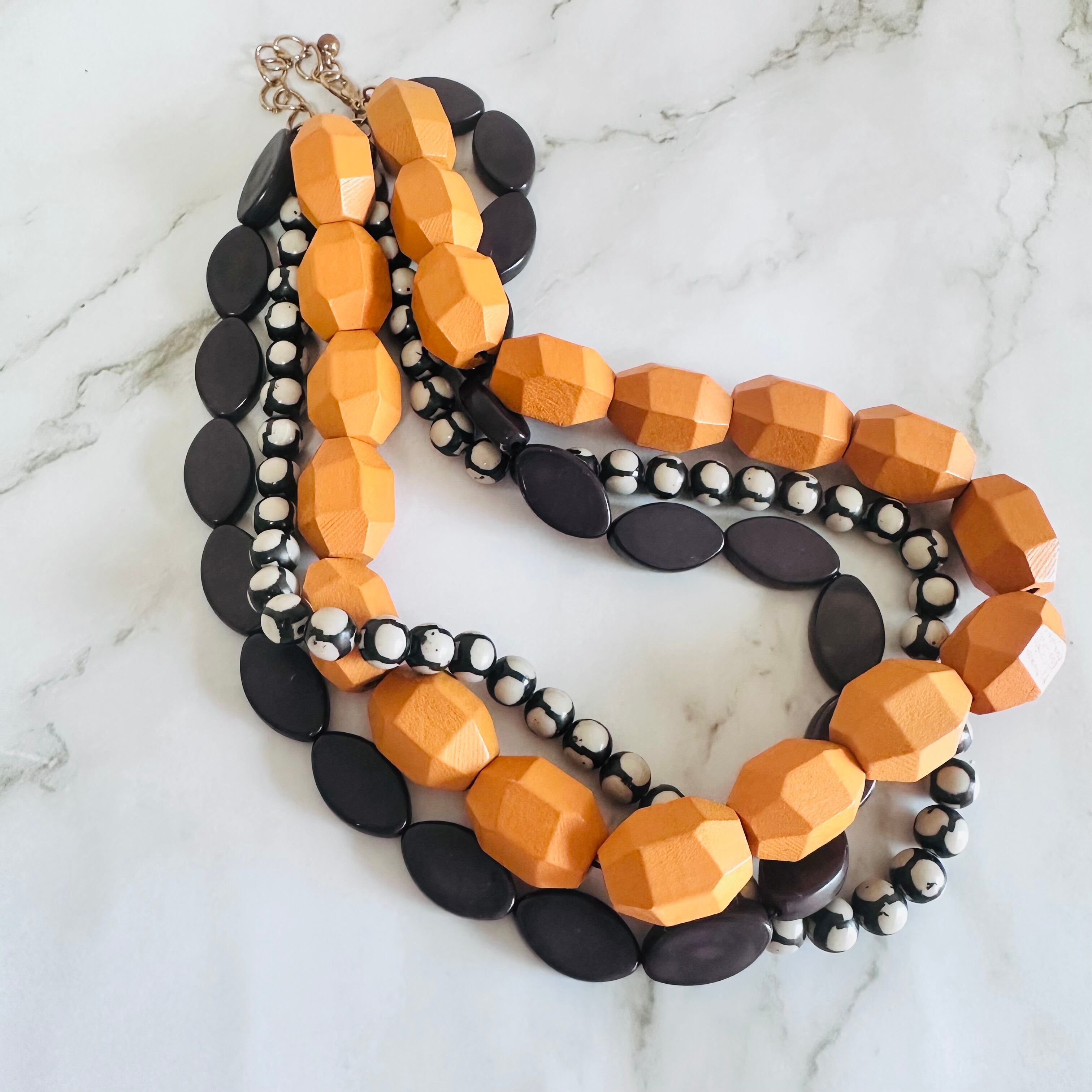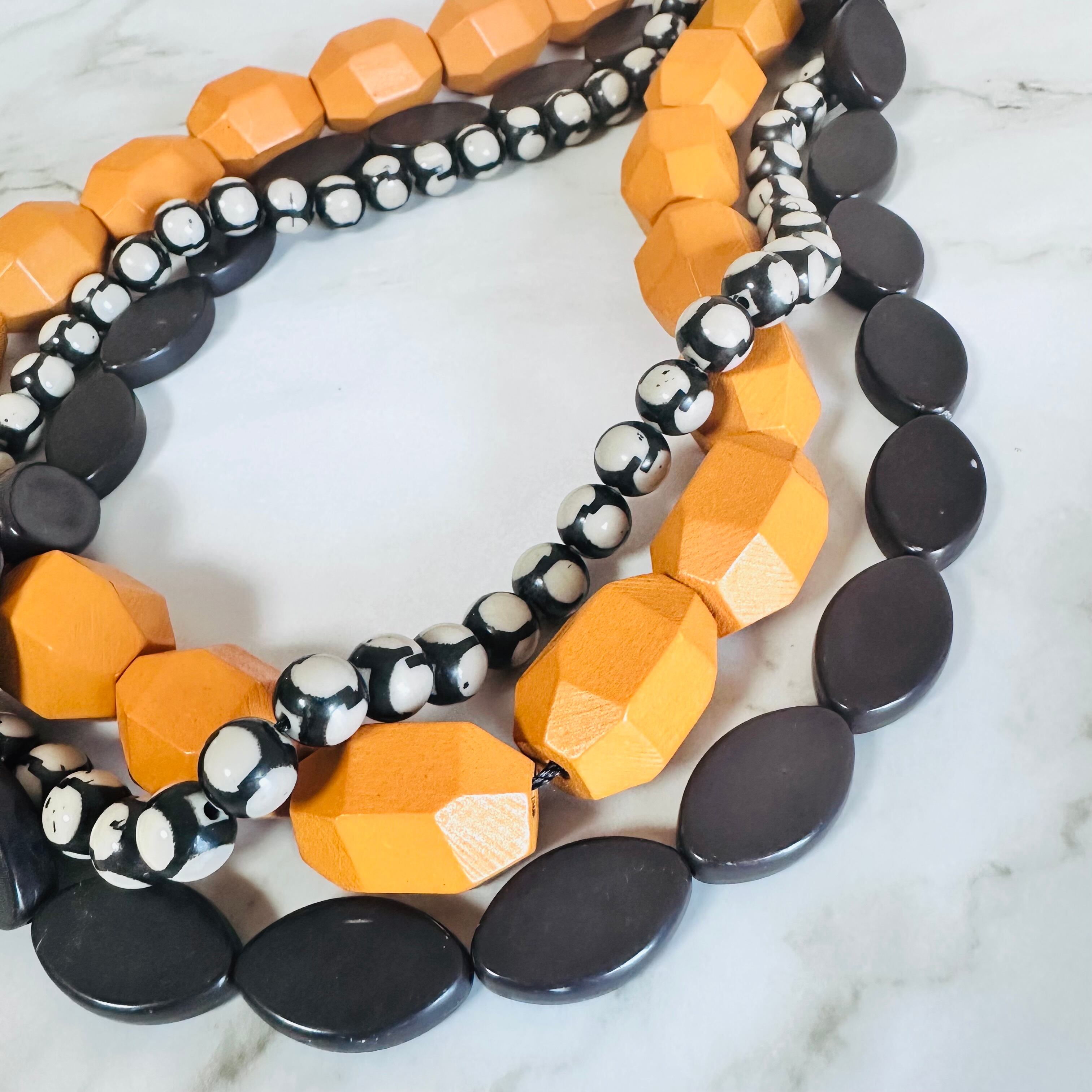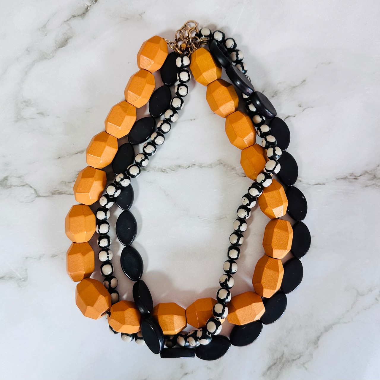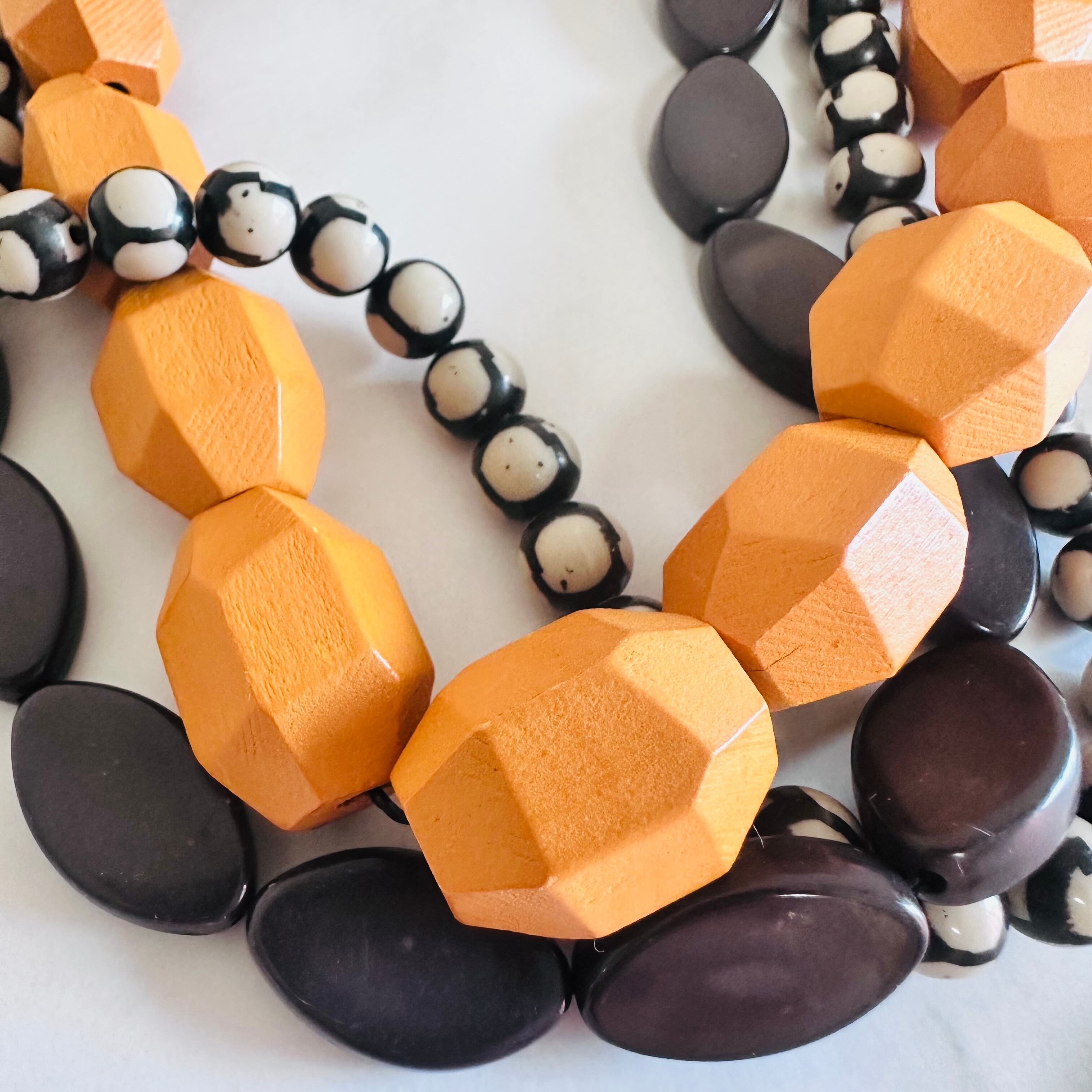 オレンジのウッドビーズ、マットな質感のブラック楕円形パーツ、立体感のあるドット柄ビーズを3連に組み合わせたネックレスです。