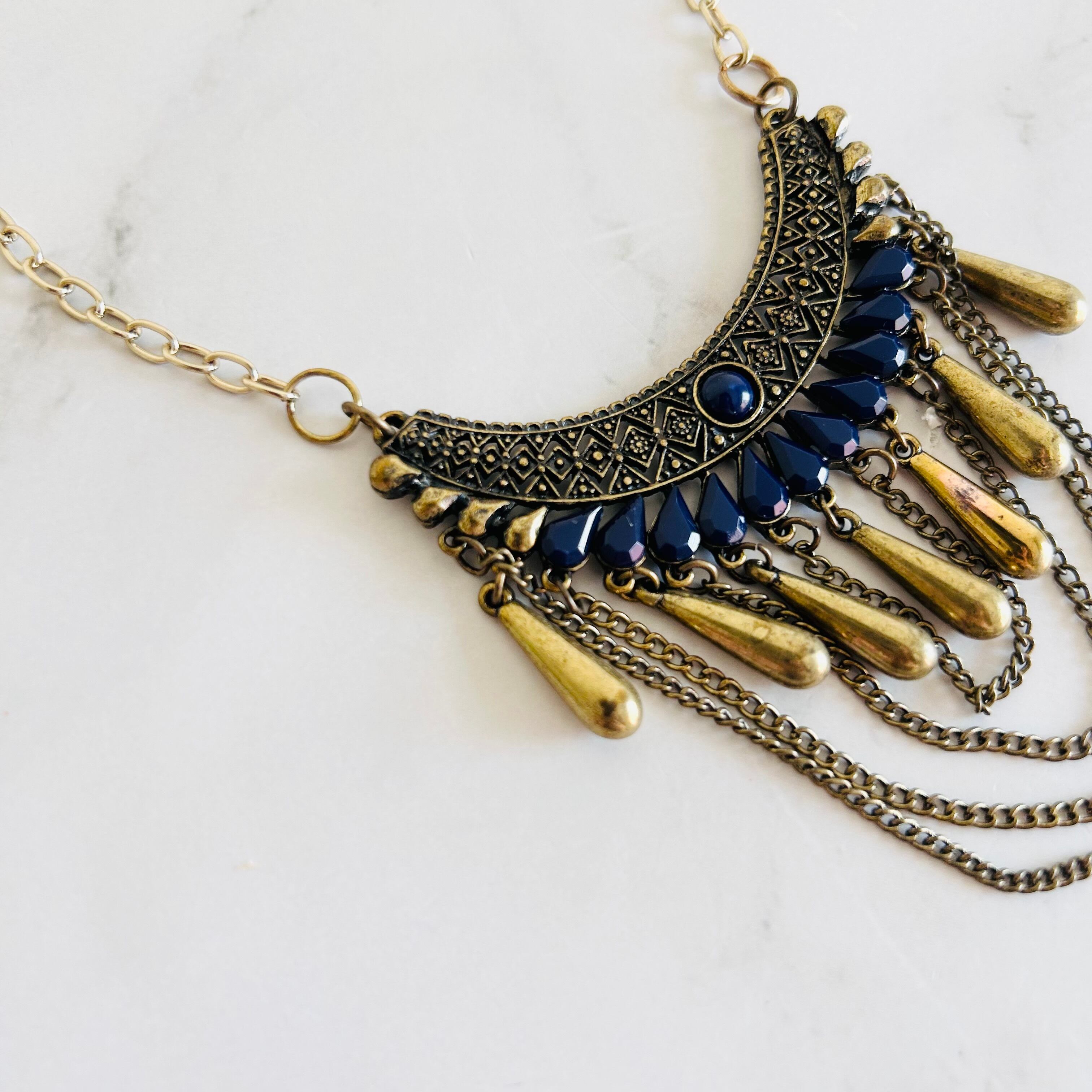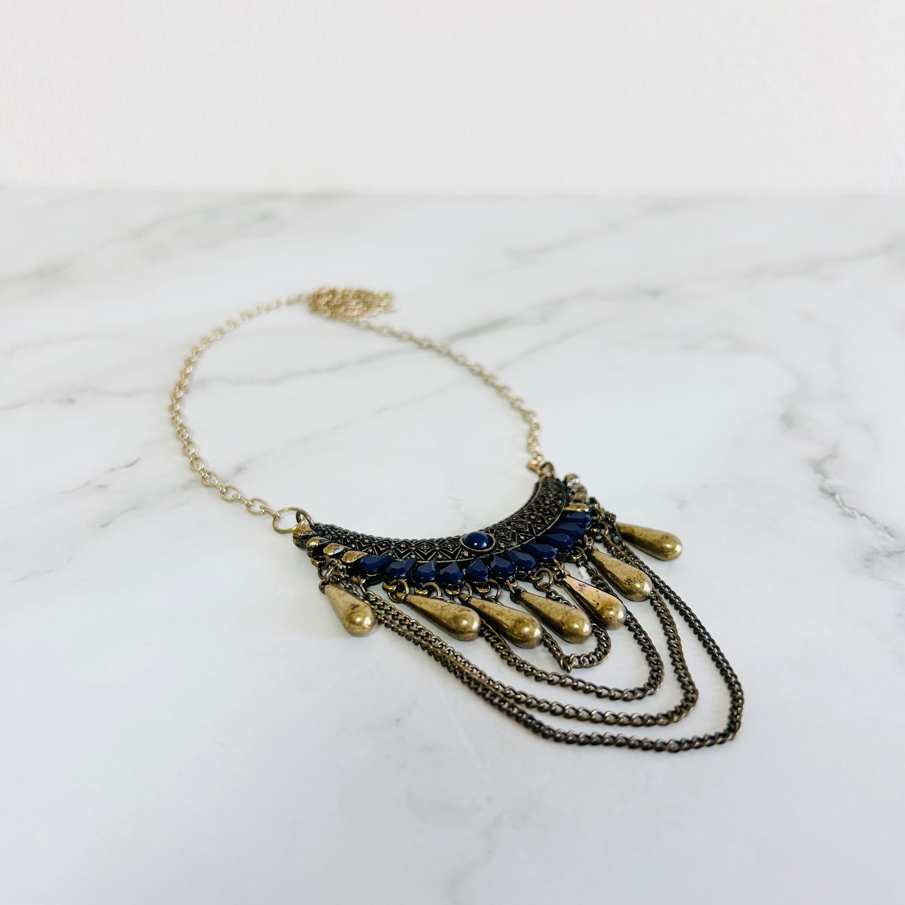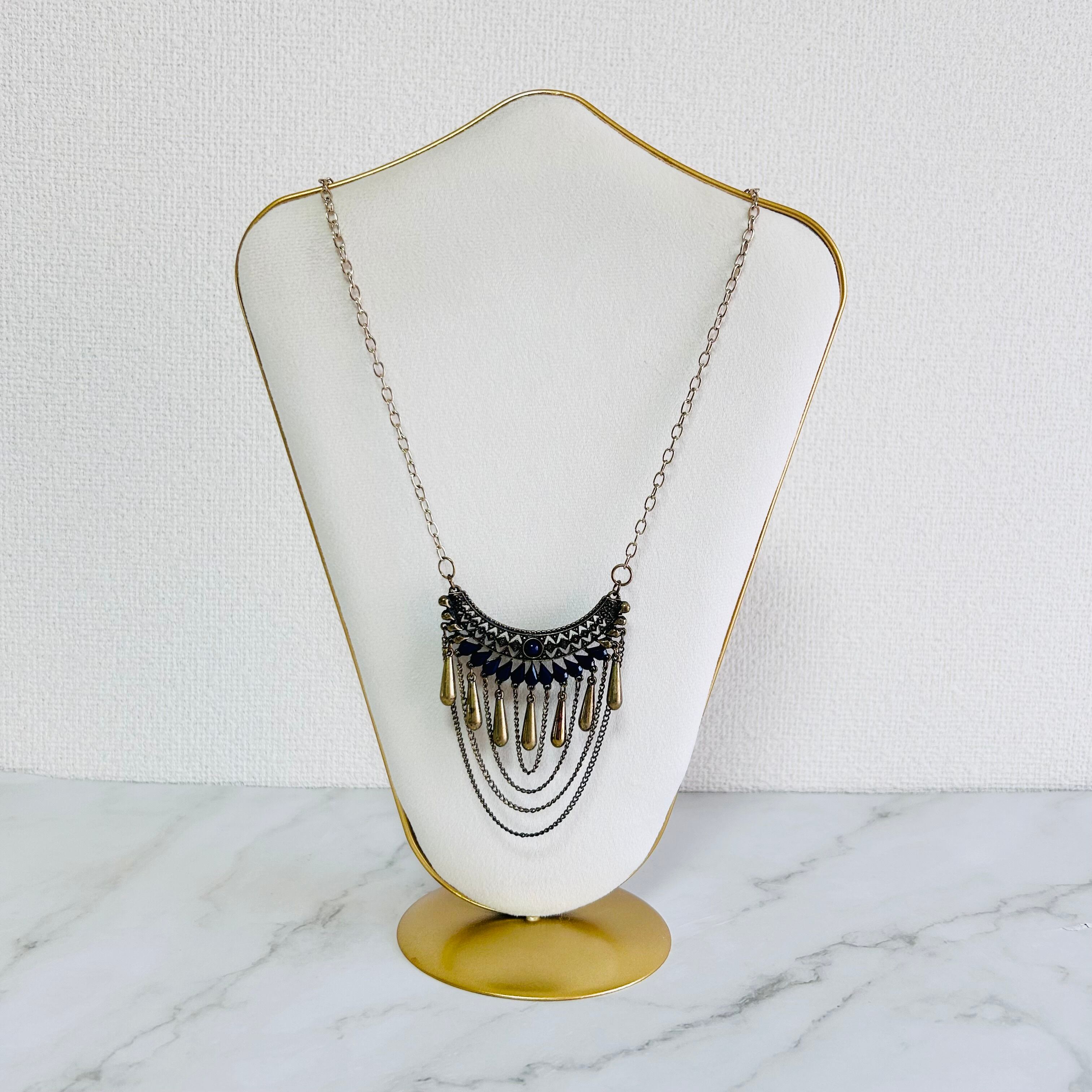 アンティークゴールド調のプレートパーツに、艶やかなネイビーのパーツとゴールドのティアドロップパーツを組み合わせたネックレスです。