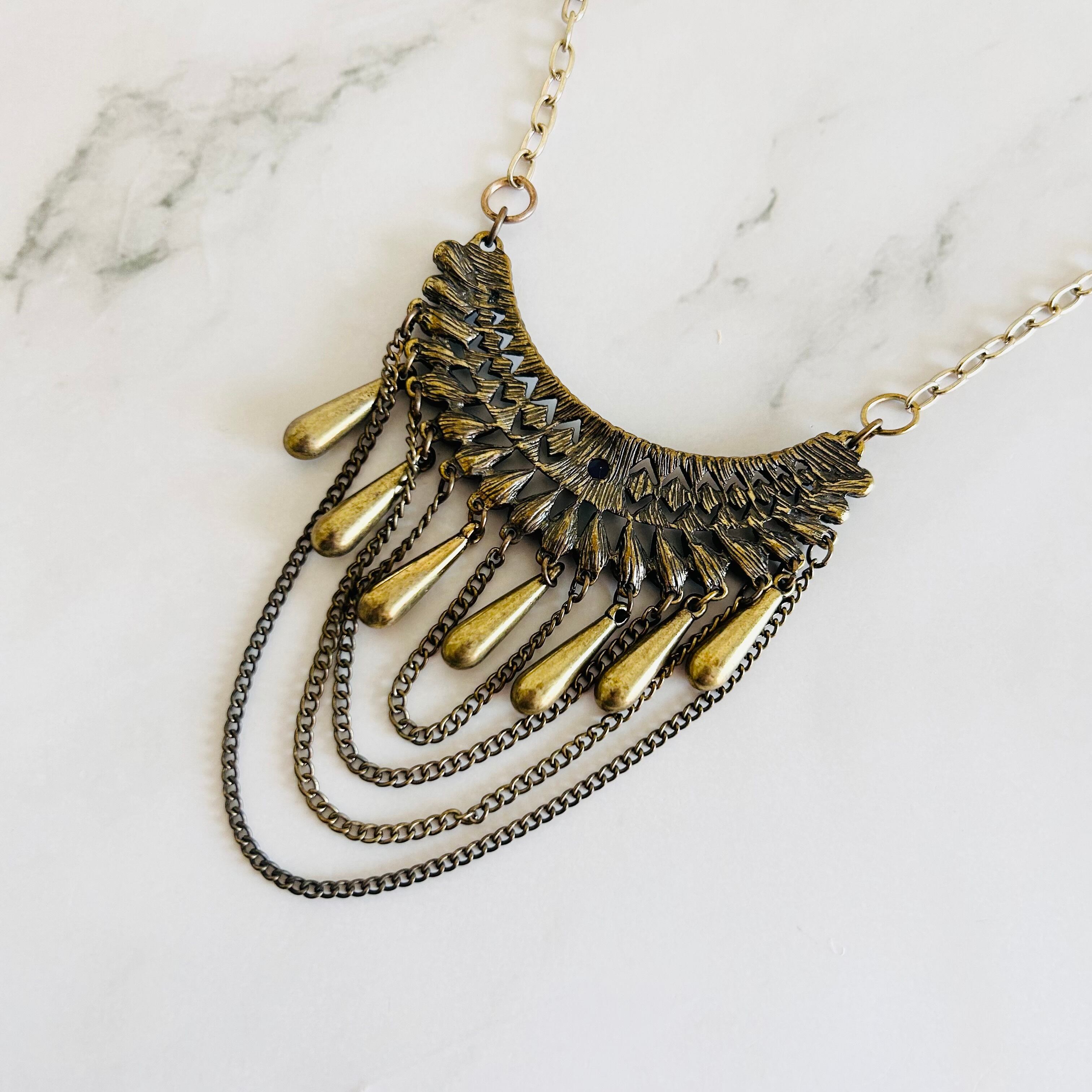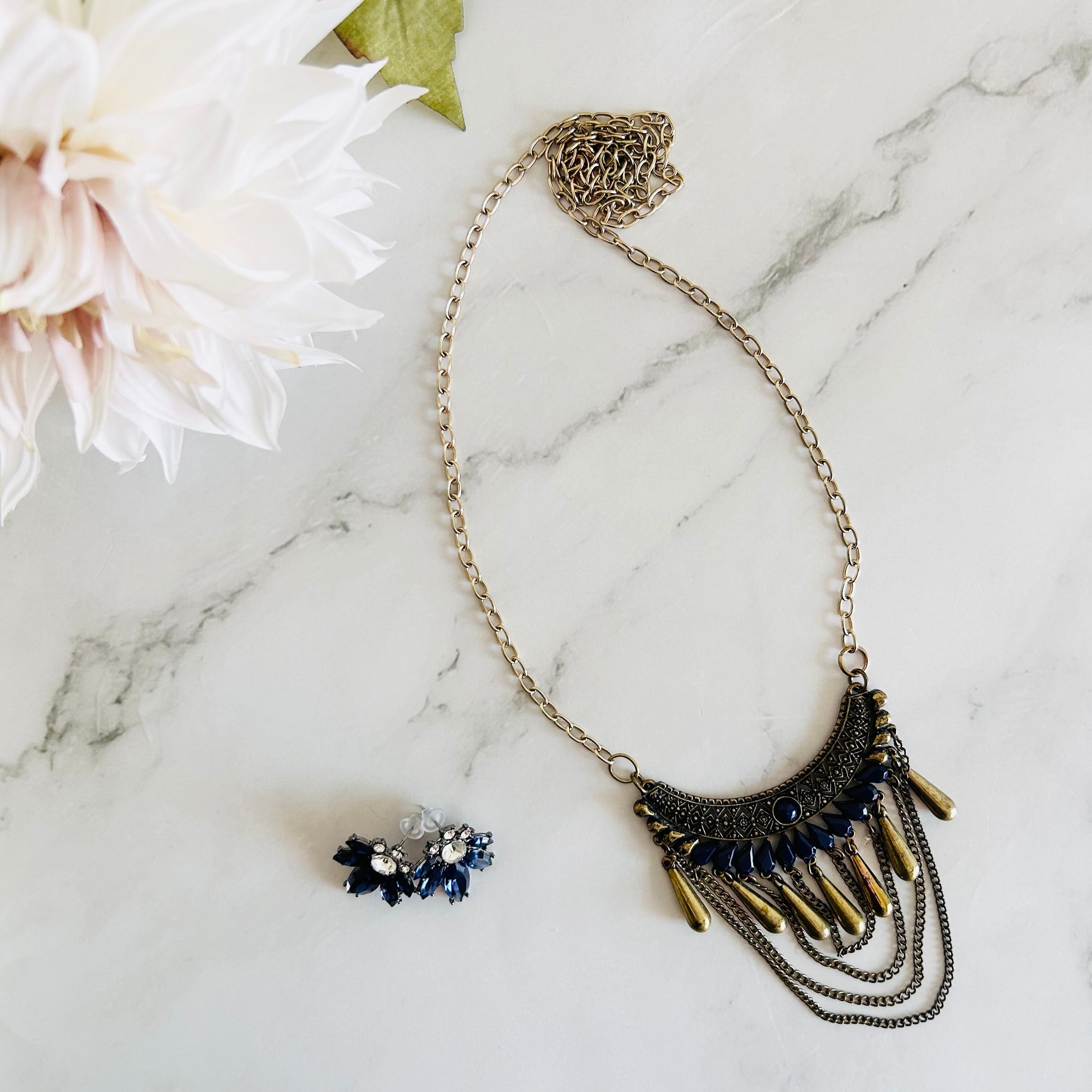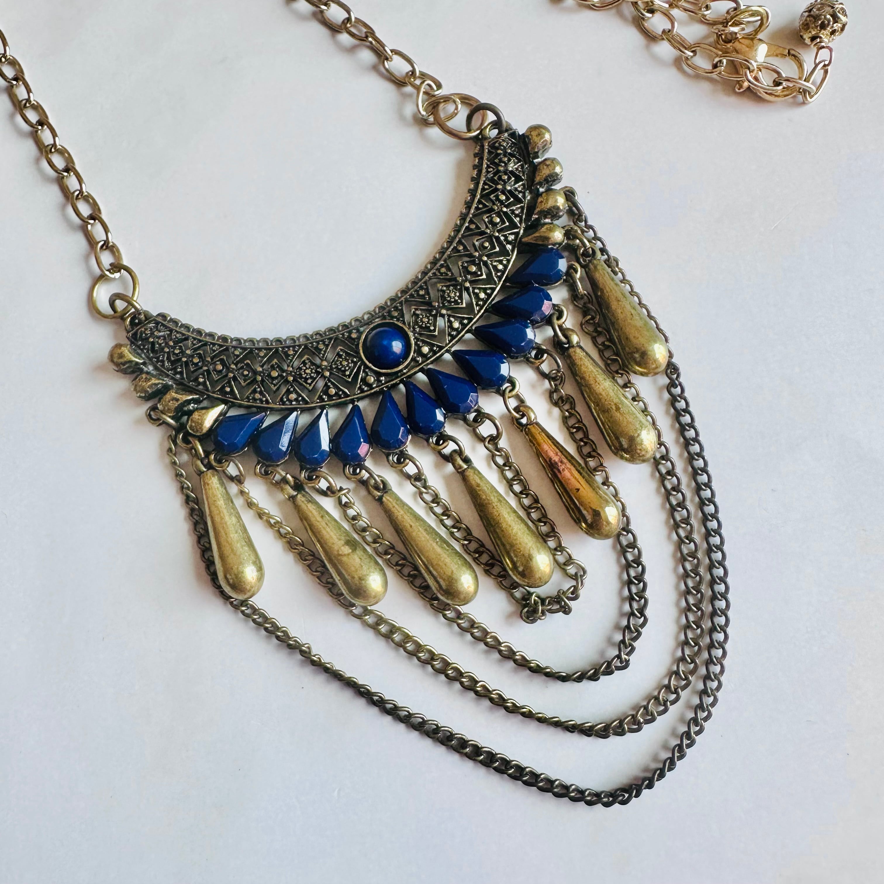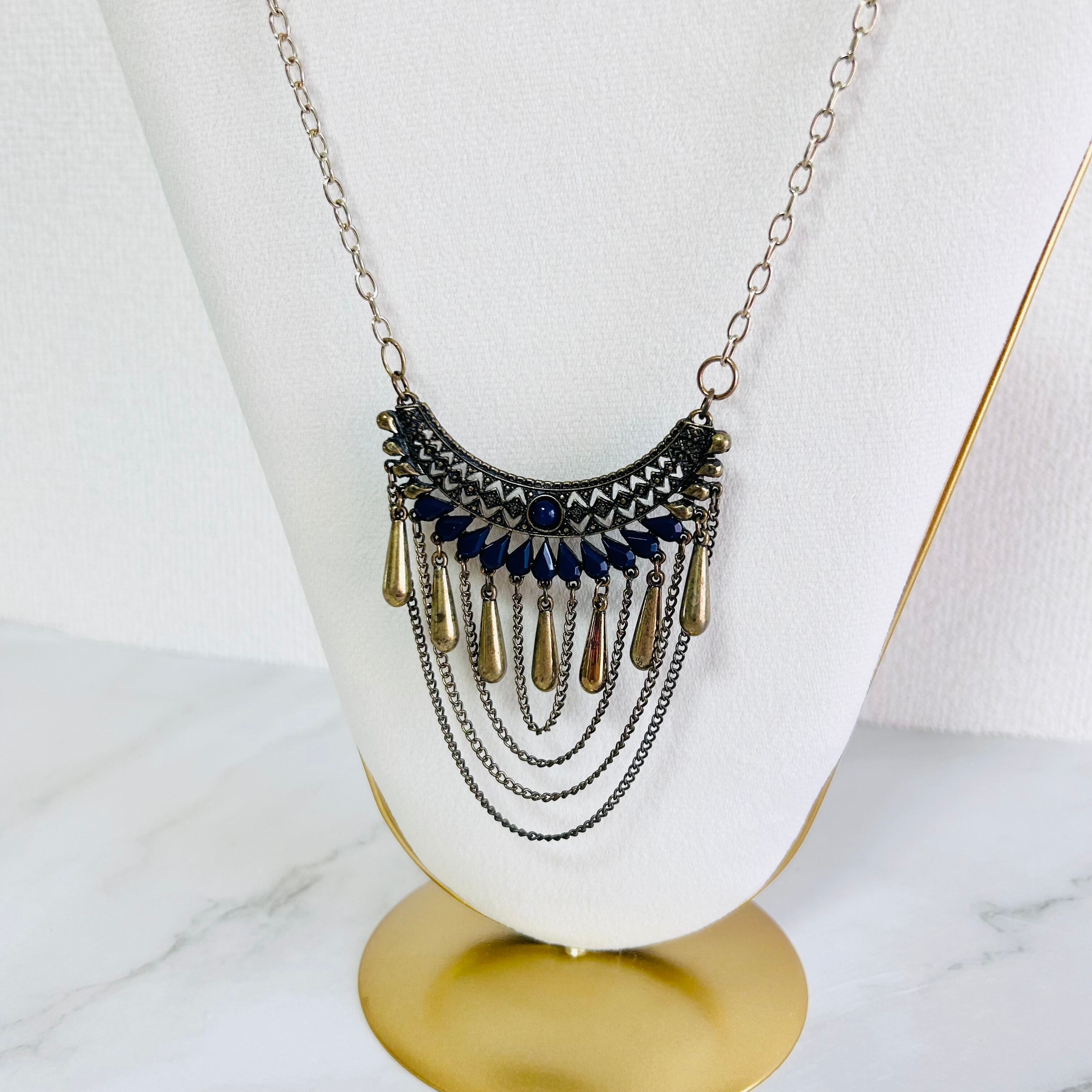 アンティークゴールド調のプレートパーツに、艶やかなネイビーのパーツとゴールドのティアドロップパーツを組み合わせたネックレスです。