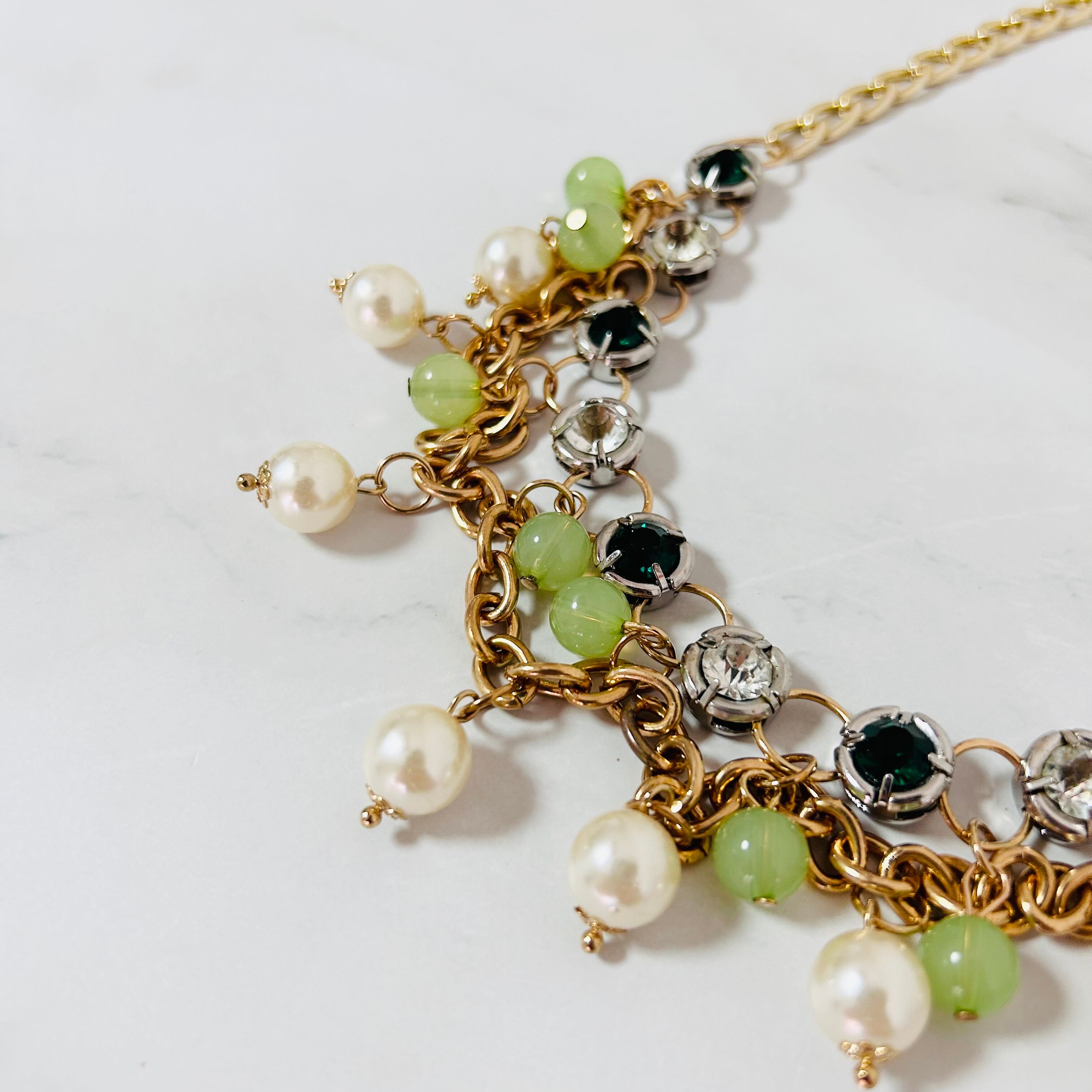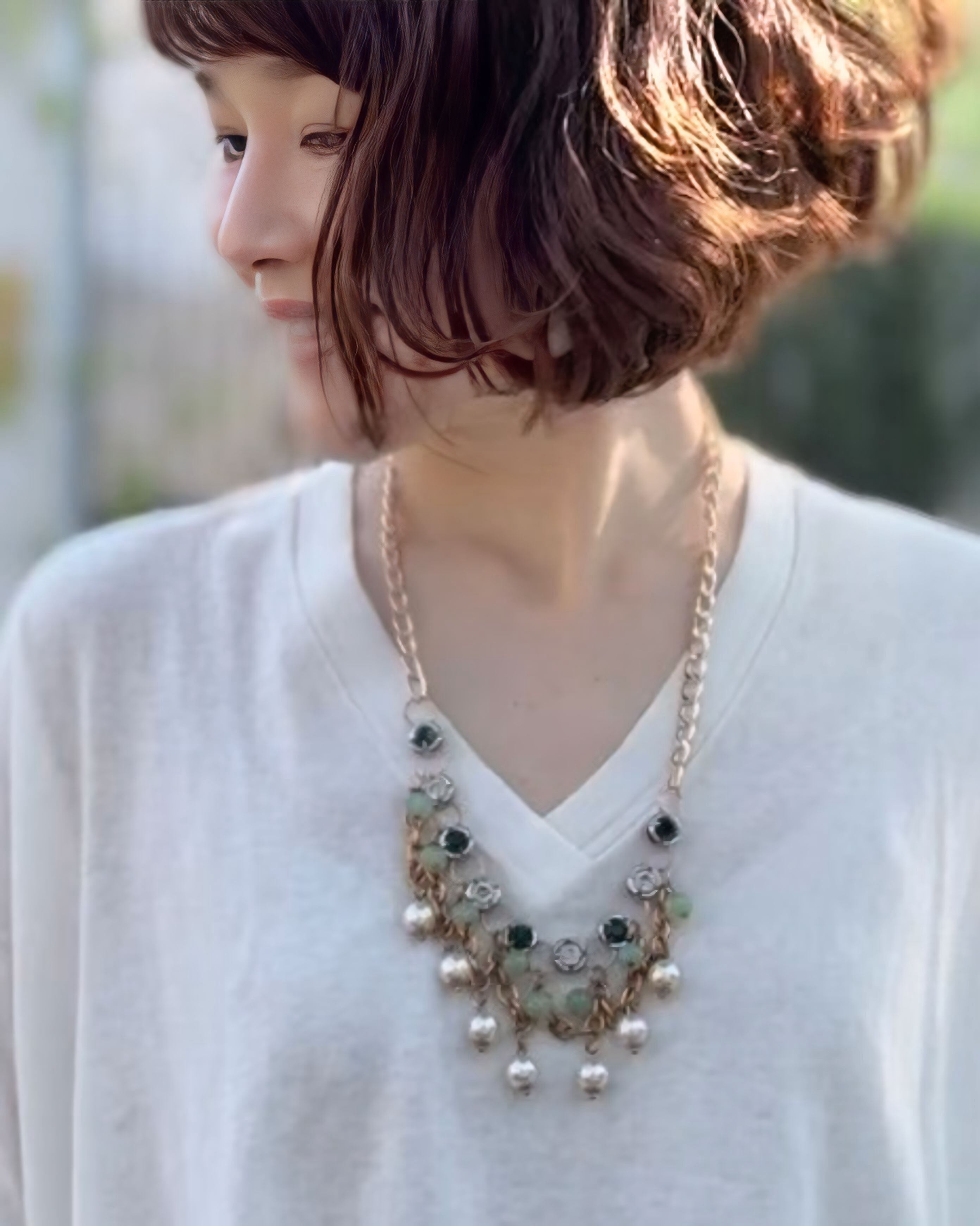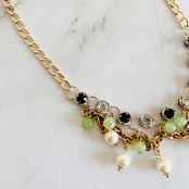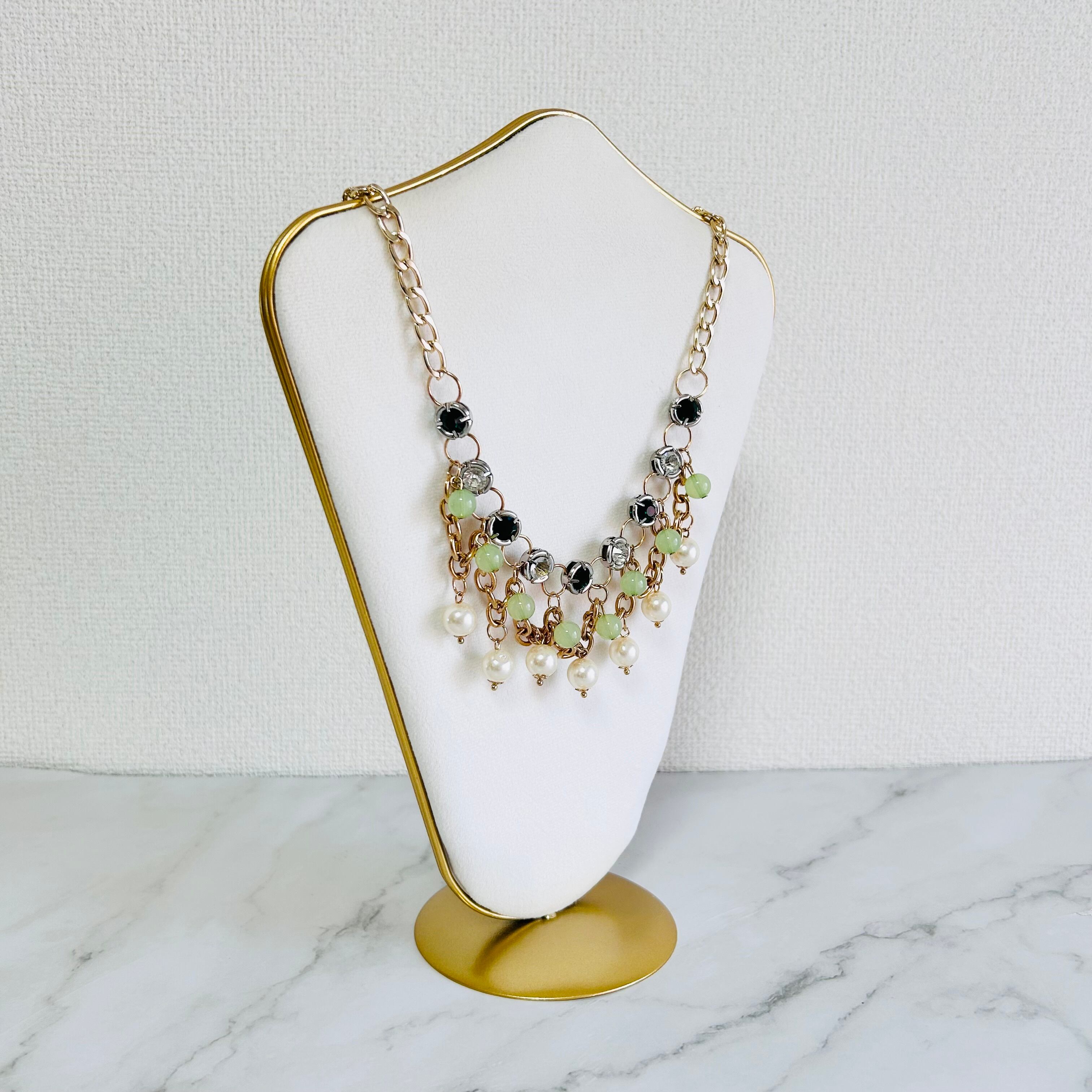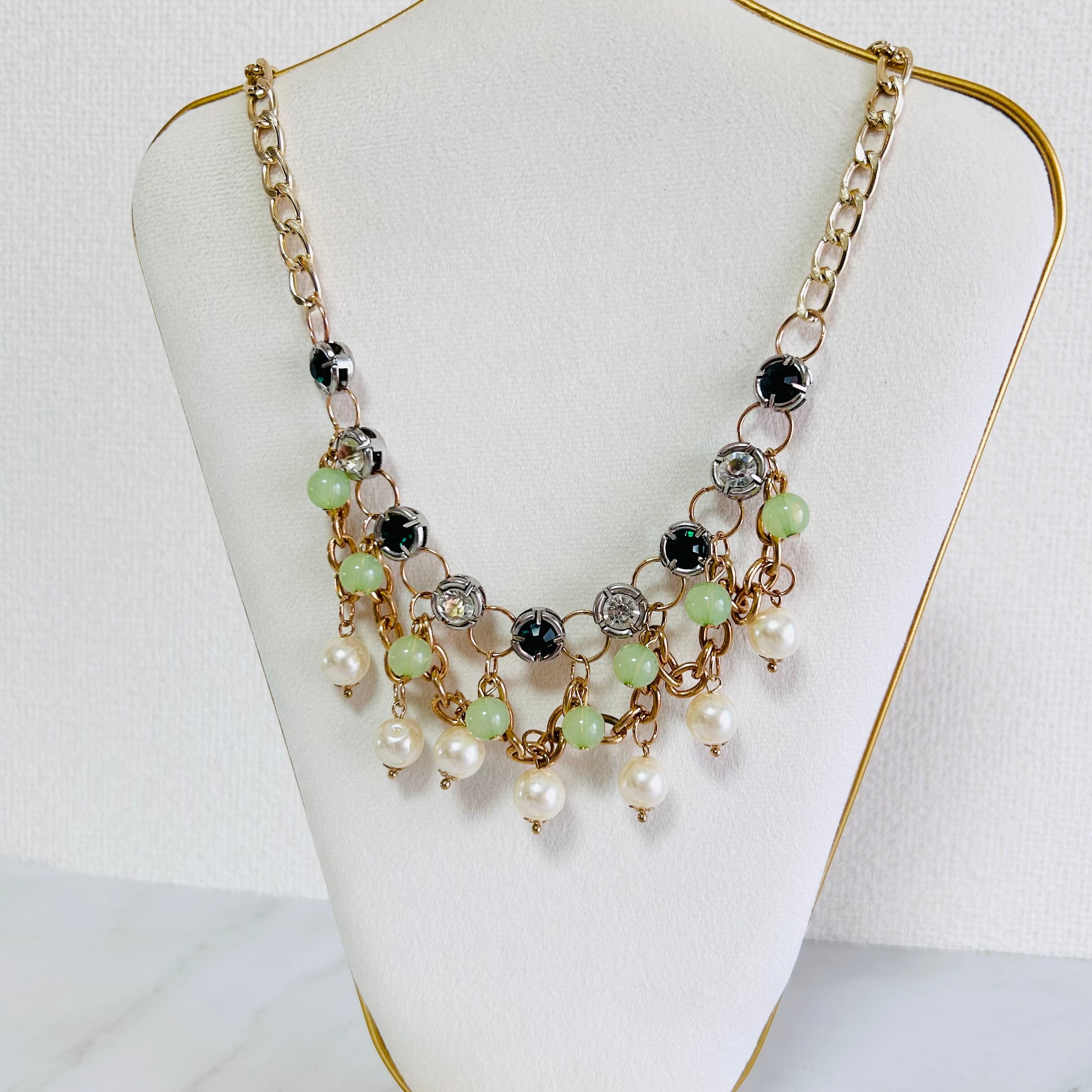 柔らかく輝くライトグリーンのビーズ、深みのあるグリーンクリスタル、上品な艶のパールパーツをゴールドチェーンに組み合わせたネックレスです。