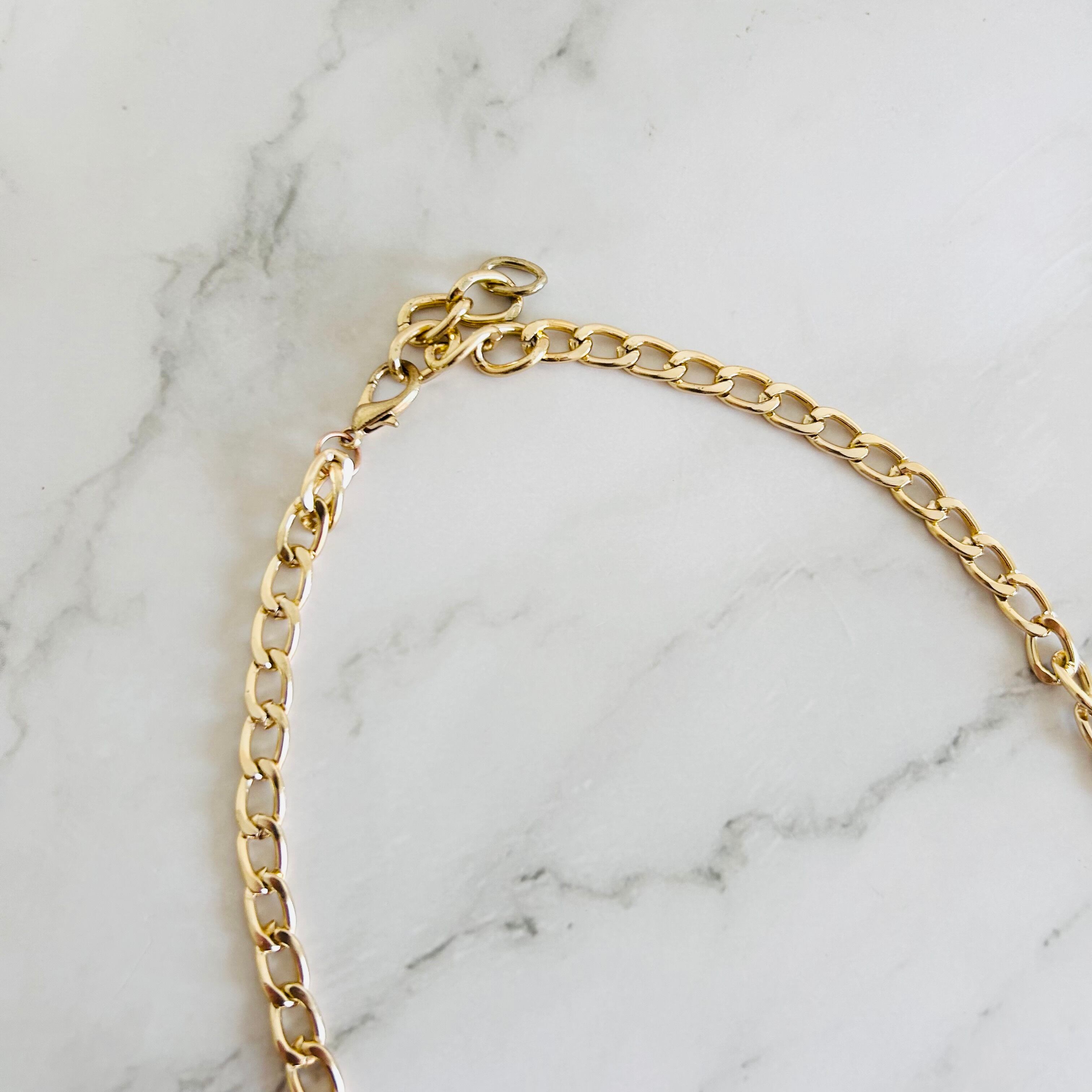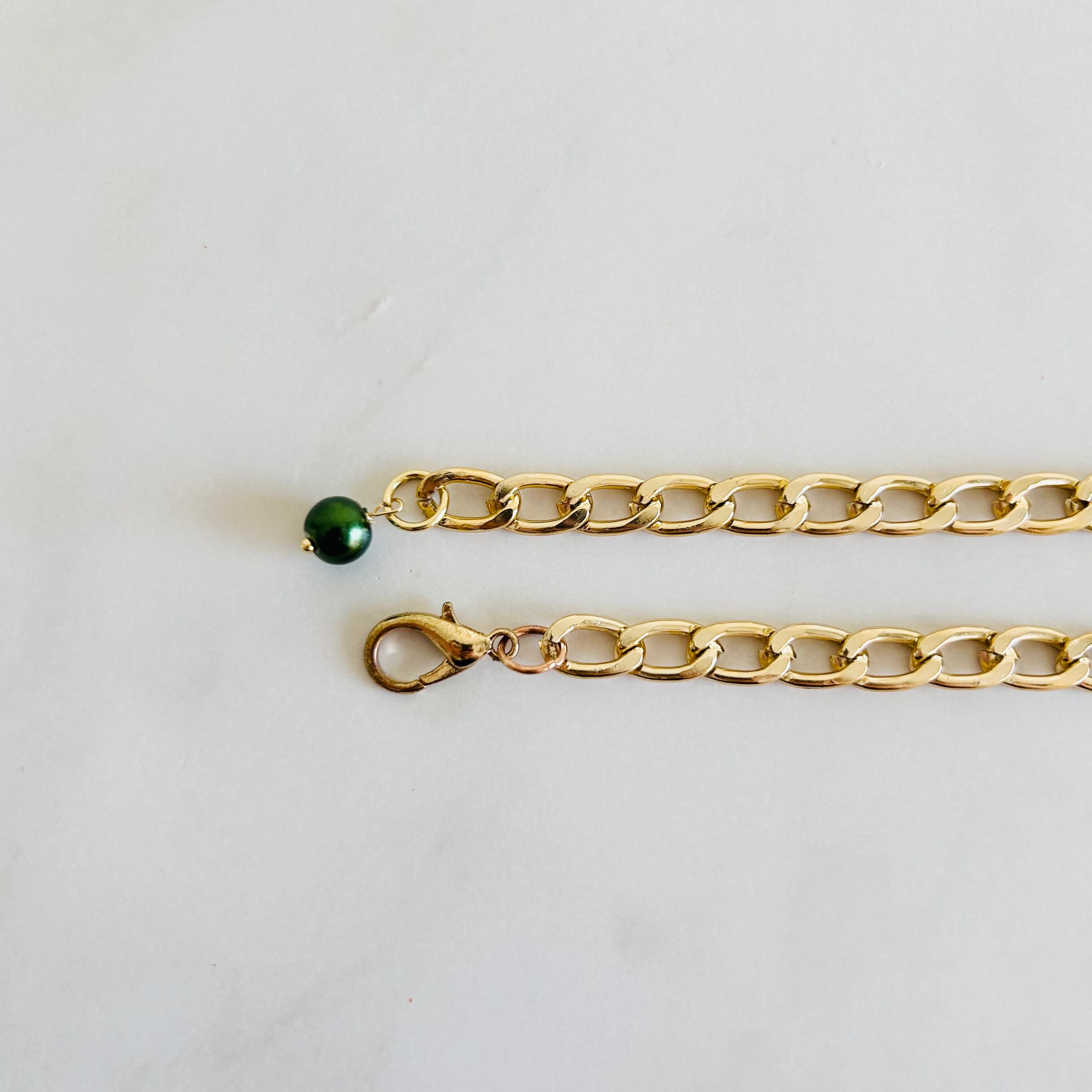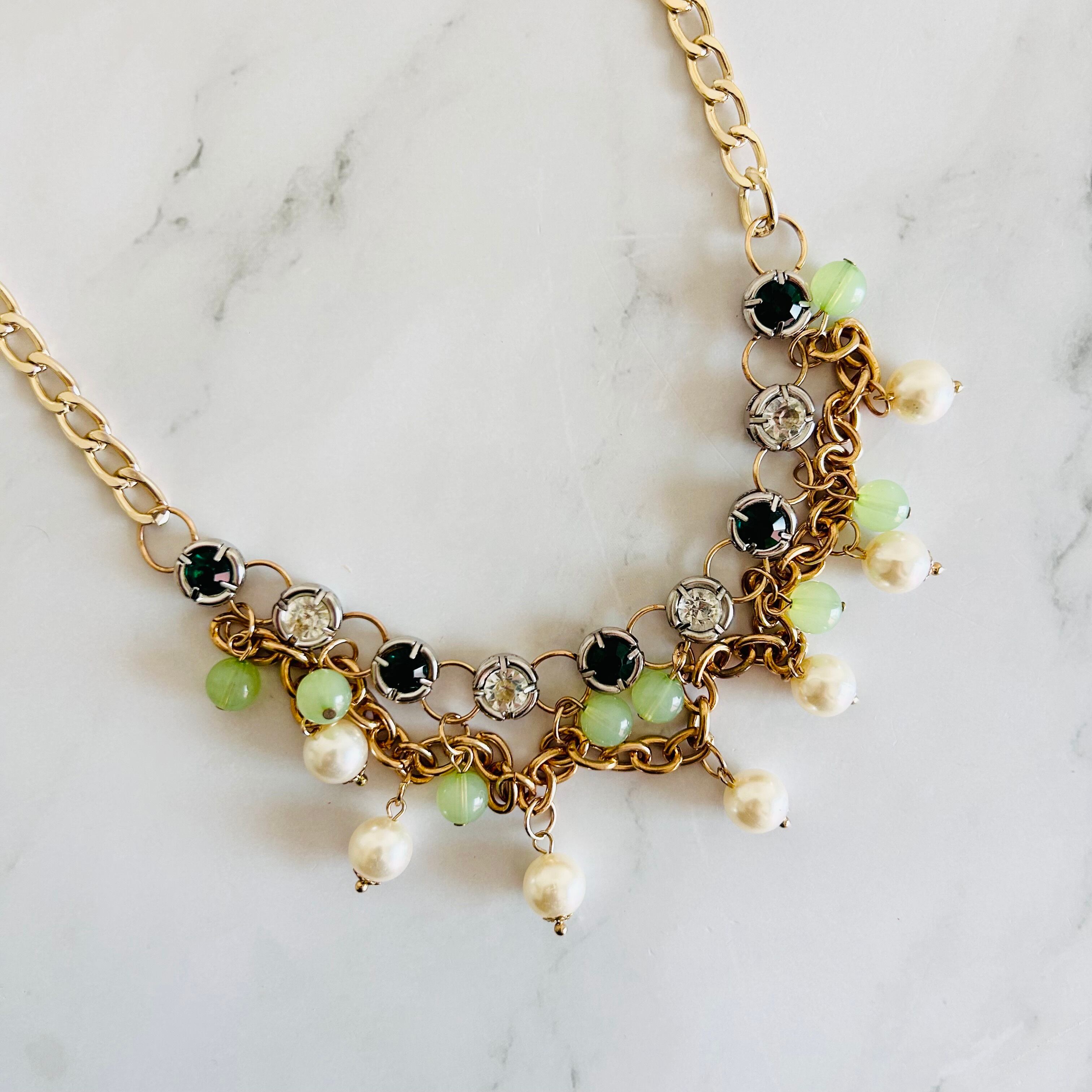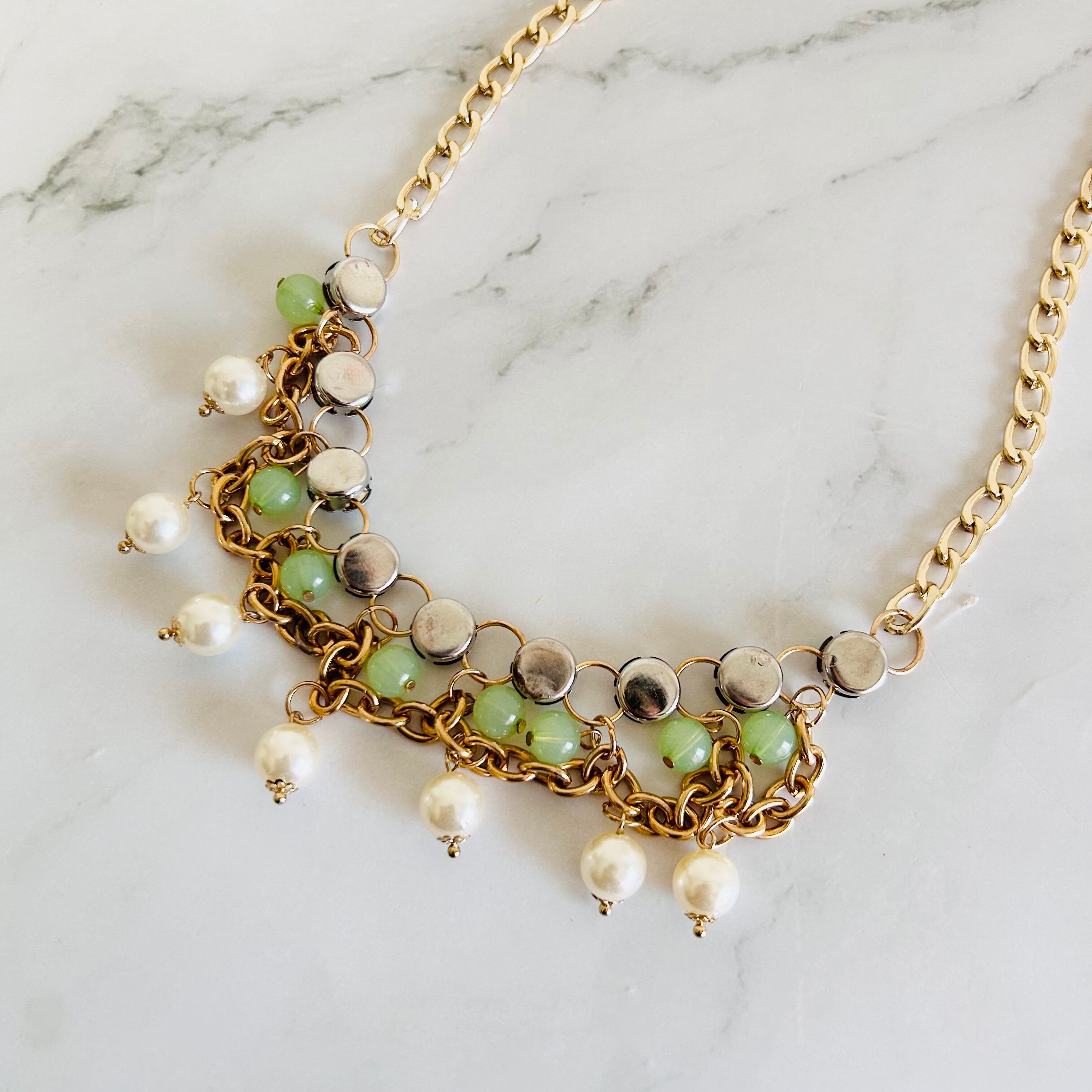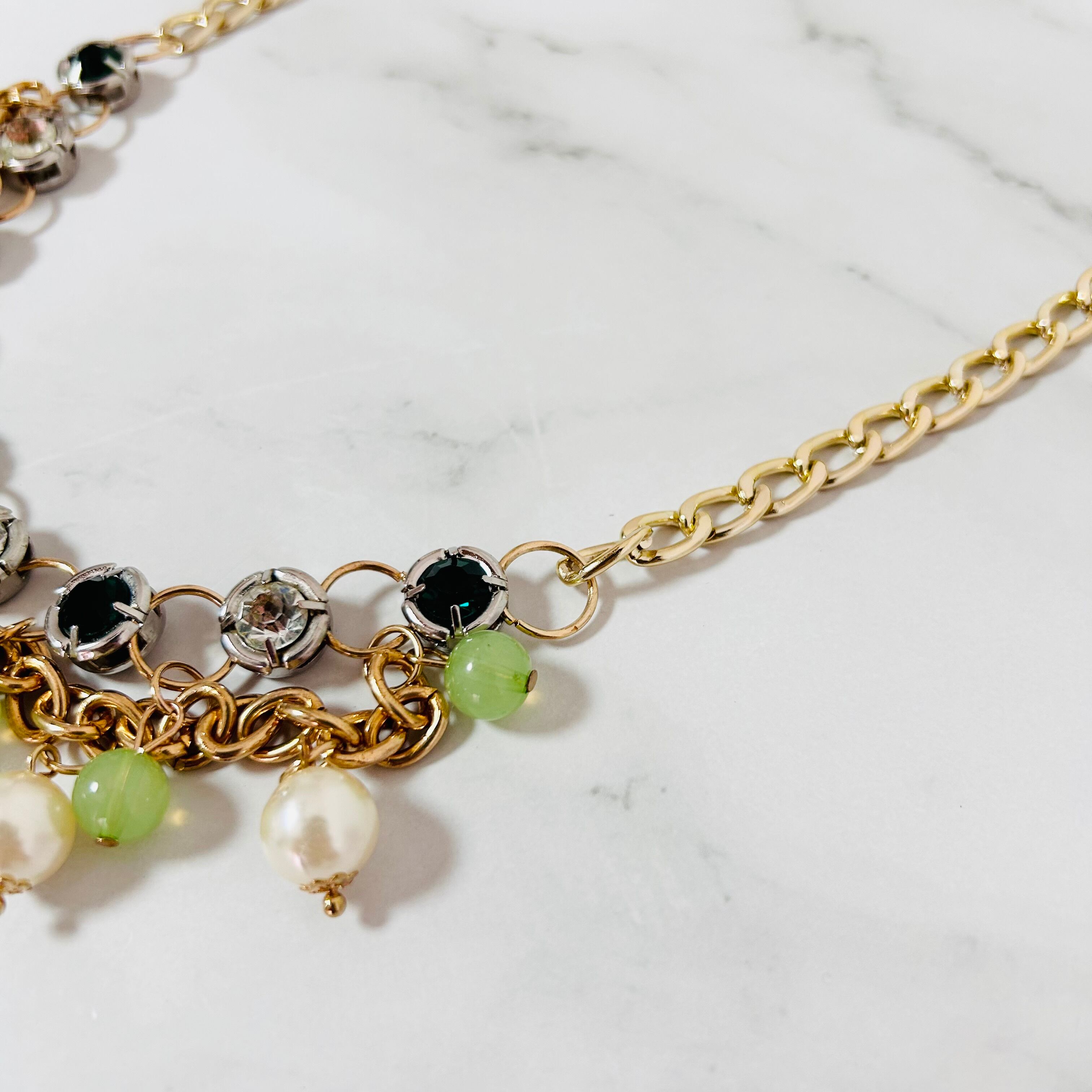 柔らかく輝くライトグリーンのビーズ、深みのあるグリーンクリスタル、上品な艶のパールパーツをゴールドチェーンに組み合わせたネックレスです。