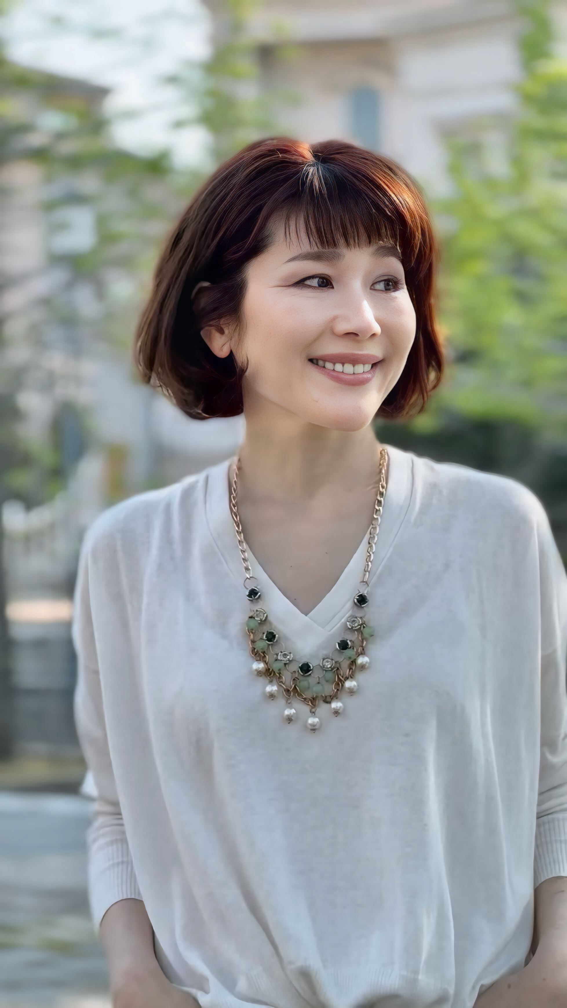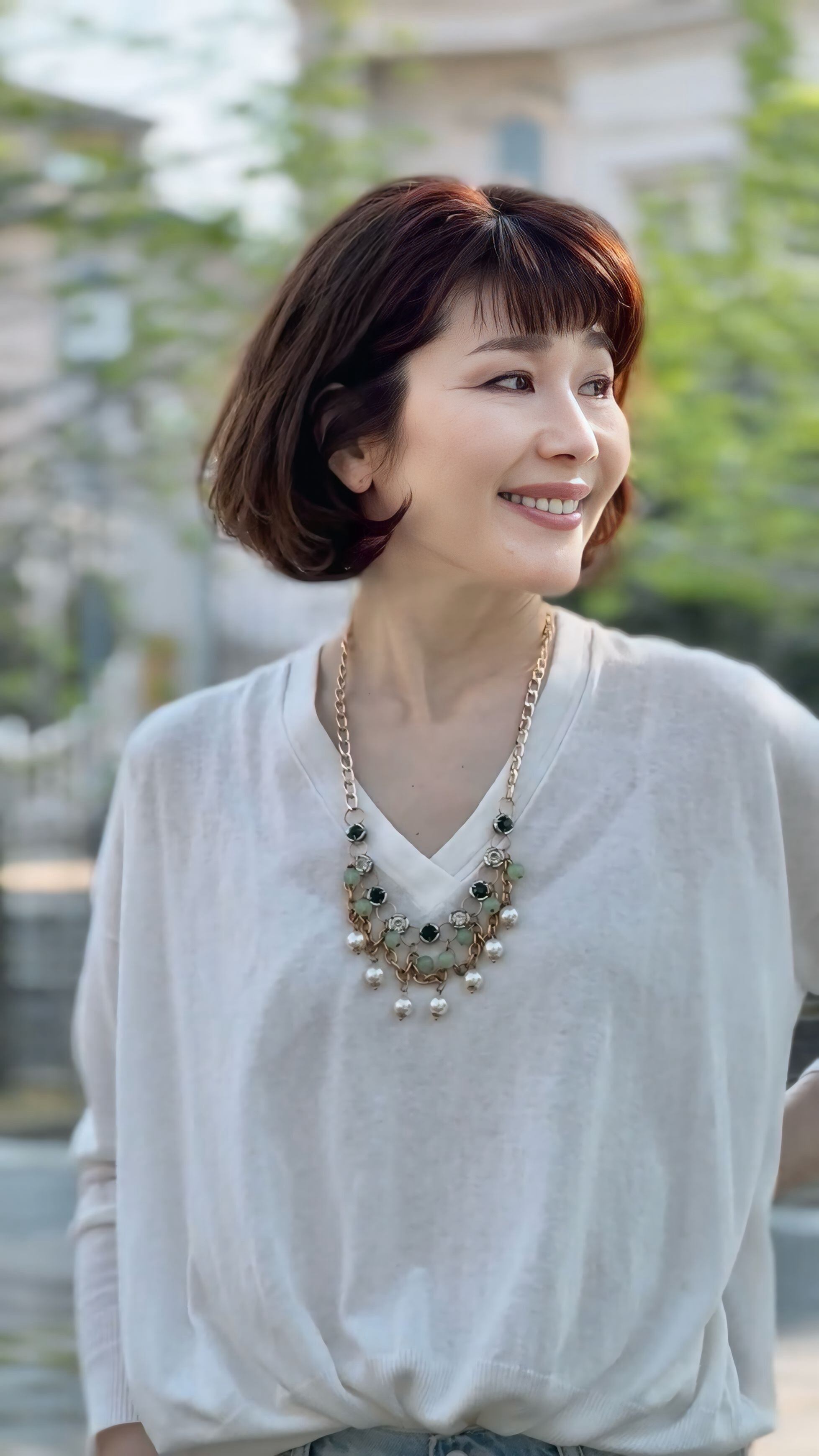 春夏は白やベージュのトップスに、秋冬はモスグリーンやネイビーと合わせて季節感のある装いに仕上がります。