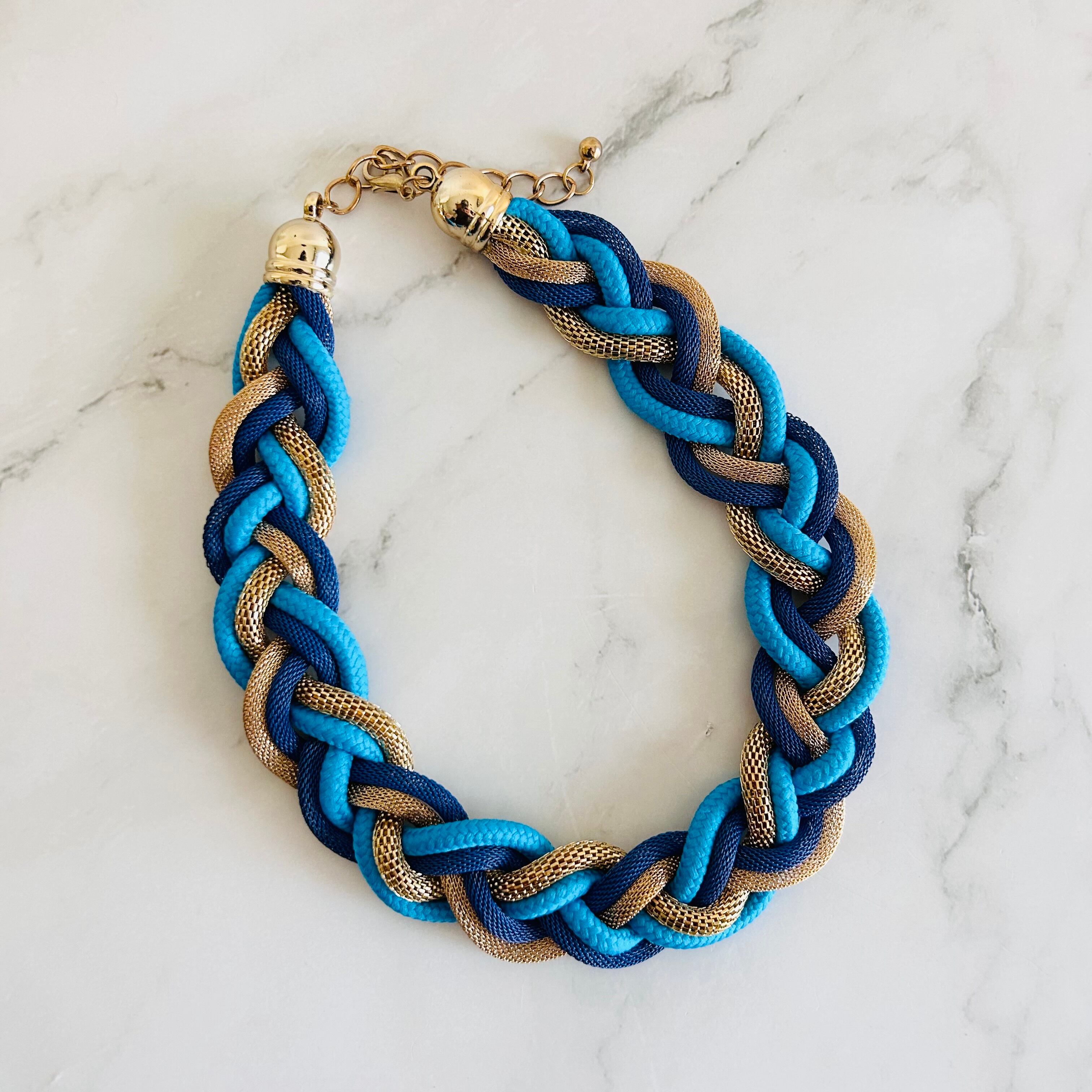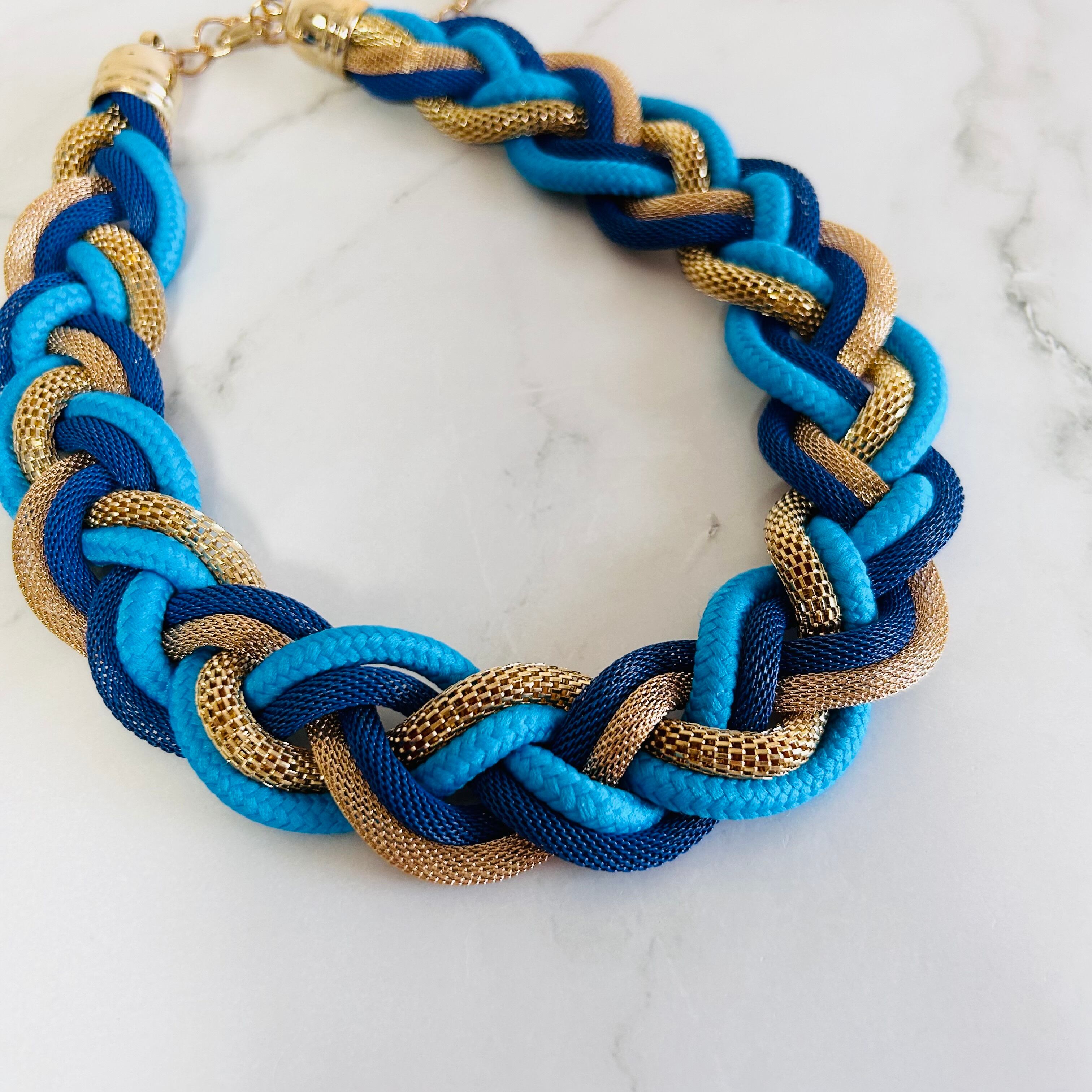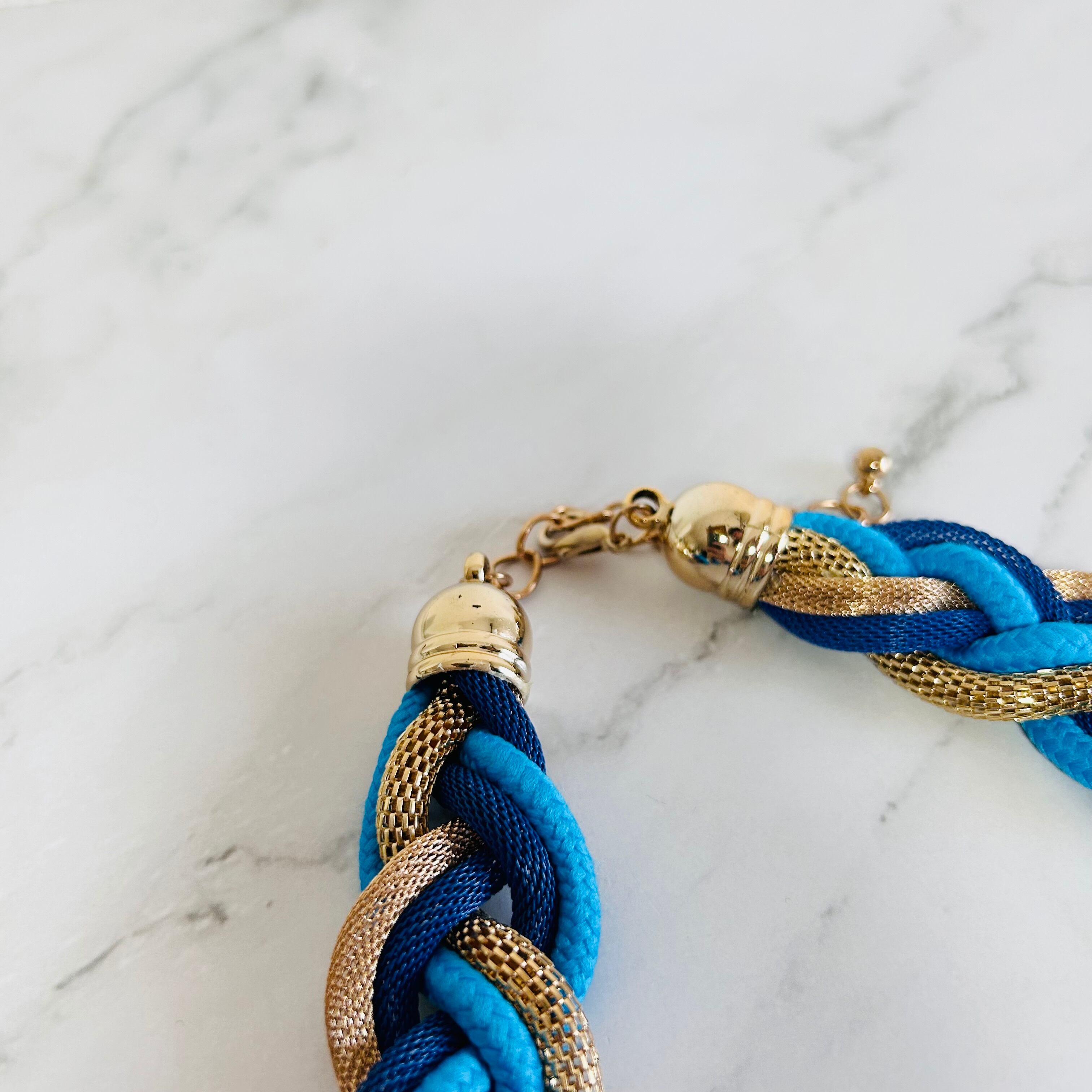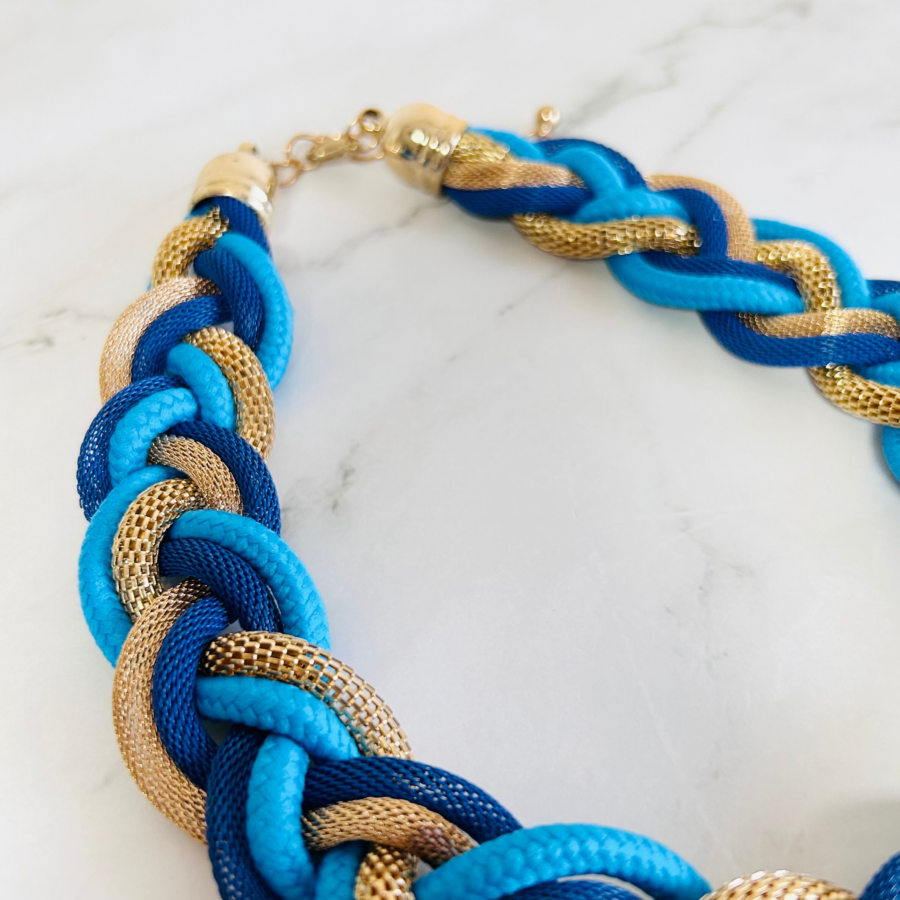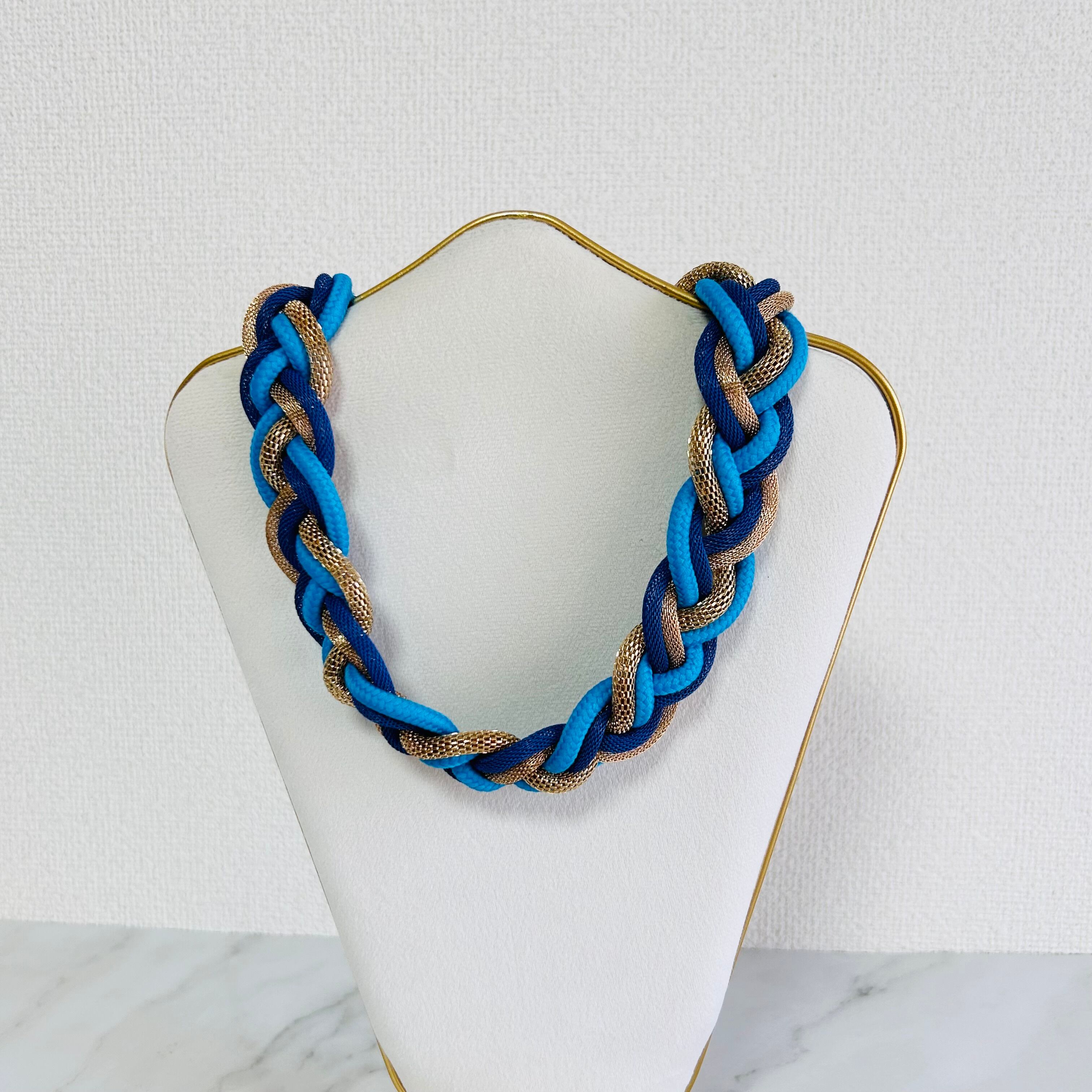 鮮やかなブルー系コードとメッシュ調のゴールドチューブを三つ編みにした、立体感あふれるデザイン。