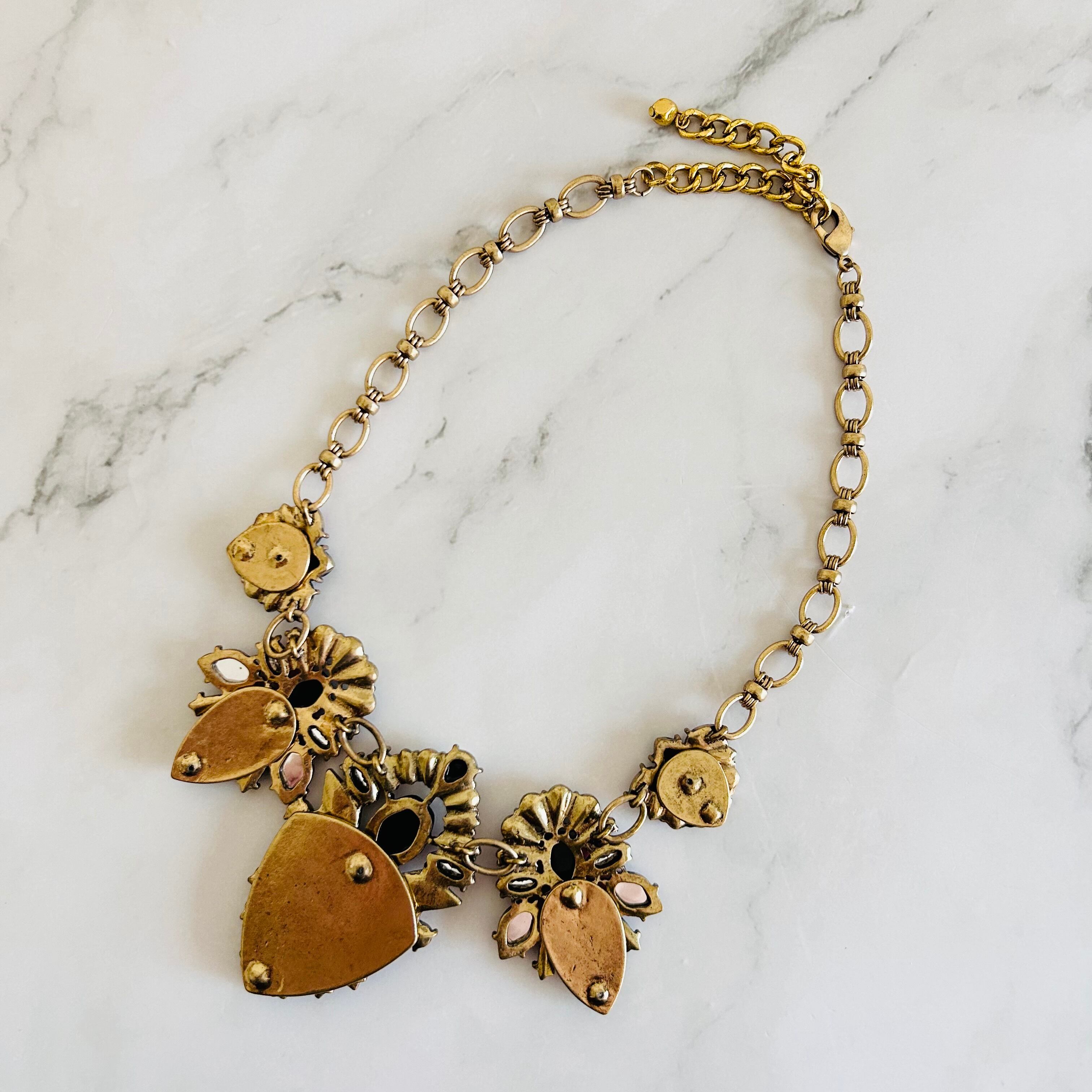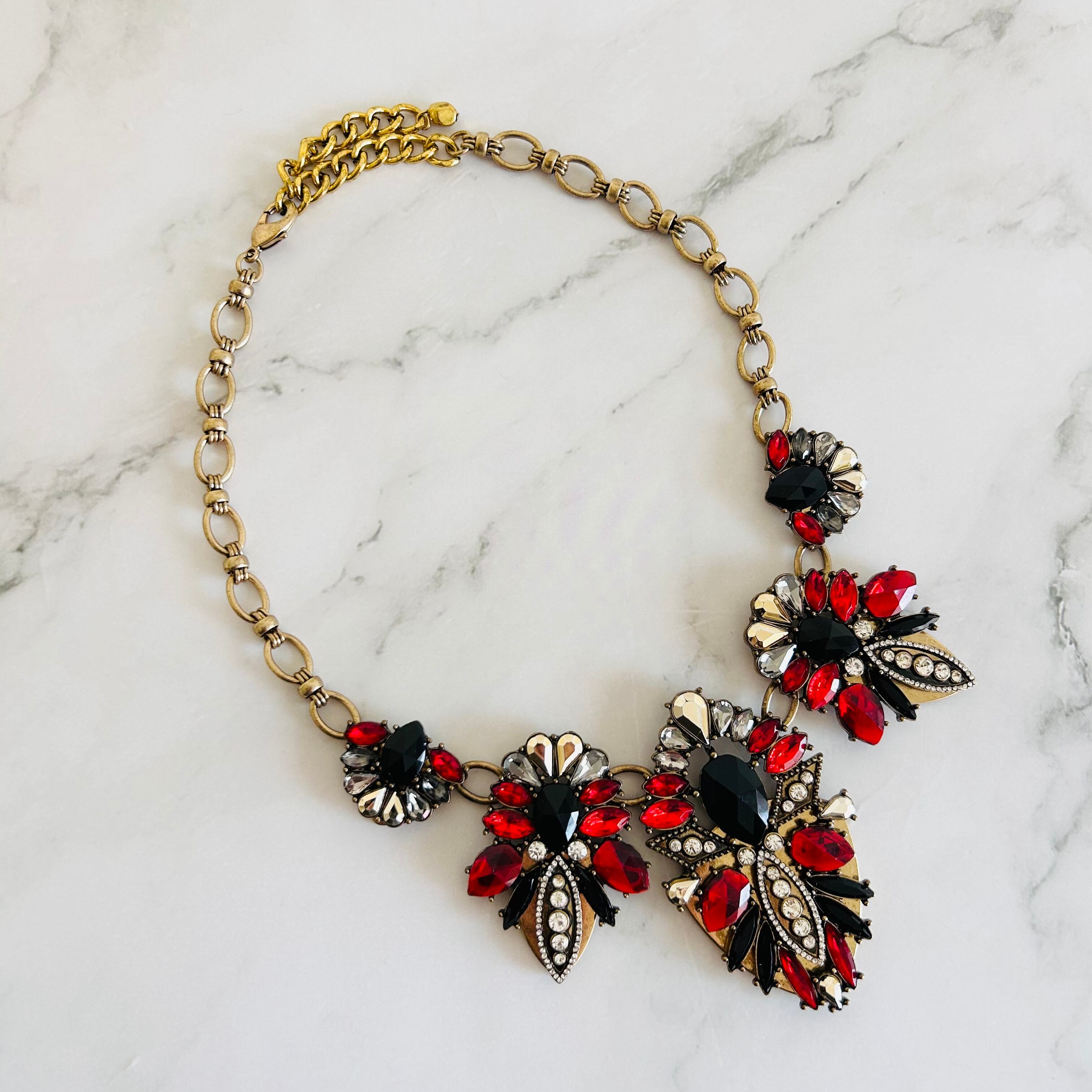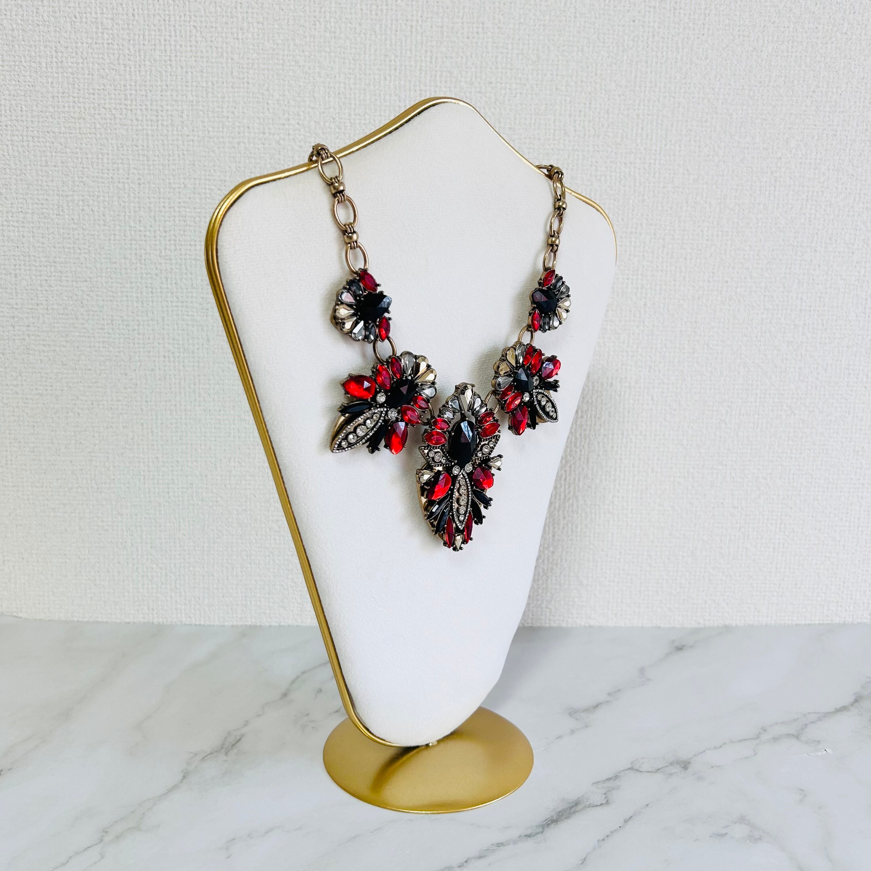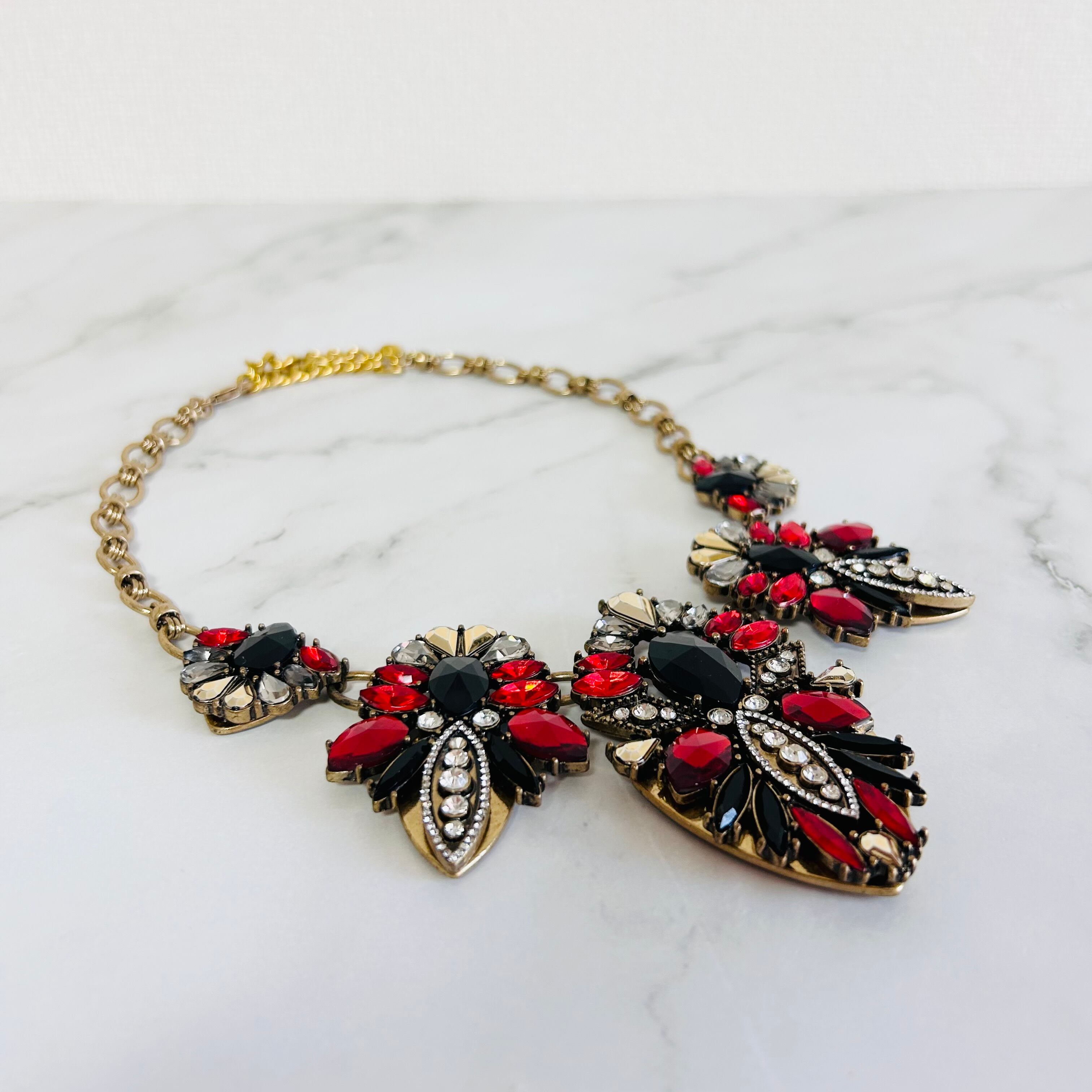 メタリックなゴールドチェーンに、深紅のラインストーンとブラックビジューが贅沢にあしらわれたドラマティックなネックレスです。
