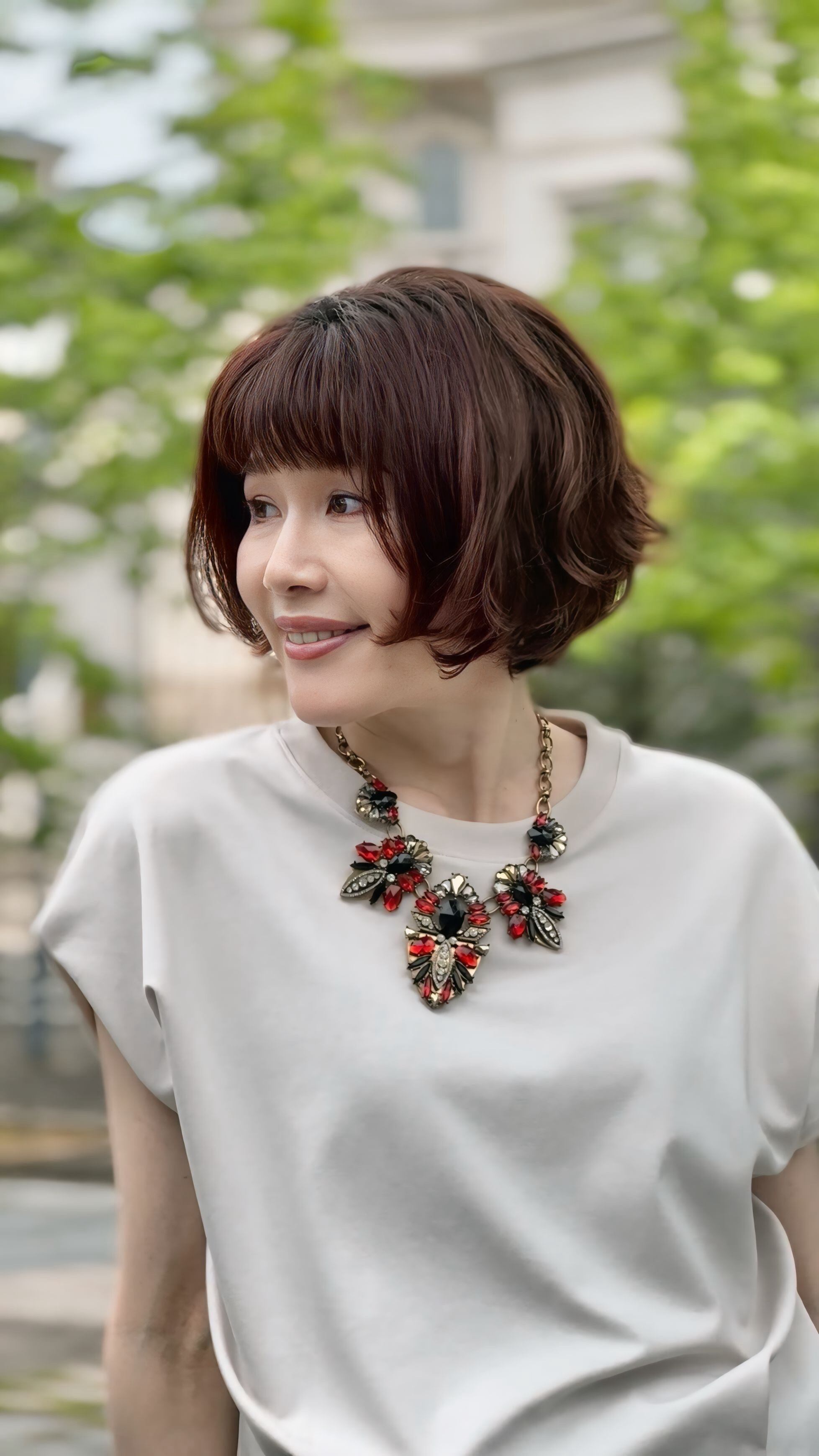 シンプルなブラックカットソーやシャツに合わせるだけで、一気にラグジュアリーな雰囲気に仕上がります☆