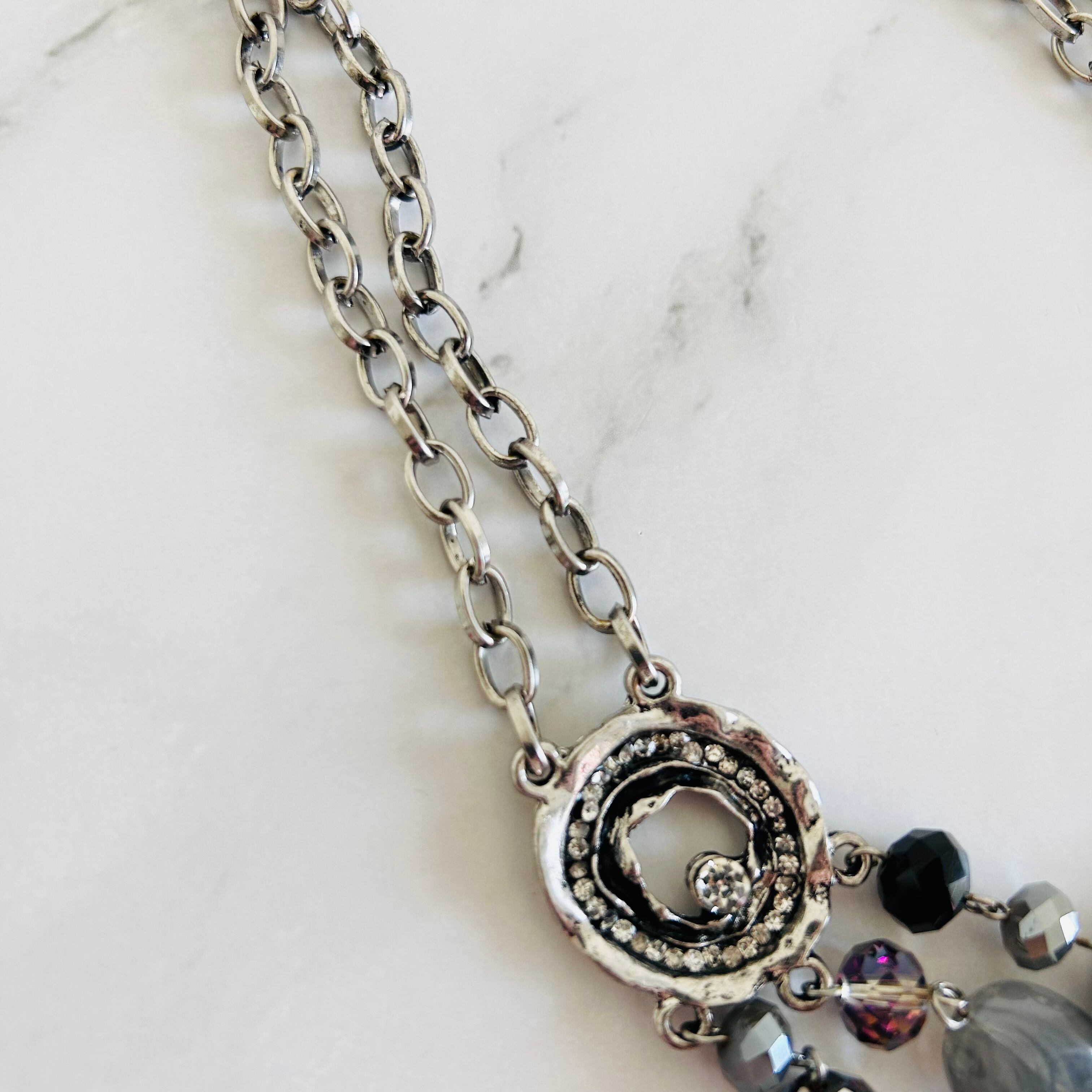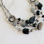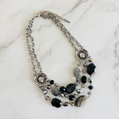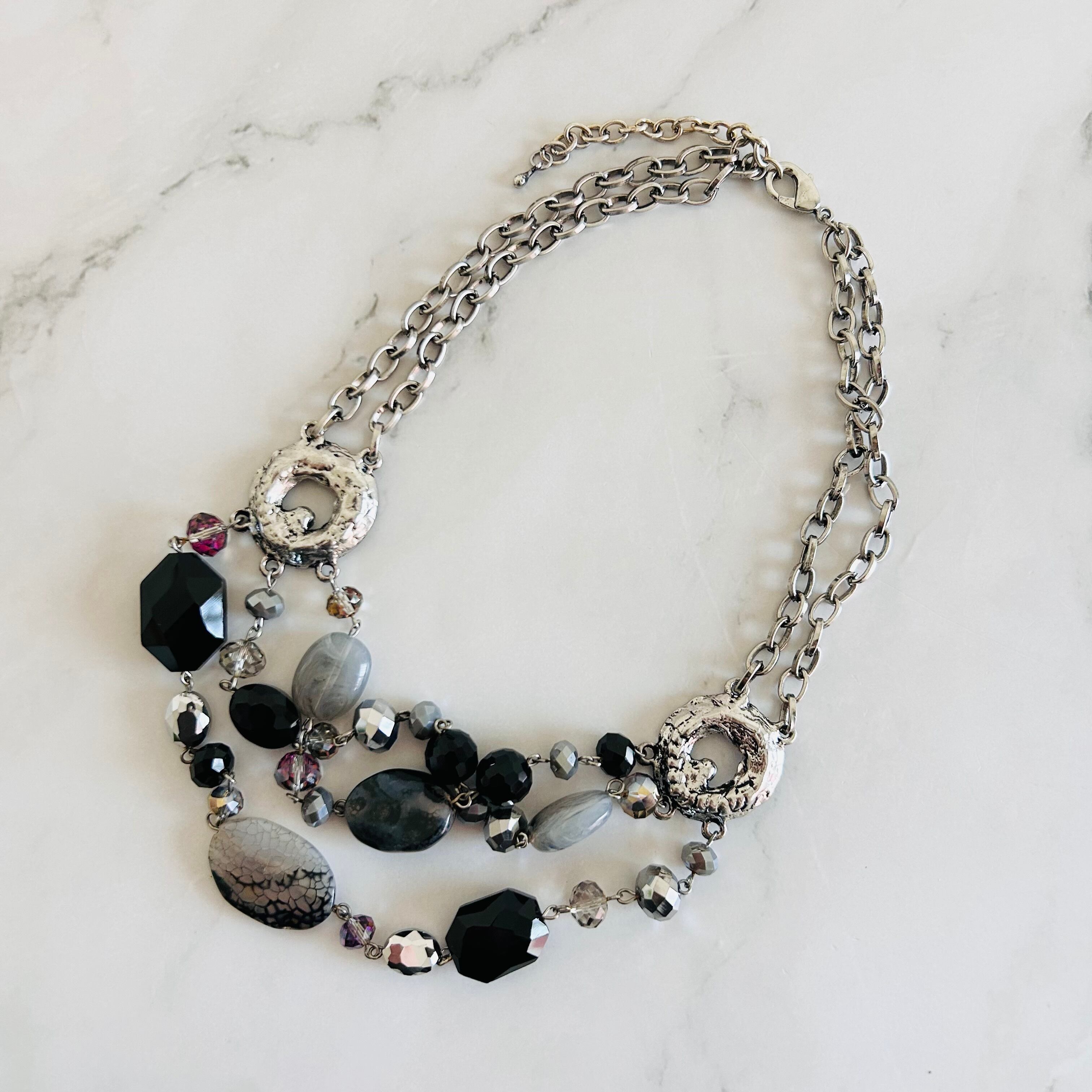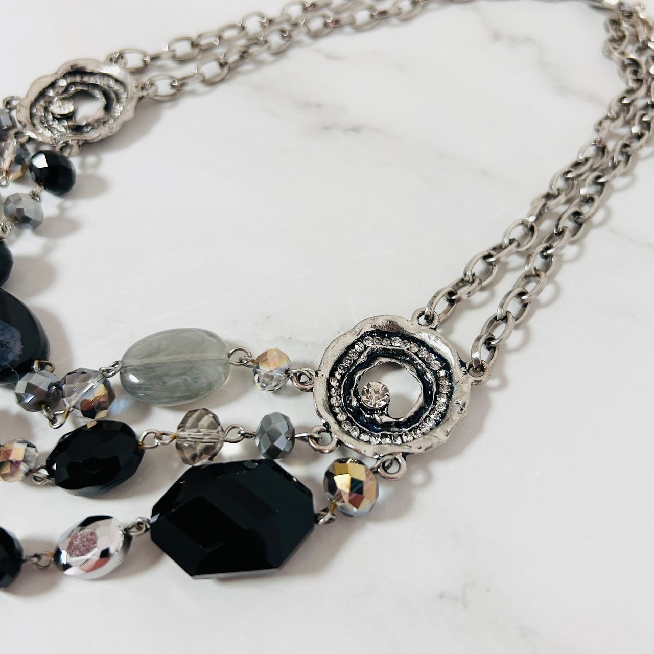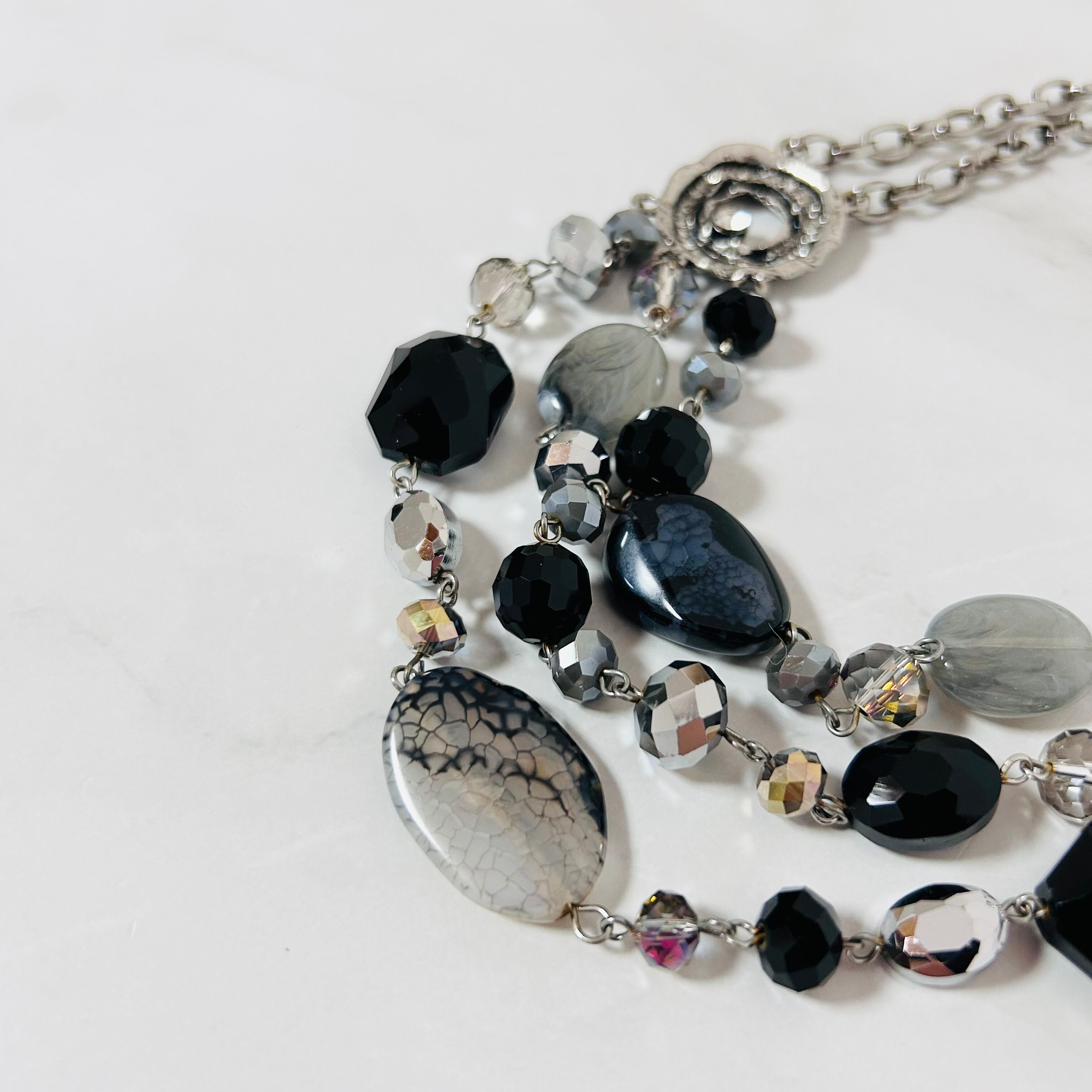 艶やかなブラックのクリスタルパーツ、グレーの天然石風パーツ、そして光を反射するカットガラスなどさまざまな素材が連なる、モダンで存在感のあるネックレスです。