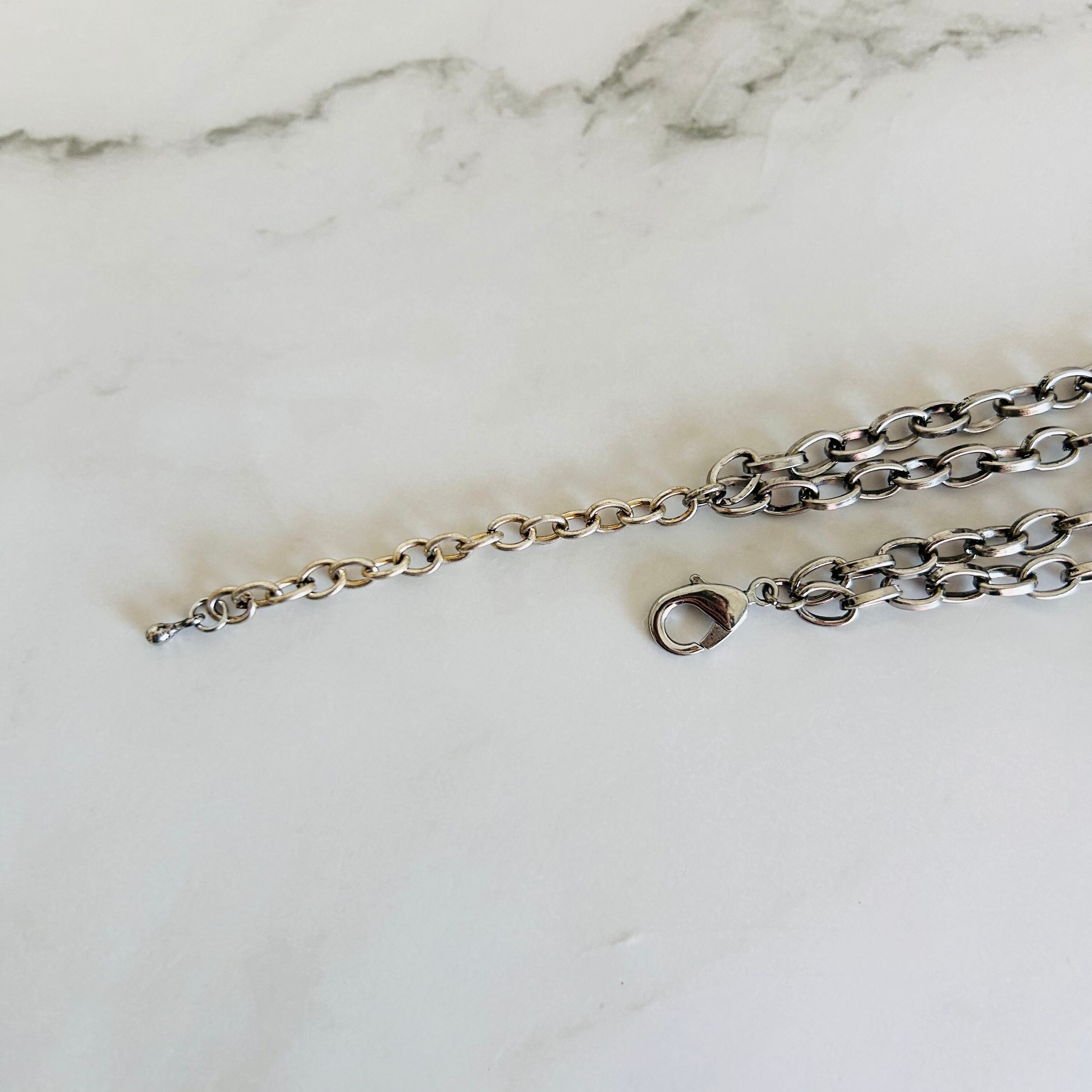 アンティークシルバーチェーンと、左右対称に配されたメタルの円形モチーフが印象的なアクセントに。