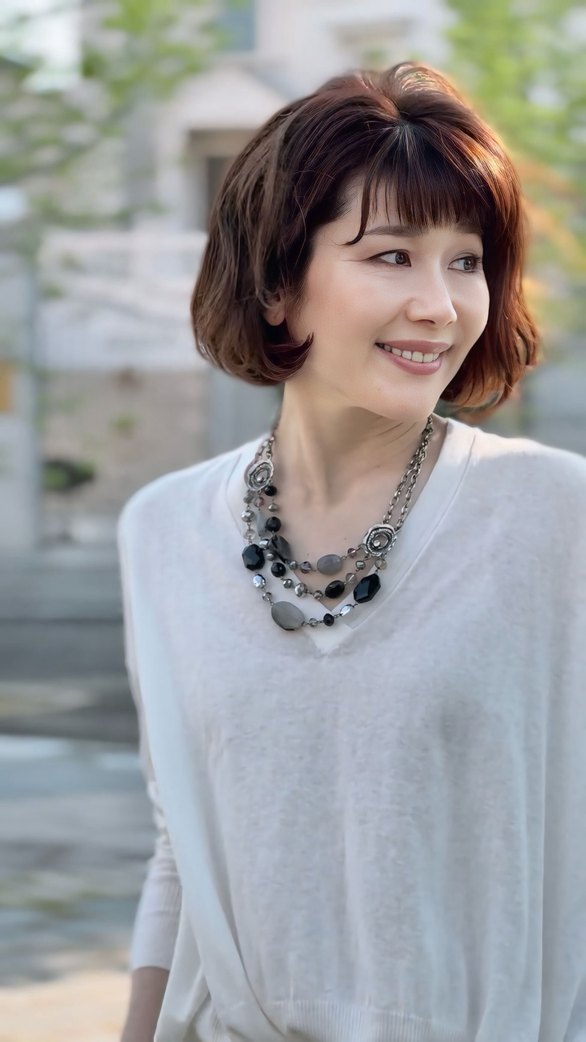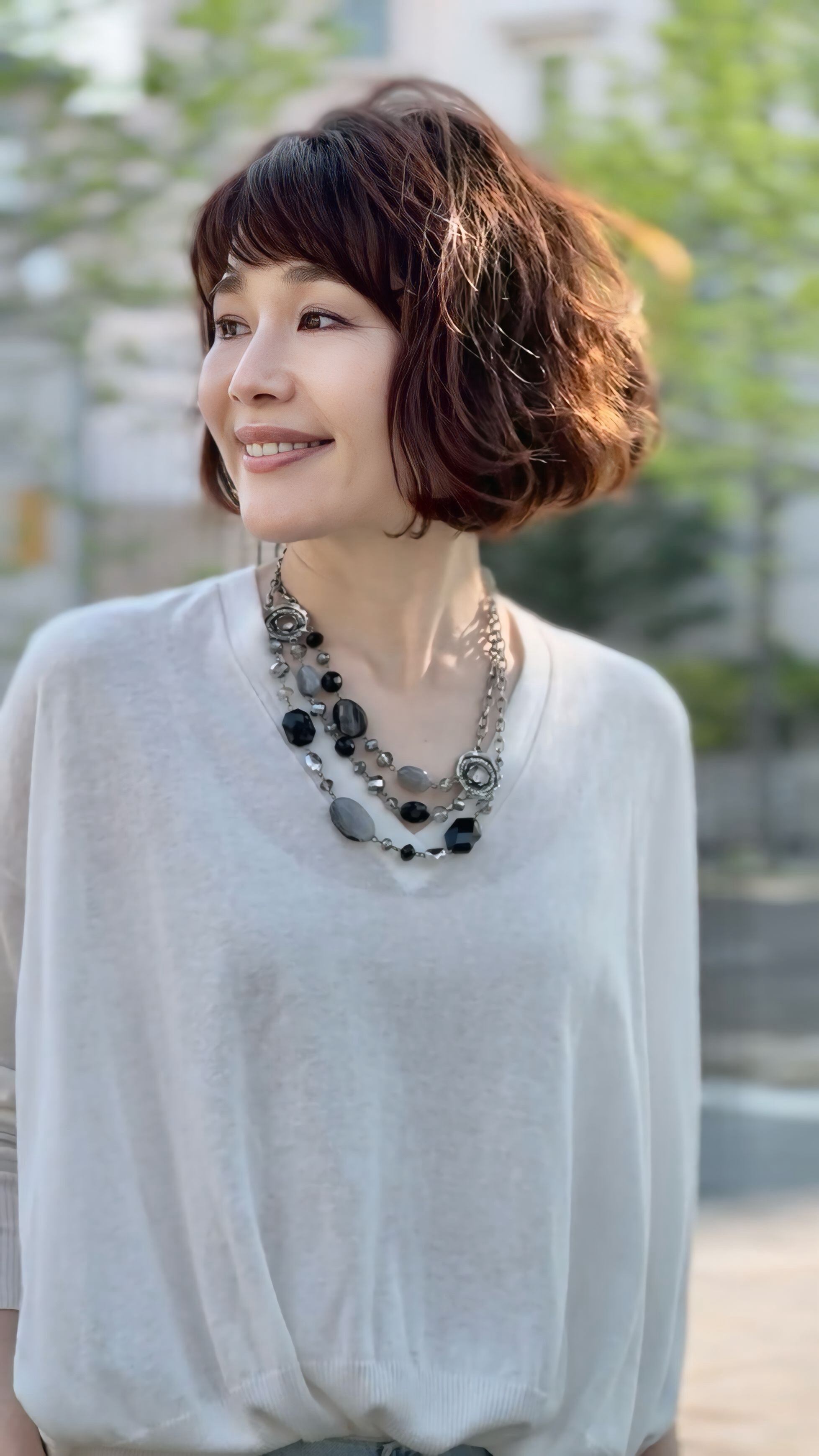モノトーンの色使いが大人の品格を演出しつつ、個性的なビーズの組み合わせが装いにリズムを添えます♪
