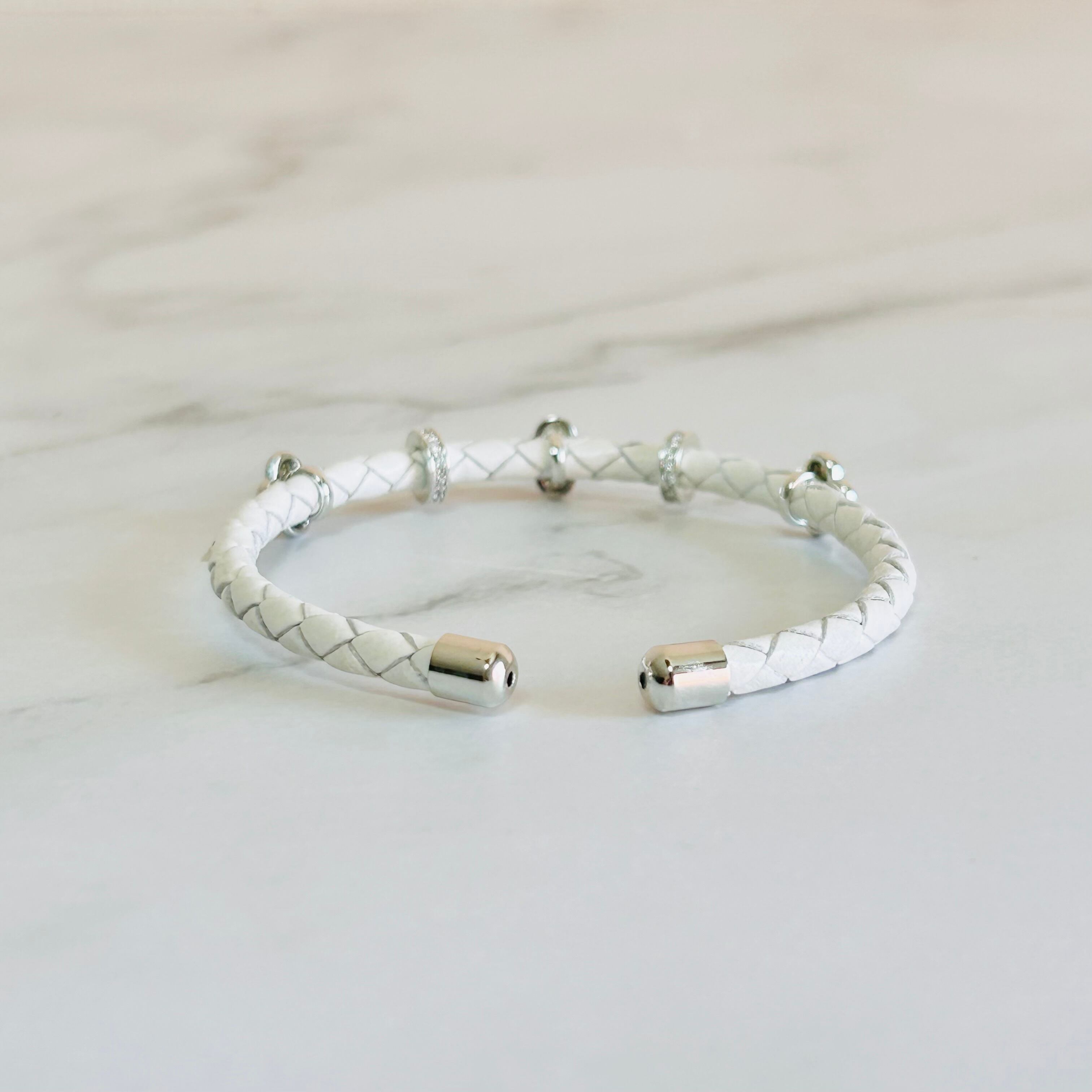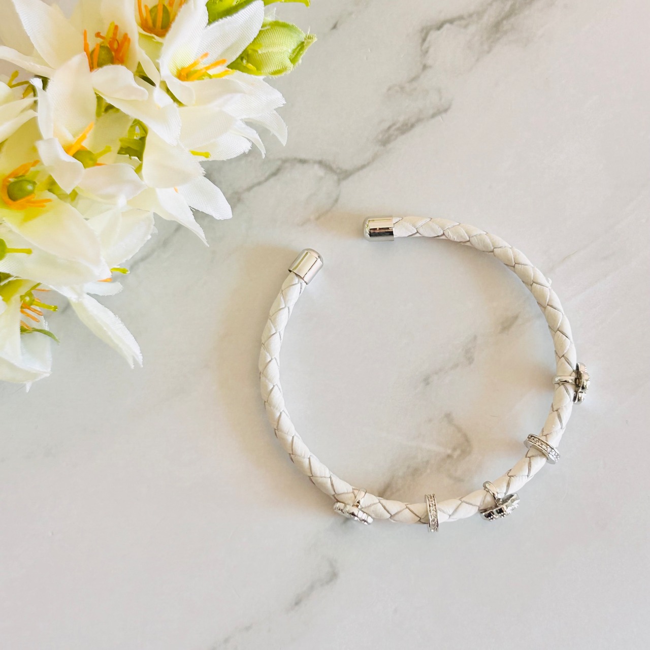 ホワイトの編み込みレザーに、キラキラと輝くフラワーモチーフやリングパーツをあしらった上品なデザインです。
