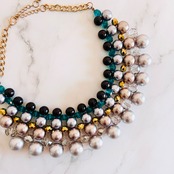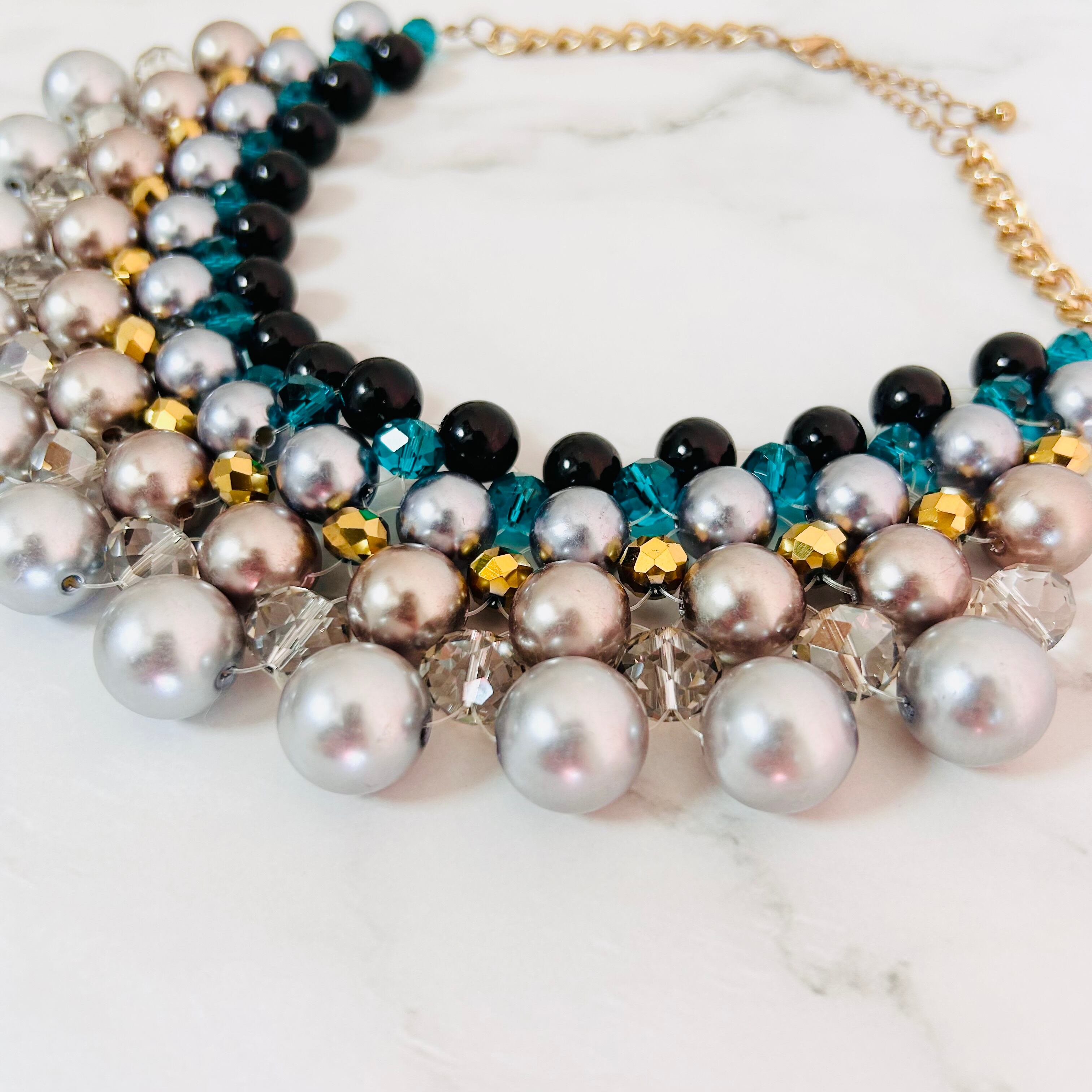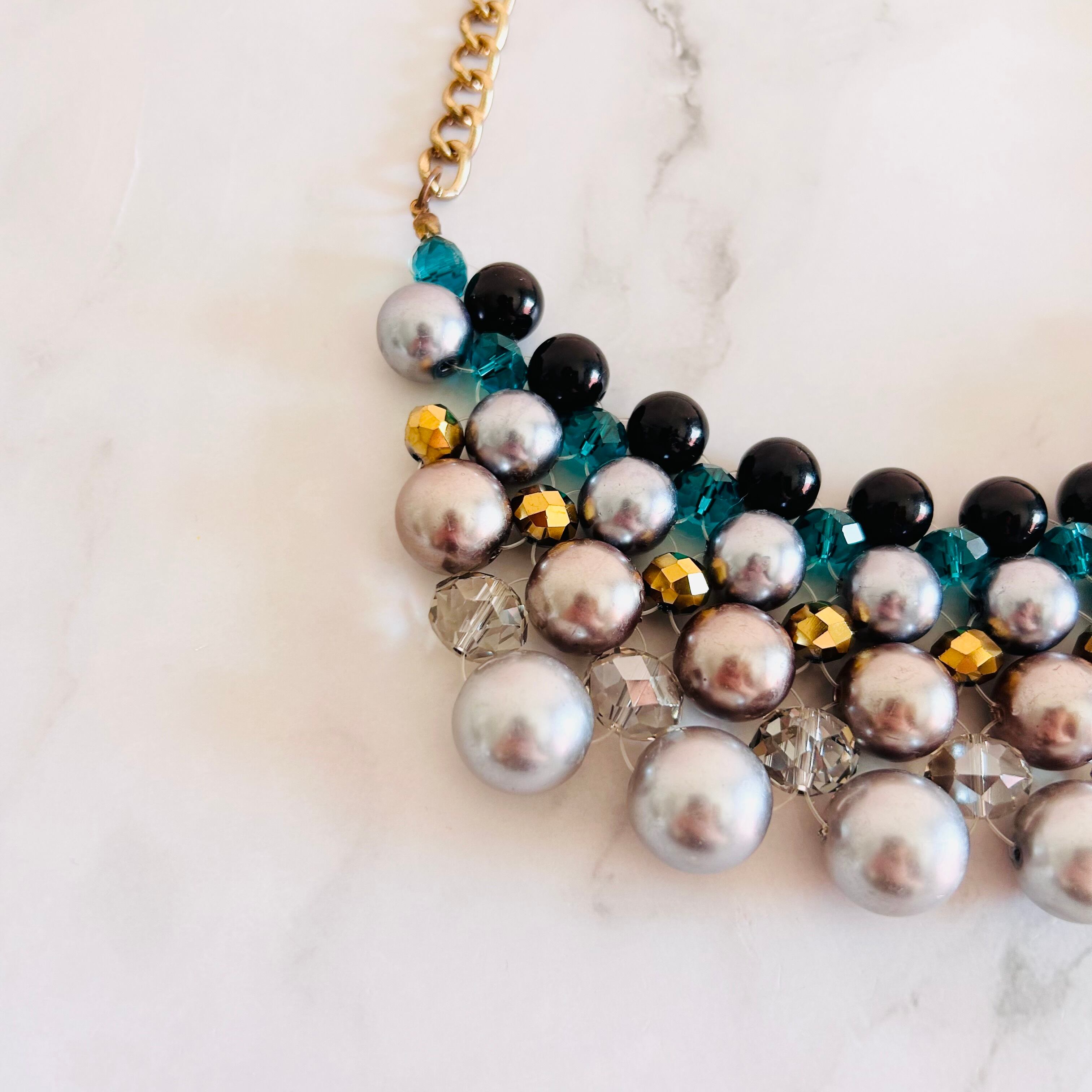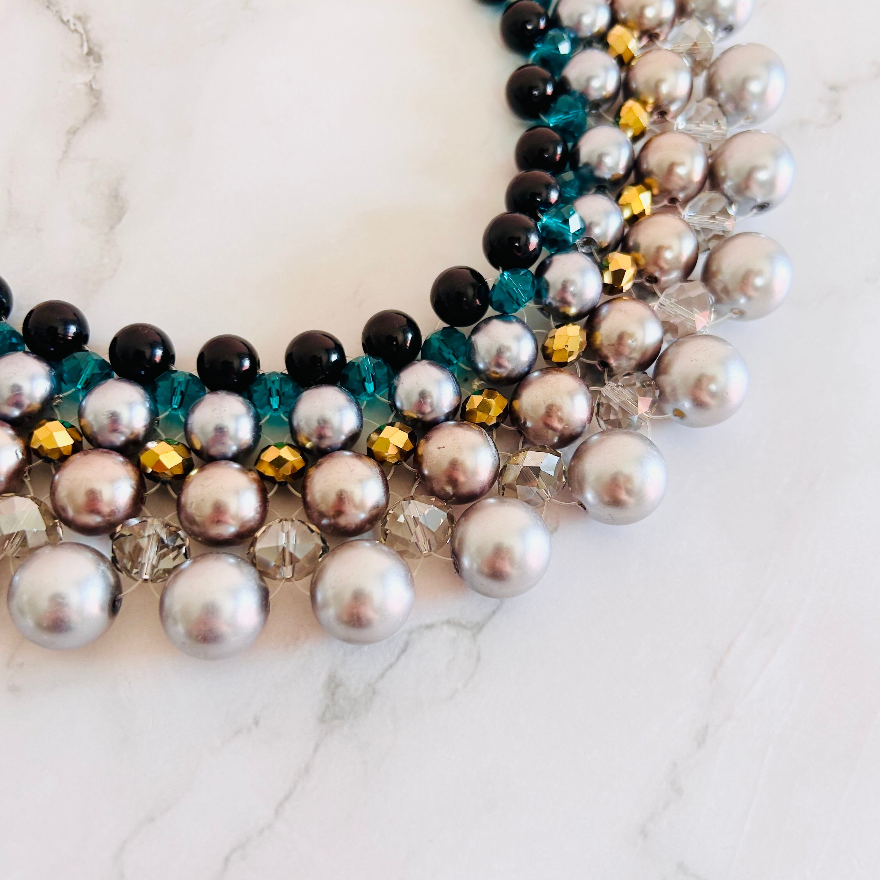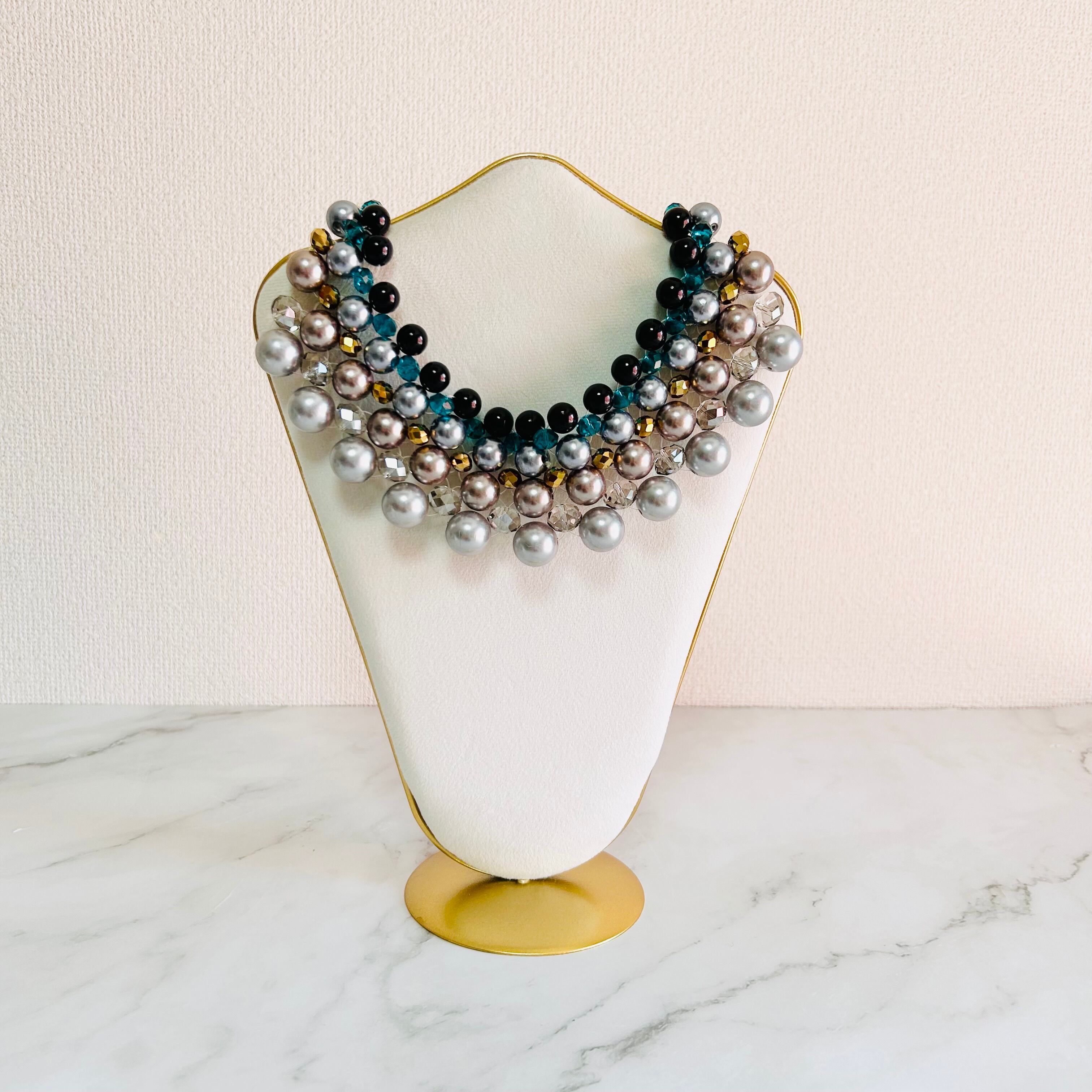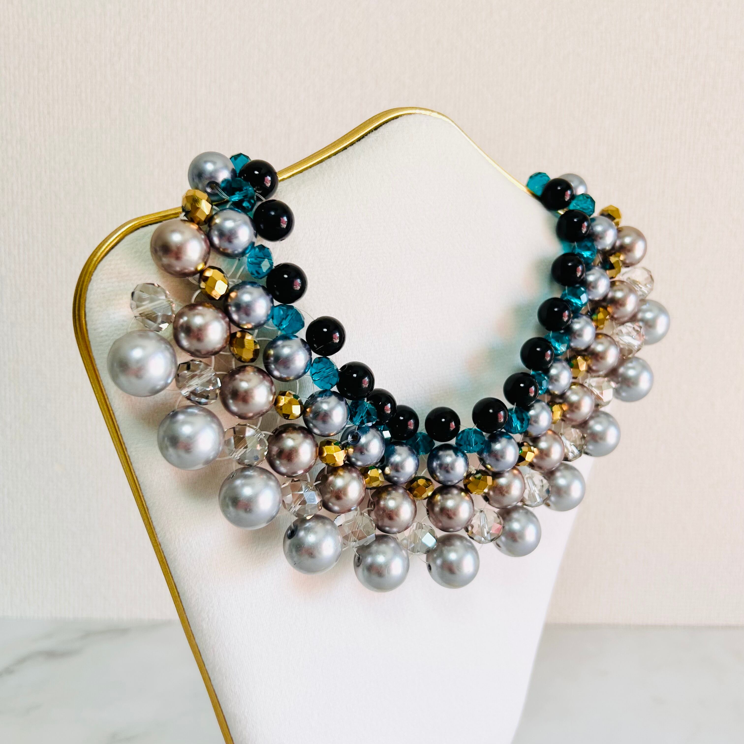 艶やかなグレーパール調ビーズをメインに、ブラック、ブルーグリーン、ゴールド、クリアのビジューを贅沢に編み上げた立体感のあるネックレスです。
