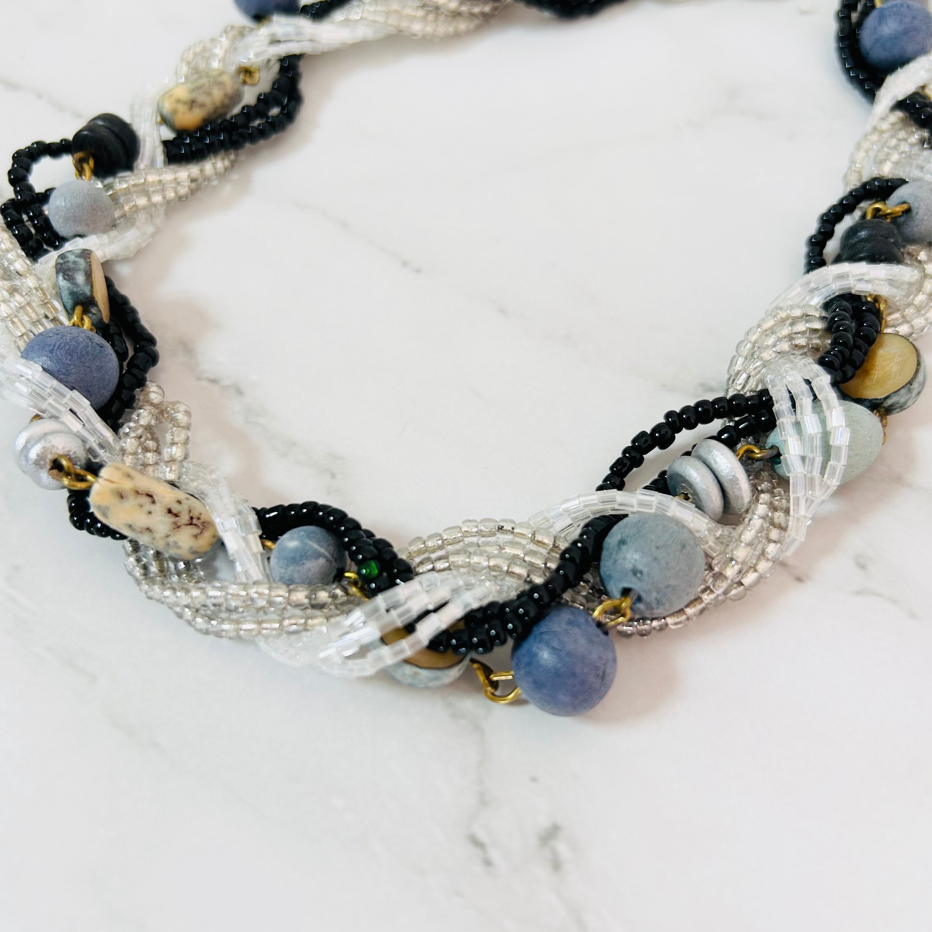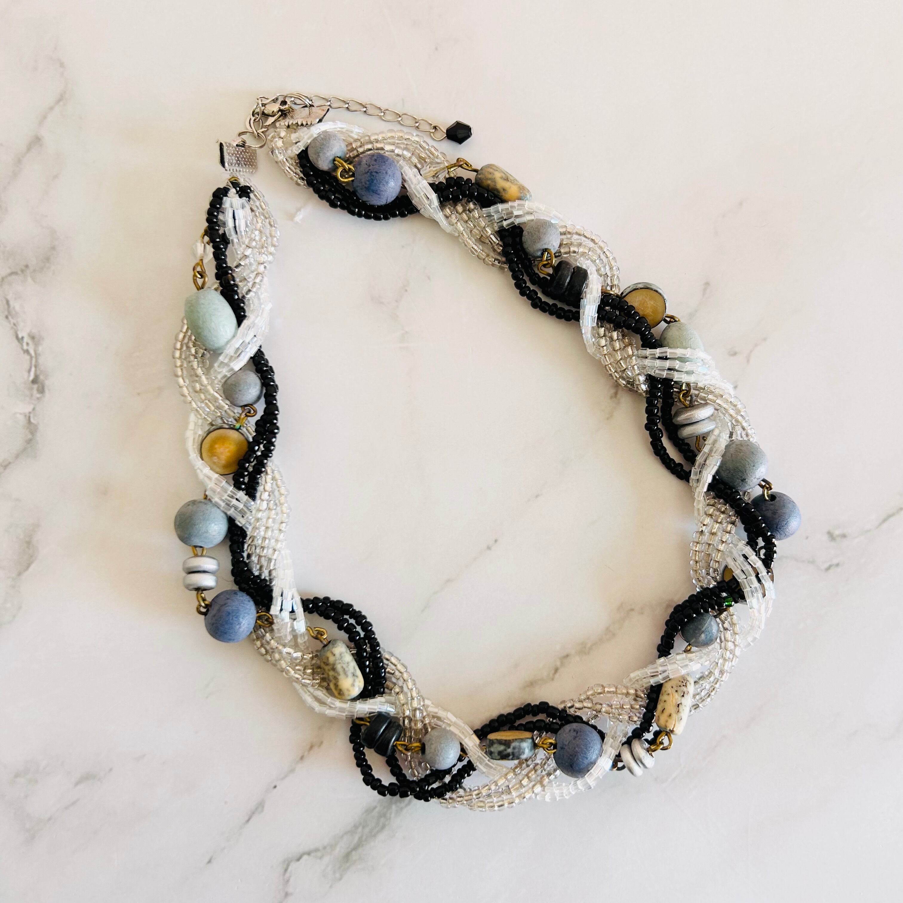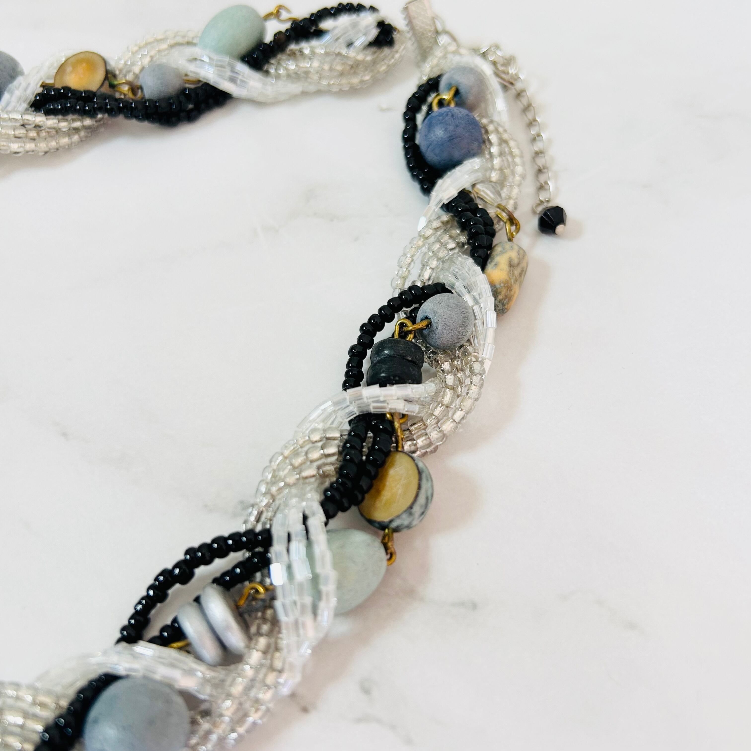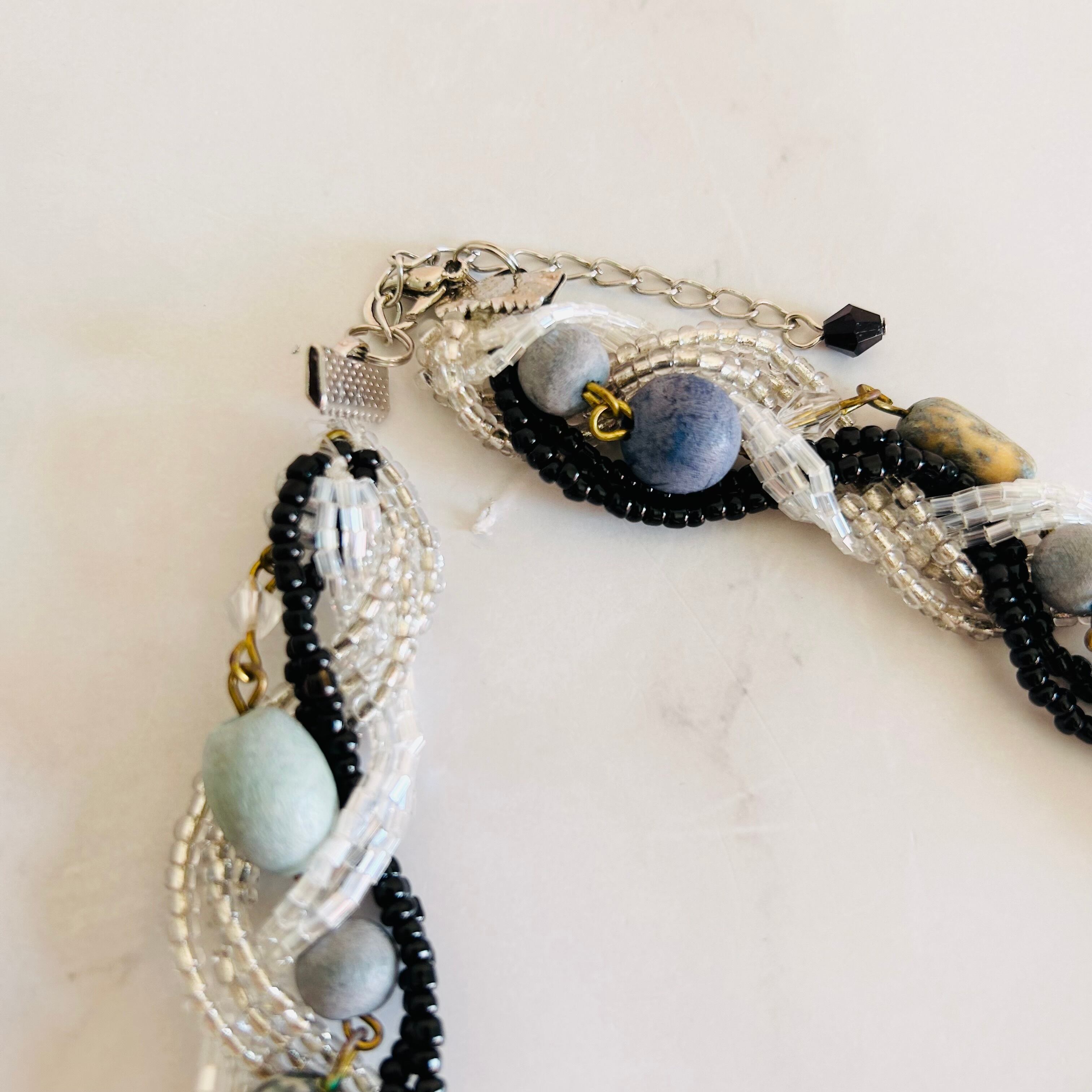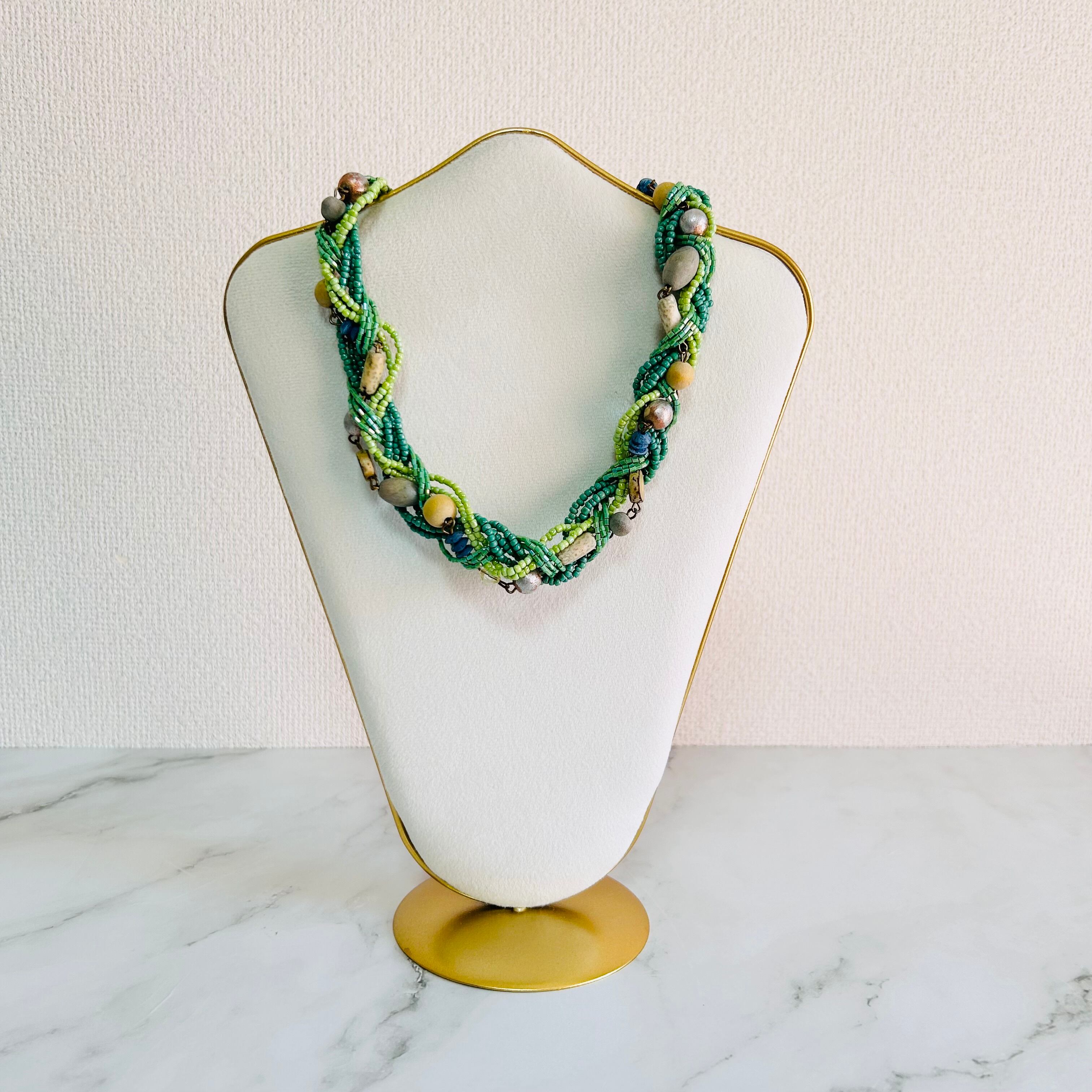 ガラスビーズやウッドパーツ、ストーン風パーツなどさまざまな素材を組み合わせ、複数のビーズを丁寧に編み込んだネックレスです。