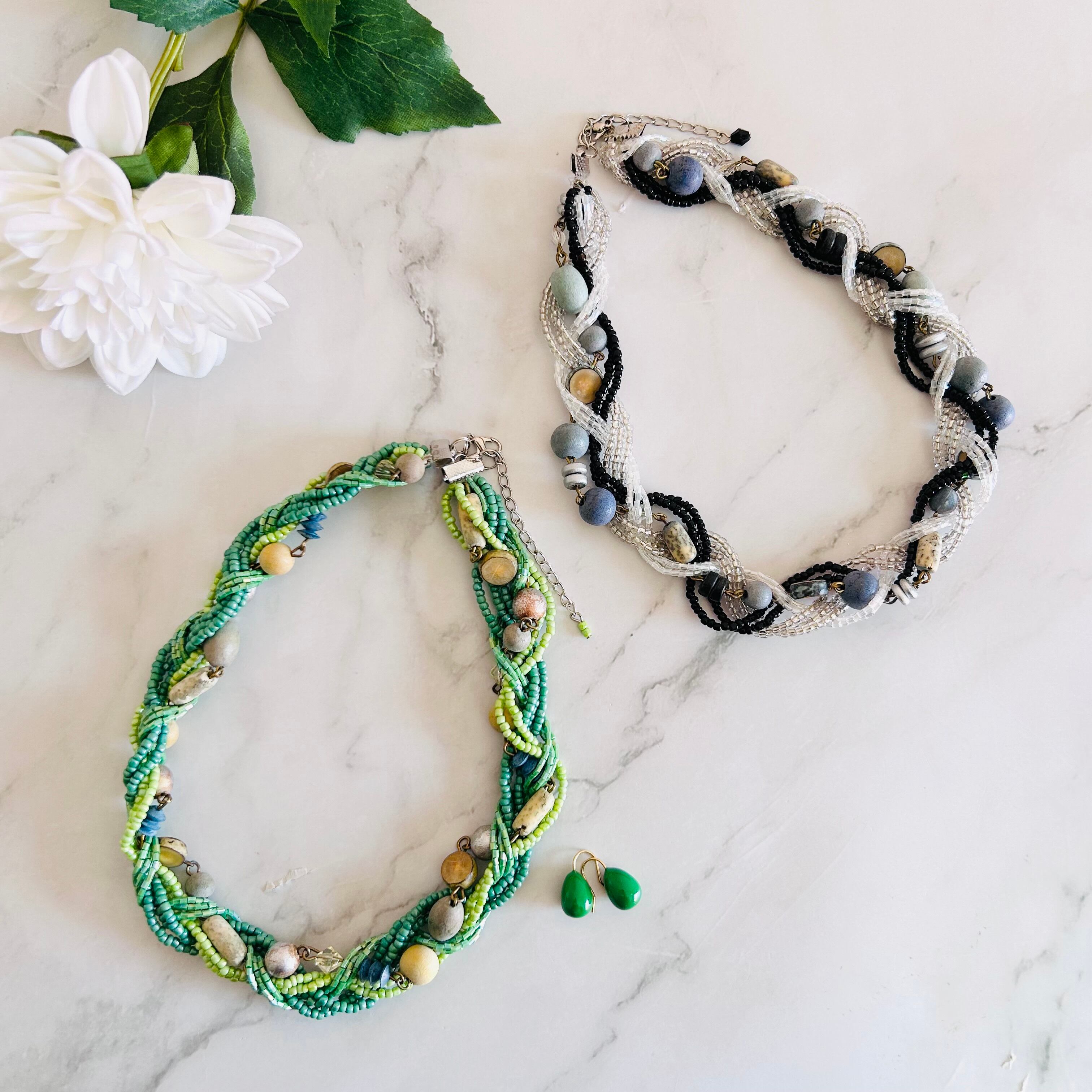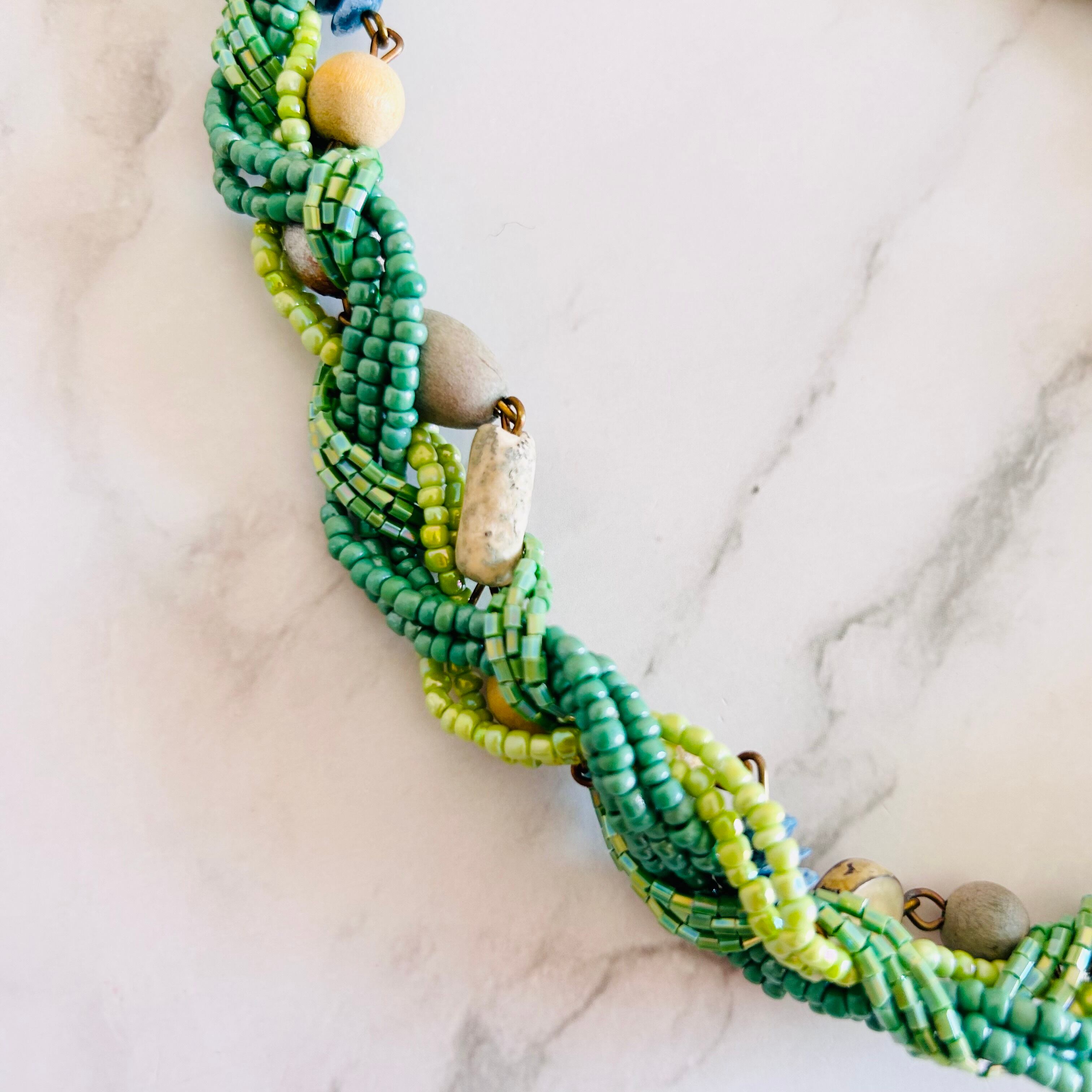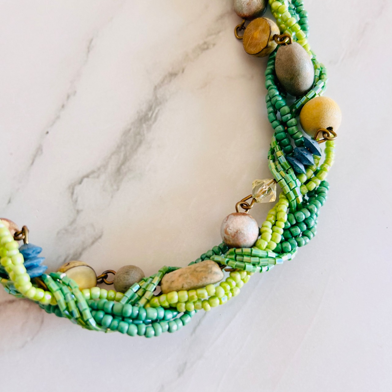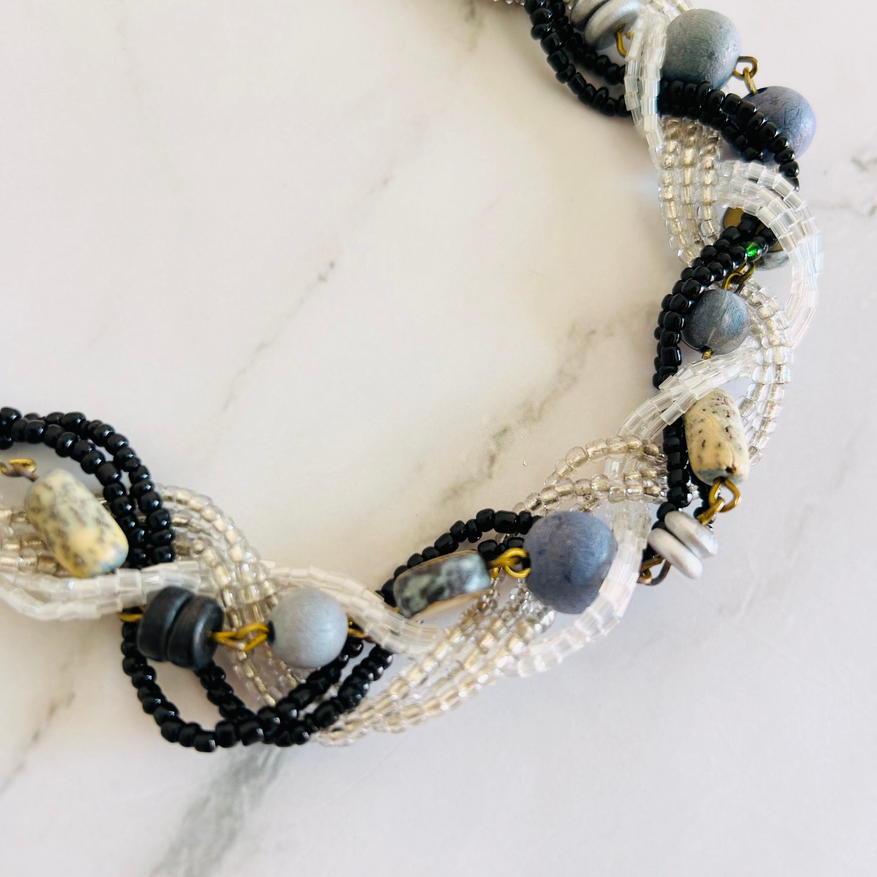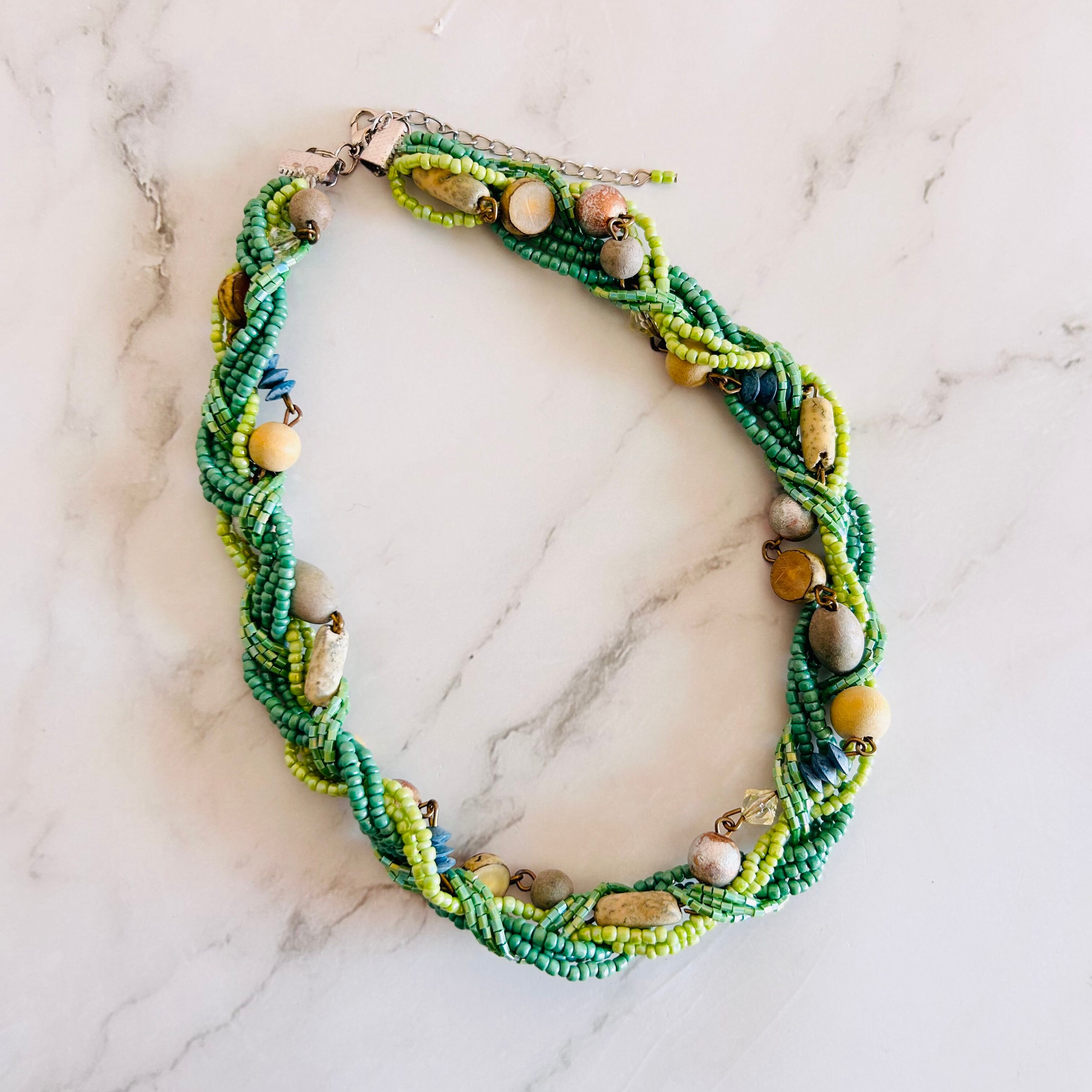 ガラスビーズやウッドパーツ、ストーン風パーツなどさまざまな素材を組み合わせ、複数のビーズを丁寧に編み込んだネックレスです。