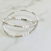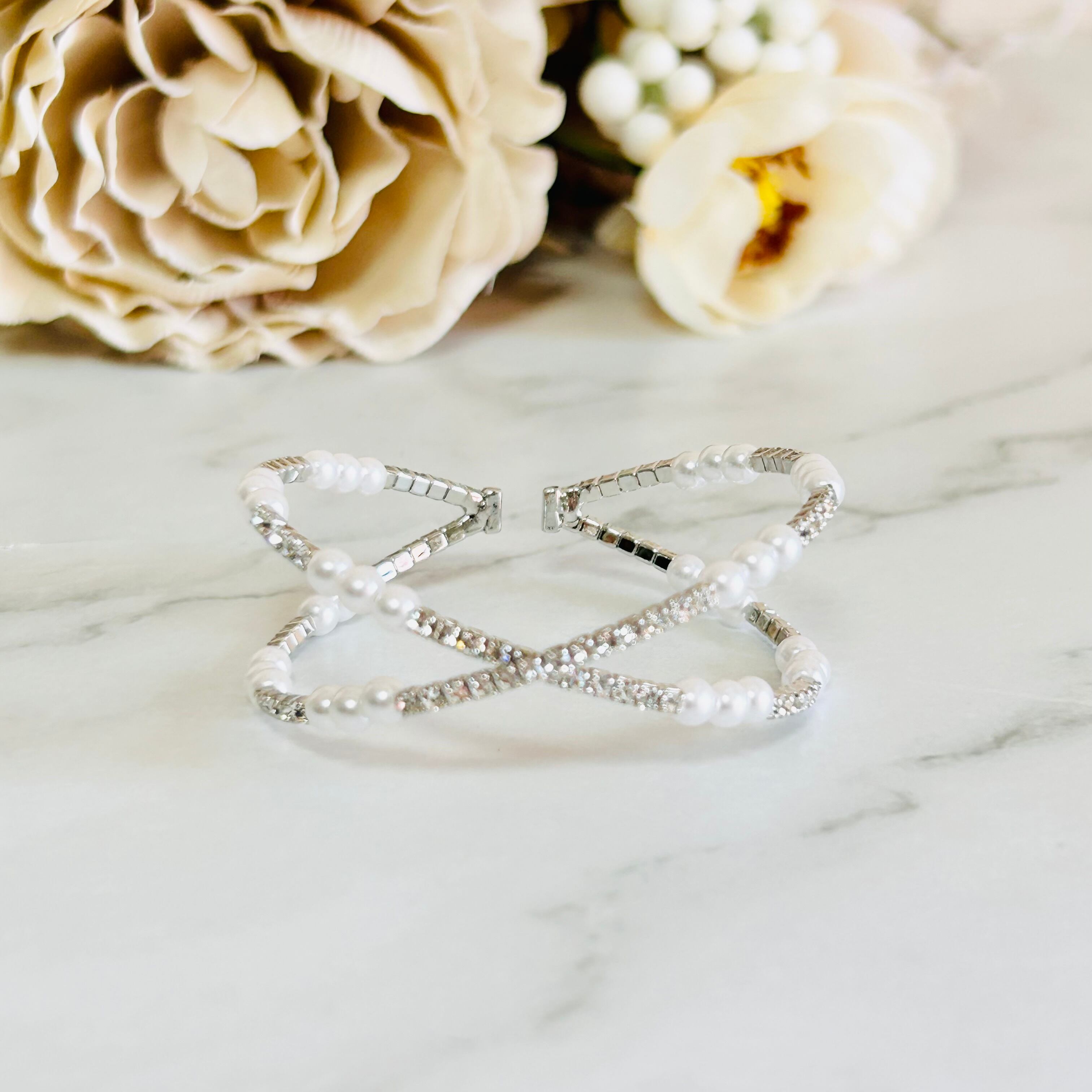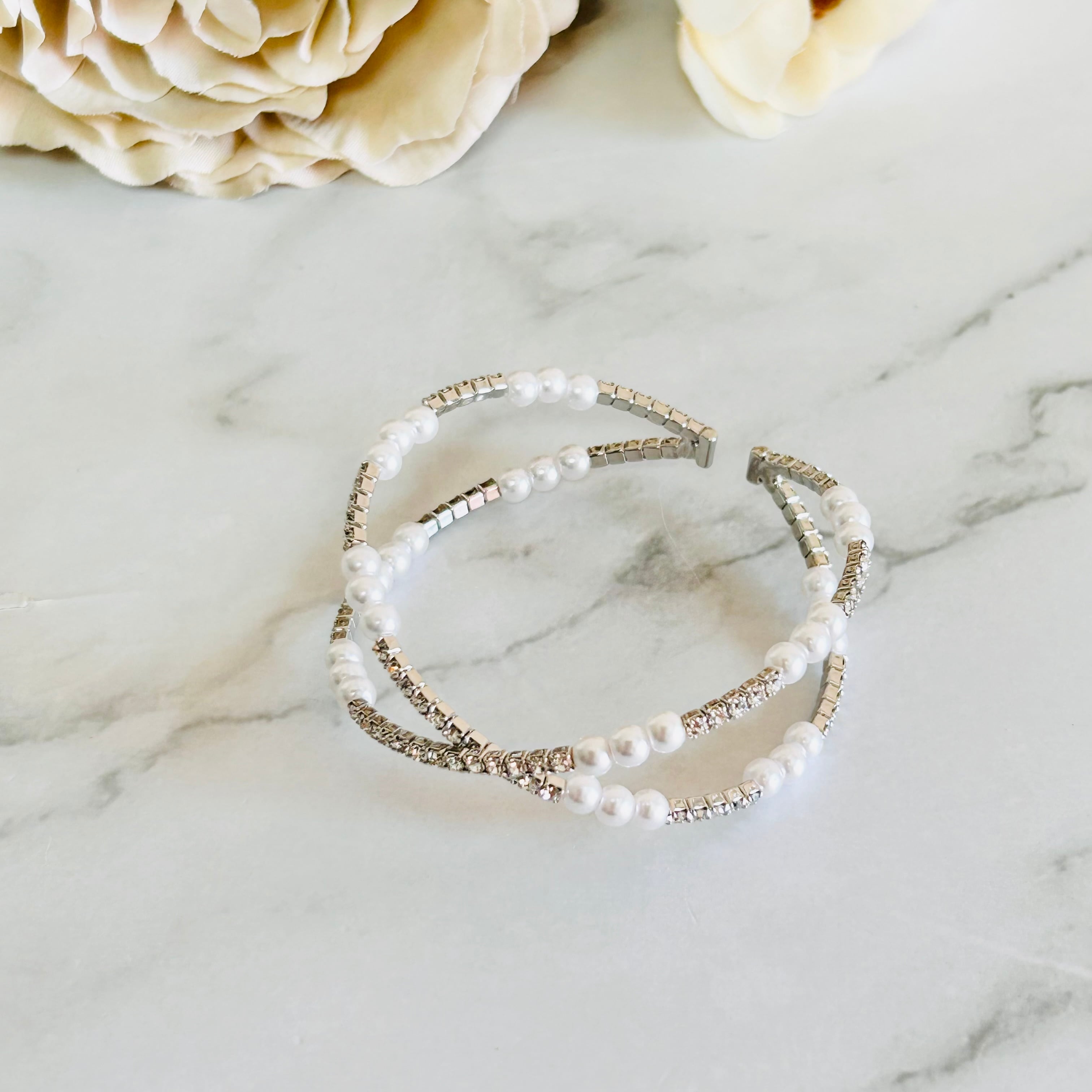艶やかなホワイトパールときらめくラインストーンが美しく絡み合う、2連風のブレスレットです。