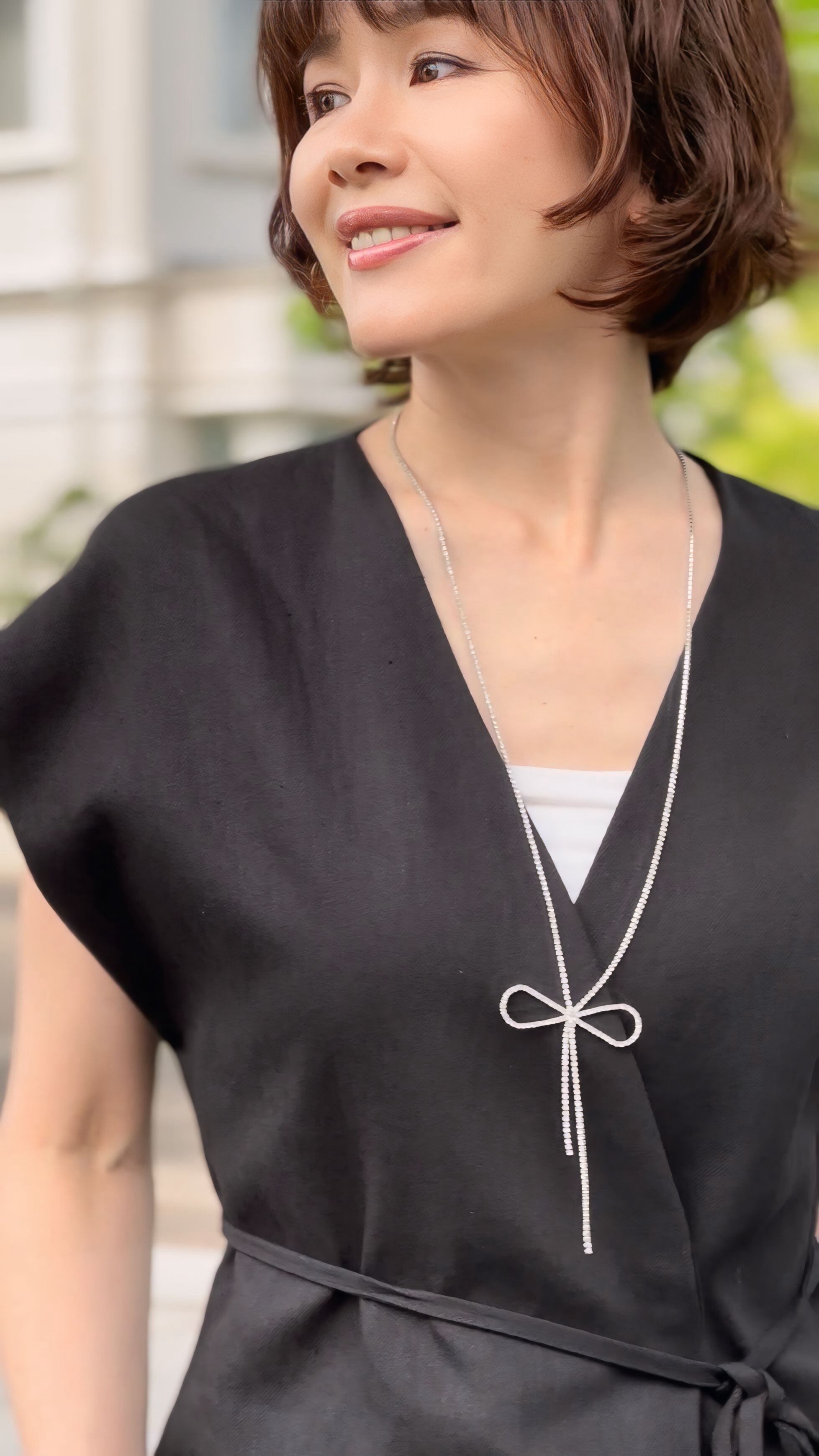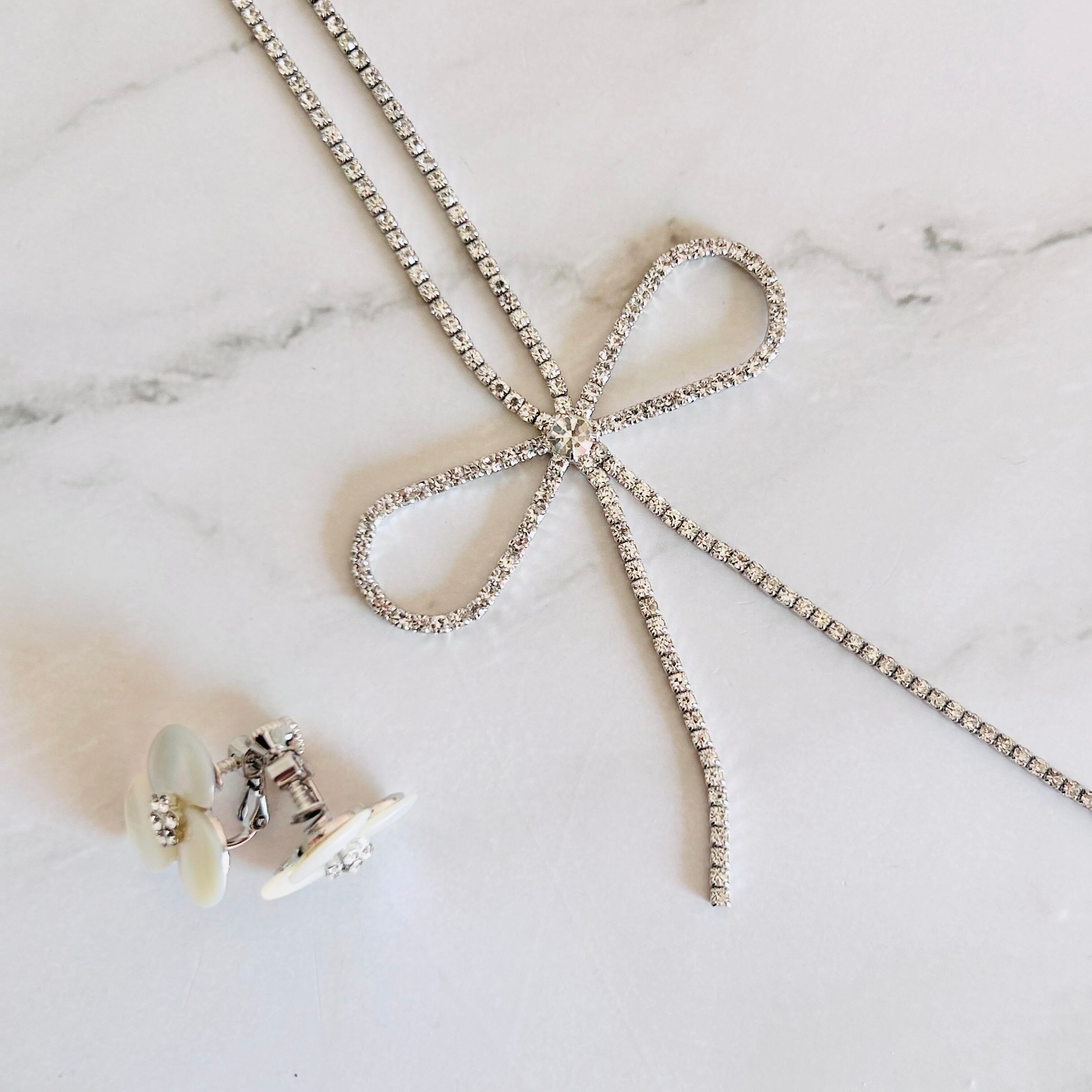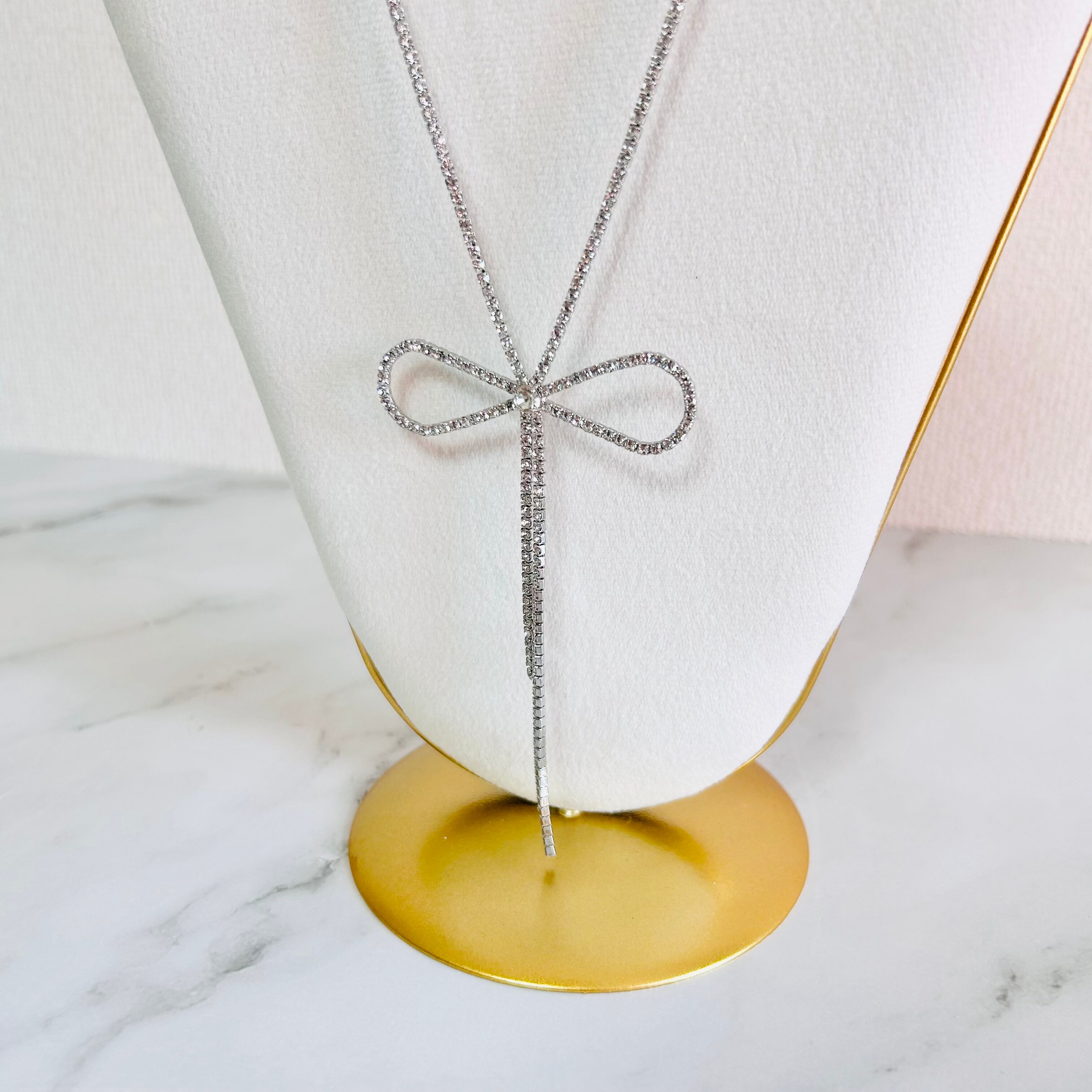 甘さと輝きをひとつに束ねた、上品で印象的なリボンネックレスです。