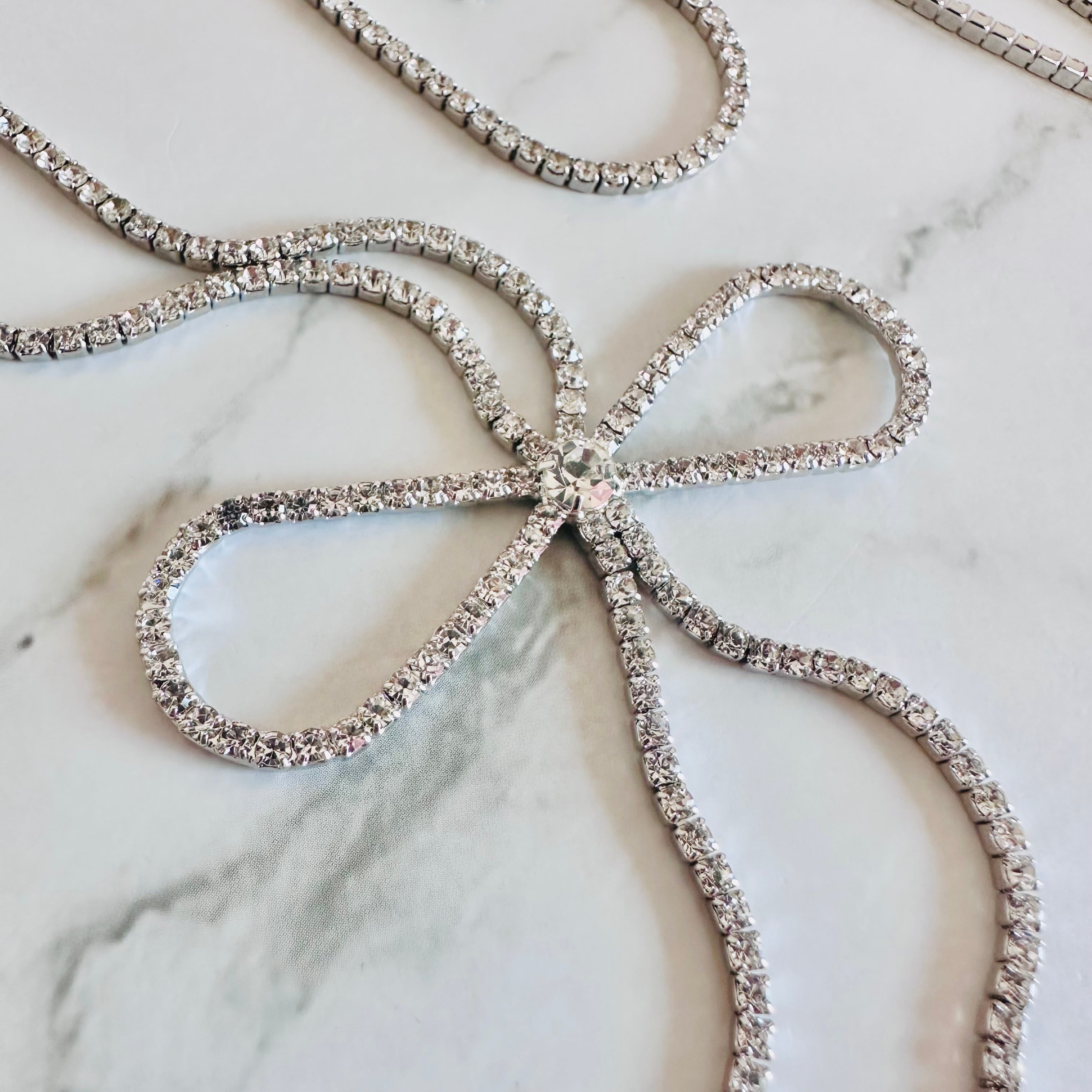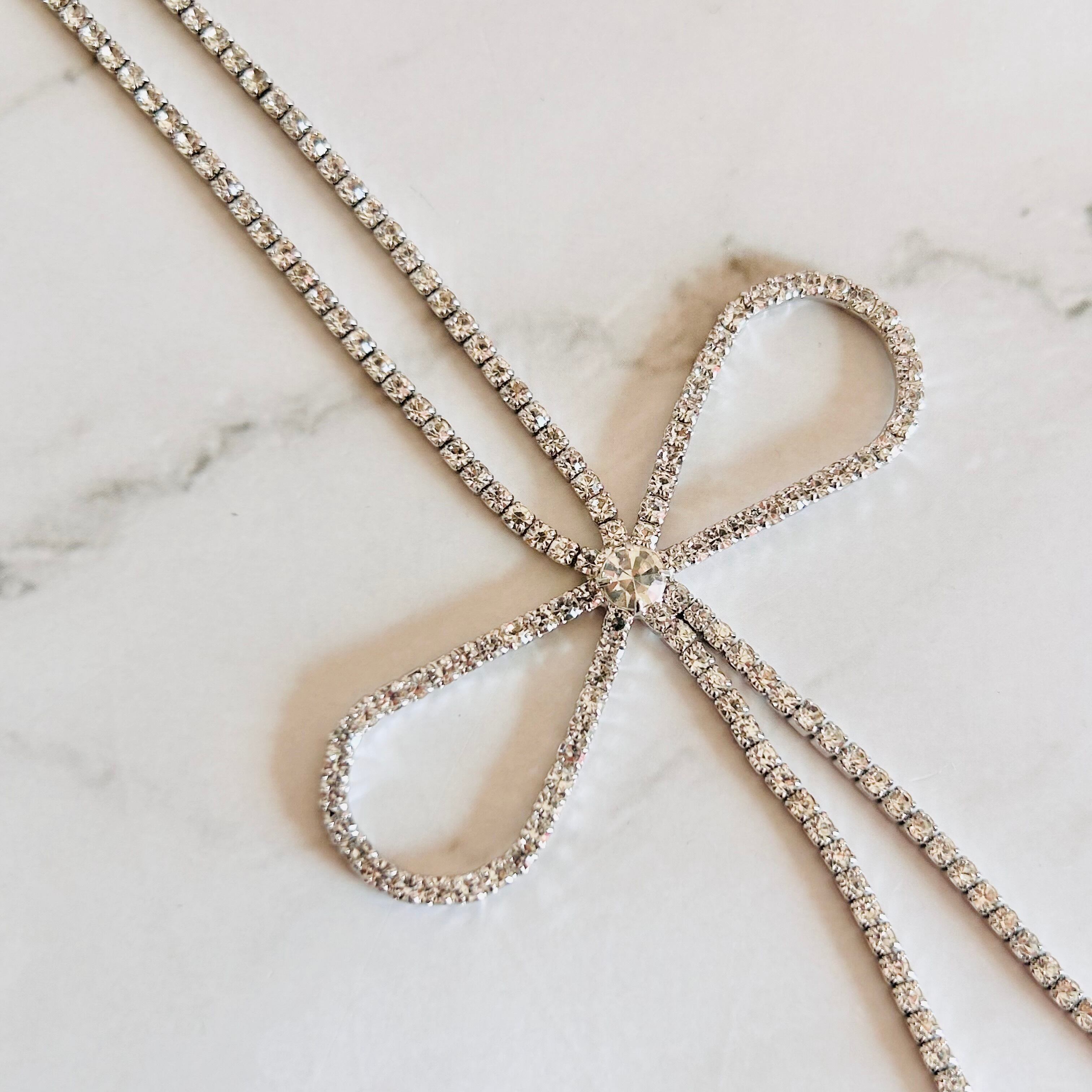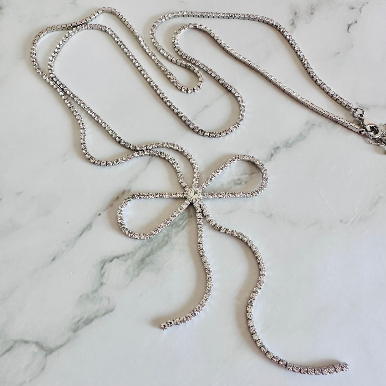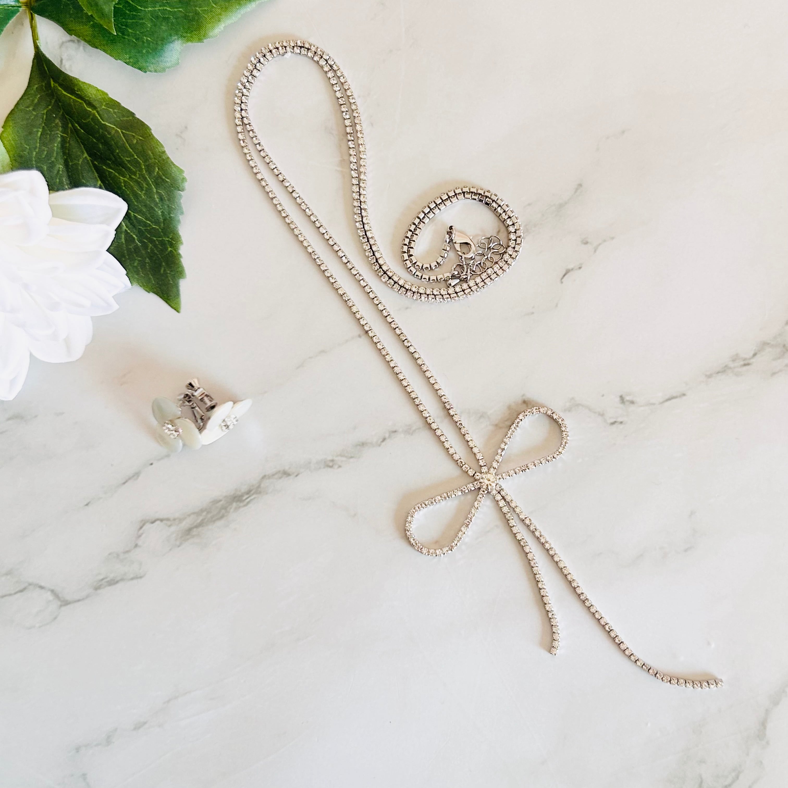 甘さと輝きをひとつに束ねた、上品で印象的なリボンネックレスです。