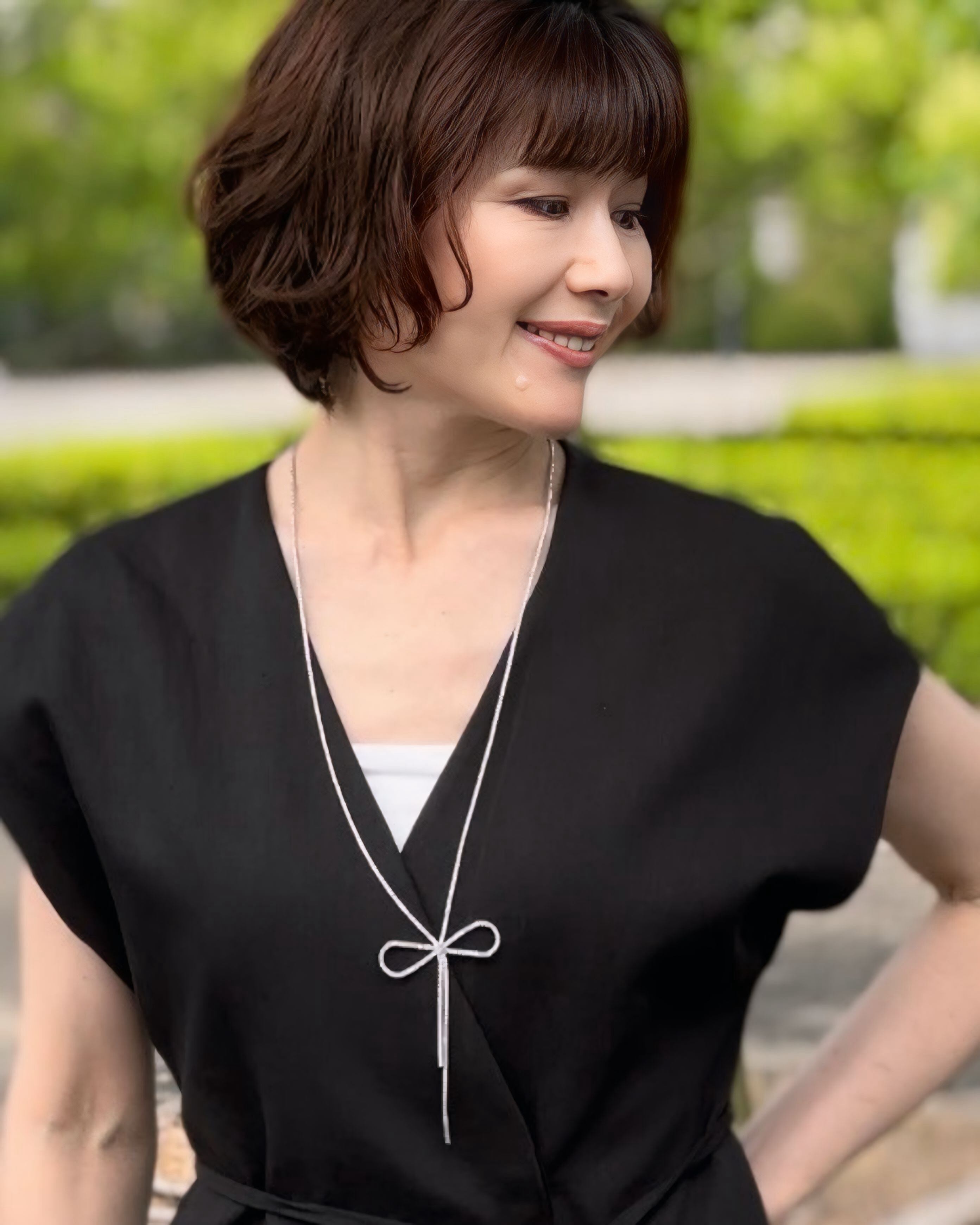 まるで首元に光を結んだようなリボンが、甘さと気品を絶妙なバランスで表現します。