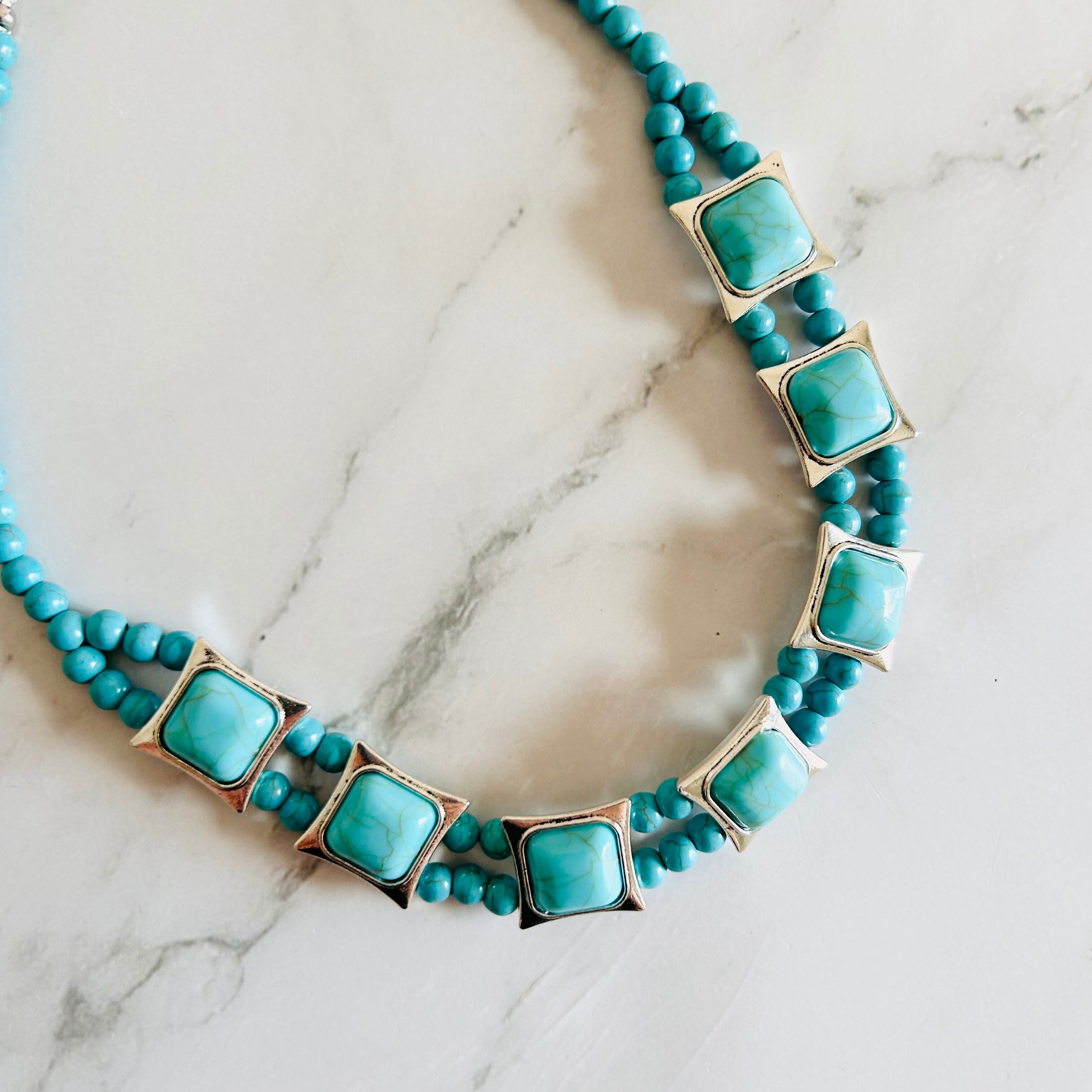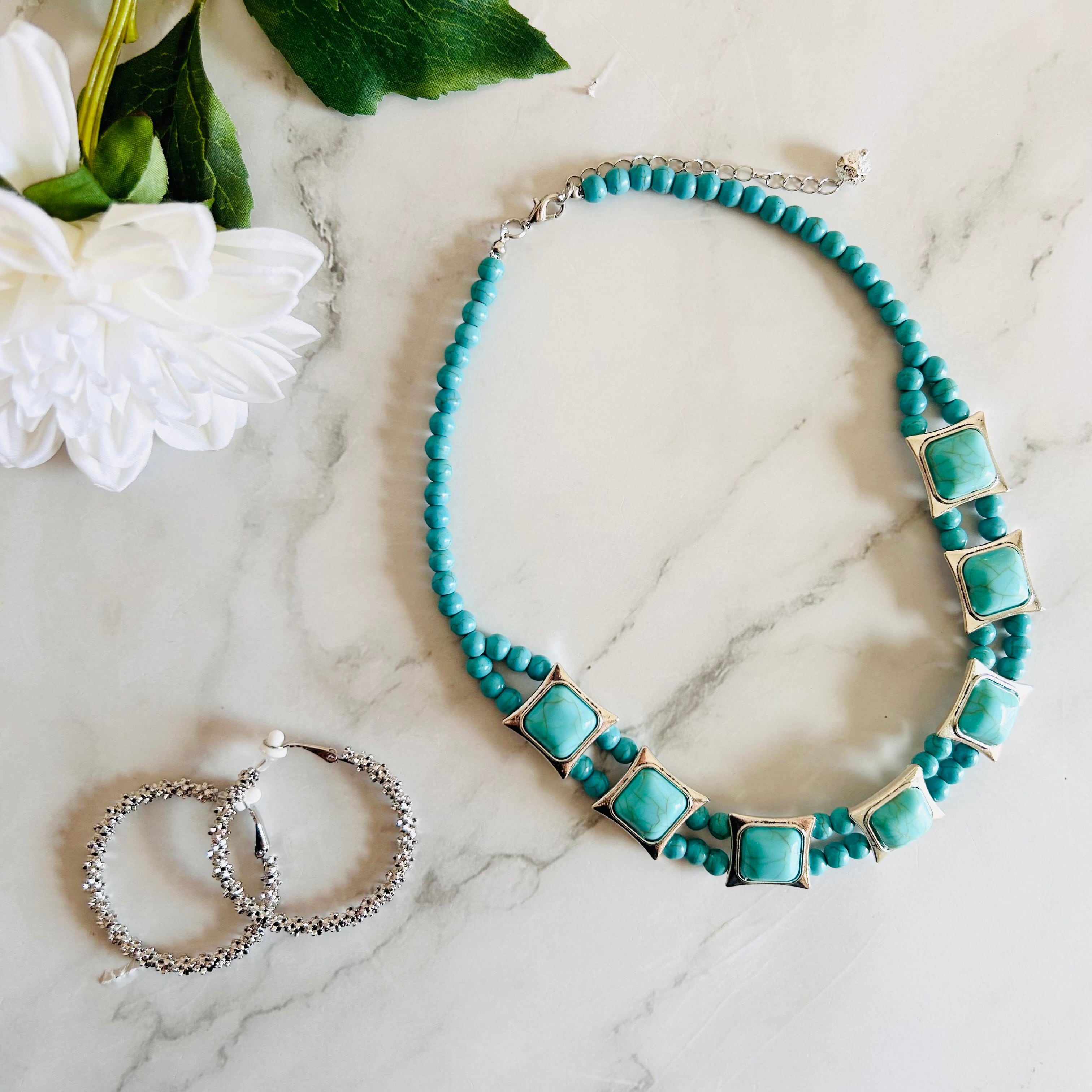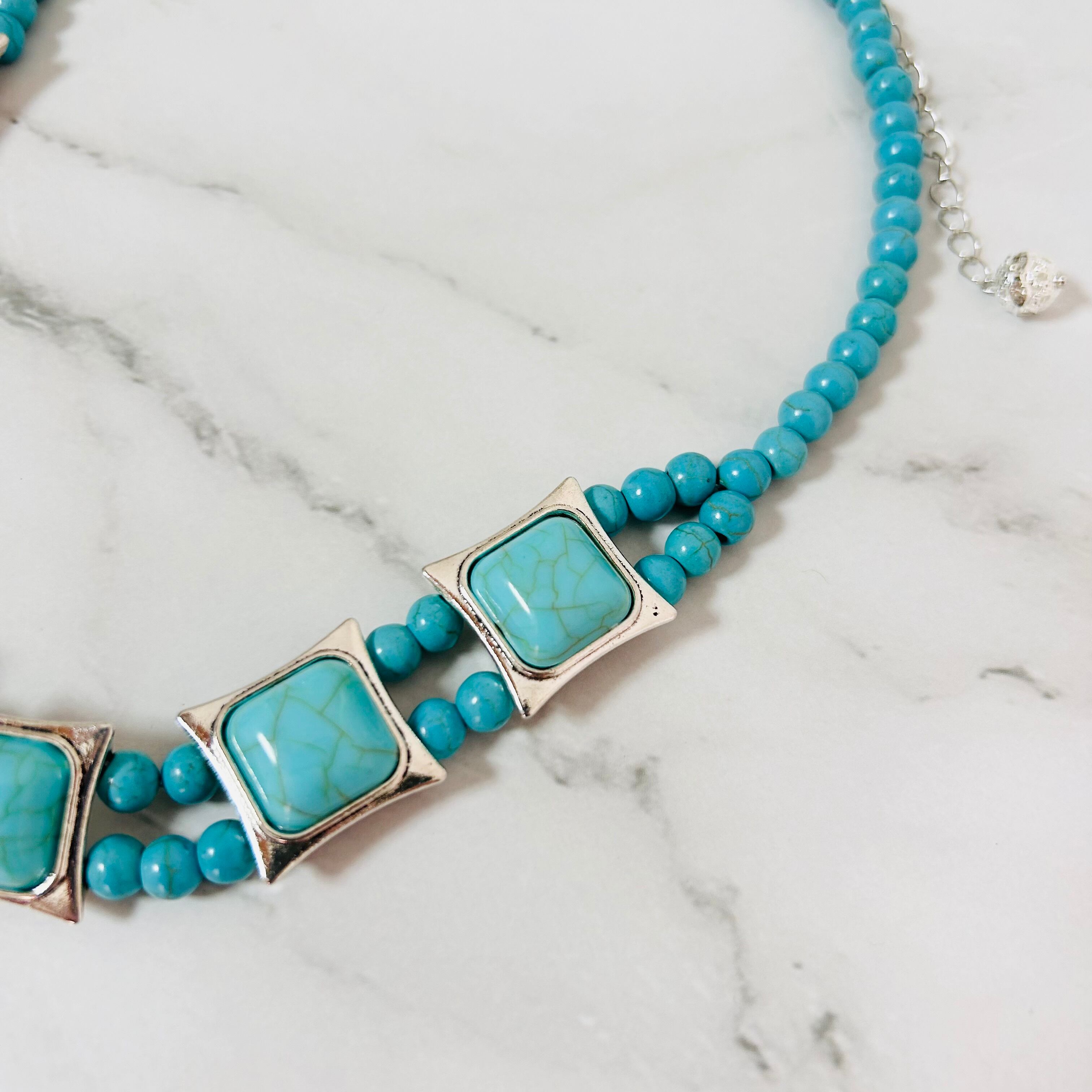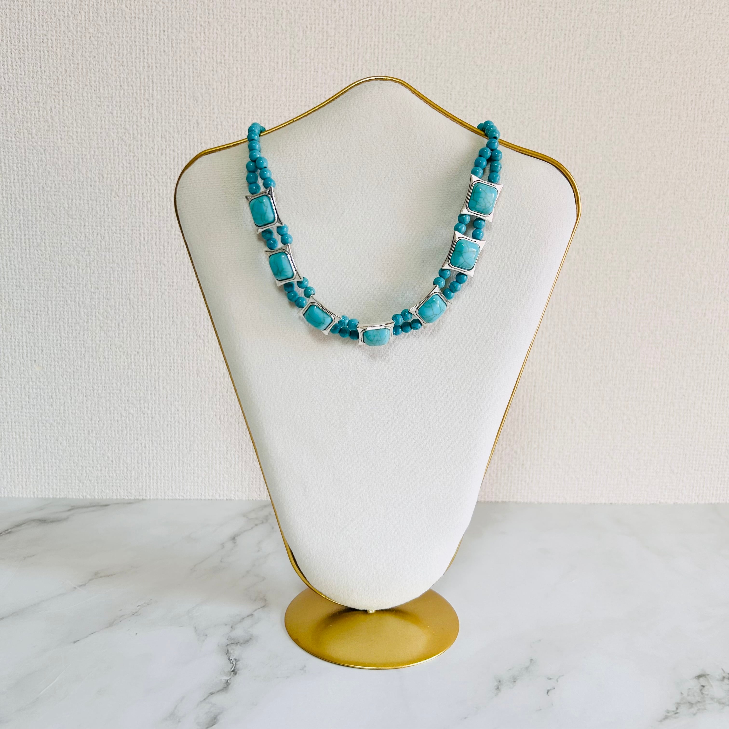 ターコイズブルーのストーン調のパーツに、スクエアフレームのモチーフを組み合わせた印象的なデザイン。