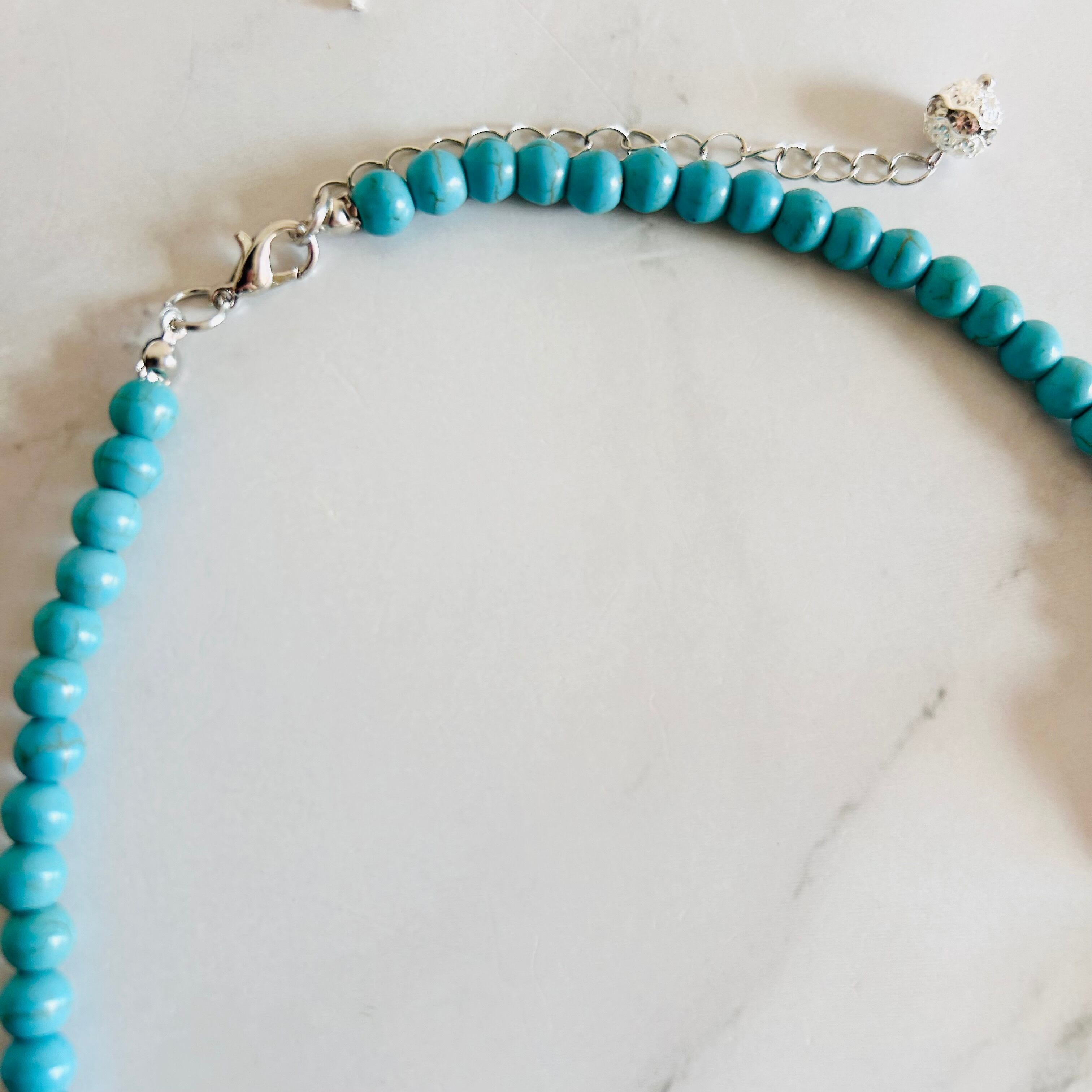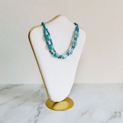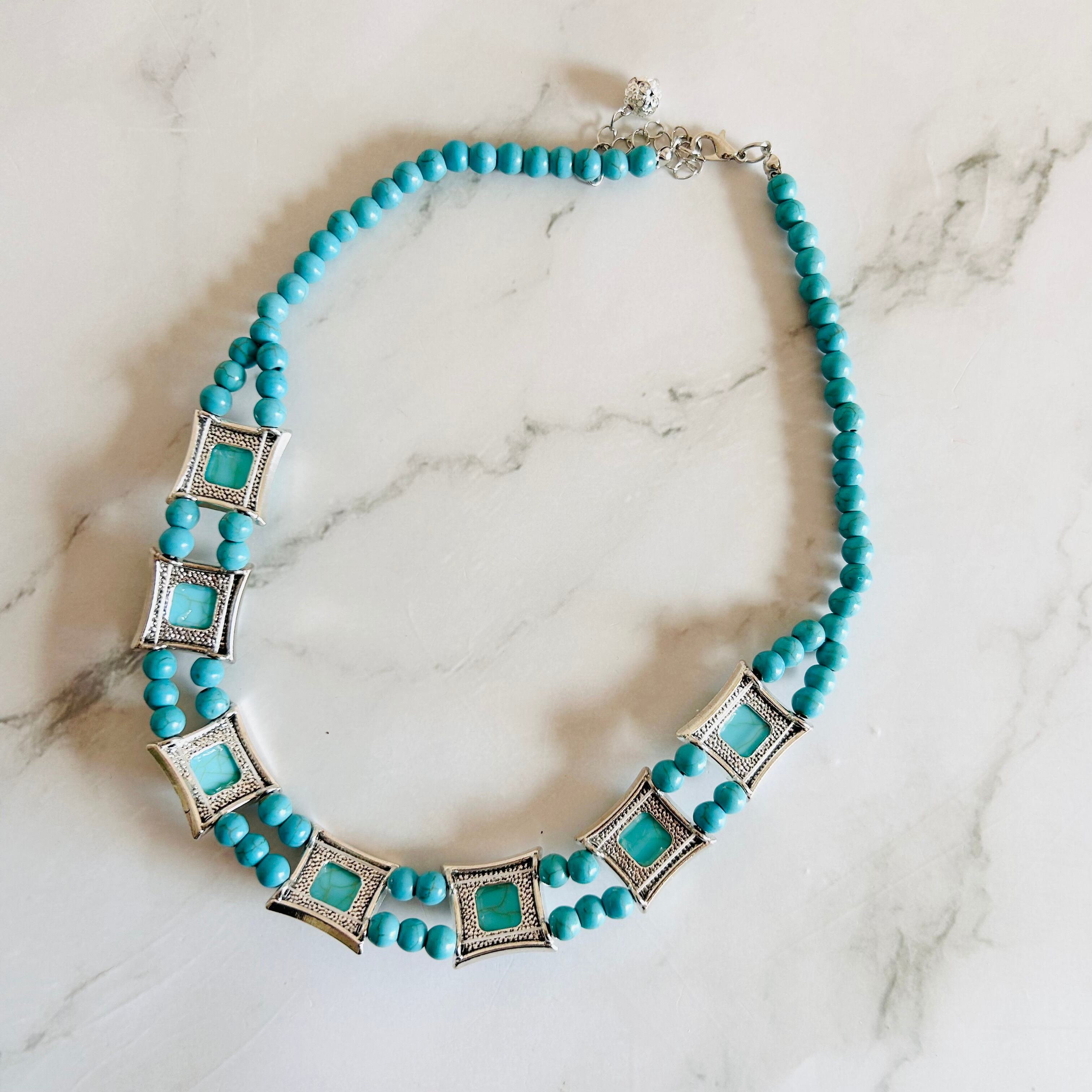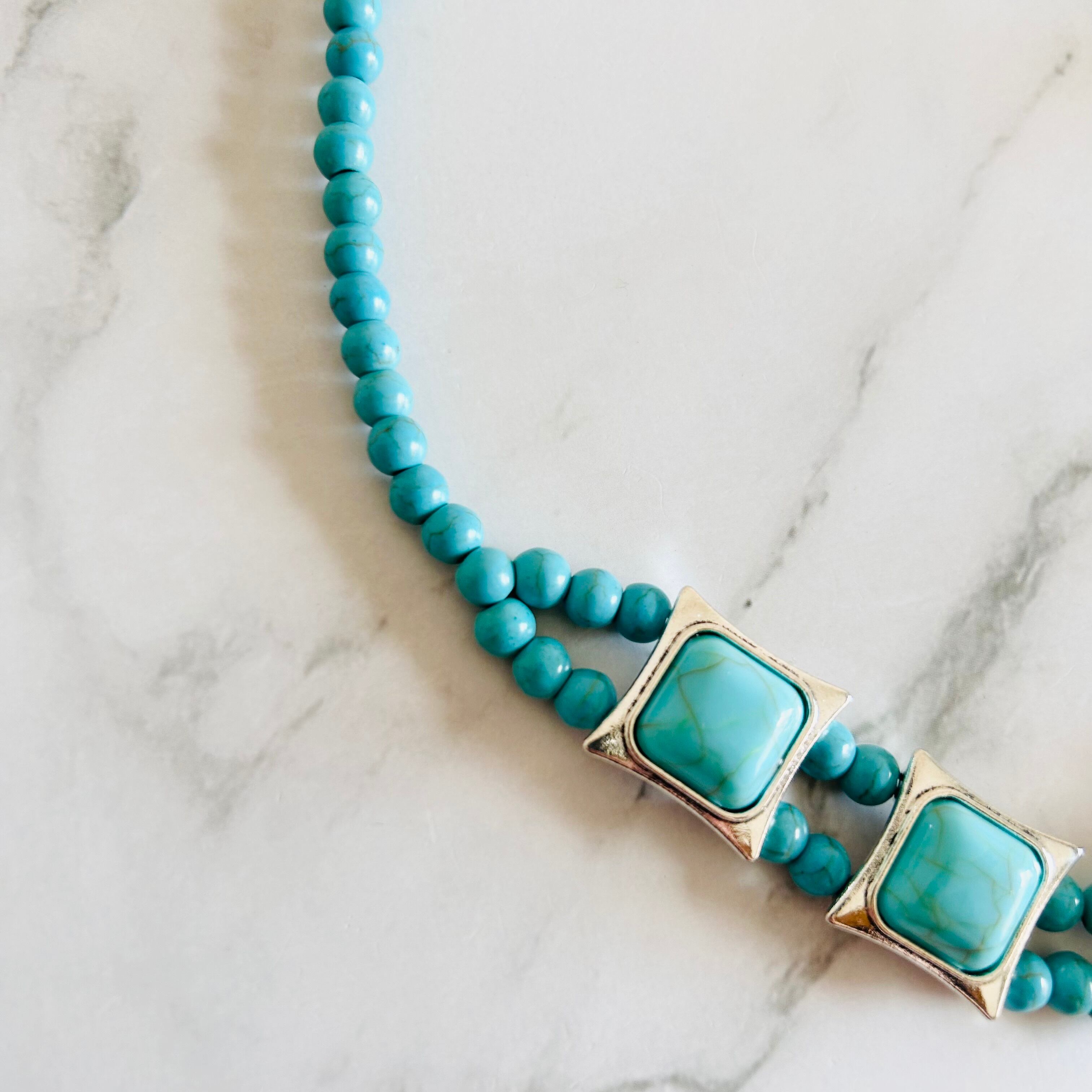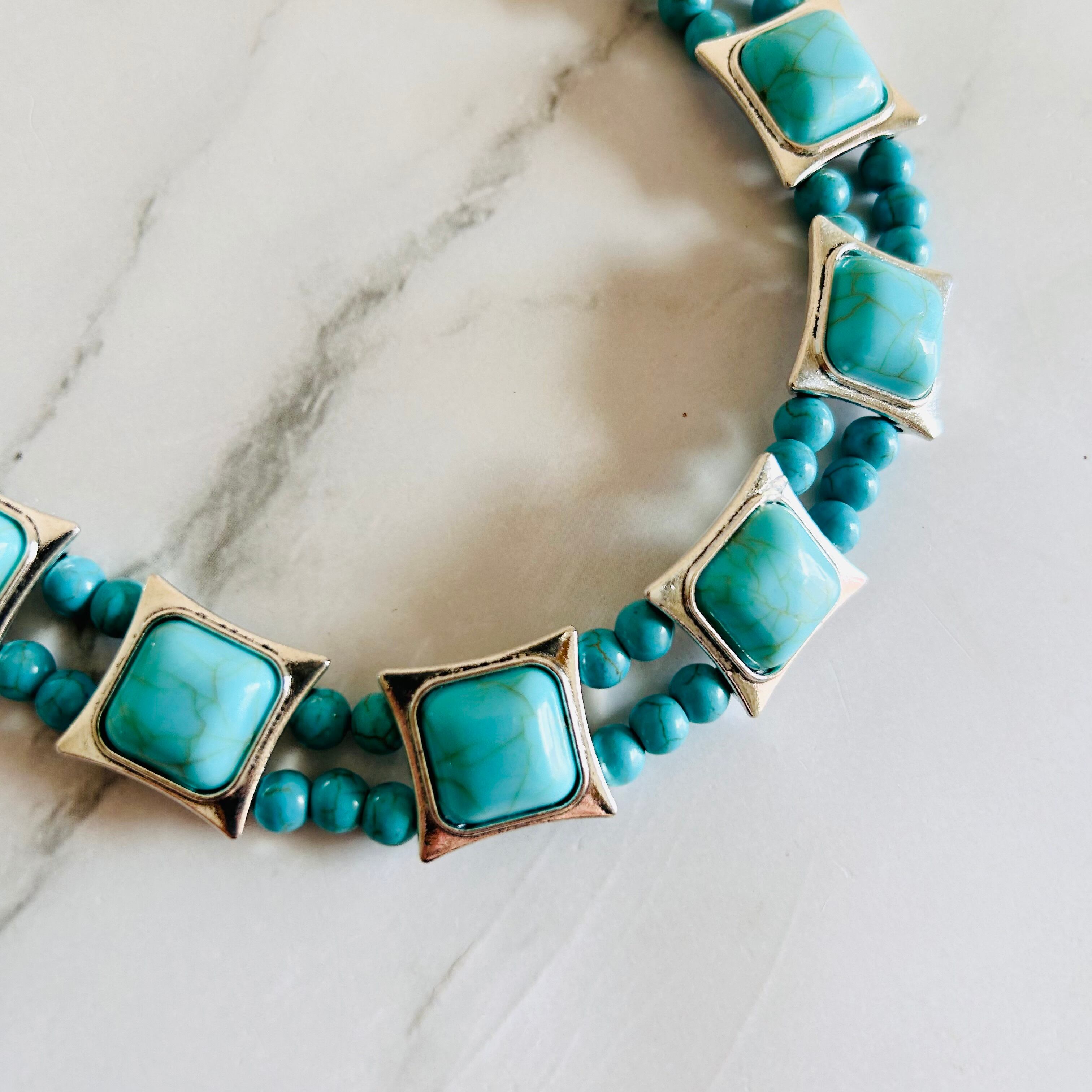 ターコイズブルーのストーン調のパーツに、スクエアフレームのモチーフを組み合わせた印象的なデザイン。